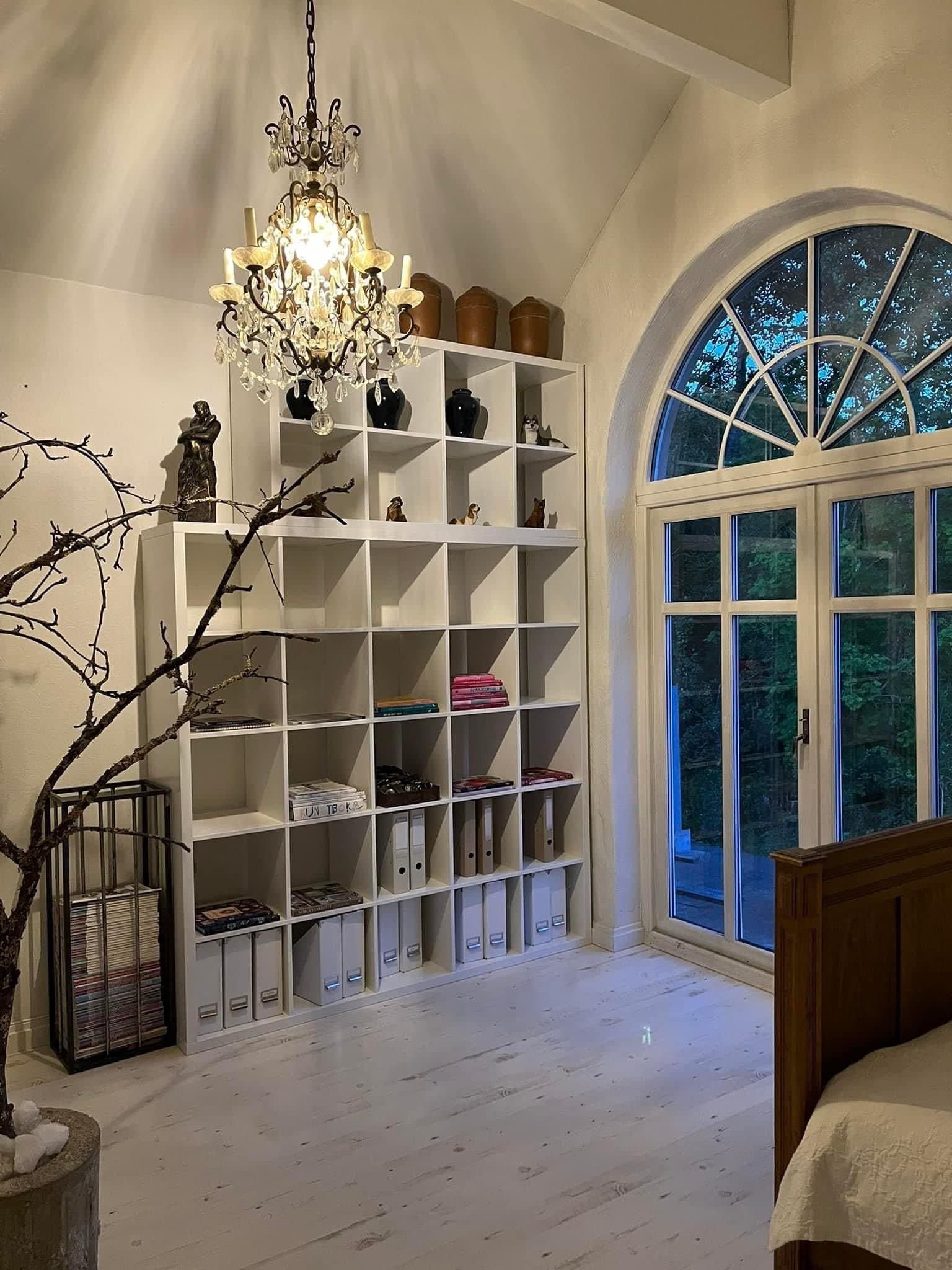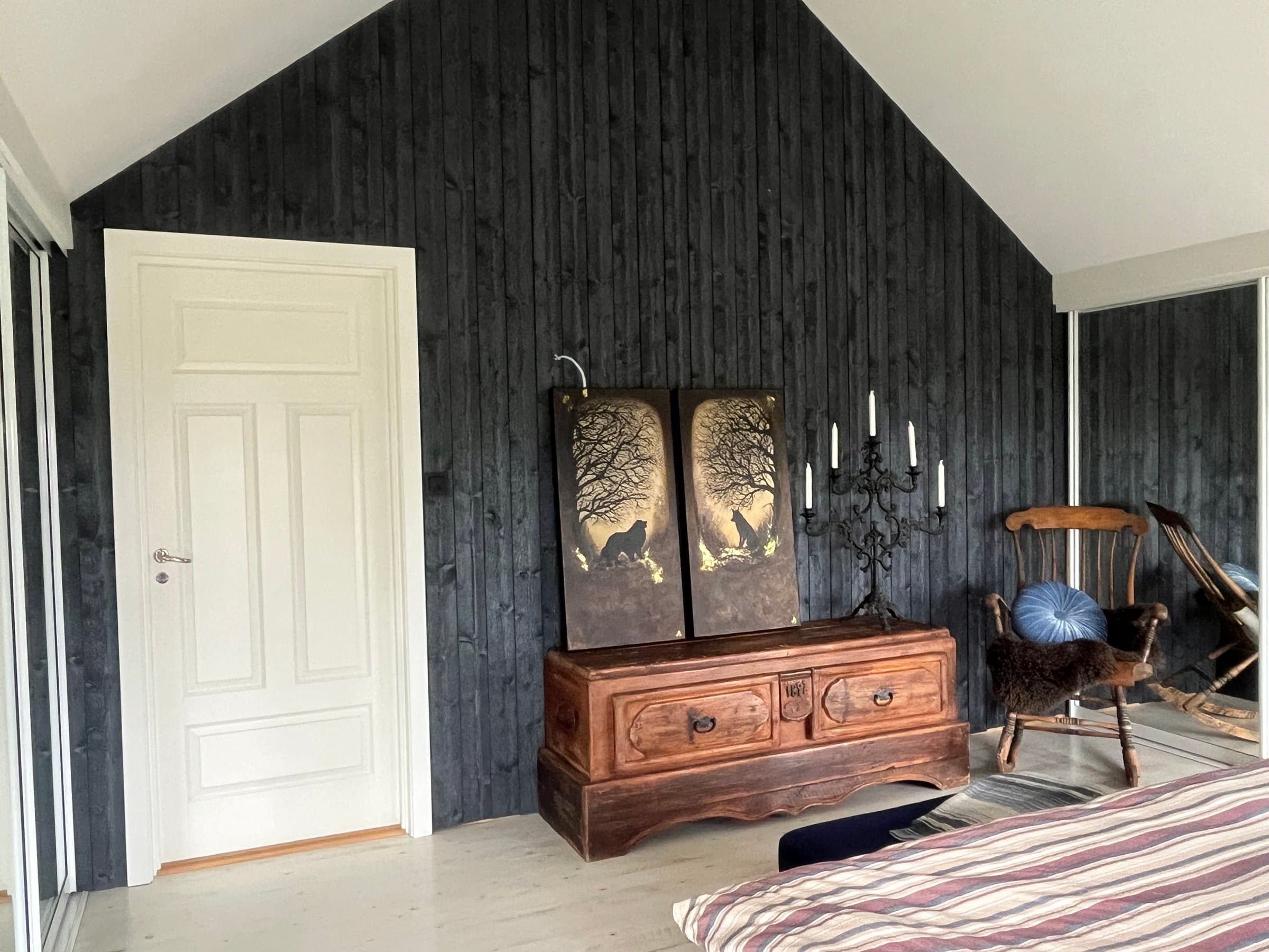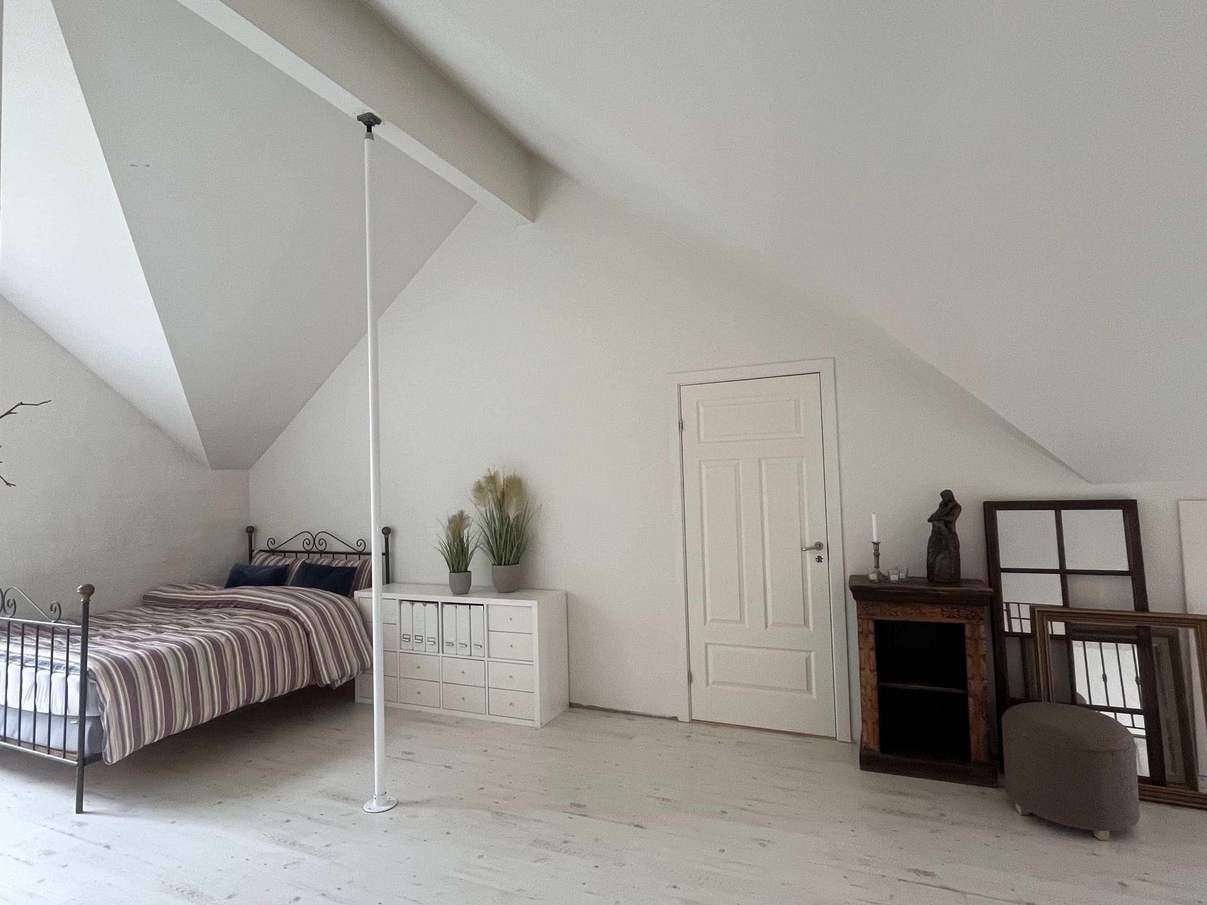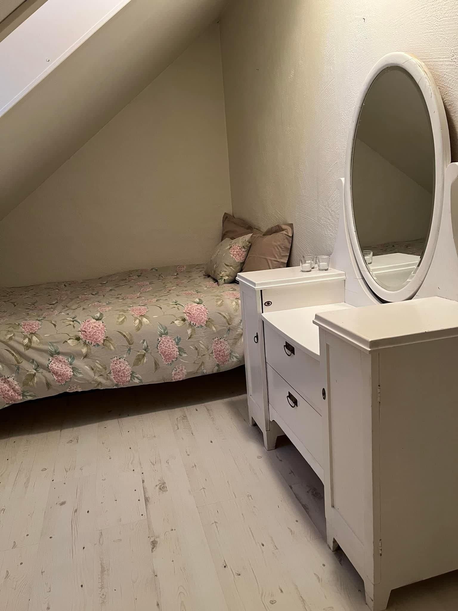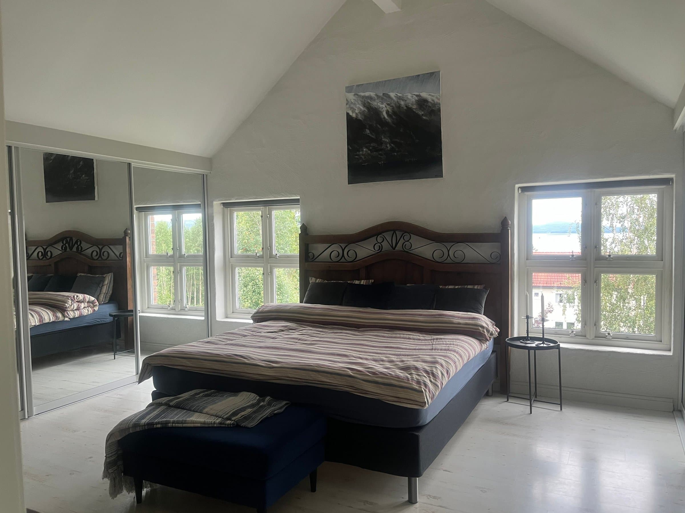 Videre i denne etasjen finnes det (til nå) to soverom. Et som er koselig og intimt under skråtaket og som gir godt innslipp for lys gjennom takvinduer. Det største soverommet er et virkelig «Master bedroom» der det er høyt under taket, det har rikelig med plass og det er også montert to store skyvedørsgarderober der som gir hele ni meter med garderobeplass. Og det er jo noe mange ønsker seg! Her oppe fra dette rommet er det høyt ned til bakkeplan, så vinduer har montert barnesikrede og nøkkelbaserte vinduslåser. På dette soverommet finnes det også mulighet for oppdeling slik at man kan lage to soverom ut av ett, da det er tillaget en skjult døråpning i den robuste veggen som går ut mot loftstuen. Dette ble gjort for å forenkle en eventuell bruksendring i etterkant av byggingen. Man kan også enkelt lage et ekstra soverom mot den buede verandadøren hvis ønskelig, og også mot den andre siden (vest) hvis behovet måtte melde seg. Dette er vel gjennomtenkt i planleggingsfasen av boligen. Så alt i alt vil det la seg gjøre å etablere hele fem soverom i denne etasjen hvis man ønsker det.
