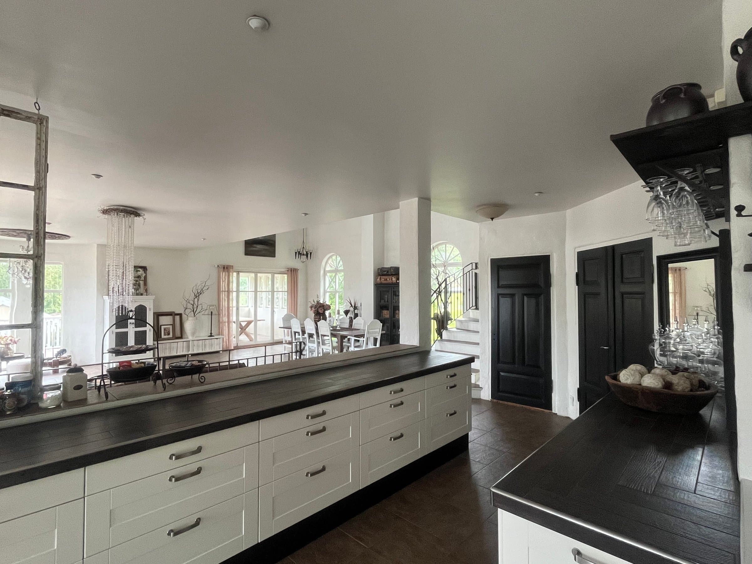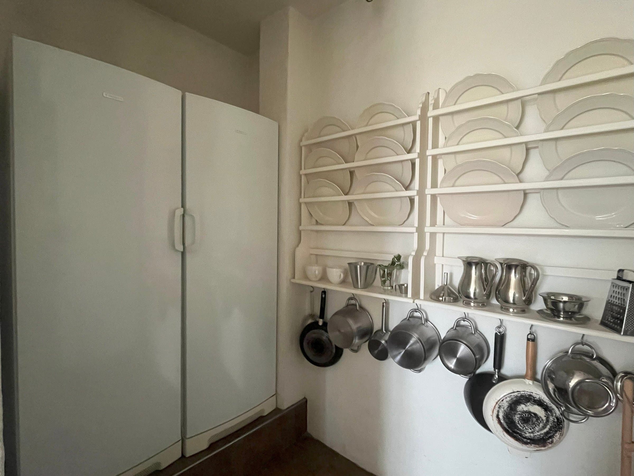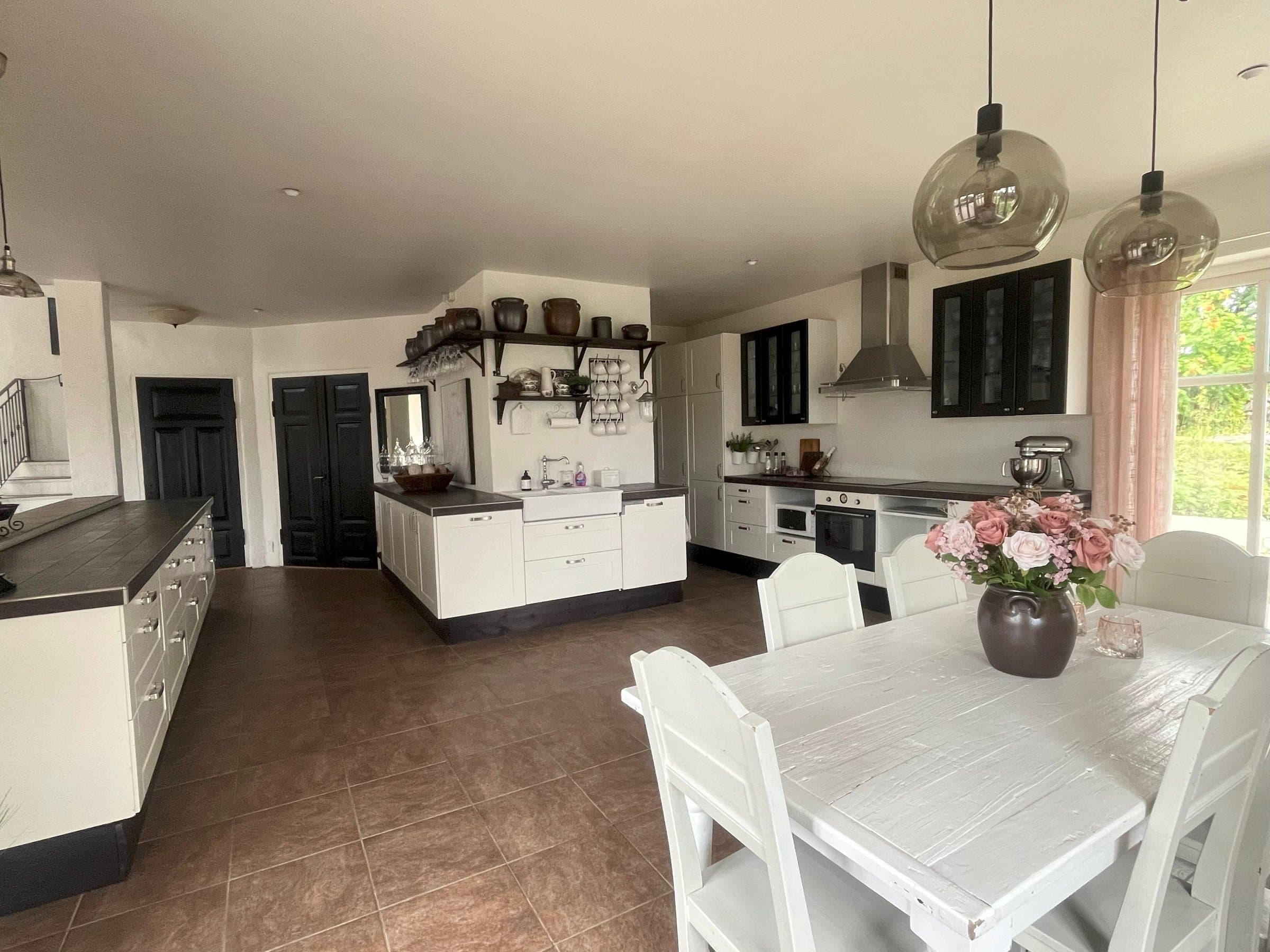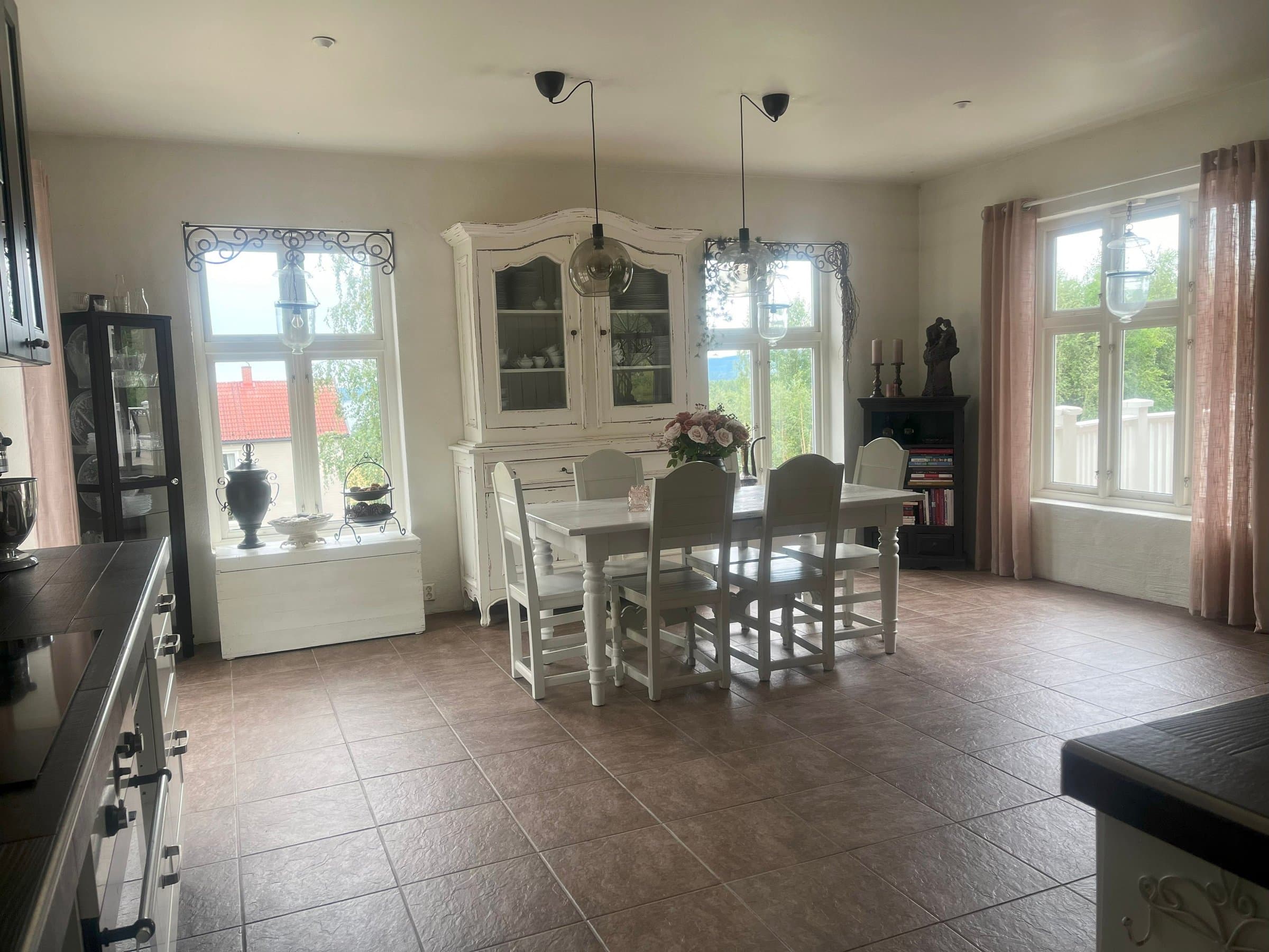 Kjøkkenet er virkelig et herlig sted å samles rundt måltidene og den gode praten, om det så er ved et stort langbord eller ved kjøkkenbenken. Det er rikelig med god skapplass og gode løsninger, og ikke minst er den fire meter lange kjøkkenbenken et stort must og helt gull å kunne benytte, både til hverdag og til fest. På kjøkkenet er det laget en egen nisje/avdeling der kjøleskap og fryser, samt høyskap er plassert. Dette for å holde på det rolige og luftige preget huset har og uten at for mange hvitevarer vises fram. På kjøkkenet er det også klargjort for å kunne montere peis/ildsted, da den store utenpåliggende pipen har tilknytning til dette rommet. Fra kjøkkenet fører en tofløyet verandadør oss ut på bakkenivå, på husets østlige side. Her har det tidligere vært anlagt gressplen, men de siste årene har dette området blitt benyttet til hundegårder med tilhørende hundehus i bakkant. Dette er underveis med å bli fjernet nå, slik at ny eier kan disponere området til hva den måtte ønske. Her vil det blant annet være helt ideelt å anlegge en kjøkkenhage for de som vil ha egen dyrking på eiendommen, ellers er det en utmerket plass for de første timene på dagen da det er her solen viser seg først.