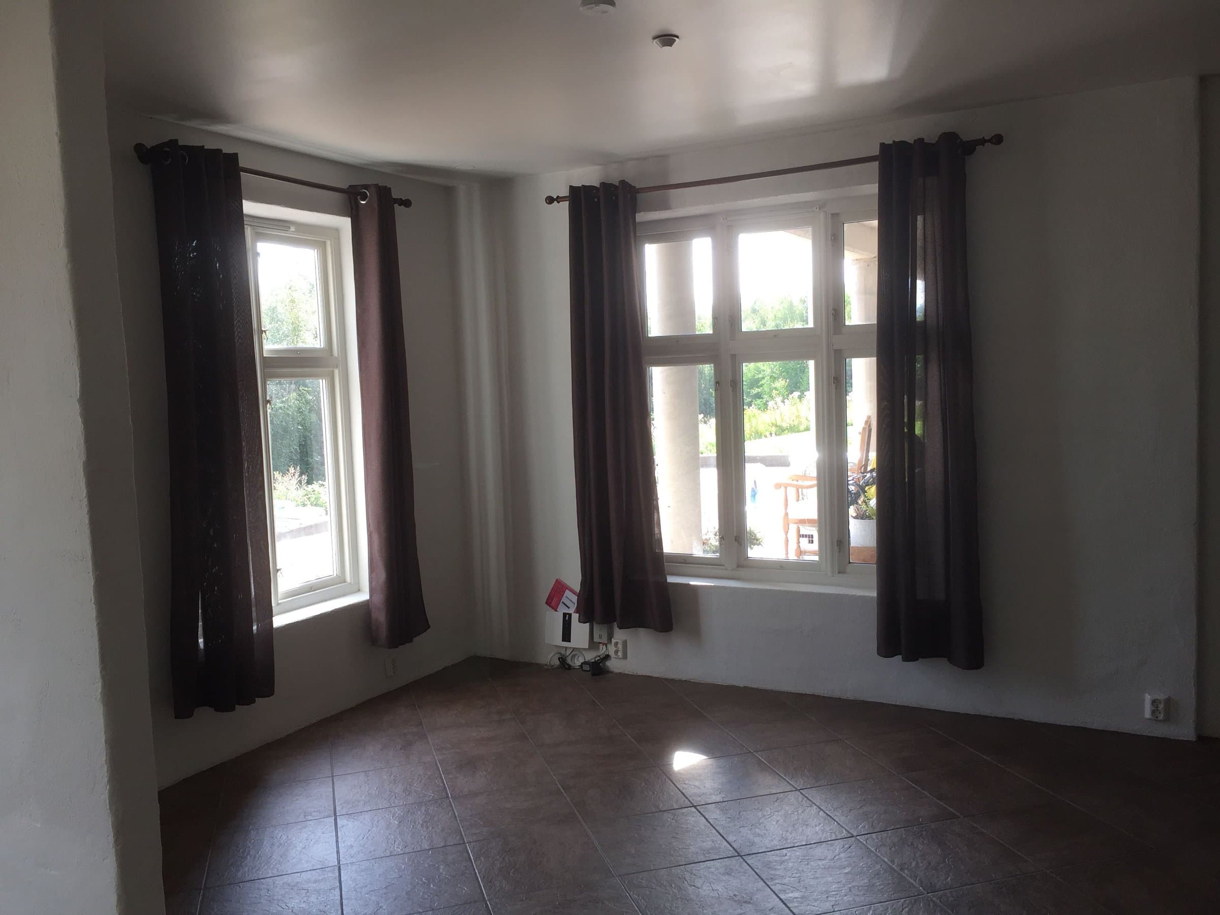 Det er også vannbåren gulvvarme i alle gulv i disse to utleie-enhetene, med unntak av gulvet på soverommet til leilighet Vest. Huset har montert sprinkleranlegg i hele 1. og 2. etasje, inkludert de to utleie-enhetene, som en ekstra sikkerhet mot brann. Tomten rundt huset er på ca. 2000 m2 og er romslig og stor. Det er oppmurt et stort uteareal ved alle de tre boenhetene, og dette området er belagt med belegningsstein. Huset er stort sett ferdig innvendig, men noe arbeid gjenstår for at det skal være helt perfekt. Det gjenstår noe utvendig arbeid på både hus og tomt. Noe plen er opparbeidet og noe gjenstår. Ser man positivt på dette så gir det nye fremtidige eiere mulighet til å sette sitt eget preg på uteareal og huset for øvrig. Det medfølger et parti med like fliser som er benyttet både innvendig i huset og på terrasse, for å kunne fullføre dette arbeidet. Det er delvis opparbeidet parkeringsplass med framtidig plan om garasje.