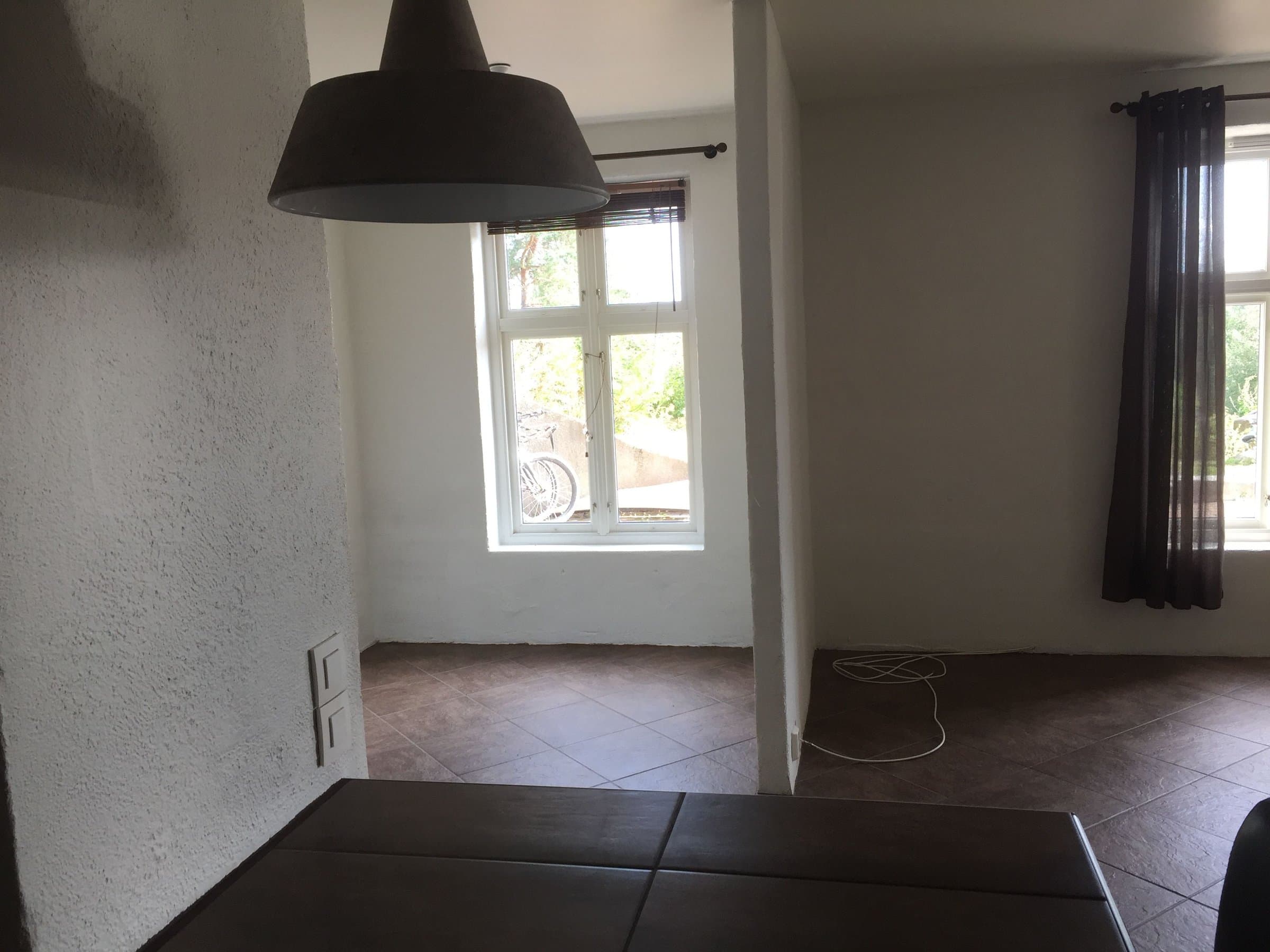 Leilighet Øst: Utleie-enheten mot øst er å betegne som en hybel. Denne har eget inngangsparti under overbygd tak mot øst. innenfor døren finner vi en liten gang med skyvedørsgarderobe, samt en adskilt sovealkove med skillevegg mot stuedelen. Stue og kjøkken har en delvis åpen planløsning, der en liten vegg og en flislagt barløsning skiller rommene på en fin måte. Kjøkkenet har godt med benkeskap og åpne hyller på veggen over. Et passelig stort bad med flislagt dusjnisje, toalett og servant montert på flislagt benk med mulighet for vaskemaskin under denne. Denne hybelen er pr dags dato utleid, og leietaker har et ønske om å følge med over til ny eier hvis muligheten byr seg. Ellers gjelder 3 måneders gjensidig oppsigelse for denne husleiekontrakten. Utenfor denne hybelens inngangsparti finnes også inngangsdøren til husets utvendige bod. Denne boden følger til dels husets bredde og byr på godt med lagringsplass.