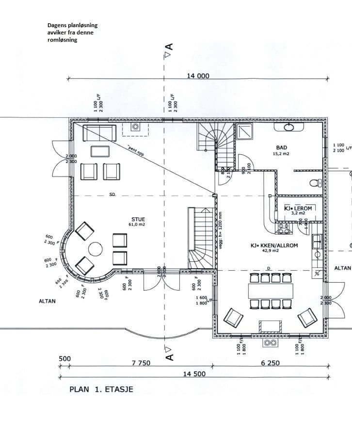 Fra stuen så er det delvis åpen løsning mot kjøkkenet, kun avdelt av trappen som kommer opp fra 1.etasje.