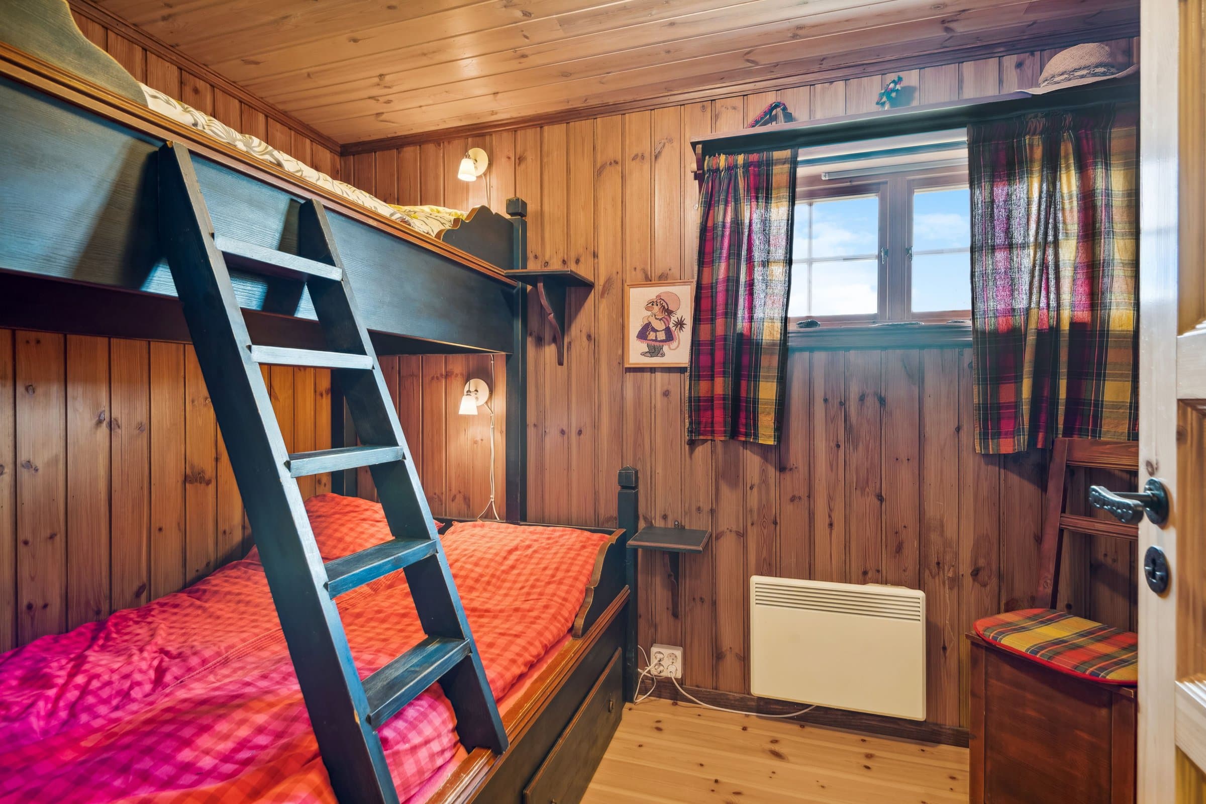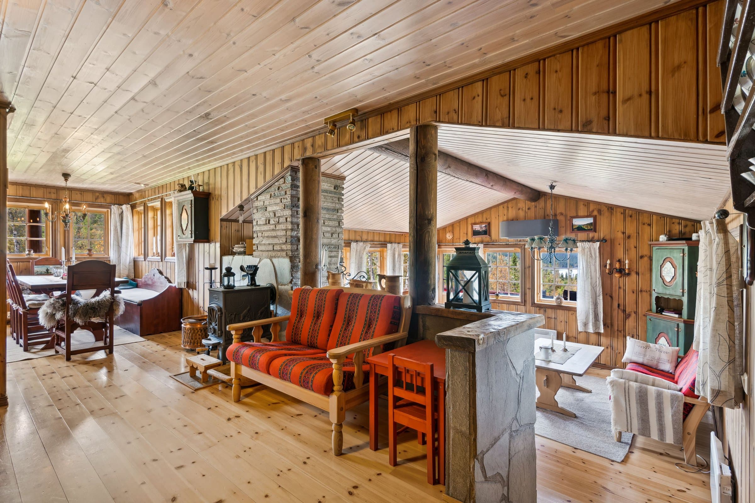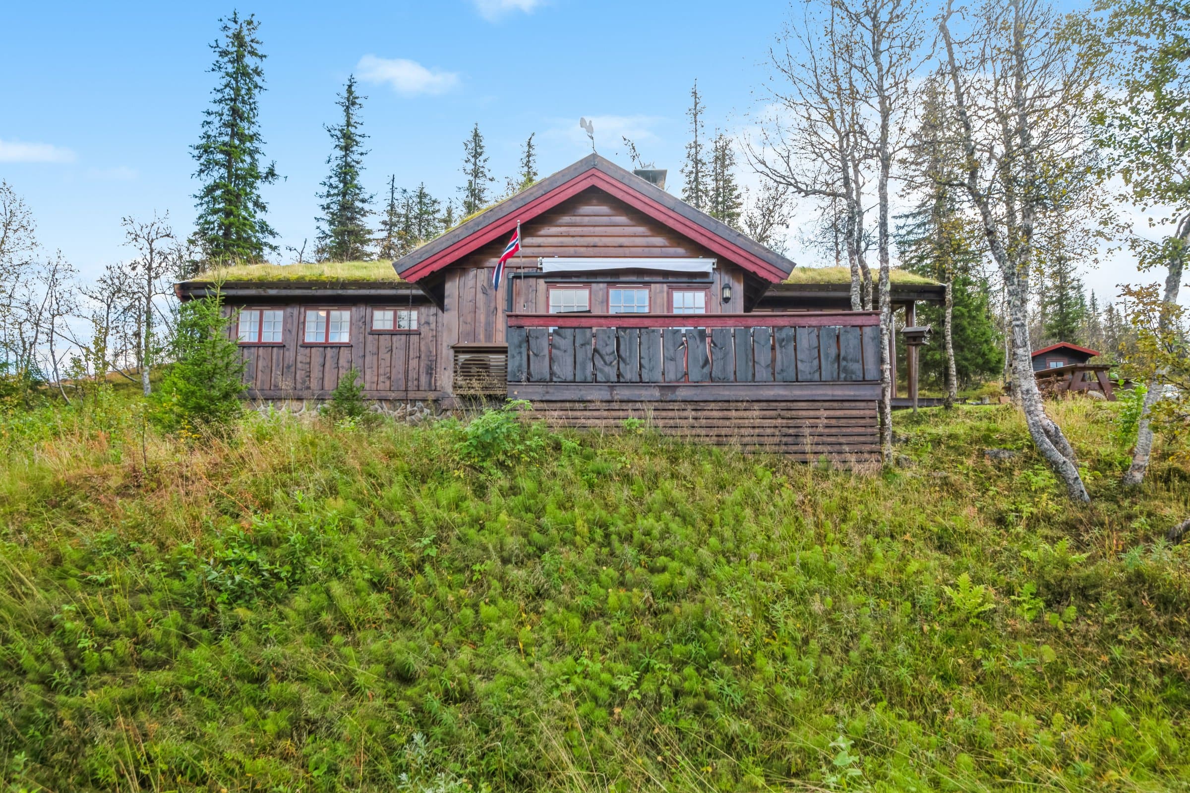 Hytte oppført med villmarkspanel i år 2000. Det er 3 soverom pluss hems, totalt 12 sengeplasser. Fint kjøkken med spiseplass. TV-stue og peisestue. På alle soverom og hems er det plassbygde møbler fra lokalt snekkerfirma. Aldringsmalt kjøkken og baderomsmøbler, spisebord og stoler samt diverse skap og skjenk. Fine uteplasser med nydelig utsikt mot Synnfjellet og fjorden. Det gode solforhold på eiendommen. Flislagt bad samt badstue, utgang fra badet. Det innlagt vann fra egen boret brønn og septikktank på 10 m3. Innlagt strøm med varmekabler på bad og gang. Resten av hytta varmes opp med varmepumpe fra 2022, samt peis og vedovn. Det finnes el varmeovner I alle rom, men benyttes sjelden eller aldri.