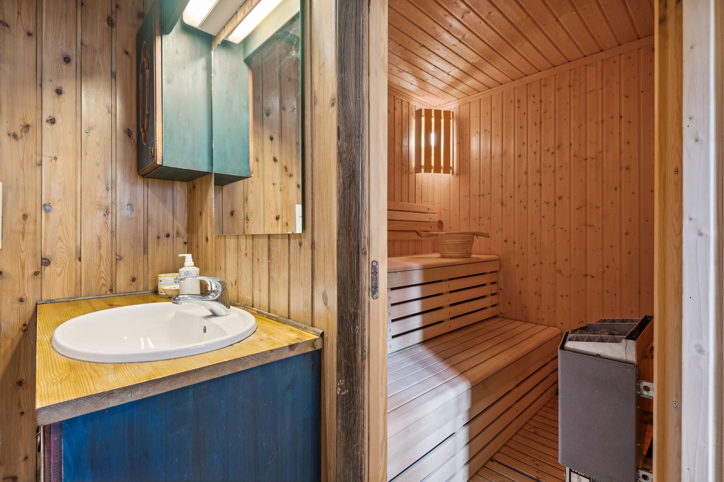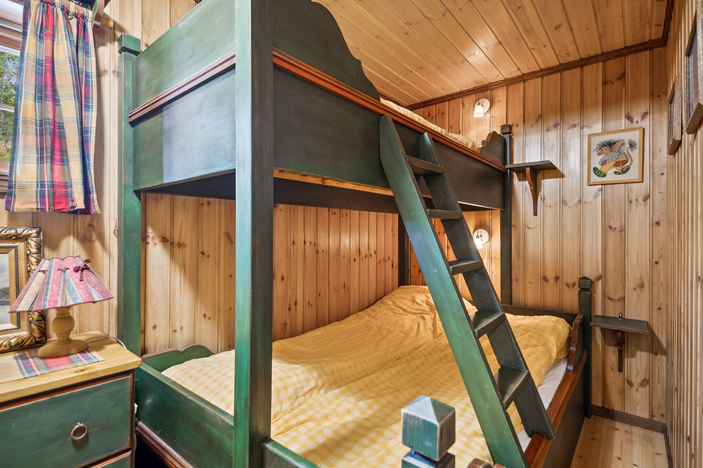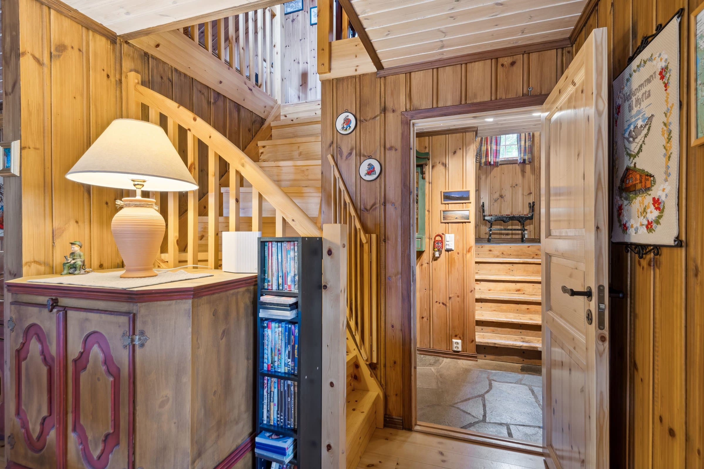 Hytte oppført med villmarkspanel i år 2000. Det er 3 soverom pluss hems, totalt 12 sengeplasser. Fint kjøkken med spiseplass. TV-stue og peisestue. På alle soverom og hems er det plassbygde møbler fra lokalt snekkerfirma. Aldringsmalt kjøkken og baderomsmøbler, spisebord og stoler samt diverse skap og skjenk. Fine uteplasser med nydelig utsikt mot Synnfjellet og fjorden. Det gode solforhold på eiendommen. Flislagt bad samt badstue, utgang fra badet. Det innlagt vann fra egen boret brønn og septikktank på 10 m3. Innlagt strøm med varmekabler på bad og gang. Resten av hytta varmes opp med varmepumpe fra 2022, samt peis og vedovn. Det finnes el varmeovner I alle rom, men benyttes sjelden eller aldri.