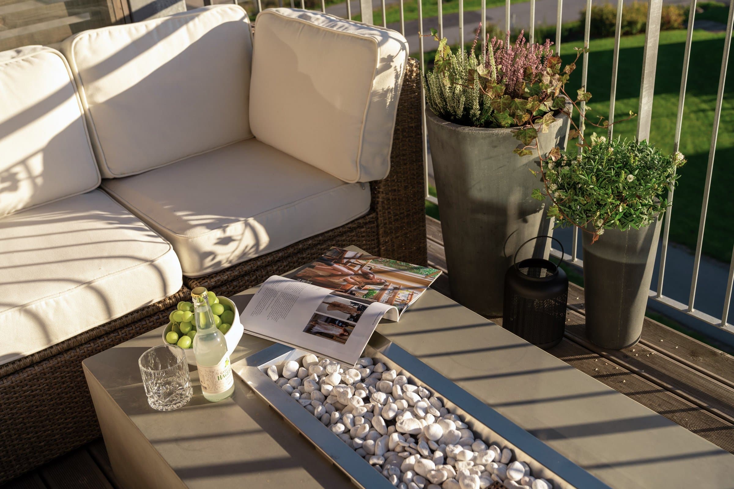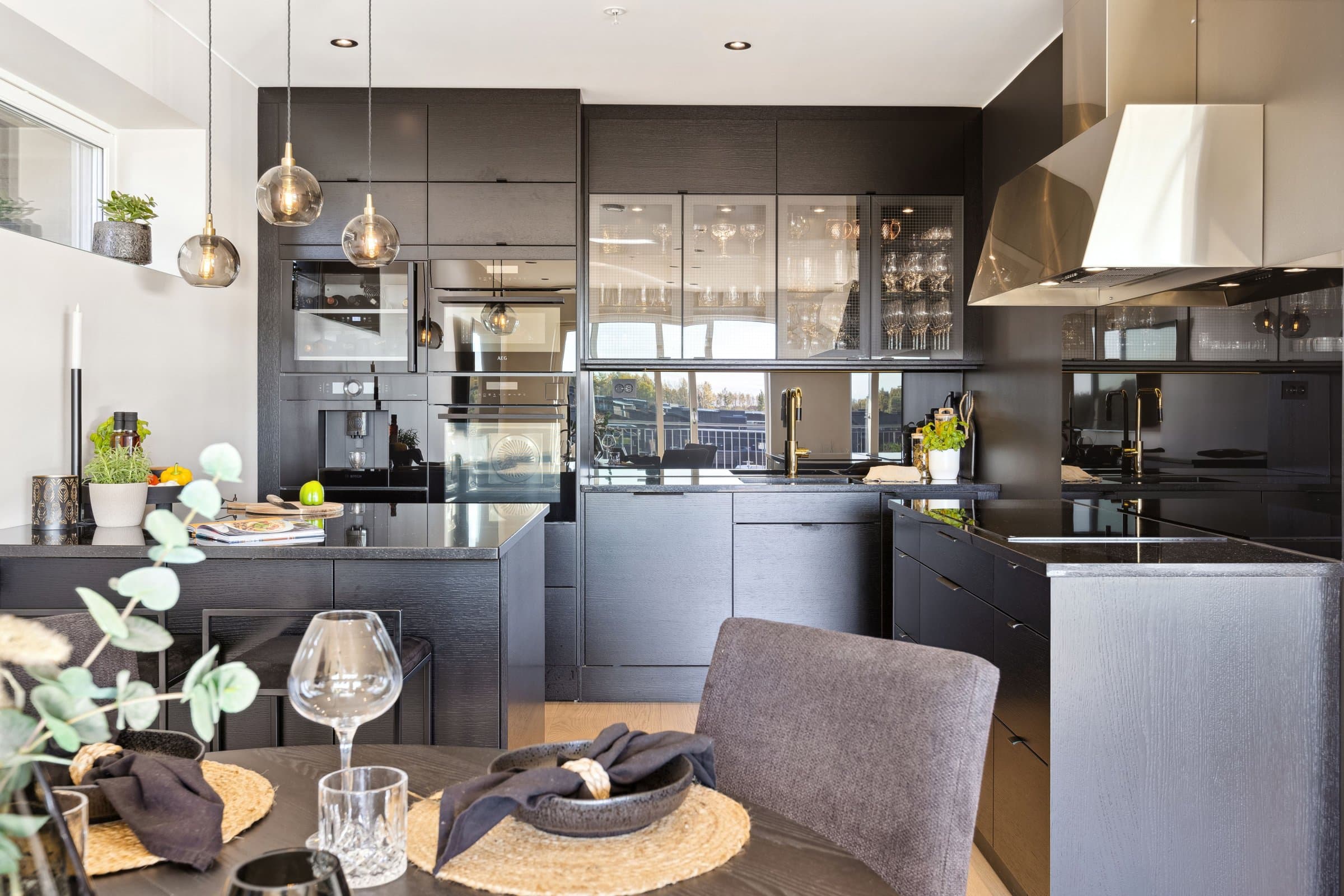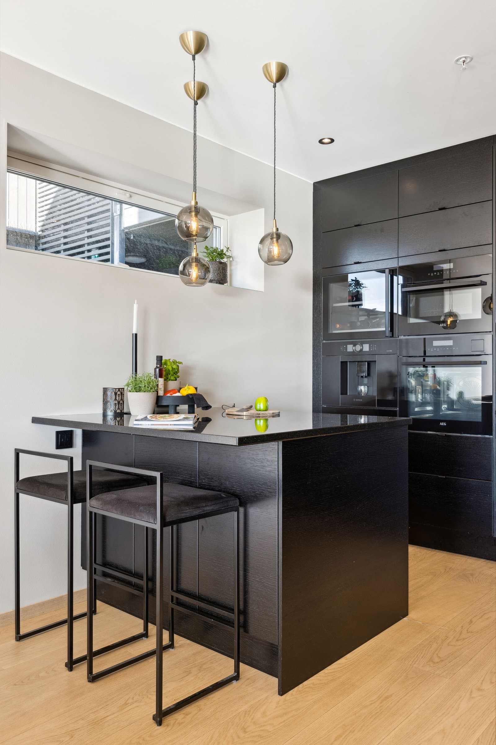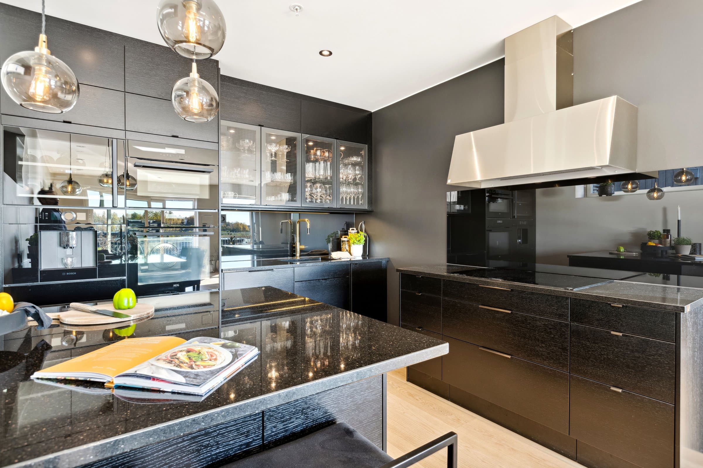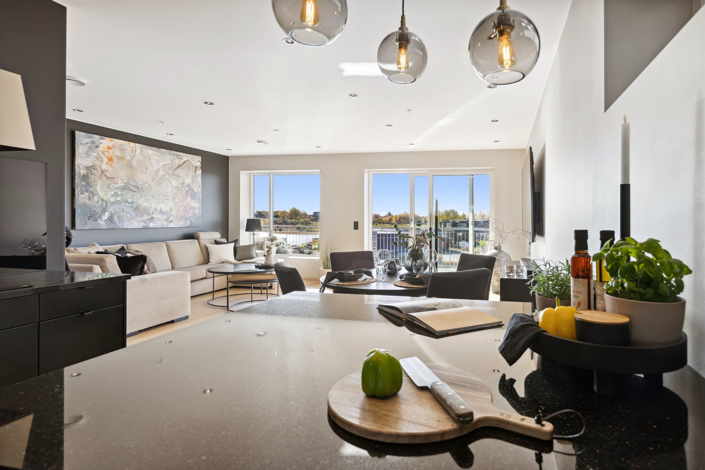 Videre inn kommer man til hjerte av boligen. En lys, luftig stue med åpen kjøkkenløsning og plass til flere sittesoner. Herfra er det dør inn til gjesterommet som i dag utvider stuen med en ekstra TV-krok. Her er det ingen utvendig screens da vindu går ut mot svalgang, men det er montert innvendige lameller for regulering av innsyn. Via skyvedøren tar man steget ut på den 20m2 store usjenerte verandaen - her kan utsikten og solen nytes fra tidlig til sent. I taket er det ettermontert spotter for en behagelig belysning og ekstra strømuttak til varmelampe. Her er det også mulighet for innglassing hvis ønskelig. I likhet med badet er hele kjøkkenet oppgradert – da med et stilsikkert kvalitetskjøkken fra Sigdal designet for optimal utnyttelse og åpenhet. Frontene Sigdal Lakriz 2.0 har lett strukturert overflate med beskjedne håndtak som nesten ubemerket glir inn i helheten. Skap med glassdører har glassplater slik at innebygd belysning kommer til sin rett. Deler av innredning går fra gulv til tak og har et velfylt utvalg integrerte hvitevarer - to stekeovner, vinskap, kaffemaskin, varmeskuff og oppvaskmaskin. Der det er fysisk mulig finnes også sokkelskuffer. Kjøkkenets midtpunkt er den sosiale øya med plass til barstoler – her er også de to kjøleskuffene plassert. Den separate stekesonen er praktisk utformet og har en stor flott ventilator levert av Røroshetta. Prikken over i-en er den lekre granitt benkeplaten fra Askim Steinindustri i utførelsen Black Galaxy. Her er det rett og slett hyggelig å lage mat!
