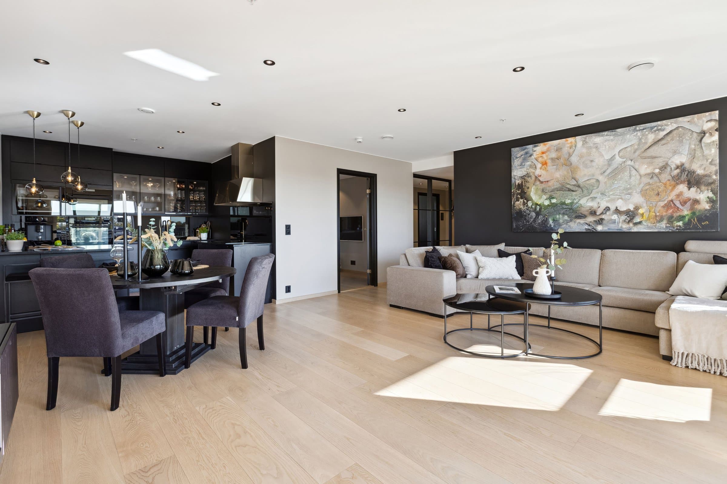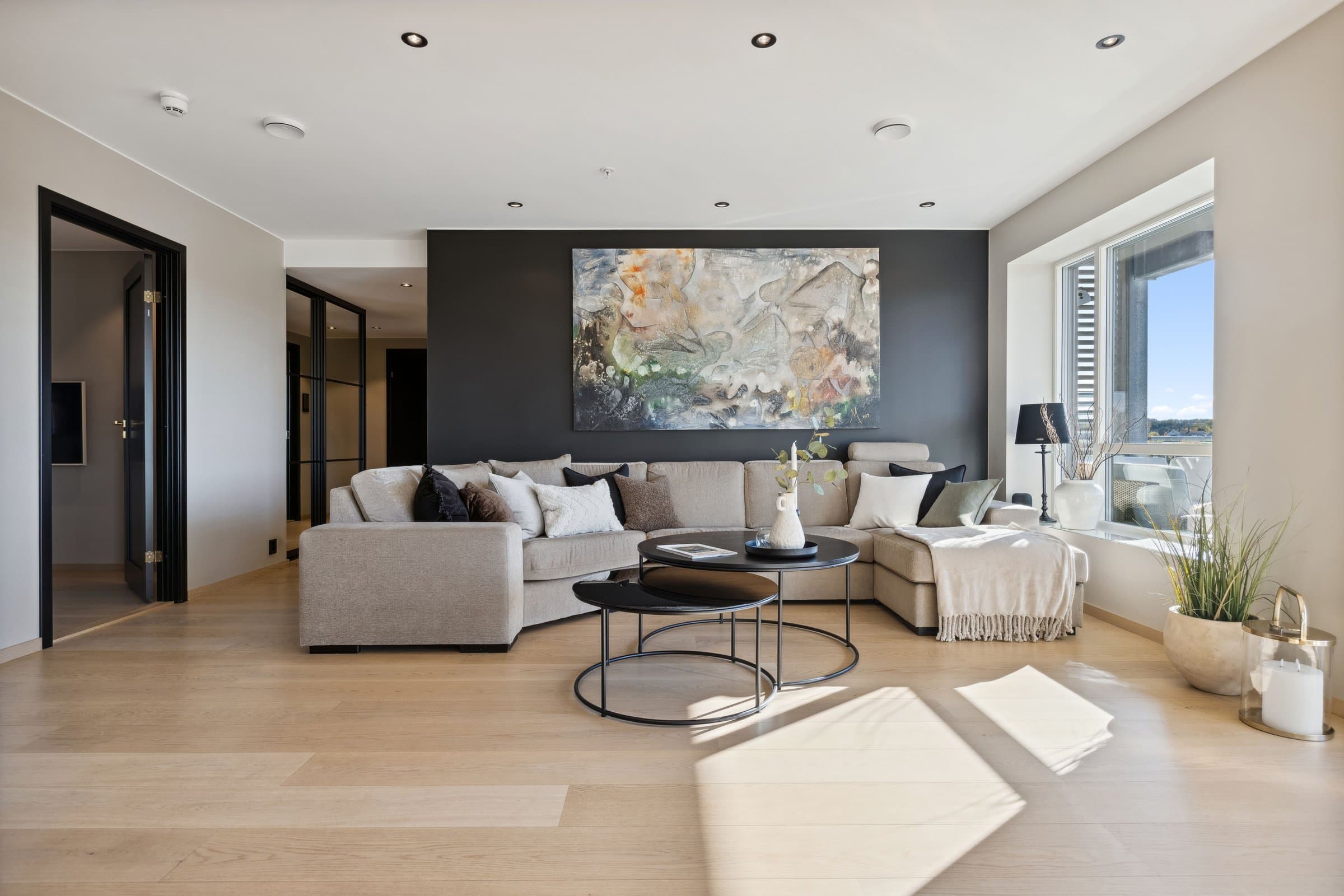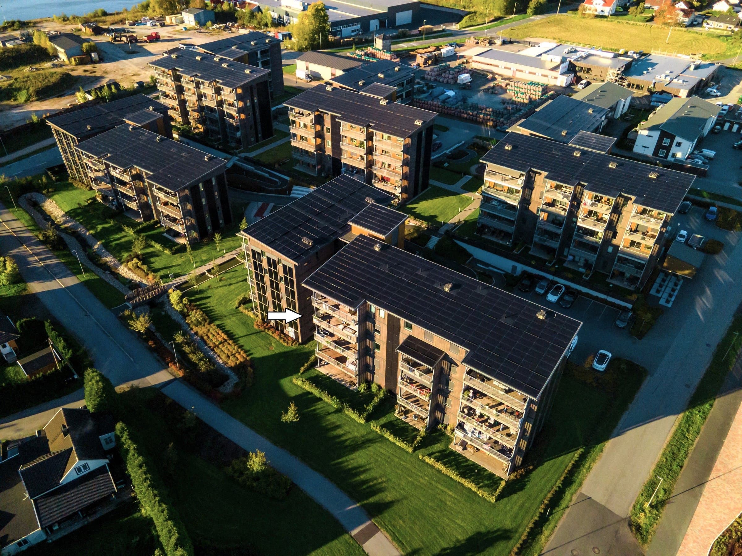 Denne leiligheten er en del av første byggetrinn som ble ferdigstilt i desember 2019. Her har utbygger lagt vekt på å bygge miljøvennlig med en fremtidsrettet plusshusstandard hvor boligene produserer opp til eget energibehov via solenergi - det betyr for deg lave strømkostnader. De har i tillegg hatt fokus på praktisk planløsning, estetikk og høy bokomfort. Leiligheten har generelt en gjennomgående høy standard. - Vannbåren gulvvarme med egen sensor i alle rom (ikke teknisk rom). - Utvendige motoriserte screens på alle solutsatte vinduer for enkel solskjerming. - Smarthusteknologi som lar deg styre lys, varme, solskjerming, inngangsdør mm. - Balansert ventilasjon. Selger har i byggeprosessen gjort betydelige tilvalg ut over standard leveranse. Fjernet flere nedkassinger og ventilasjonskasser i tak og vegg for et mer helhetlig uttrykk. Over gulvvarmen er det lagt en flott enstavs eikeparkett av merke Boen Eik Andante som gjør det lunt og behagelig for føttene året rundt - det er komplementert med tilhørende lister og terskler. For renere linjer er overgangen fra vegg til tak og vindusflater gjort listefritt - de dype vinduspostene er malt i veggfargen og belagt med spesialtilpassede glassplater. Det er byttet til sorte dører, skyvedørsgarderober og oppgradert det elektriske anlegget med sorte flate Elko Plus bryterpanel. I det slette malte taket er det montert et raust antall downlights med flere soneinndelinger som lar deg finjustere lys og ønsket stemning. Leiligheten ligger på enden av bygget, er gjennomgående med store vindusflater på 3 yttervegger og har en takhøyde på 2,5 m i de fleste rom. Veggene har slette malte flater i samme lyse delikate farge – dette til sammen gjør at boligen oppleves luftig med en behagelig atmosfære.