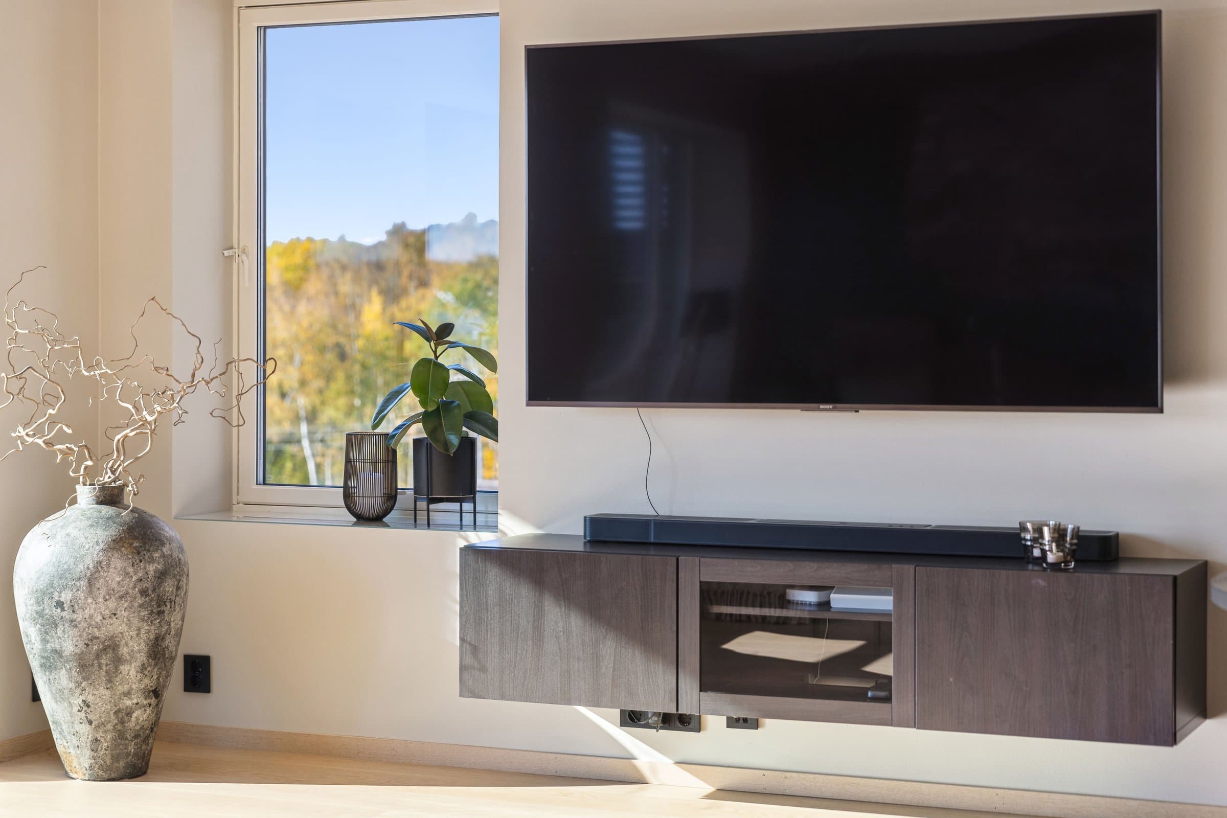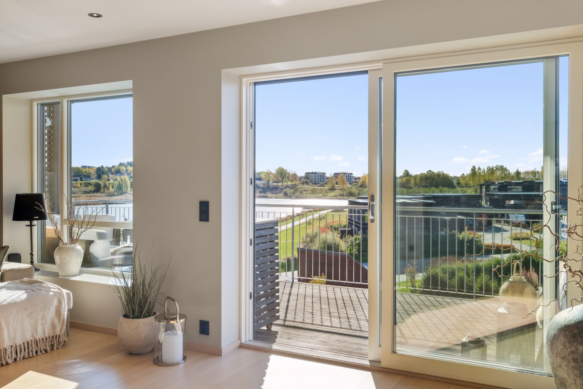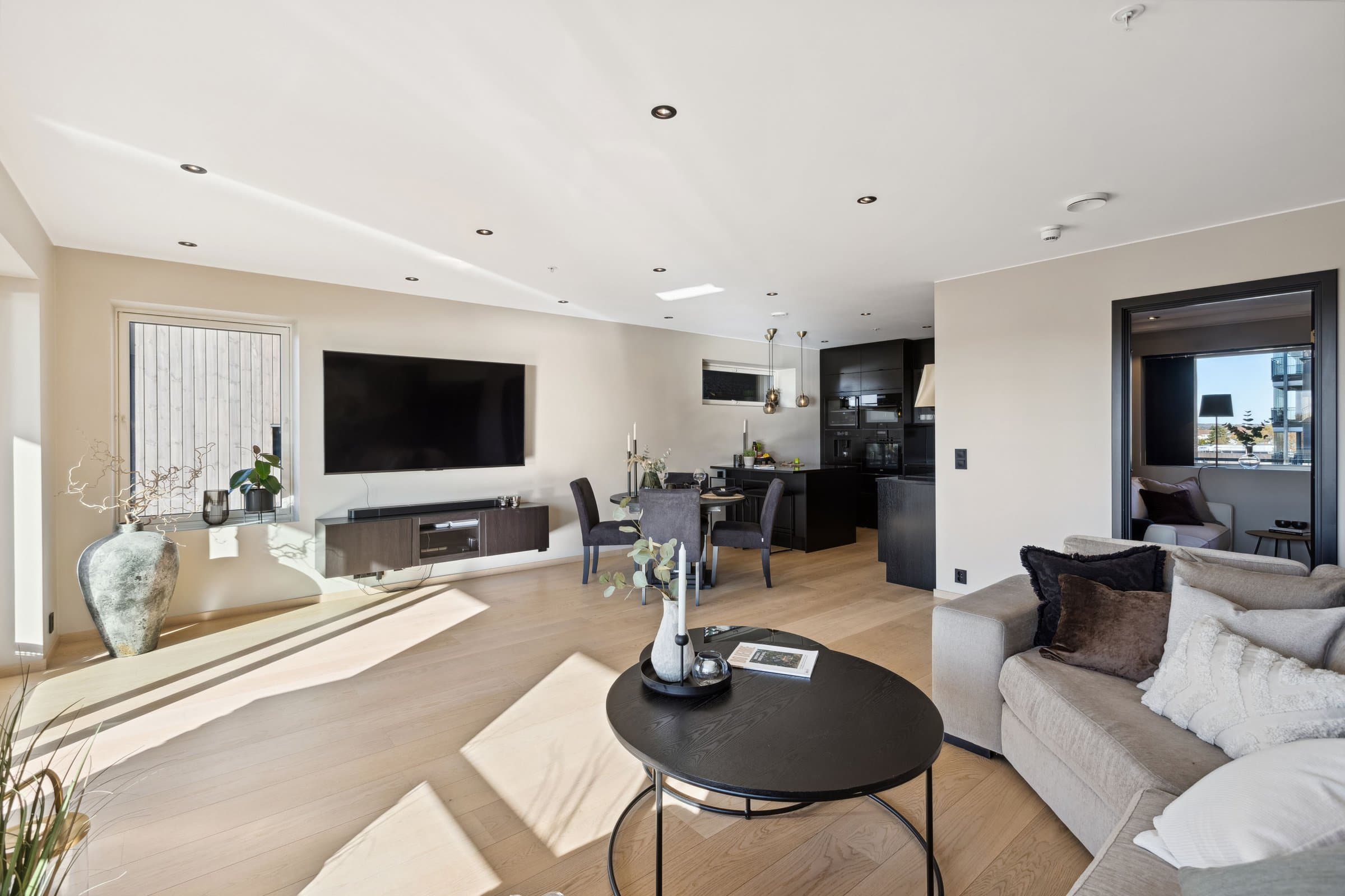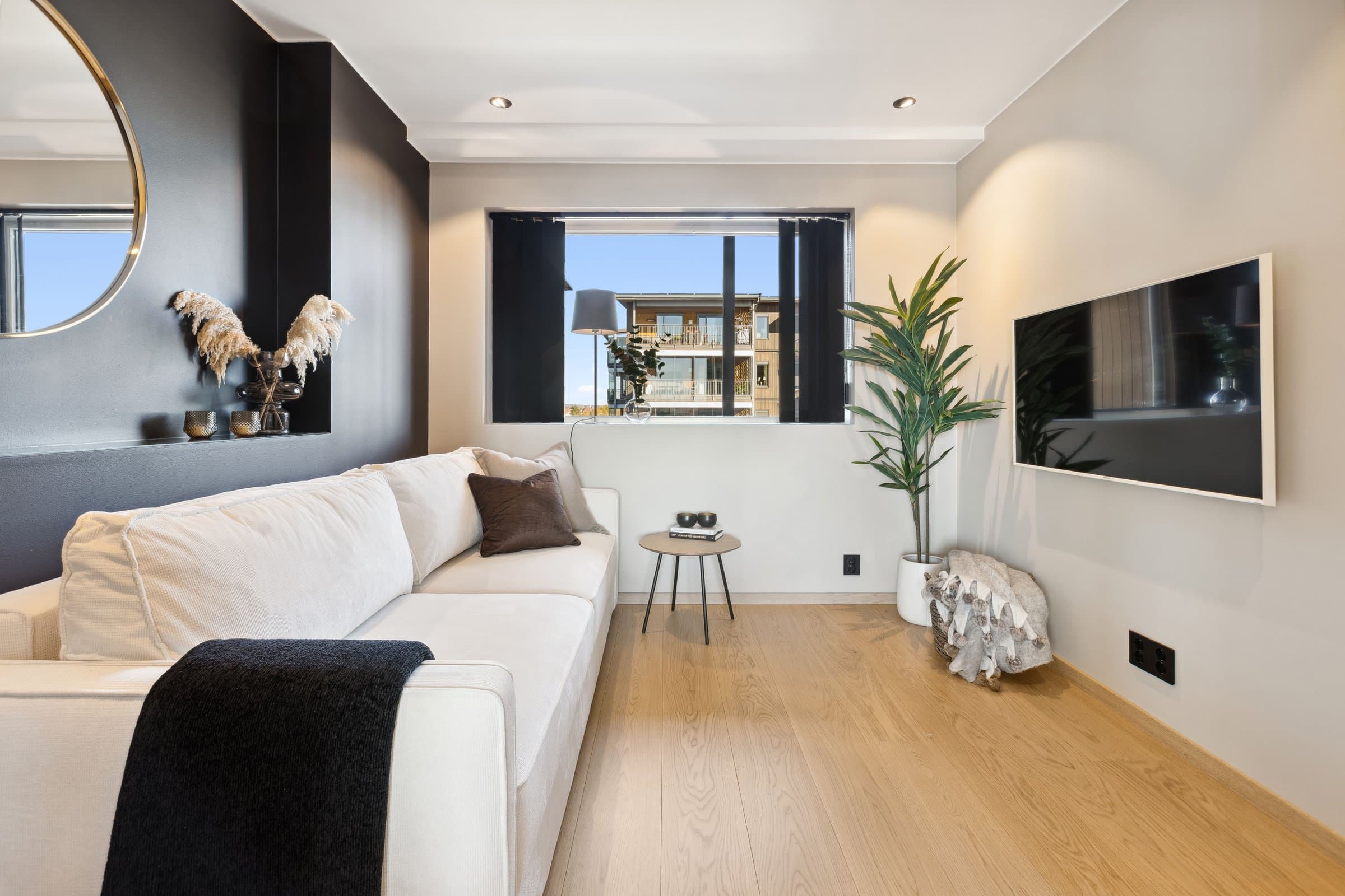 Denne leiligheten er en del av første byggetrinn som ble ferdigstilt i desember 2019. Her har utbygger lagt vekt på å bygge miljøvennlig med en fremtidsrettet plusshusstandard hvor boligene produserer opp til eget energibehov via solenergi - det betyr for deg lave strømkostnader. De har i tillegg hatt fokus på praktisk planløsning, estetikk og høy bokomfort. Leiligheten har generelt en gjennomgående høy standard. - Vannbåren gulvvarme med egen sensor i alle rom (ikke teknisk rom). - Utvendige motoriserte screens på alle solutsatte vinduer for enkel solskjerming. - Smarthusteknologi som lar deg styre lys, varme, solskjerming, inngangsdør mm. - Balansert ventilasjon. Selger har i byggeprosessen gjort betydelige tilvalg ut over standard leveranse. Fjernet flere nedkassinger og ventilasjonskasser i tak og vegg for et mer helhetlig uttrykk. Over gulvvarmen er det lagt en flott enstavs eikeparkett av merke Boen Eik Andante som gjør det lunt og behagelig for føttene året rundt - det er komplementert med tilhørende lister og terskler. For renere linjer er overgangen fra vegg til tak og vindusflater gjort listefritt - de dype vinduspostene er malt i veggfargen og belagt med spesialtilpassede glassplater. Det er byttet til sorte dører, skyvedørsgarderober og oppgradert det elektriske anlegget med sorte flate Elko Plus bryterpanel. I det slette malte taket er det montert et raust antall downlights med flere soneinndelinger som lar deg finjustere lys og ønsket stemning. Leiligheten ligger på enden av bygget, er gjennomgående med store vindusflater på 3 yttervegger og har en takhøyde på 2,5 m i de fleste rom. Veggene har slette malte flater i samme lyse delikate farge – dette til sammen gjør at boligen oppleves luftig med en behagelig atmosfære.
