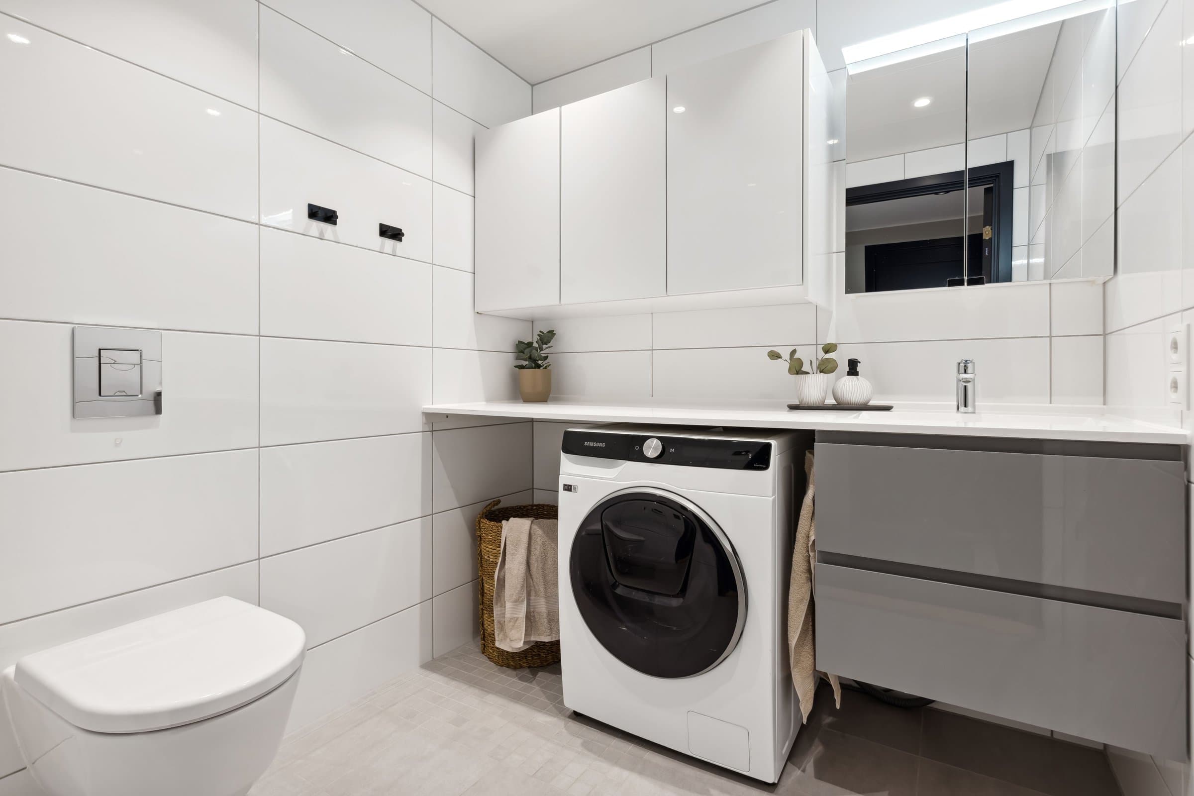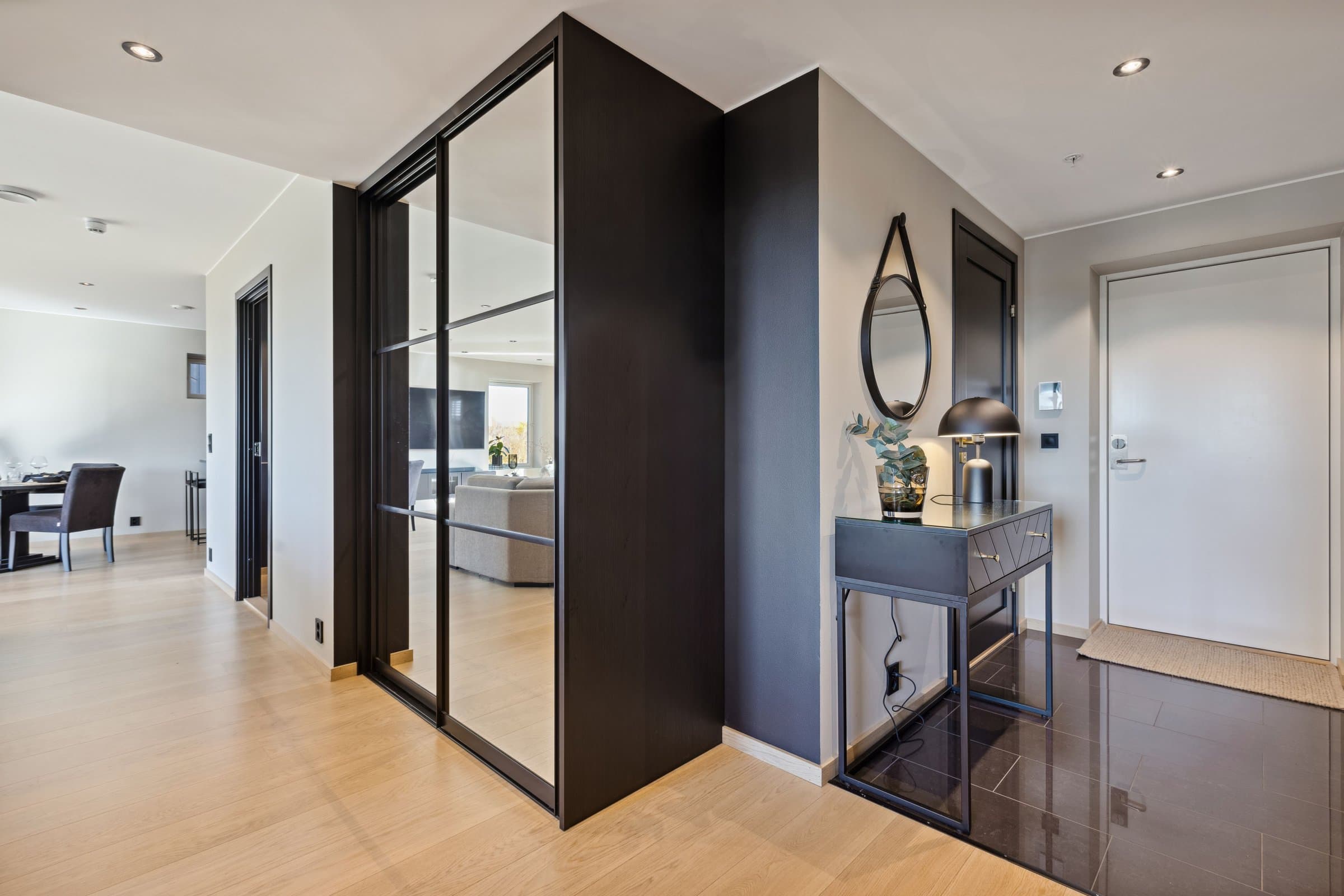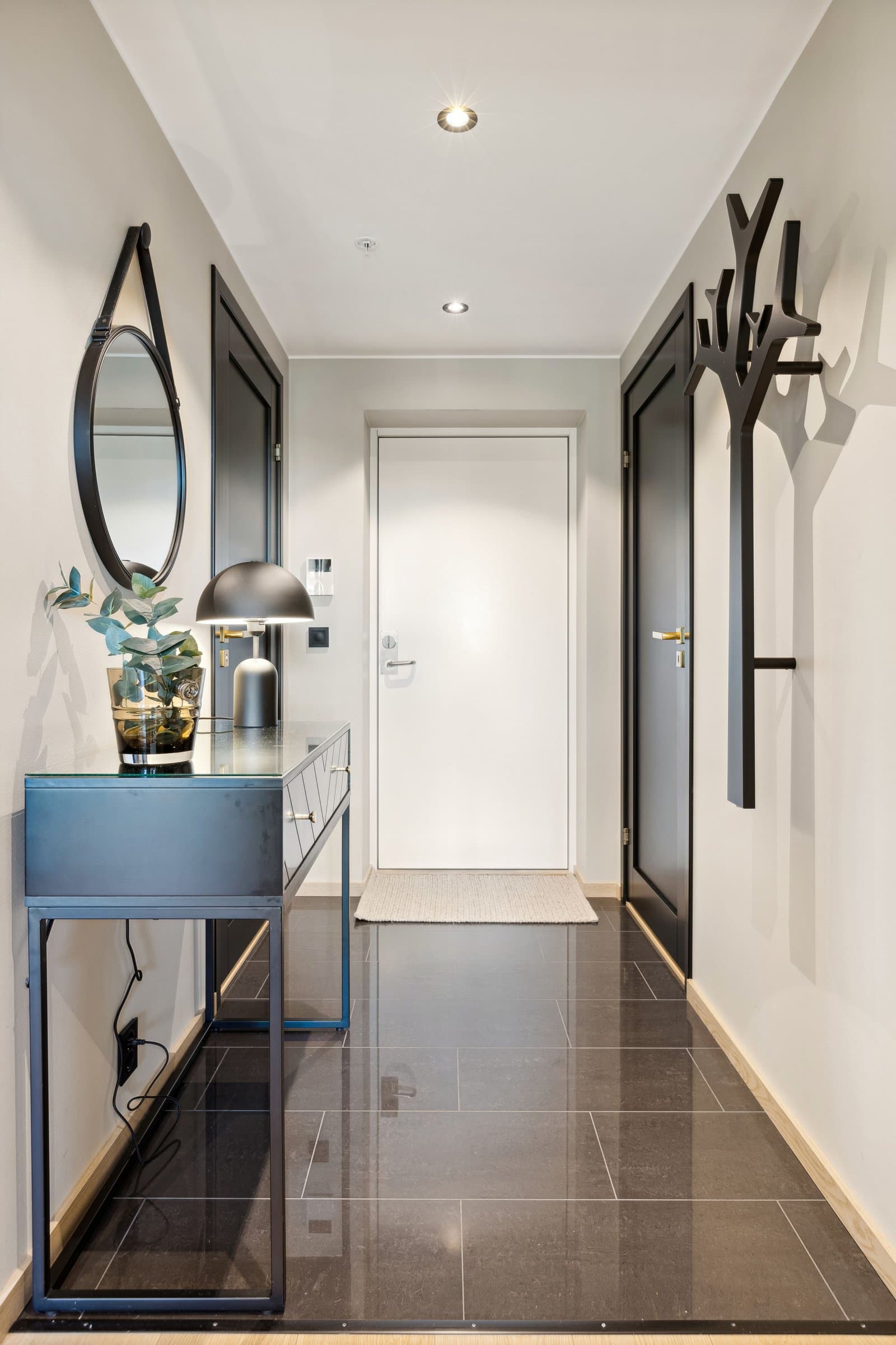 Det første som møter deg er en innbydende entrè med sorte blankpolerte fliser på gulvet. Ytterdør er utstyrt med utvendig kodelås, på innsiden er det montert porttelefon med videomonitor for kontroll av hoveddøren inn til trappehuset. Fra entrè er døren inn til teknisk rom med plass til lagring og ekstra kombiskap. Rommet er i dag utstyrt med fastmontert skoskap og oppheng til yttertøy. I egen nisje rundt hjørnet finnes det i tillegg en skyvedørsløsning for ytterligere oppbevaring. På den andre siden ligger badet som også fyller rollen som vaskerom. Vaskemaskin kan her plasseres delvis skjult og er lite fremtredende under den heldekkende benkeplaten. Det lyst og praktisk innredet med svært god belysning når klær skal organiseres. Åpnes døren rett frem trer man inn i det største soverommet - innredet med skyvedørsgarderobe og har godt med gulvplass selv med en king zise seng. Fra det store vertikale vinduet er det fri utsikt utover dammen – her er det fantastisk å ta morgenkaffen og se dagen våken til liv. Vegg i vegg ligger hovedbadet i all sin prakt - her er all standard innredning valgt bort. De 60x60 Agrob Buchal Trial flisene er videreført fra gulv til vegg for et helhetlig inntrykk. Servanten fra Moon er spesialbestilt på mål – designet for hverdagsluksus, stram og elegant med særpreg – Made in Italy. Dusjen er skjermet med 90x90 kvalitetsdører fra Satina. En av disse er en speildør som gir begrenset innsyn i dusjen, begge kan legges inn for større gulvplass. Et lekkert bad som byr på en god dose spafølelse! Soverom 2 har også vindu mot sør, innredet med et enkelt garderobeskap og benyttes i dag til kontor.