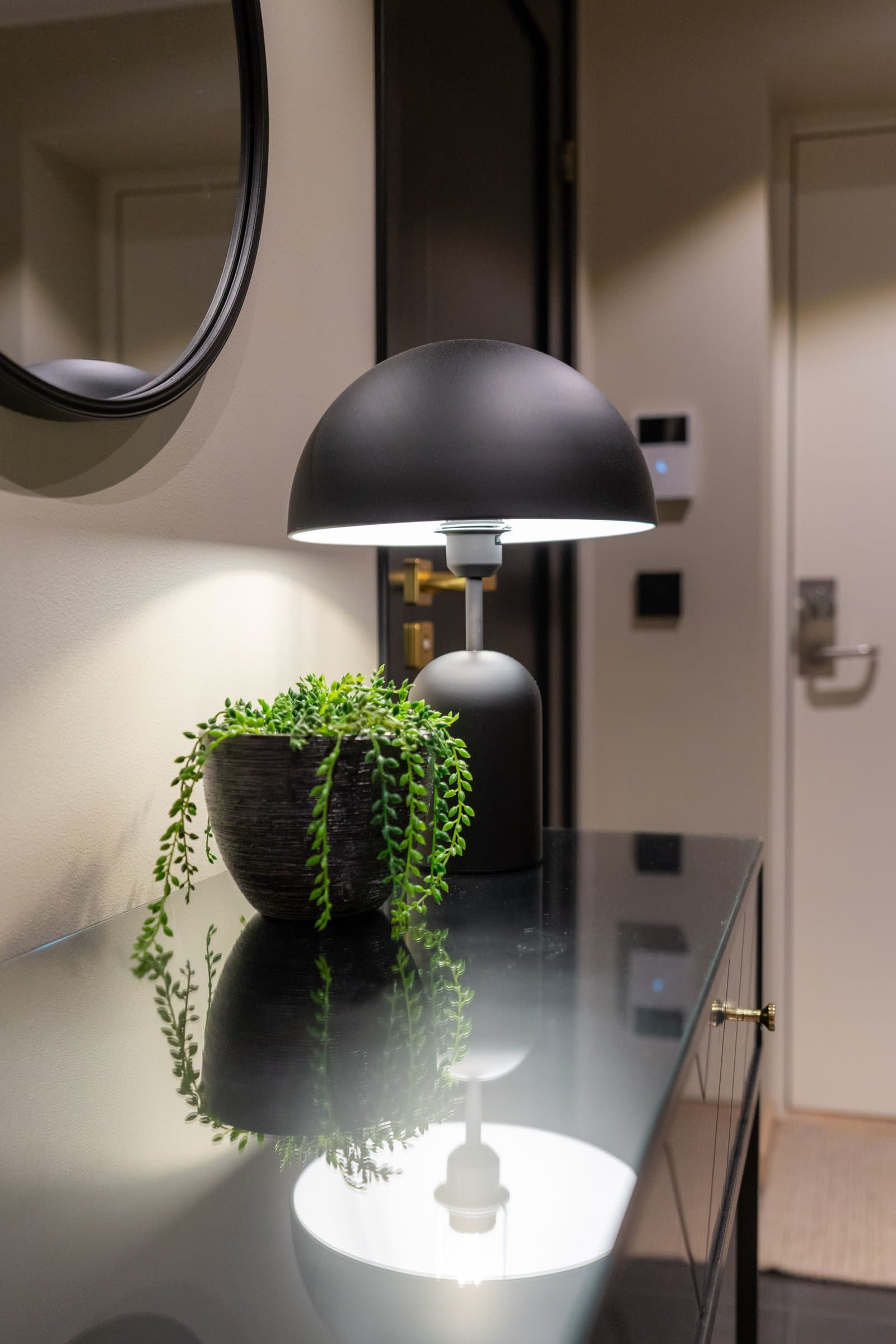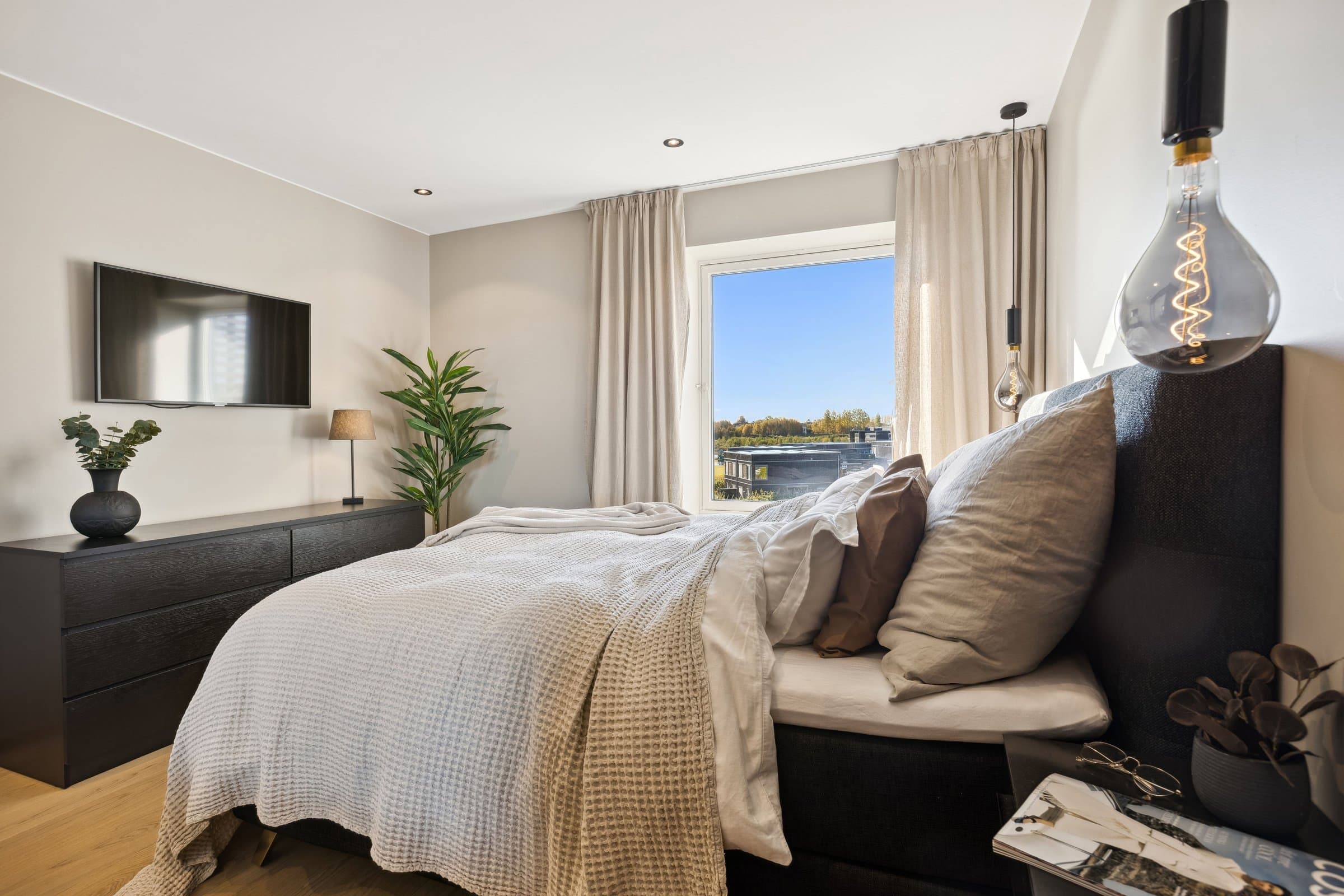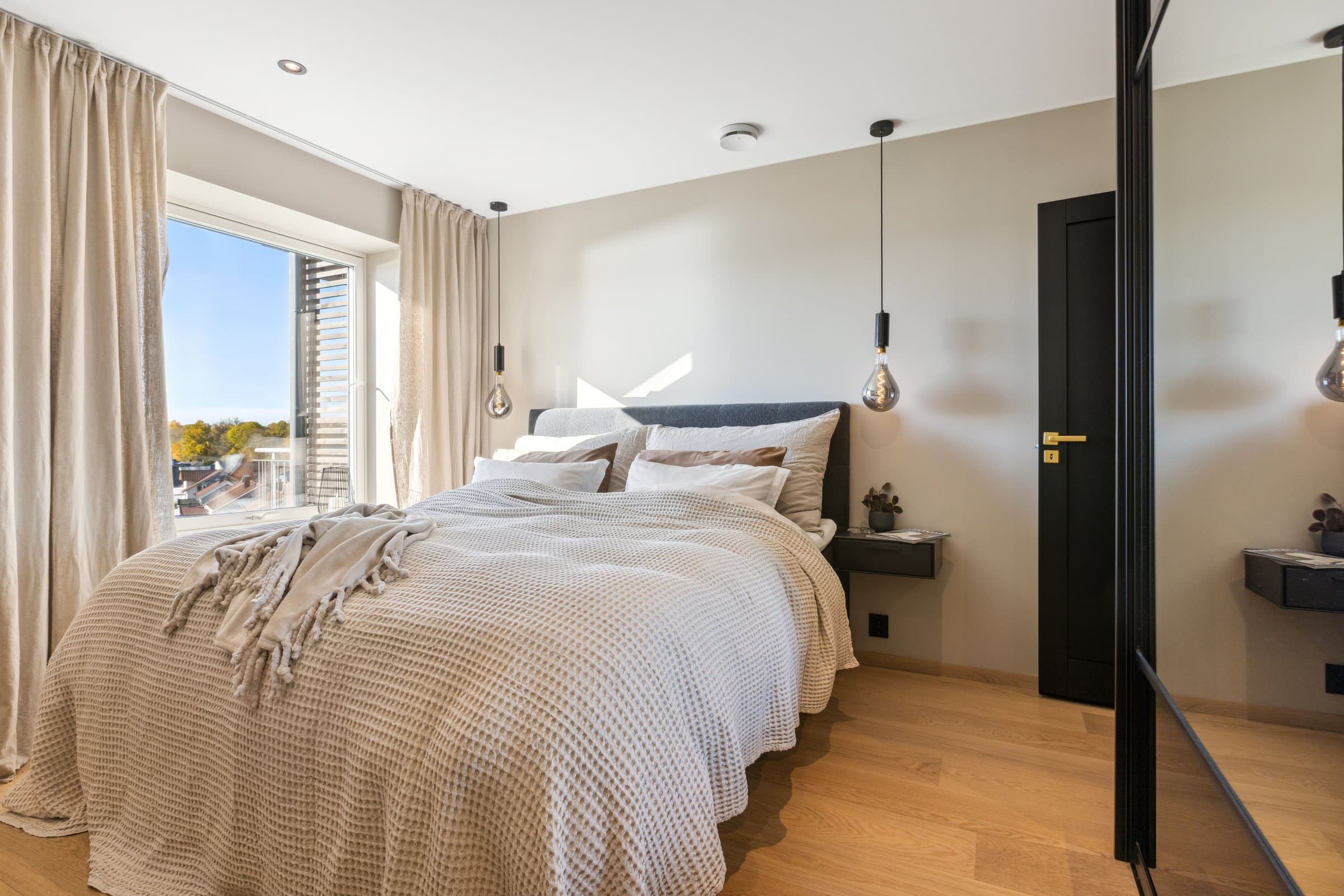 Det første som møter deg er en innbydende entrè med sorte blankpolerte fliser på gulvet. Ytterdør er utstyrt med utvendig kodelås, på innsiden er det montert porttelefon med videomonitor for kontroll av hoveddøren inn til trappehuset. Fra entrè er døren inn til teknisk rom med plass til lagring og ekstra kombiskap. Rommet er i dag utstyrt med fastmontert skoskap og oppheng til yttertøy. I egen nisje rundt hjørnet finnes det i tillegg en skyvedørsløsning for ytterligere oppbevaring. På den andre siden ligger badet som også fyller rollen som vaskerom. Vaskemaskin kan her plasseres delvis skjult og er lite fremtredende under den heldekkende benkeplaten. Det lyst og praktisk innredet med svært god belysning når klær skal organiseres. Åpnes døren rett frem trer man inn i det største soverommet - innredet med skyvedørsgarderobe og har godt med gulvplass selv med en king zise seng. Fra det store vertikale vinduet er det fri utsikt utover dammen – her er det fantastisk å ta morgenkaffen og se dagen våken til liv. Vegg i vegg ligger hovedbadet i all sin prakt - her er all standard innredning valgt bort. De 60x60 Agrob Buchal Trial flisene er videreført fra gulv til vegg for et helhetlig inntrykk. Servanten fra Moon er spesialbestilt på mål – designet for hverdagsluksus, stram og elegant med særpreg – Made in Italy. Dusjen er skjermet med 90x90 kvalitetsdører fra Satina. En av disse er en speildør som gir begrenset innsyn i dusjen, begge kan legges inn for større gulvplass. Et lekkert bad som byr på en god dose spafølelse! Soverom 2 har også vindu mot sør, innredet med et enkelt garderobeskap og benyttes i dag til kontor.