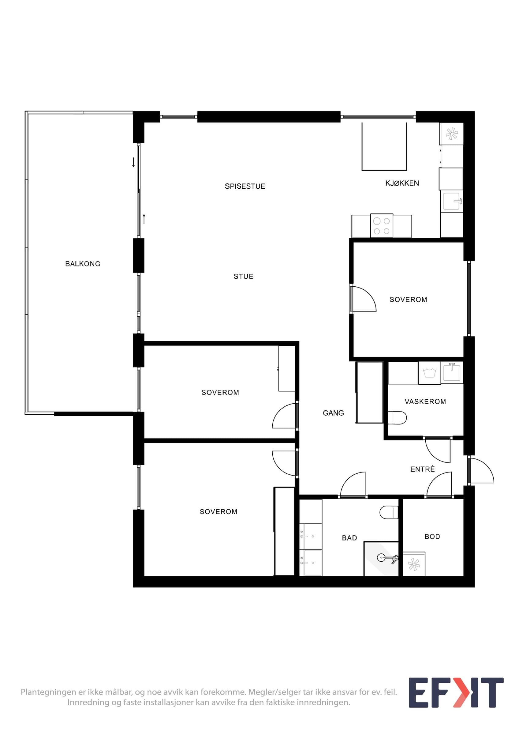 Gang, teknisk rom, 2 bad, 3 soverom, kjøkken og stue med utgang til veranda.