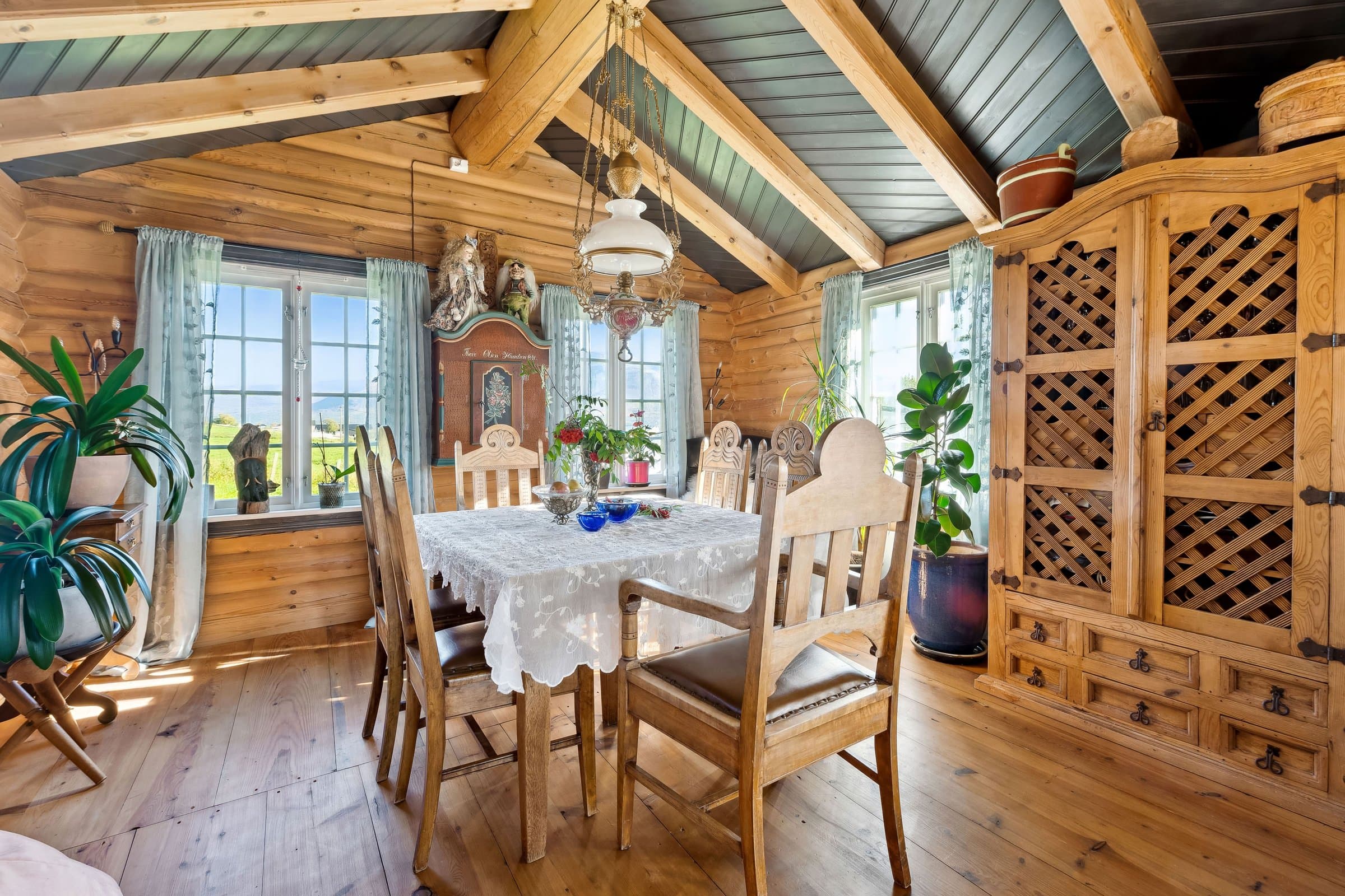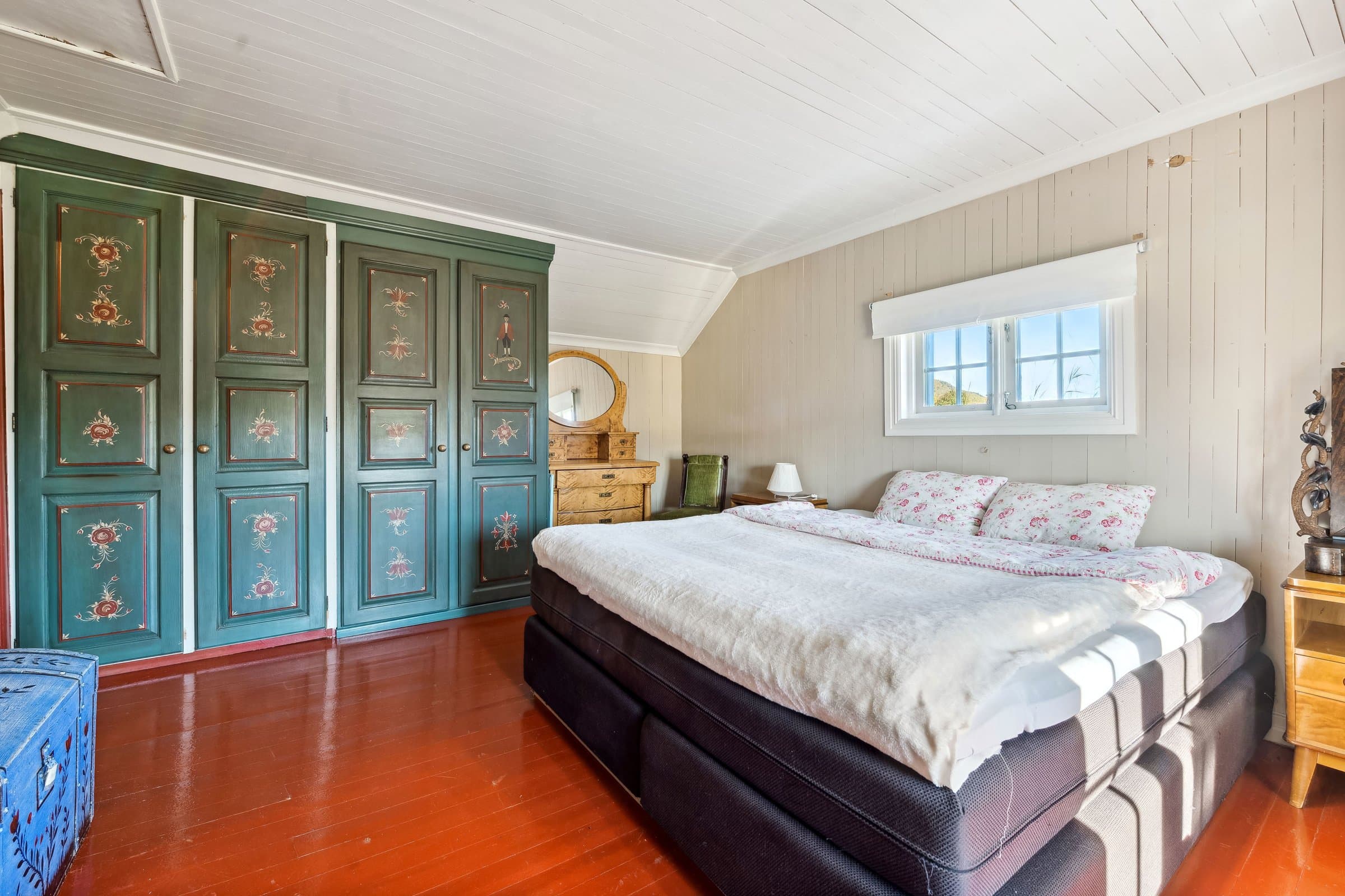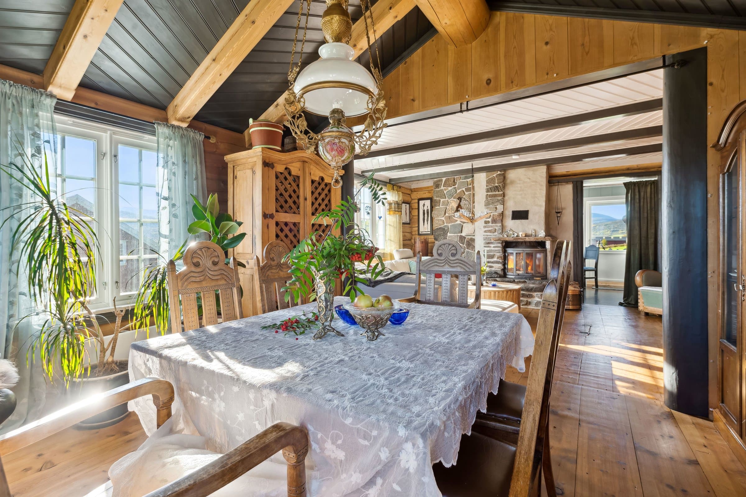 Fredtun 2 etg. Boligen har 2 soverom og en eventyrlig alkove i gangen , ett toalett . Hoved soverommet kan gjøres om til to om det er ønskelig. 1 etg. Inner og yttergang har Oppdals skifer lagt i gulvene. Bad med tilhørende rom for vaskemaskin/tørketrommel. Ett koselig kjøkken med utsikt mot Storhornet og Trollheimen. Hvitevarer følger med. Stue/peisestue som har aura av fordoms tid hvor det gamle har blitt tatt vare på. Det er lett å finne sjelero etter en lang dag ute i skibakkene eller vandring i fjellheimen foran en knitrende peis.Alle dørene i huset er fra "før i tiden" med malte og håndskrevne skildringer fra livets sene. Hovedhuset ble satt opp i 1936 og i 2000/2002 ble det foretatt vesentlige påkostninger. Siden 2017 frem til 2024 har det blitt lagt ned ett moderne vann/kloakksystem, strøm kabler ute og inne i anneksene/boden. Hovedhuset er blitt etterisolert utvendig. Undertak stue/kjøkken til kjeller har ny isolering. Garasjen ble bygd i 2017 og har fått ett isolert påbygg som Fungerer som bod. Påbygget er på ca 12 m2 . Begge anneksene har blitt vesentlig påkostet og leies ut via Airbnb. Alt av inventar av disse to følger med i salget. Boden på 10m2 er isolert og har muligheter for å legge inn vann/kloakk. Badstue/dusj muligheter.Utenfor boden er det klarert for å koble opp til eventuelt jacuzzi der det er bygd opp en blå glassvegg mot Storhornet. Torvtaket på hovedhuset ble i 2019/2020 påført ny jord med blomsterfrø. Tomten har også gjennomgått store forandringer der det er blitt en flott plen hvor det har blir beplantet med bærbusker, jordbær/potet kasser, Syriner og diverse stauder .