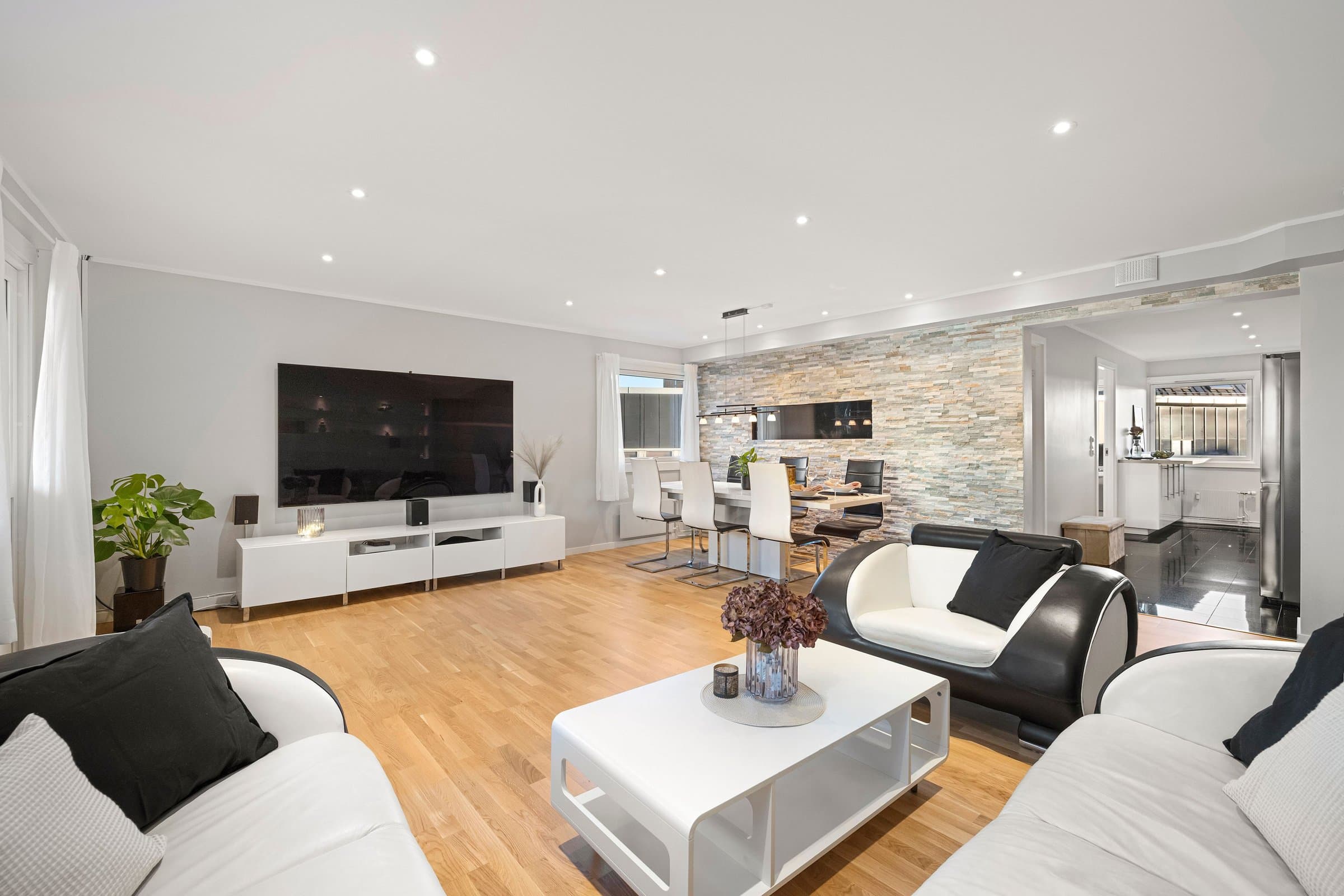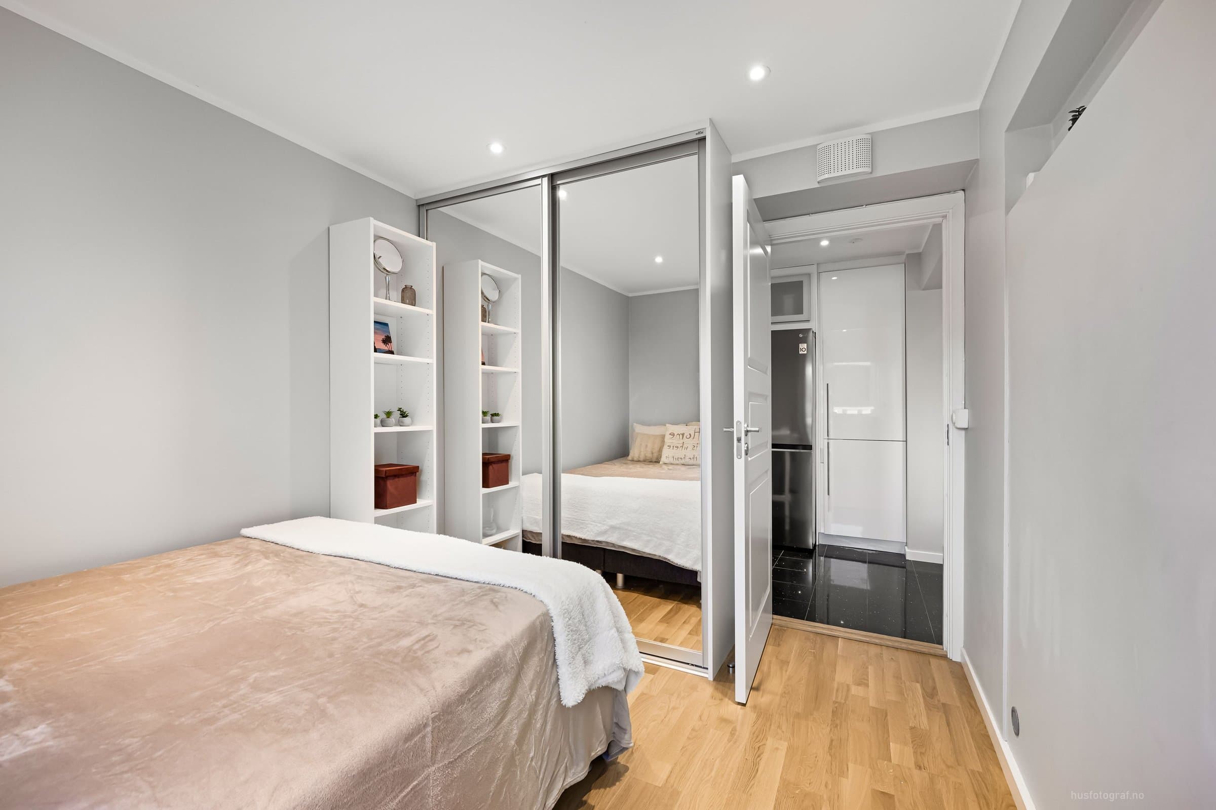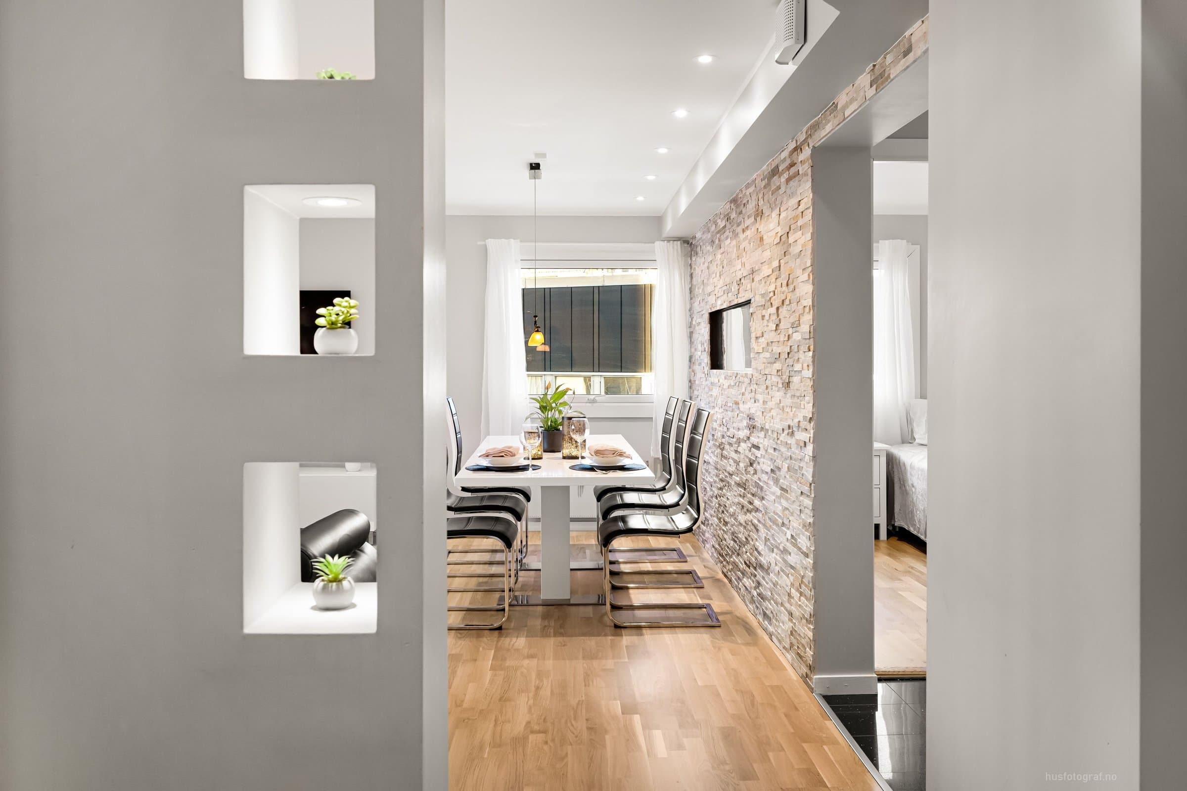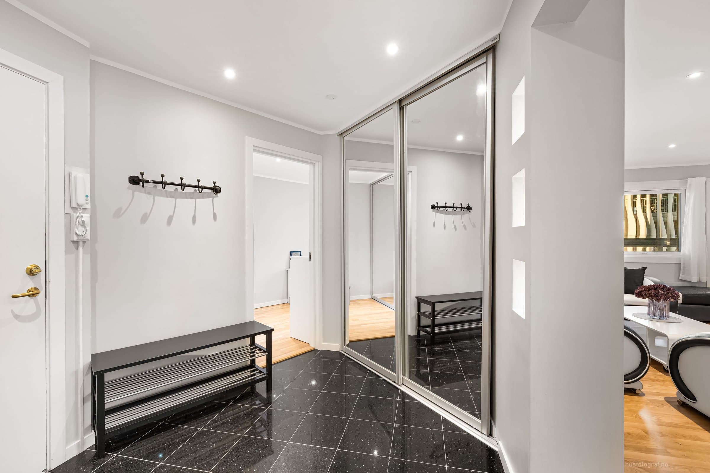 Leiligheten ligger i 2.etasje og har adkomst via felles gang med trapp & heis. Bod: 1stk i kjelleren på ca 2m^2 Entre: - Gulv: varmekabel & fliser - 4x downlights m/dimmer - Skyvedørsskap m/speil. - Knaggrekke. - 3x "hyller" med downlights - Porttelefon m/ automatisk døråpner. Soverom 1: (ved entre) - Gulv: Parkett - 4x downlights m/dimmer - Skyvedørsskap m/speil - Hyller med glass i "kott" & lys. Bad: (Okt 2024 m/unntak) - Flislagt bad med varmekabel. - Speil - Toalett m/soft close - Stikk til hårføner/barbermaskin osv. - Stikk til eventuelt tørketrommel. - Dusjvegger - Takdusj (fra 2014) - Lys til speil (fra 2014) - 5x downlights m/dimmer (downlights fra 2014, dimmer/bryter fra 2024) - 2x bolleservanter, 2x vannkraner & skap. (fra 2014) Stue: - Gulv: parkett - Hyller med 8x downlights - 13x downlights m/dimmer - Taklampe - Steinvegg m elektrisk peis m/u varme. - Opplegg for 5-1 surround lyd. - Opplegg for prosjektor. Balkong: Innglassert balkong på ca 7m2. Kjøkken: - Gulv: fliser & varmekabel. - Kjøkken med integrerte hvitevarer. (oppvaskmaskin, mikro, stekeovn.) - 6x downlights m/dimmer. - Oso 200L vannbereder - Vaskemaskin. Soverom 2: - Gulv: parkett - Skyvedørsskap m/speil. - Hylle i vegg. - 4x downlights m/dimmer Soverom 3: - Gulv: parkett - Skyvedørsskap m/speil. - 4x downlights m/dimmer. Kjøleskap (mars. 24) & Tv 85' (okt. 23) kan følge med mot et tillegg.