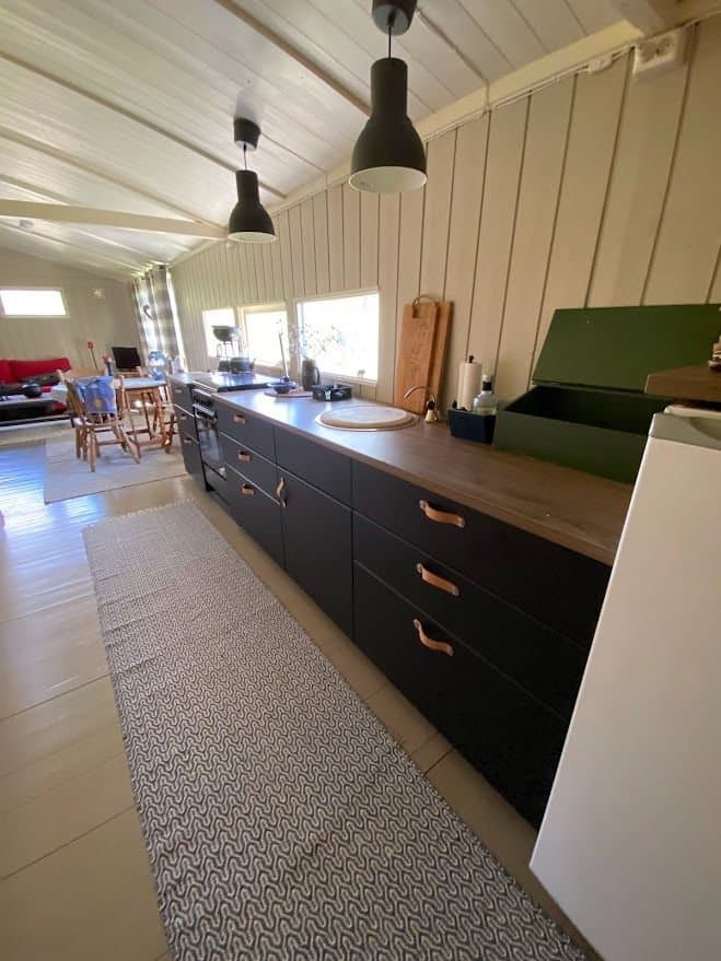 * Åpen stue- og kjøkkenløsning med spiseplass og vedovn * Tre soverom med totalt 6-7 sengeplasser * Toalettrom med Vera biodo ("luktfritt") og servant (ikke innlagt vann)