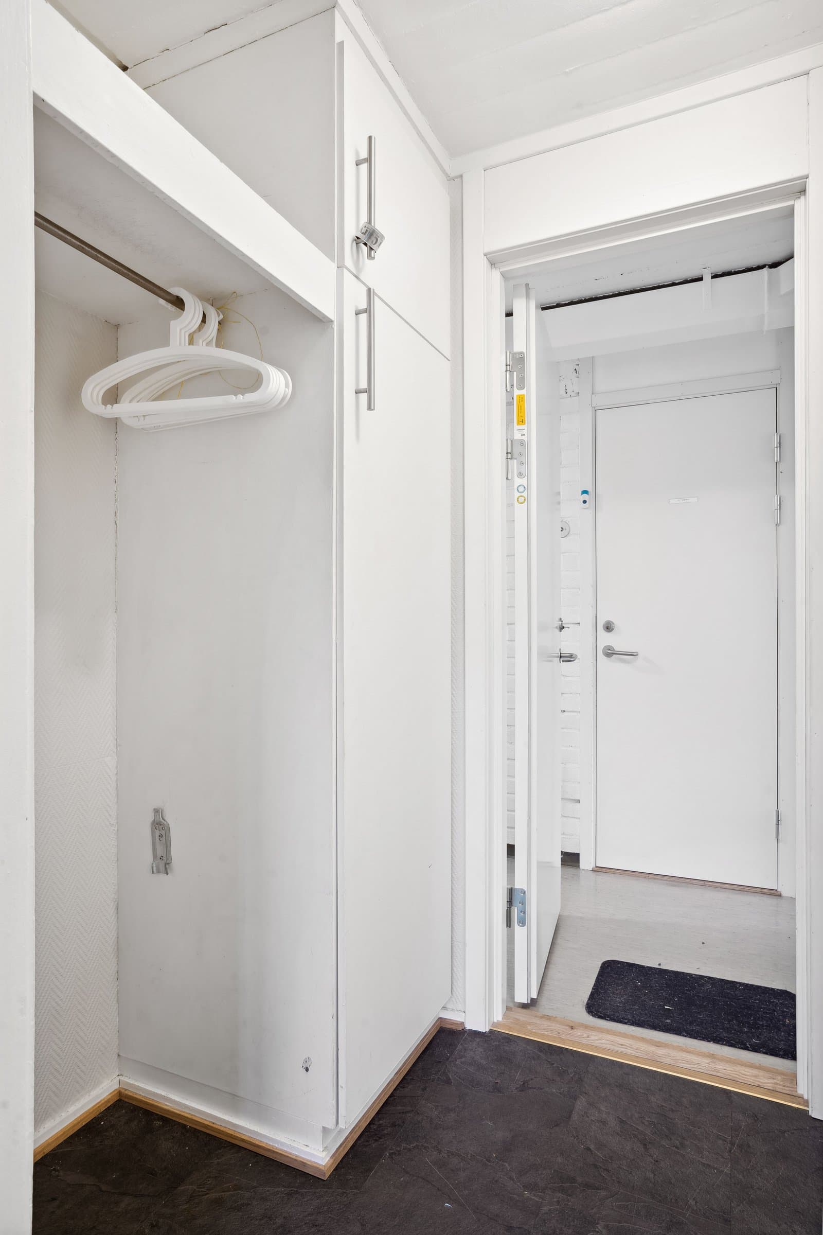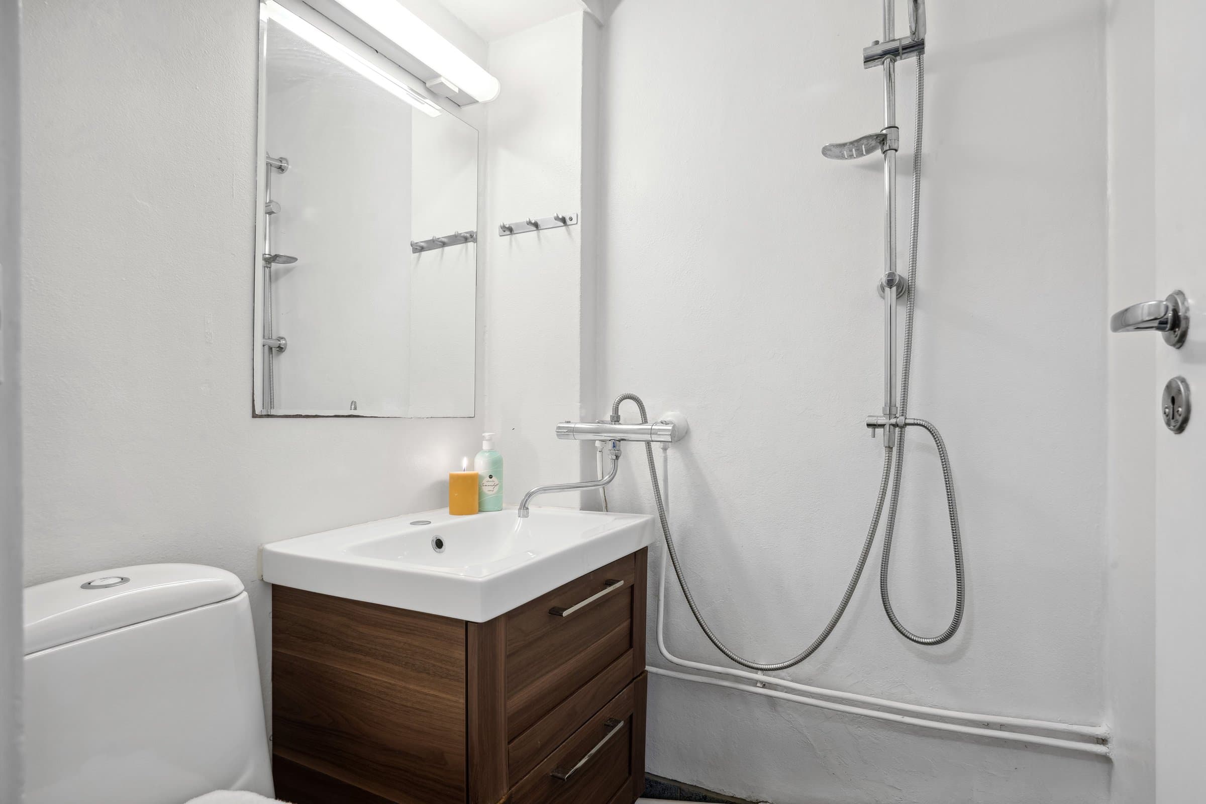 Entre: Laminat på gulv, malt strie på vegger og malt himling. Bad: Flis på gulv, malt strie, sokkelflis og malt himling. Enkel innredning. Åpen dusjløsning. Stue: Laminat på gulv, malt strie på vegger og malt himling. Hybelkjøkken: vaskekum med 1-greps blandebatteri, 2 kokeplater, integrert kjøleskap og plass til mikrobølgeovn. Mekanisk avtrekk over koketopp.