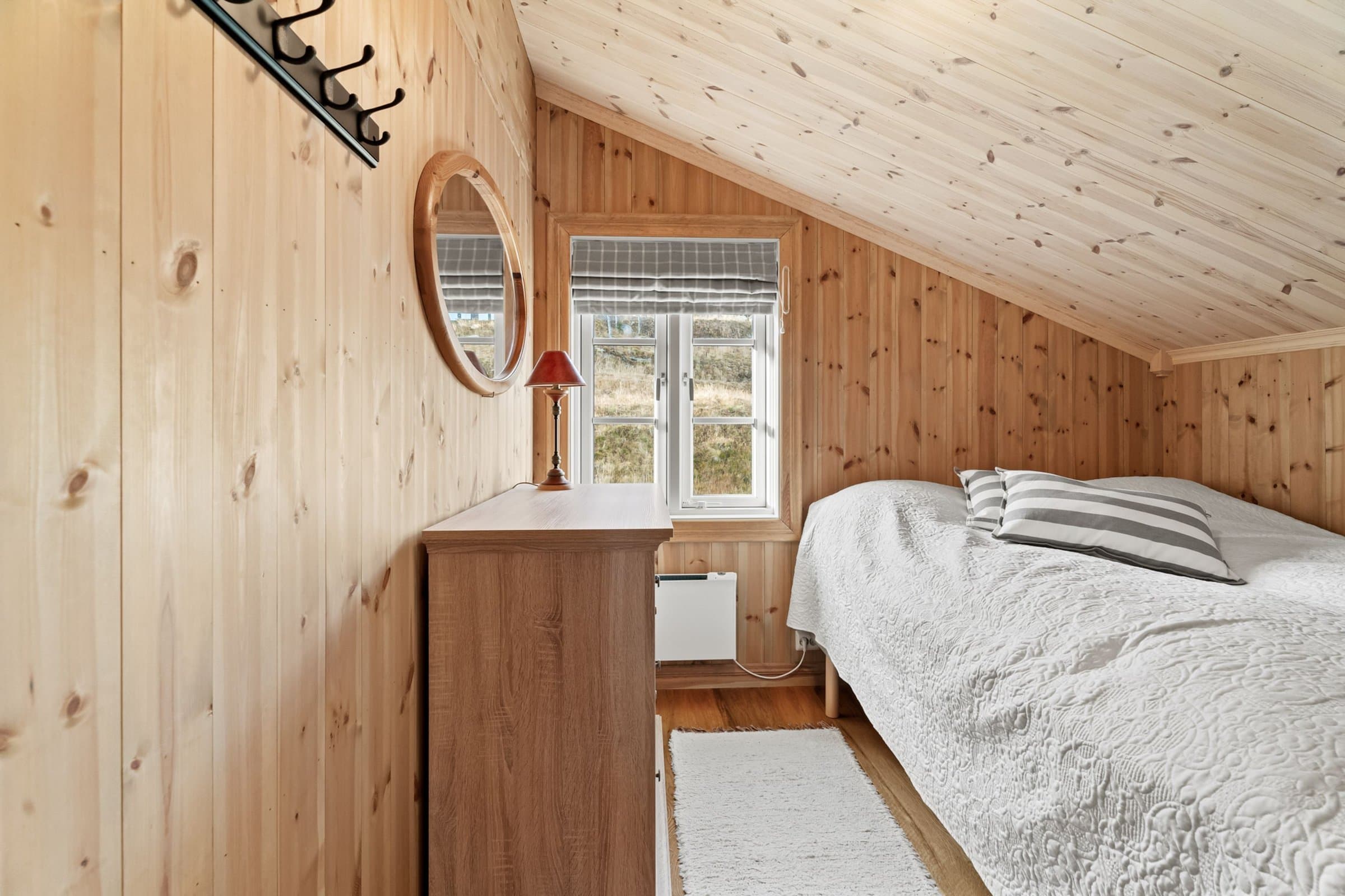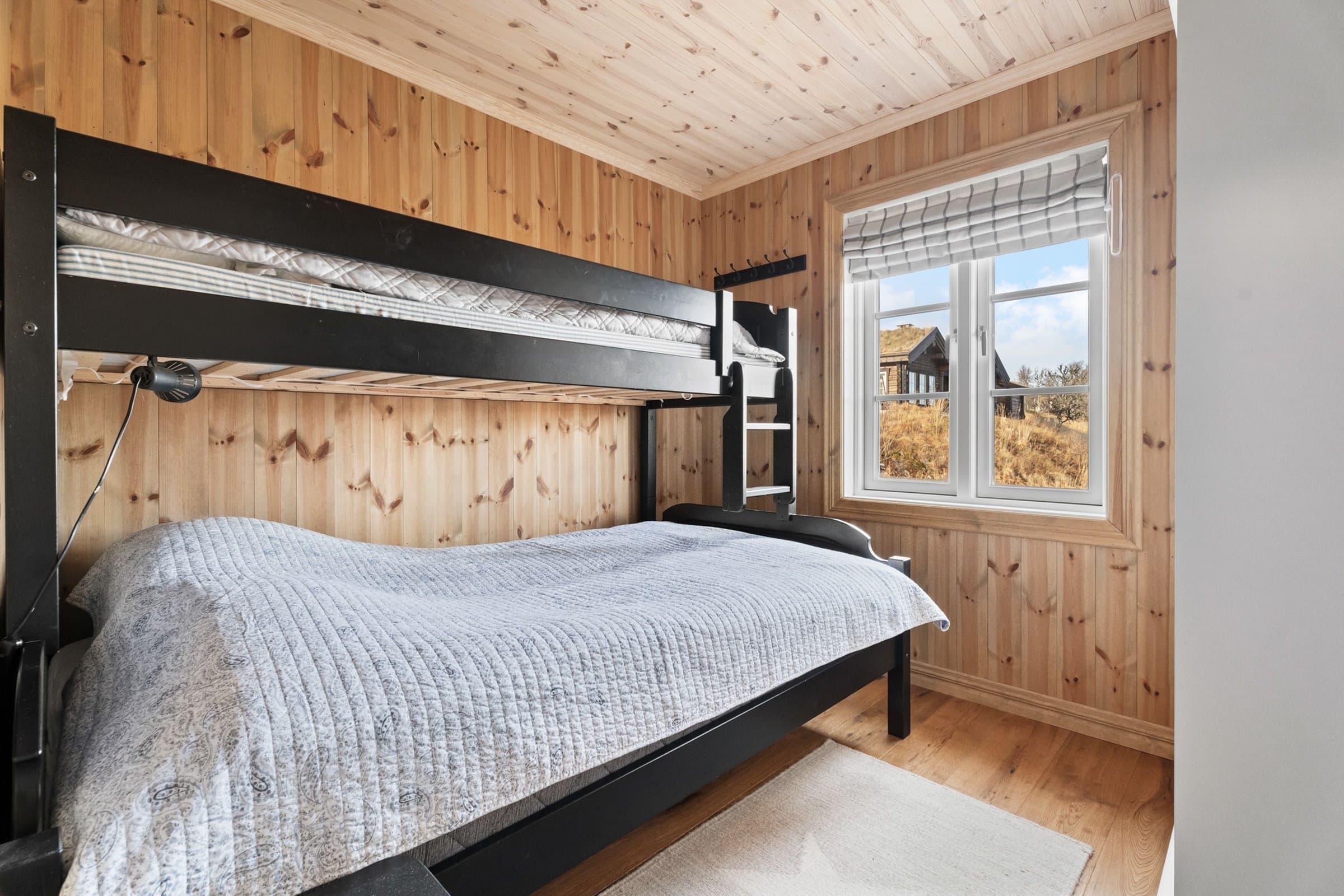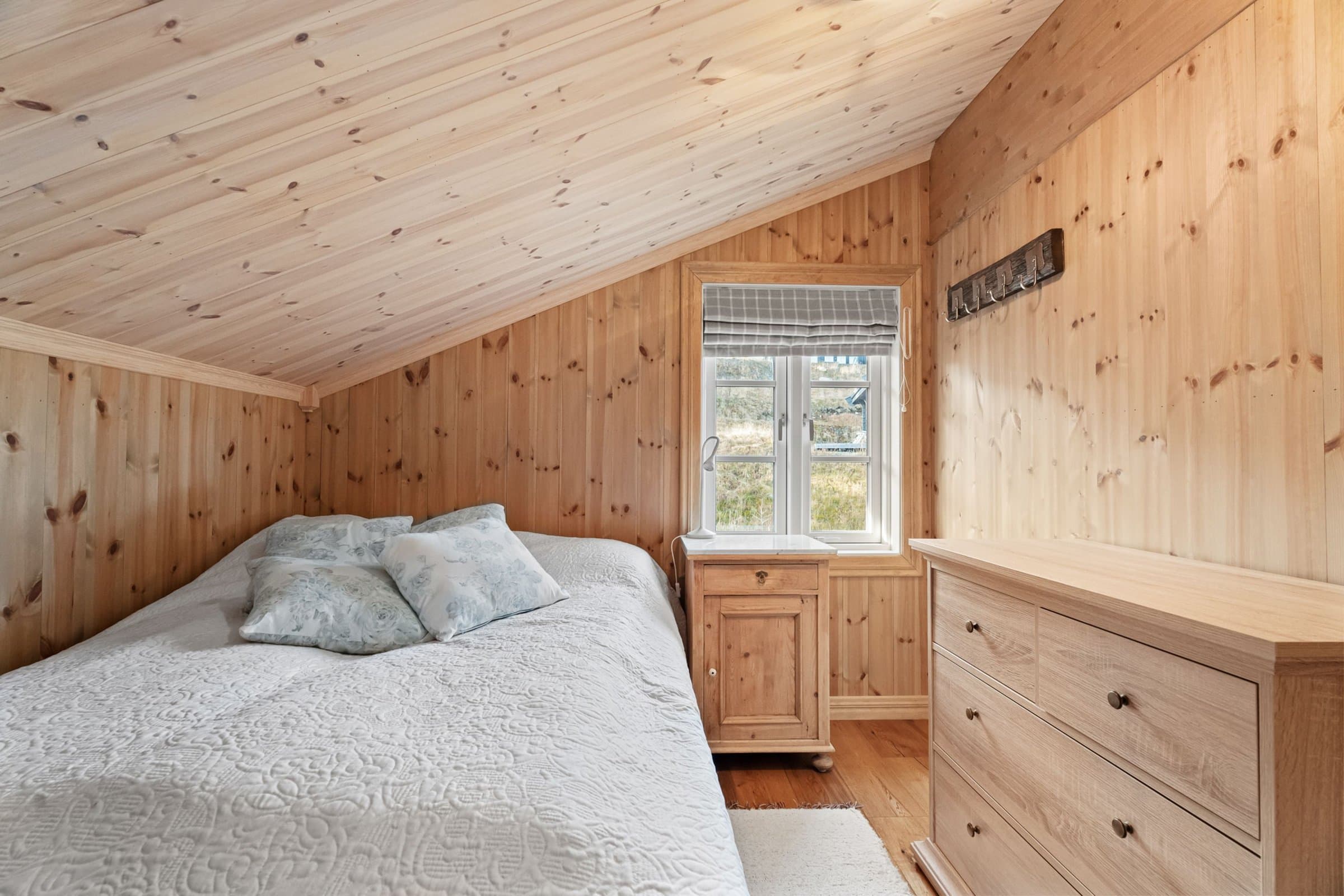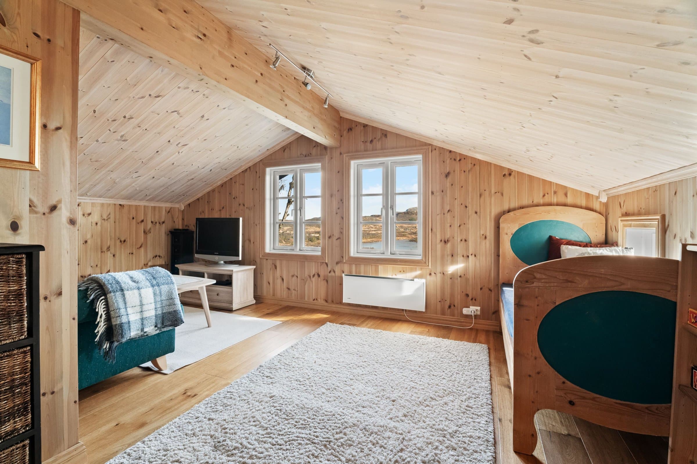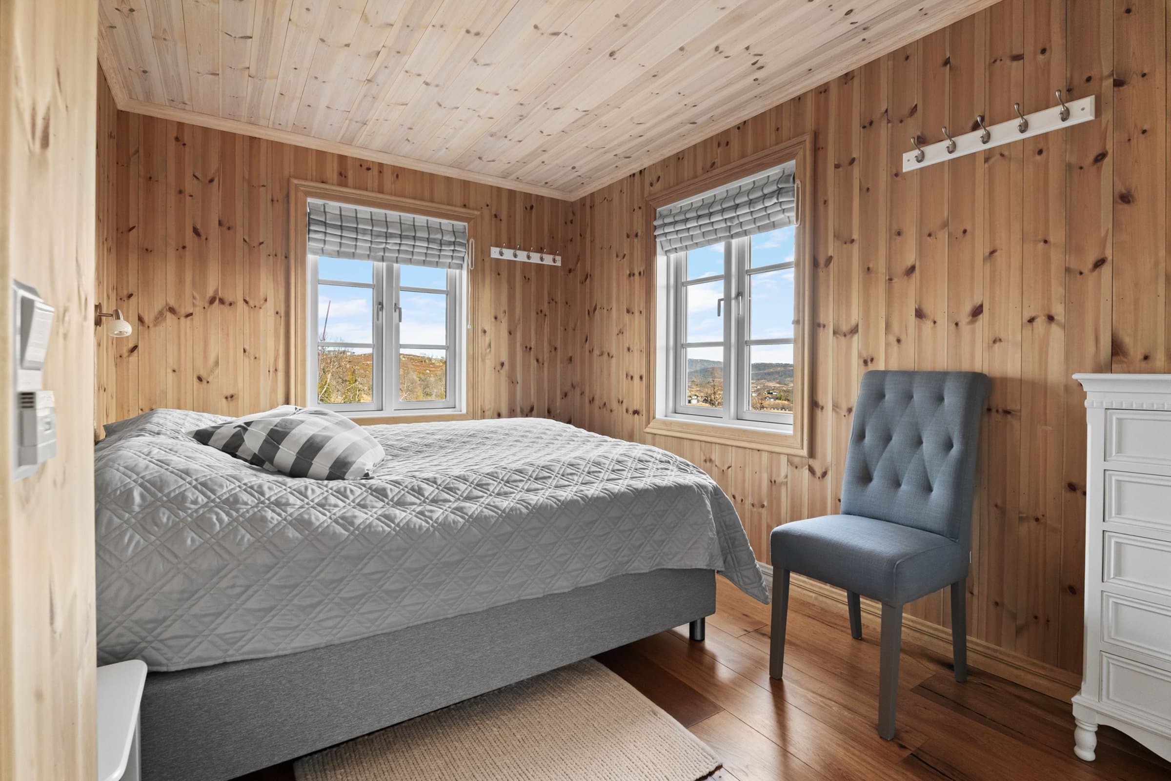 Hoved-soverom første etasje: Stort soverom med dobbeltseng og nattbord, garderobeskap over hele syd-veggen, to stoler til å legge tøy på eller som ekstrastoler til spisebord. Veggknagger til å henge tøy på. Liten kommode. Store vinduer mot øst og nord med liftgardiner. Eikeparkett på gulv med varmekabler. Loftluke med trappestige til oppbevaringsloft. Soverom 2 første etasje: Familiekøye med oppbevaringsskuff under, dobbelt garderobeskap, stort vindu med liftgardiner, veggknagger til å henge tøy på. Veggkart følger ikke med. Eikeparkett på gulv med varmekabler. Gang mellom soverom/bad og kjøkken: Oppbevaringskiste her følger ikke med, heller ikke veggkart. Eikeparkett på gulv med varmekabler og spotlight led-belysning i himling. Loftstue andre etasje: Stor loftstue med vinduer med fantastisk utsikt mot øst. Sofa med salongbord og TV-bord/skap, fiberlinje opplegg til TV/internett. Kommode og bokhylle. Vegghengt varmeovn med app fjernstyring. Eikeparkett og lysskinne i taket. Gammel («antikk») seng følger ikke med, men det er plass til overnattingsmulighet også her. Barnesikring på vinduer og på trapp ned til første etasje. Soverom 3 og 4 andre etasje: Hvert rom inneholder dobbeltseng og kommode samt veggknagger til å henge tøy på, på det ene også kontorarbeidsplass. Eikeparkett og vindu med liftgardin i hvert soverom. Barnesikring vinduer. Bad andre etasje: Flislagt bad med baderomsinnredning, toalett og flislagt dusjnisje med waterfall dusj. Varmekabler i gulv. Ventilasjon i tak.