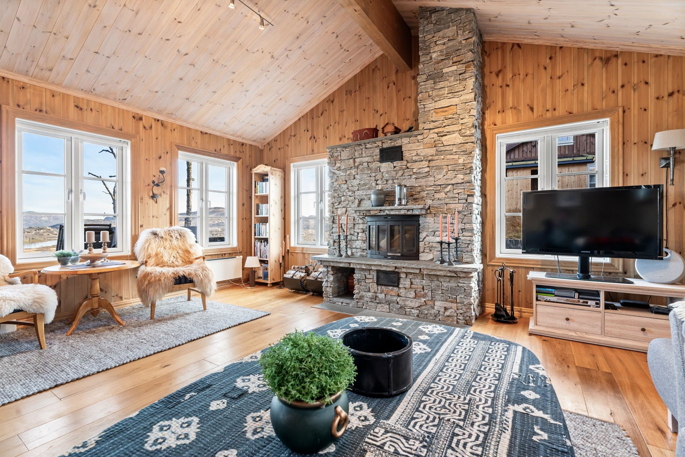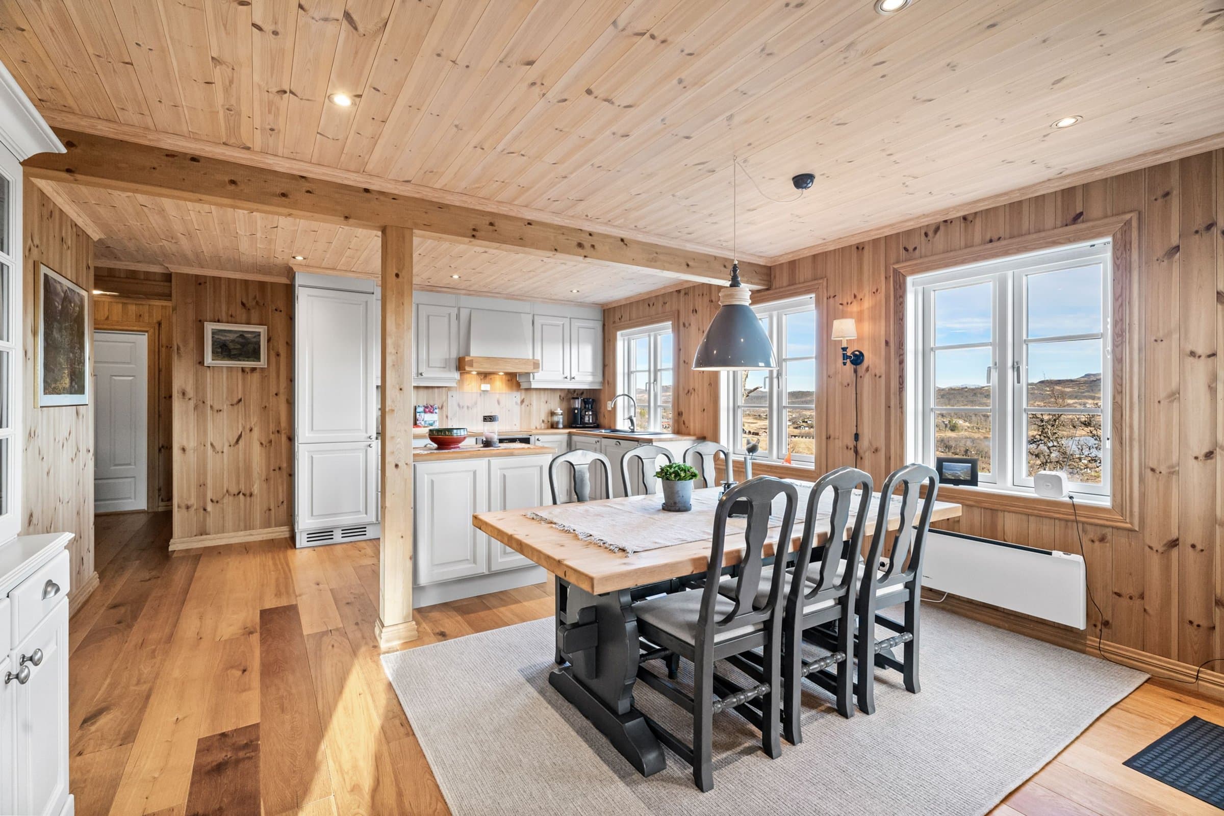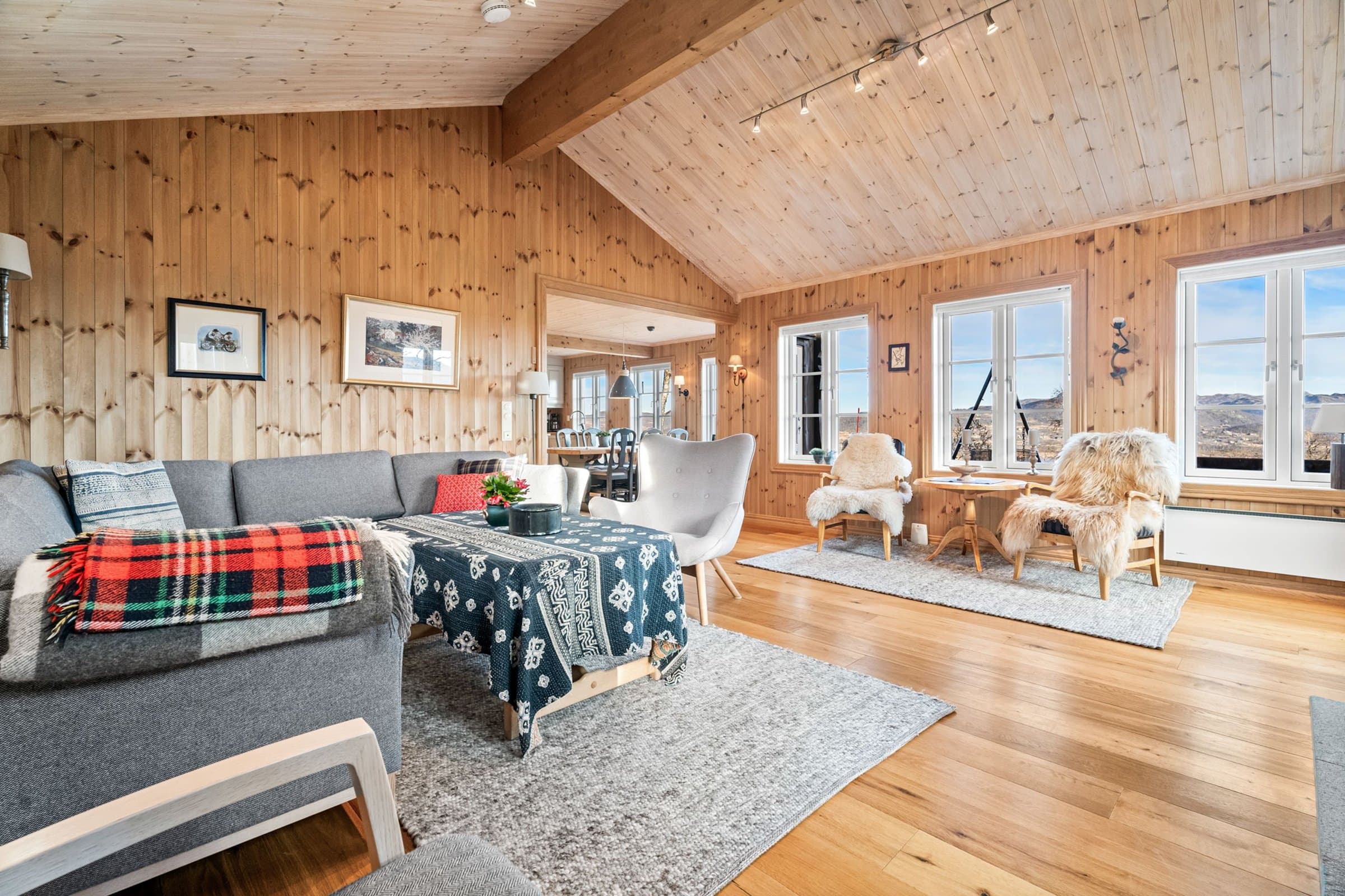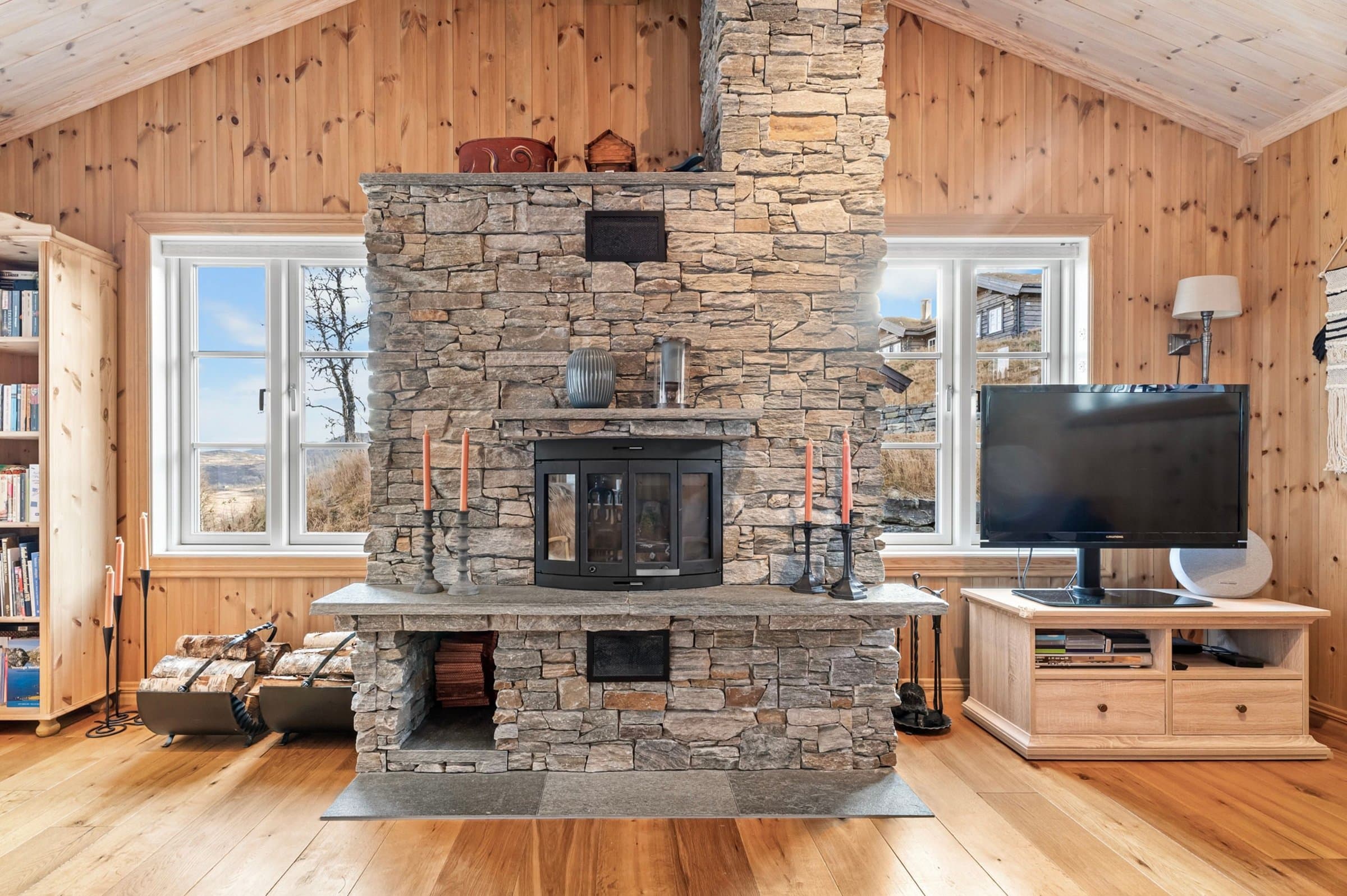 Flott tiltalende, møblert, velholdt oppstugi hytte i 2 etasjer overtatt ny i 2016 - kvalitetshytte oppført i stavlaft med solid håndverk av Flatdal Handlaft AS fra Seljord: To hovedskip på hver side av oppstugen som har to etasjer. Inneholder entré/garderobe, vaskerom/teknisk rom, åpen løsning mellom kjøkken, spisestue og stue med stor peis, 2 bad med flislagte dusjnisjer og waterfall dusjer og toalett, hoved badet også med vegghengt toalett og stor badstue, stor loftstue, 4 soverom og stor utvendig bod. Utstyr: Begge bad er flis-lagte og hytta har varmekabler i gulv på begge disse samt alle rom i første etasje. Varmekablene i entre/gang, stue, spisestue/kjøkken og begge badene fjernstyres med Sikom app varmestyring og to panelovner i stue og loftstue styres også med app. Det samme gjør utvendig lader for el-bil og to webkameraer utendørs ved inngangspartier. Varmekabler i vaskerom og soverom første etasje styres fra hytta. Hytta har også installert wifi maske-nettverk slik at wifi er tilgjengelig i alle rom tross hyttas størrelse. Det er innlagt bredbånd fiberkabler og det abonneres på Altibox (Telefiber) lineær-tv hytte-kanalpakke med dekoder både i stue og loftstue. Rør-i-rør, komfyrvakt og fastmonterte røyk-varslere. På vaskerom er montert hovedstoppekran og NRL Smartstopp system for detektering av vannlekkasjer med automatisk avstengning av vanntilførsel.