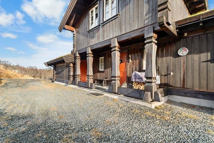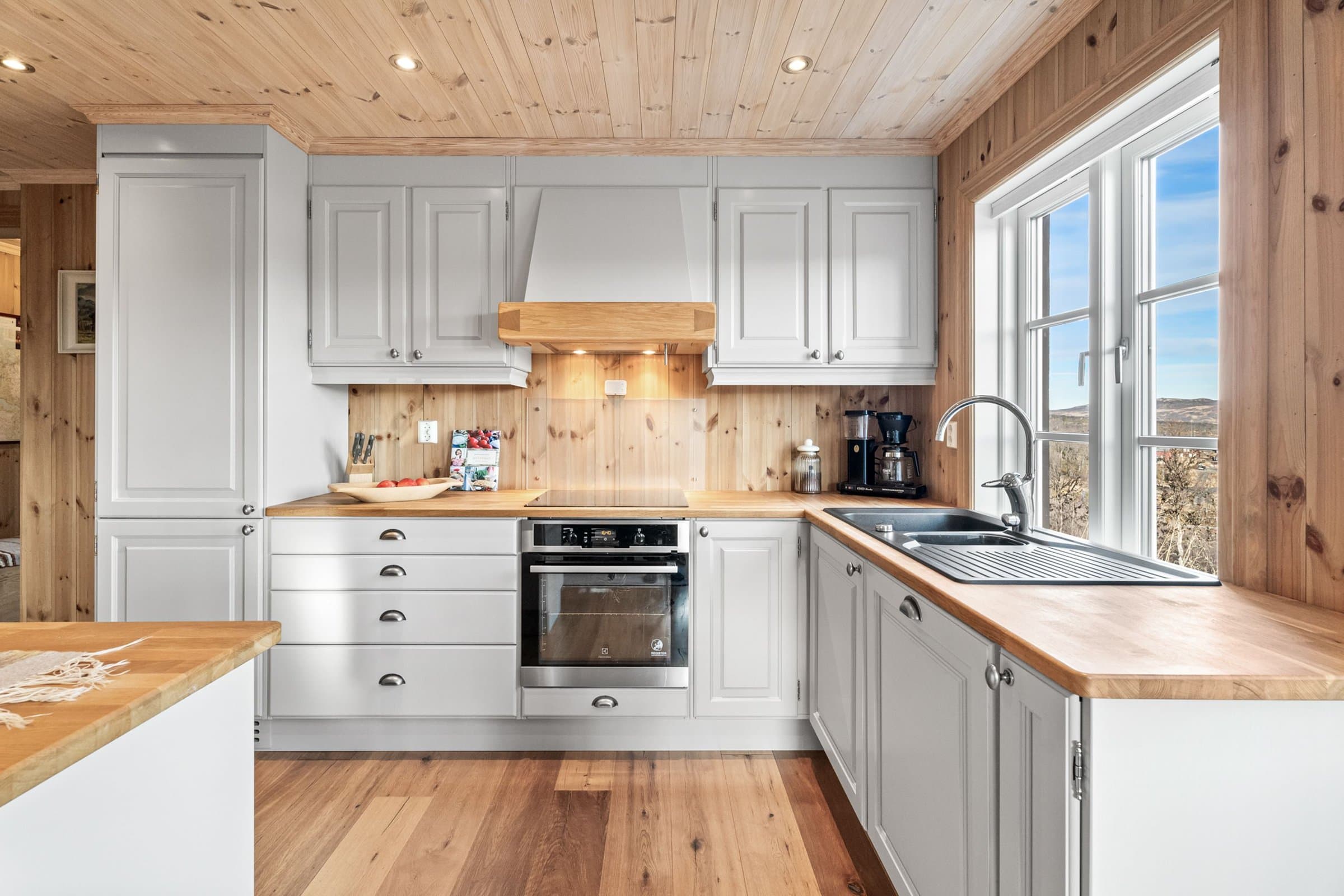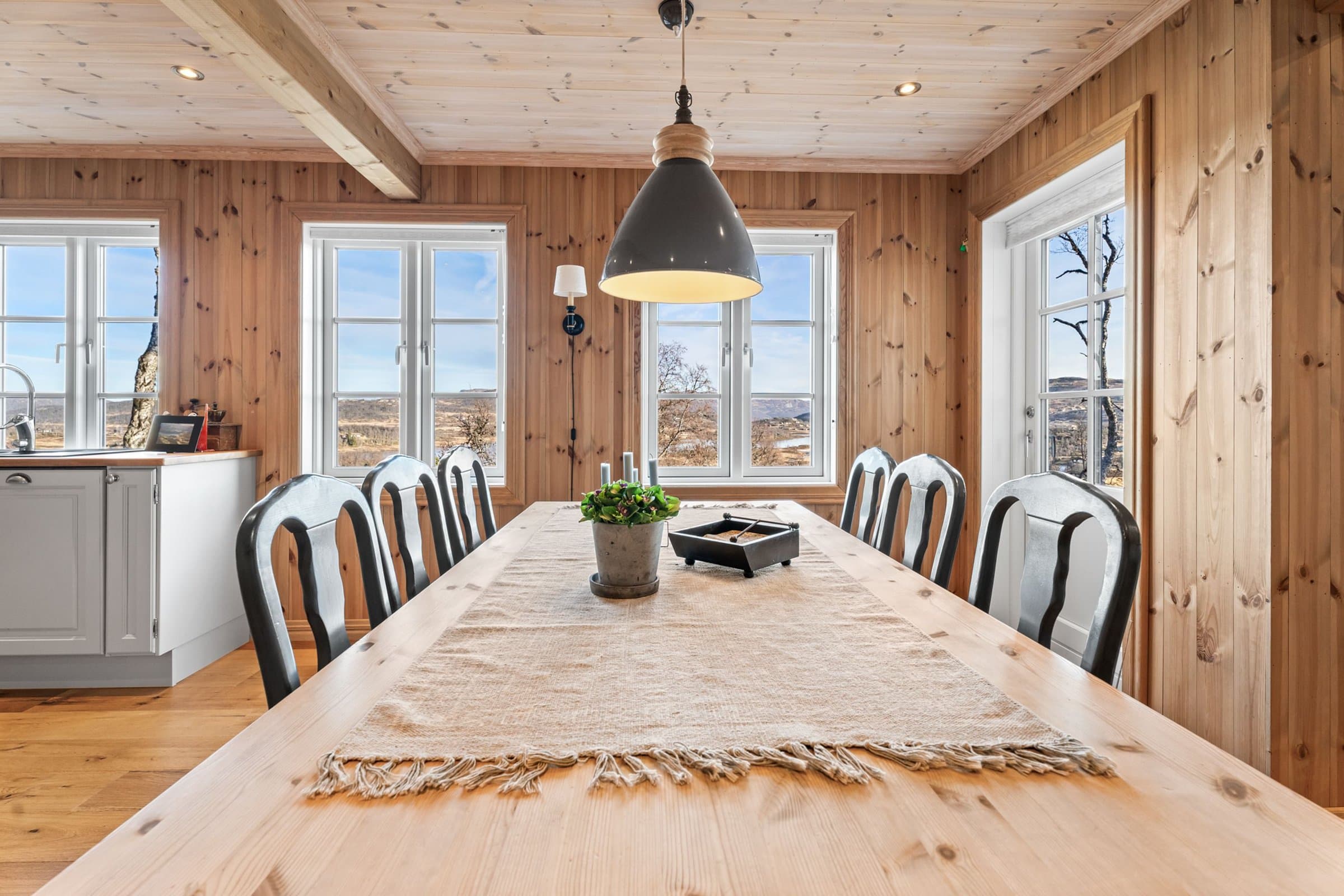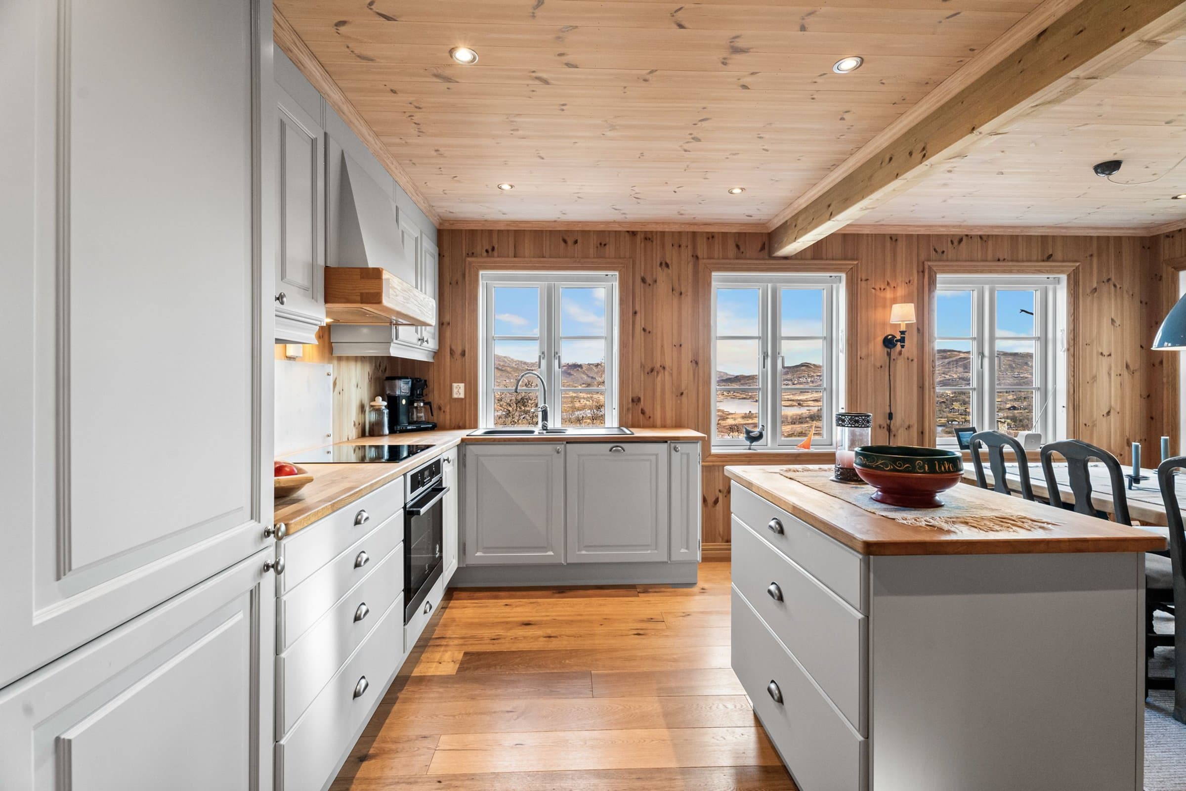 Flott tiltalende, møblert, velholdt oppstugi hytte i 2 etasjer overtatt ny i 2016 - kvalitetshytte oppført i stavlaft med solid håndverk av Flatdal Handlaft AS fra Seljord: To hovedskip på hver side av oppstugen som har to etasjer. Inneholder entré/garderobe, vaskerom/teknisk rom, åpen løsning mellom kjøkken, spisestue og stue med stor peis, 2 bad med flislagte dusjnisjer og waterfall dusjer og toalett, hoved badet også med vegghengt toalett og stor badstue, stor loftstue, 4 soverom og stor utvendig bod. Utstyr: Begge bad er flis-lagte og hytta har varmekabler i gulv på begge disse samt alle rom i første etasje. Varmekablene i entre/gang, stue, spisestue/kjøkken og begge badene fjernstyres med Sikom app varmestyring og to panelovner i stue og loftstue styres også med app. Det samme gjør utvendig lader for el-bil og to webkameraer utendørs ved inngangspartier. Varmekabler i vaskerom og soverom første etasje styres fra hytta. Hytta har også installert wifi maske-nettverk slik at wifi er tilgjengelig i alle rom tross hyttas størrelse. Det er innlagt bredbånd fiberkabler og det abonneres på Altibox (Telefiber) lineær-tv hytte-kanalpakke med dekoder både i stue og loftstue. Rør-i-rør, komfyrvakt og fastmonterte røyk-varslere. På vaskerom er montert hovedstoppekran og NRL Smartstopp system for detektering av vannlekkasjer med automatisk avstengning av vanntilførsel.