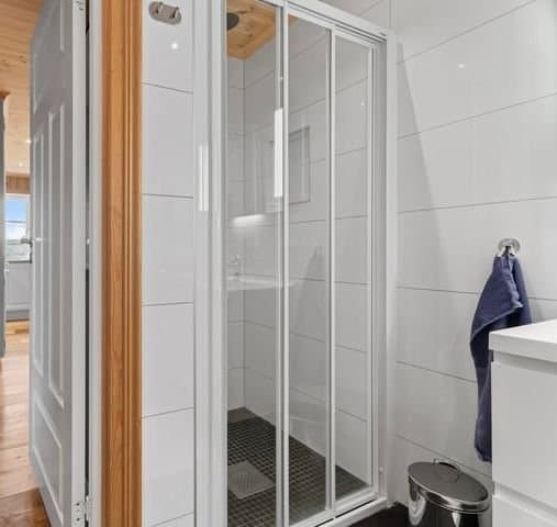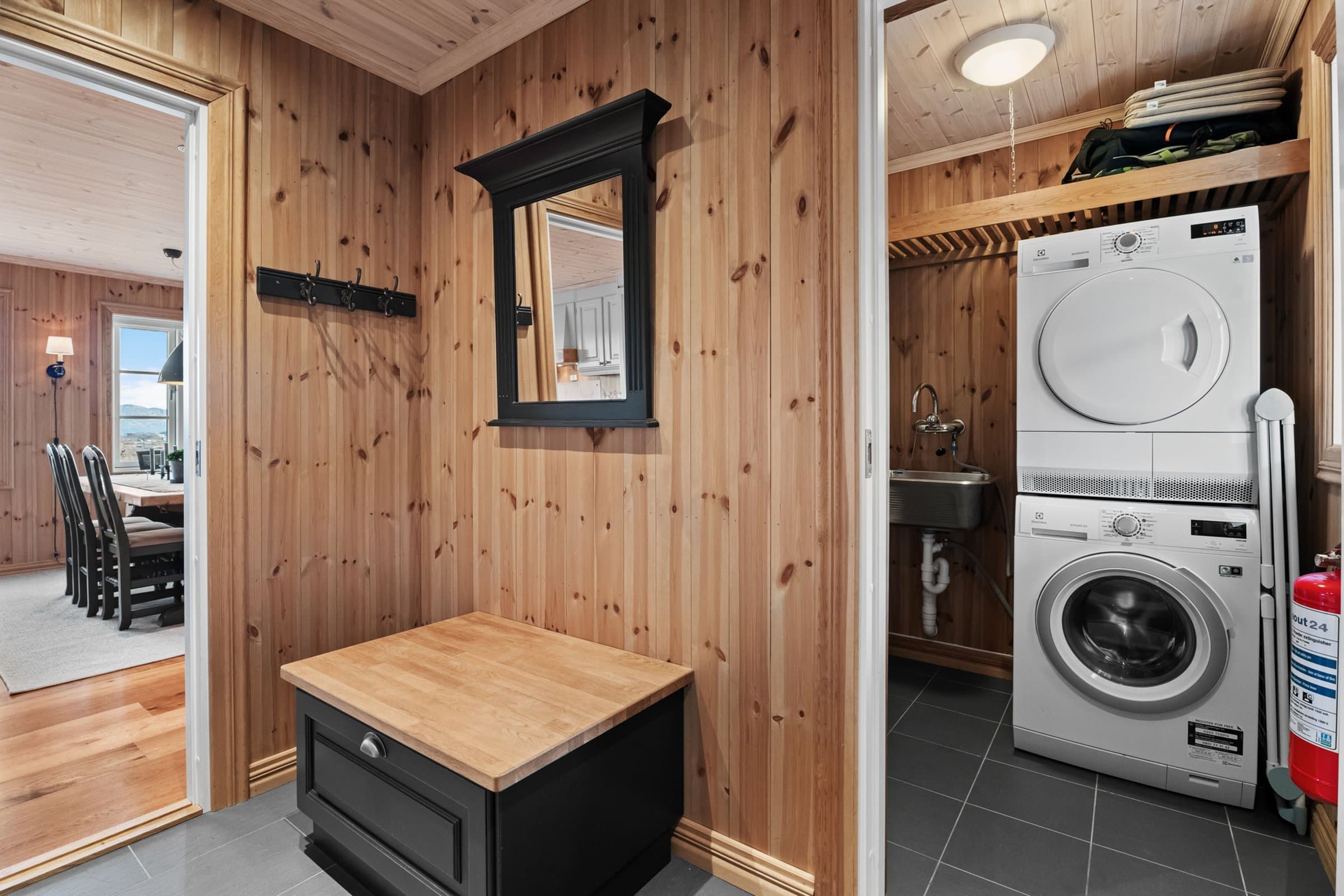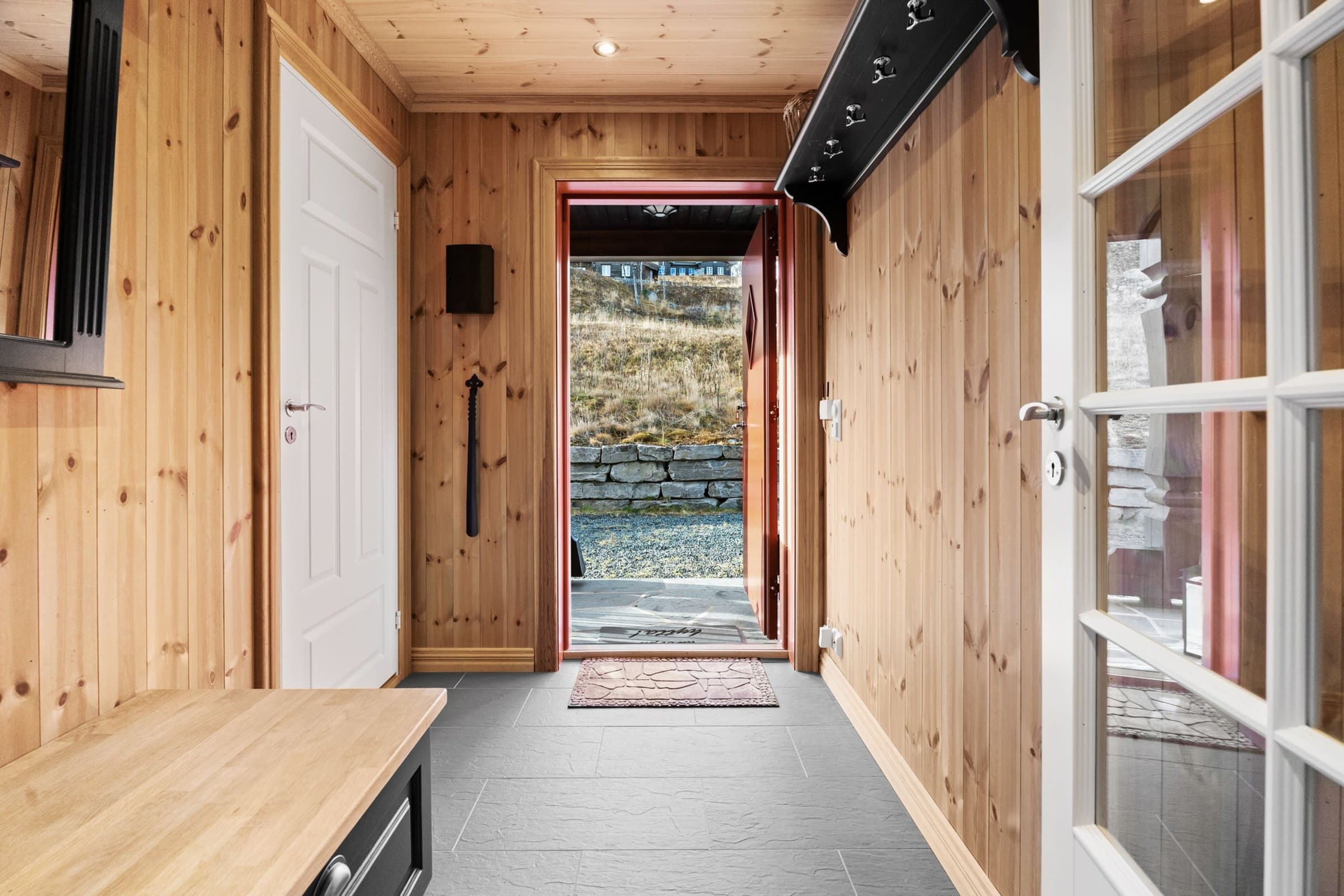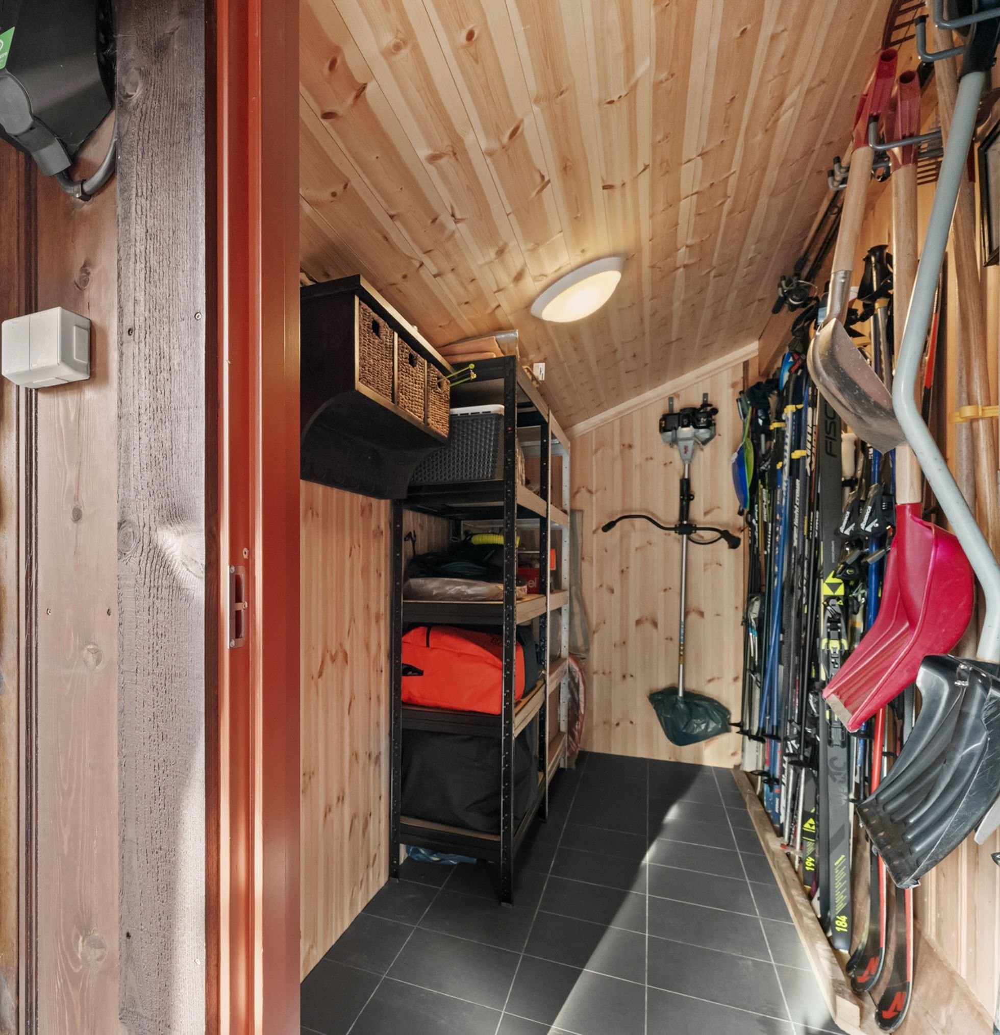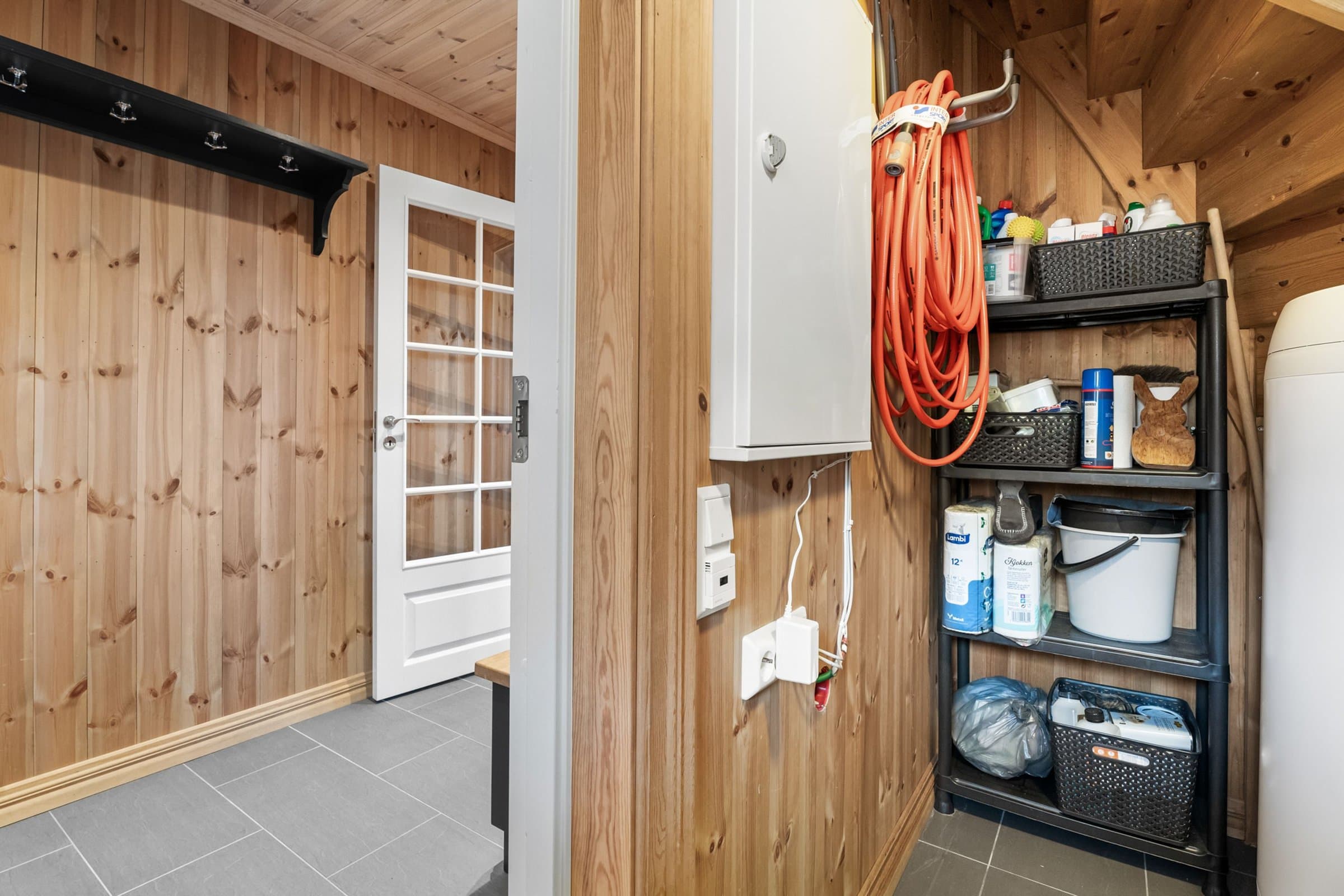 Entre/gang: Lys og romslig entre med Kistefos benk/kommode med speil og vegghylle/kroker. Flislagt gulv med varmekabler og spotlight led-belysning i himling. Sentral for fjernvarmestyring med app. Vaskerom/teknisk rom: Flislagt gulv med varmekabler. Varmtvannsbereder, sikringsskap EL, rør-i-rør skap, brann-/hageslange, hovedstoppekran og NRL Smartstopp system for detektering av vannlekkasjer med automatisk avstengning av vanntilførsel, utslagsvask og tørkehylle. Vindu (lysinnslipp og utlufting). Internett sentral og modem. Utvendig bod: Ved-stativ ved inngangsdør og El-bil lader utenfor boden (styres med app). Stor bod til oppbevaring av ski i ski-holdere og redskaper og snøskuffer på vestvegg samt hyller langs hele vestveggen til annet utstyr, skistøvler, beis, verktøy mm. I Tillegg er det stor oppbevaringskasse (ved, akebrett, bålpanneutstyr) og stige utvendig på baksiden inntil hyttens østvegg.