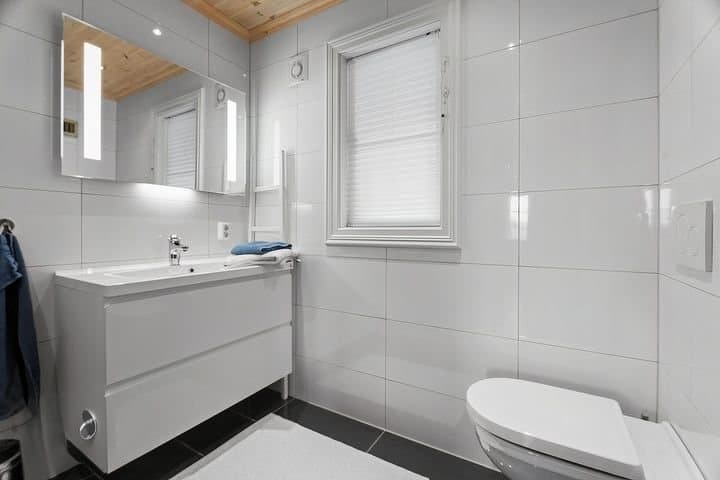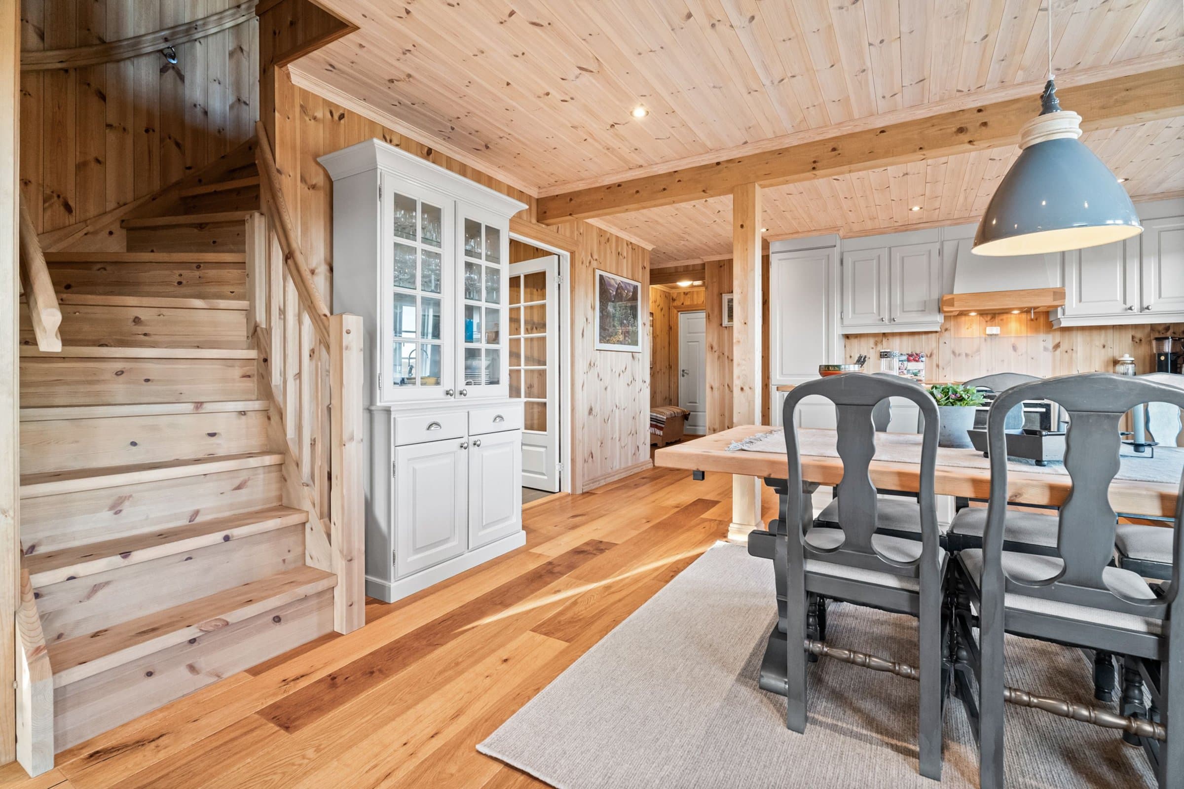 Stue: Trivelig stue med mange vinduer og mye lysinnslipp og flott utsikt, særlig mot øst, samt storslått skiferbelagt peis og høyt under taket. Alle store vinder har montert plisse-gardiner. Salong med hjørnesofa, salongbord og to ekstra lett flyttbare stoler. Bokhylle og TV-bord/skap, fiberlinje opplegg til TV/internett. Dessuten på østvegg to stoler og lite bord som ikke følger med. Lun en stavs eikeparkett med varmekabler og lysskinner i taket. Termostat panelovn på vegg (app styrt). Spisestue: Spisestua er plassert i åpen løsning mellom stue og kjøkken samt med trapp opp til andre etasje. Utgang veranda mot øst. Alle store vinder har montert plisse-gardiner. Stort Krognæs spisebord og 6 stoler i tradisjonell stil, 3 stoler på hver langside. I tillegg plass til to stoler på hver av kortsidene (f.eks. «låne» fra hoved-soverom). Forlengelses-plate til bordet. Stort vitrineskap Kistefos i samme stil som kjøkkeninnredning. Eikeparkett med varmekabler og spotlight led-belysning i himling. Termostat panelovn på vegg (ikke app styrt). Kjøkken: Kjøkkenet er utstyrt Kistefos kjøkkeninnredning med høyskap for matvarer, benkeplater i heltre eik, oppvaskkum, skuffer og skap, avtrekksvifte ut samt integrerte hvitevarer (kjøle- og fryseskap, oppvaskmaskin) og brunevarer (induksjons-platetopp/komfyr, stekeovn med komfyrvakt). Kjøkkenet har videre stor kjøkkenøy (Kistefos) som kompletterer kjøkkenets lagringsplass for servicer, redskaper osv. Store vinduer mot øst, alle har montert plisse-gardiner. Eikeparkett med varmekabler og spotlight led-belysning i himling. Hoved-bad første etasje: Flislagt bad med baderomsinnredning, vegghengt toalett, ventilasjonsvifte og flislagt dusjnisje med waterfall dusj. Plissegardin på vindu. Spotlight led-belysning i himling. Badstue: Stor badstue med badstuovn og inngang fra hoved-bad.