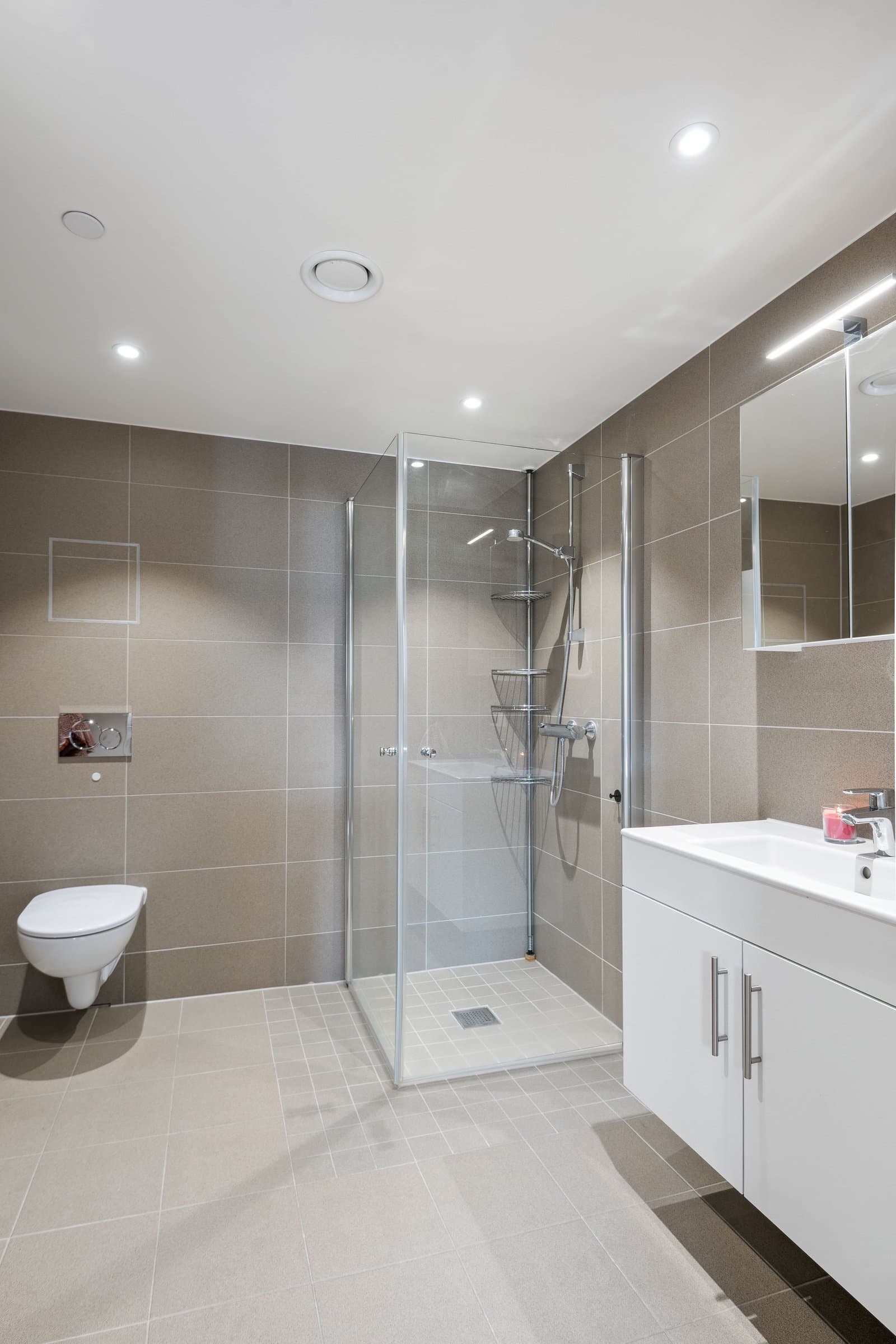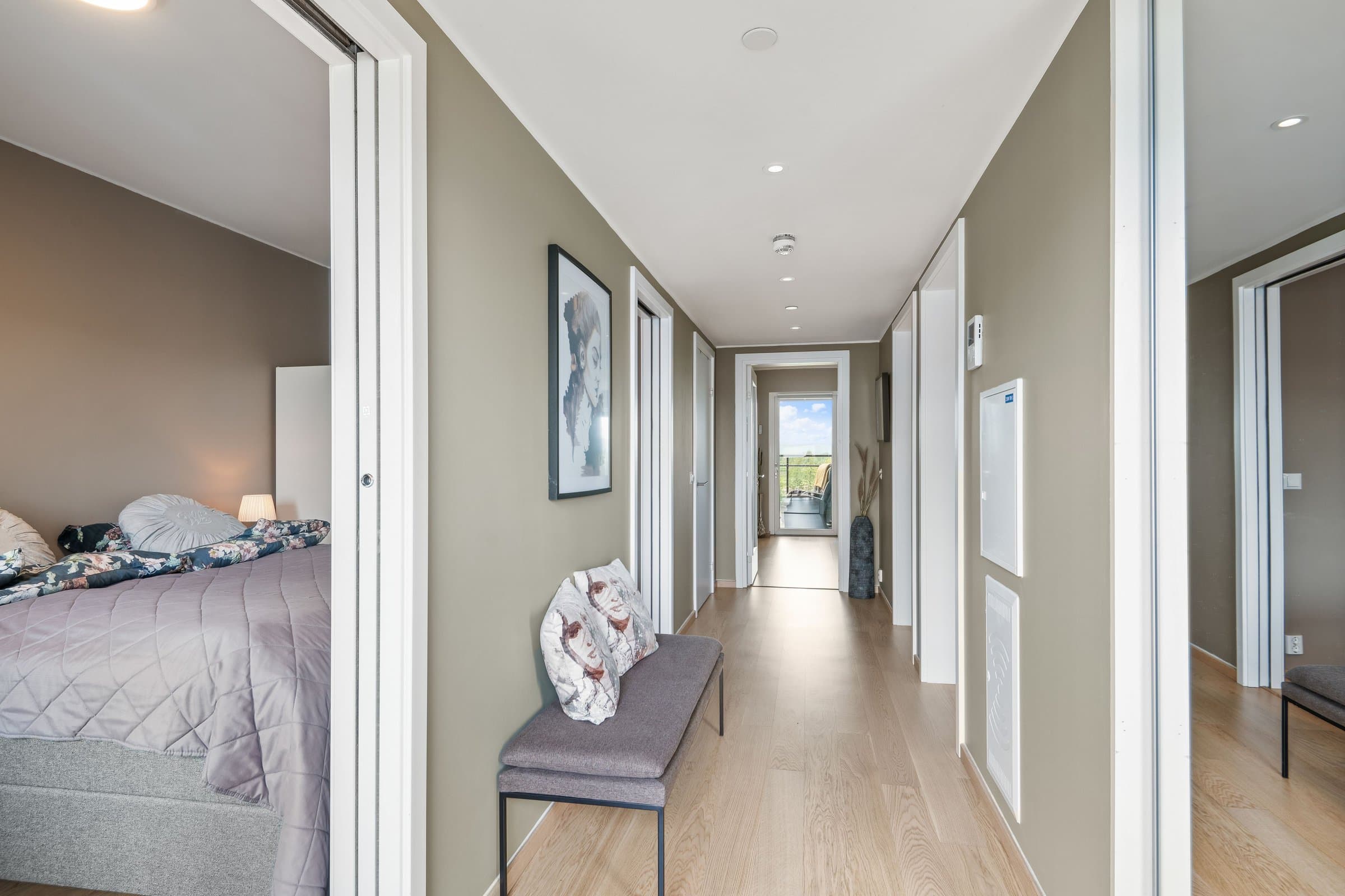 Første del av entreen` har flislagt gulv inkl. termostatstyrte varmekabler, (Rett innenfor Ytterdøra) resten med eik-parkett og dimbar dovn-light + speil skyvedørs garderobe m/innredning - alle oppholdsrom ellers har også parkett - hovedsoverom har 2 skyvegarderobeskap m/innredning/speil og direkte tilgang til et romslig og delikat flislagt bad m/2 høy skap + 1 speilskap med led-lys - dimbar down-light og termostatstyrte varmekabler i gulv - soverom 2 har 2 garderobeskap m/skuffer/hyller - fra entreen` et flislagt romslig bad nr. 2 m/termostatstyrte varmekabler og dimbar down-light og sminkespeil m/lys - skap over/rundt vaskemaskinen - soverom 3 har 1 høyere skap med hyller/skuffer - det er skyvedører inn til 2 av soverommene som ikke tar veggplass - det medfølger plisse` gardiner på alle soveromsvinduer - kjøkkenet har integrerte hvitevarer inkl. led-lys under overskap - sorte glassplater bak oppvaskkum og platetopp for lettere renhold - stuen har godt med naturlig lys og er perfekt for både hverdagsliv og sosialt samvær - fjernstyrt screen` på stuevindu og lamellgardiner - fjernstyrt screen` finnes også ute på terrassen - led-taklamper på alle soverom/kjøkken og bod - balansert ventilasjon/varmegjenvinning - proffe justerbare hyller i innvendig bod er montert for ryddighet og best mulig oversikt - boden tilknyttet garasjeanlegget har en god størrelse på 5 kvm - varmt/kaldtvann + oppvarming blir avlest via egne målere (Plassert i innvendig bod) som vil bli fakturert etter eget forbruk - 2 garasjeplasser medfølger salget - kostnadene for bod i garasje og garasjeplass inngår i felleskostnadene - forbruk av eget strømforbruk per nå ligger i snitt på ca. kr. 800 per mnd - det er vaktmestertjenester i sameiet.