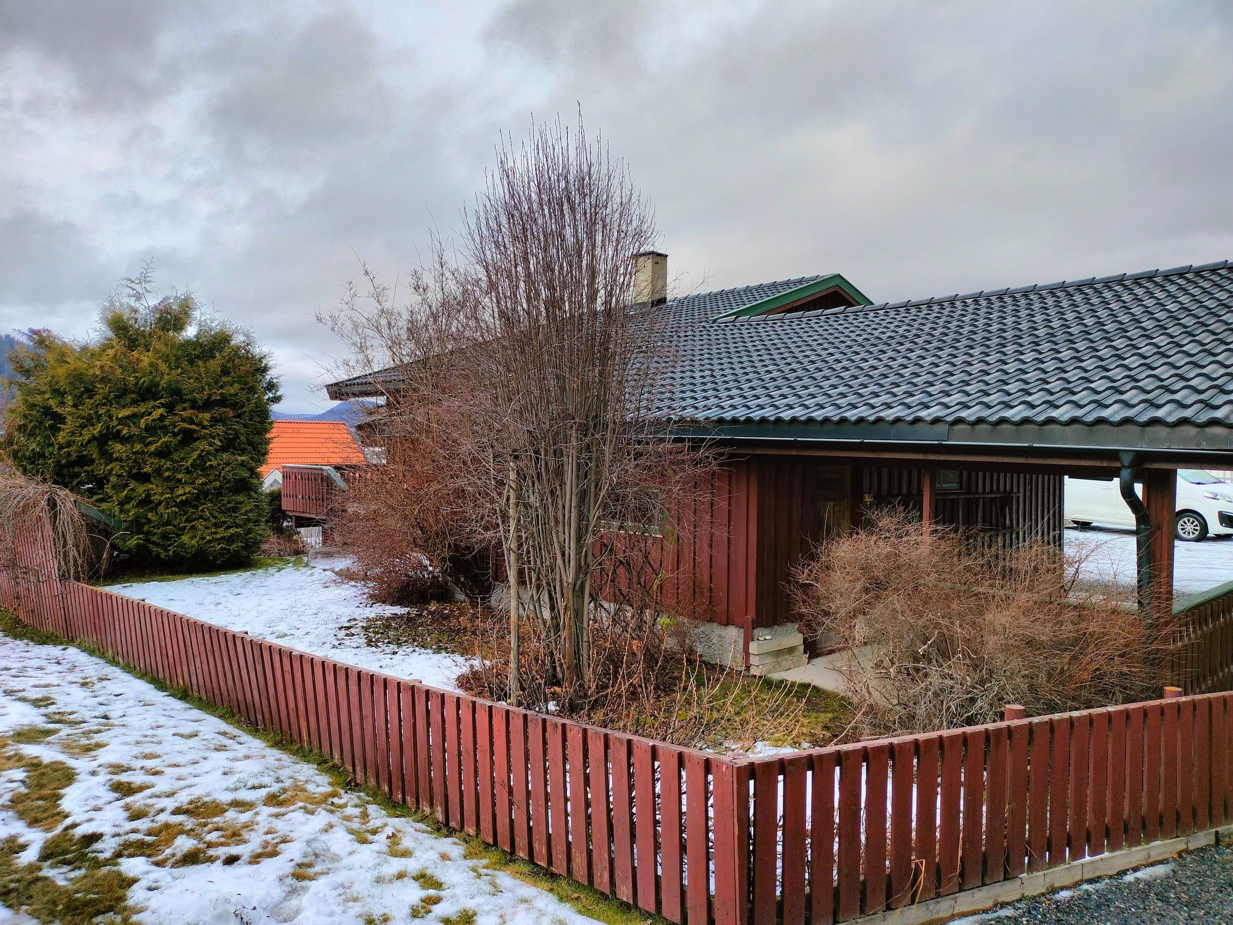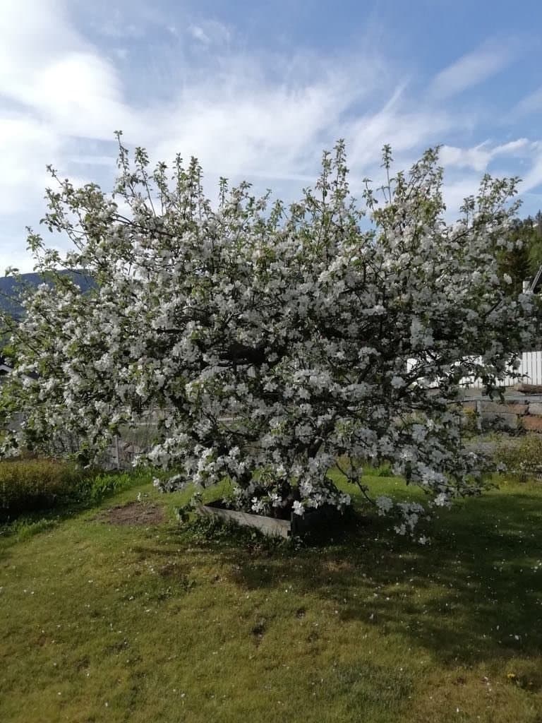 Stor opparbeidet hage rundt huset på tre kanter, på tre flate plan. Epletre med tre ulike eplesorter. Parkeringsmuligheter for minst 4 (6) biler på tomten. Både garasje og carport. Svært lett å bli kvitt snø om vinteren. Gode solforhold hele dagen og kveldssol til kl. 21.35 på sommeren. Skjermet platting og terrasse sørger for at man kan nyte solen uforstyrret hele dagen og kvelden.