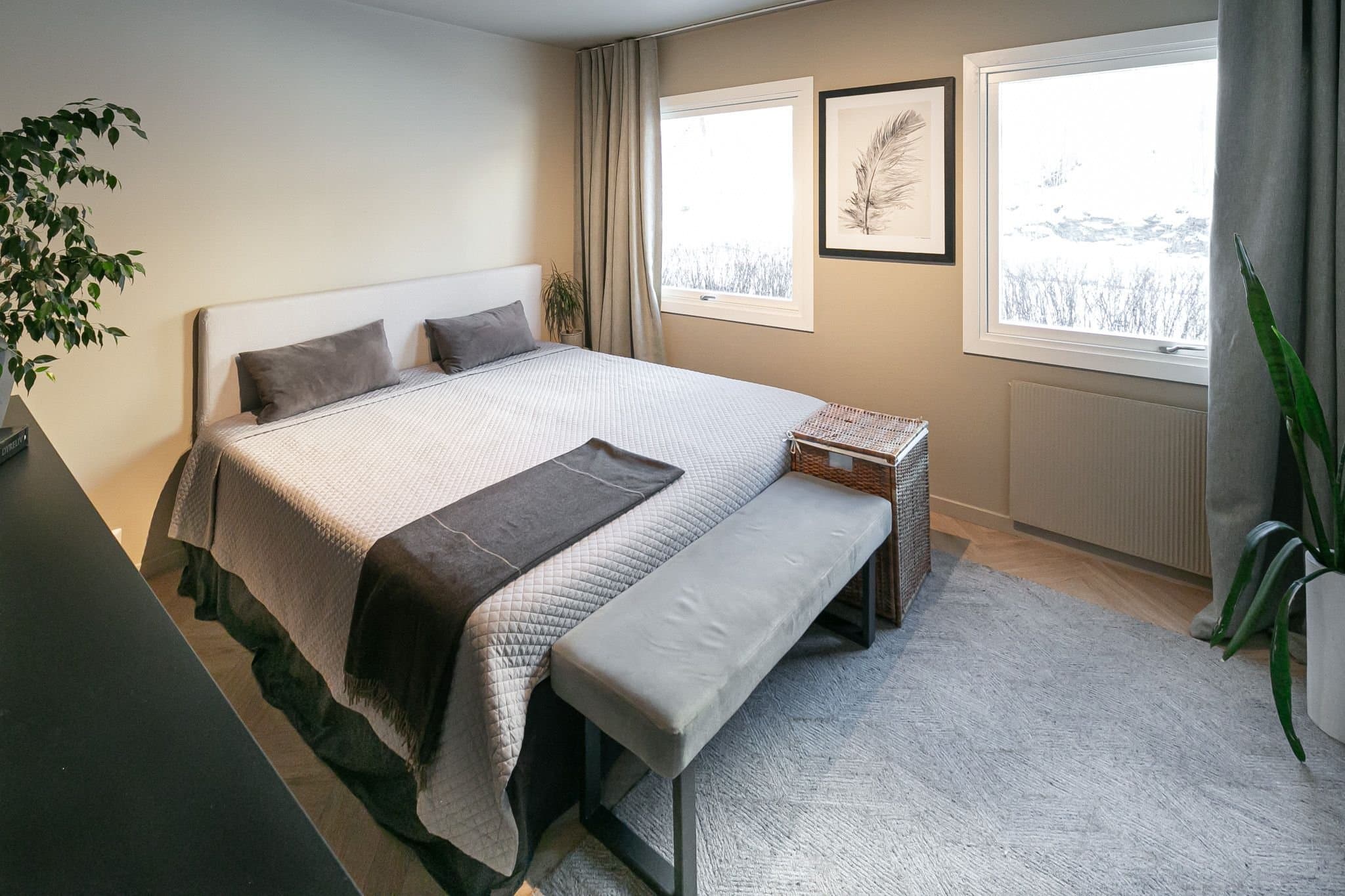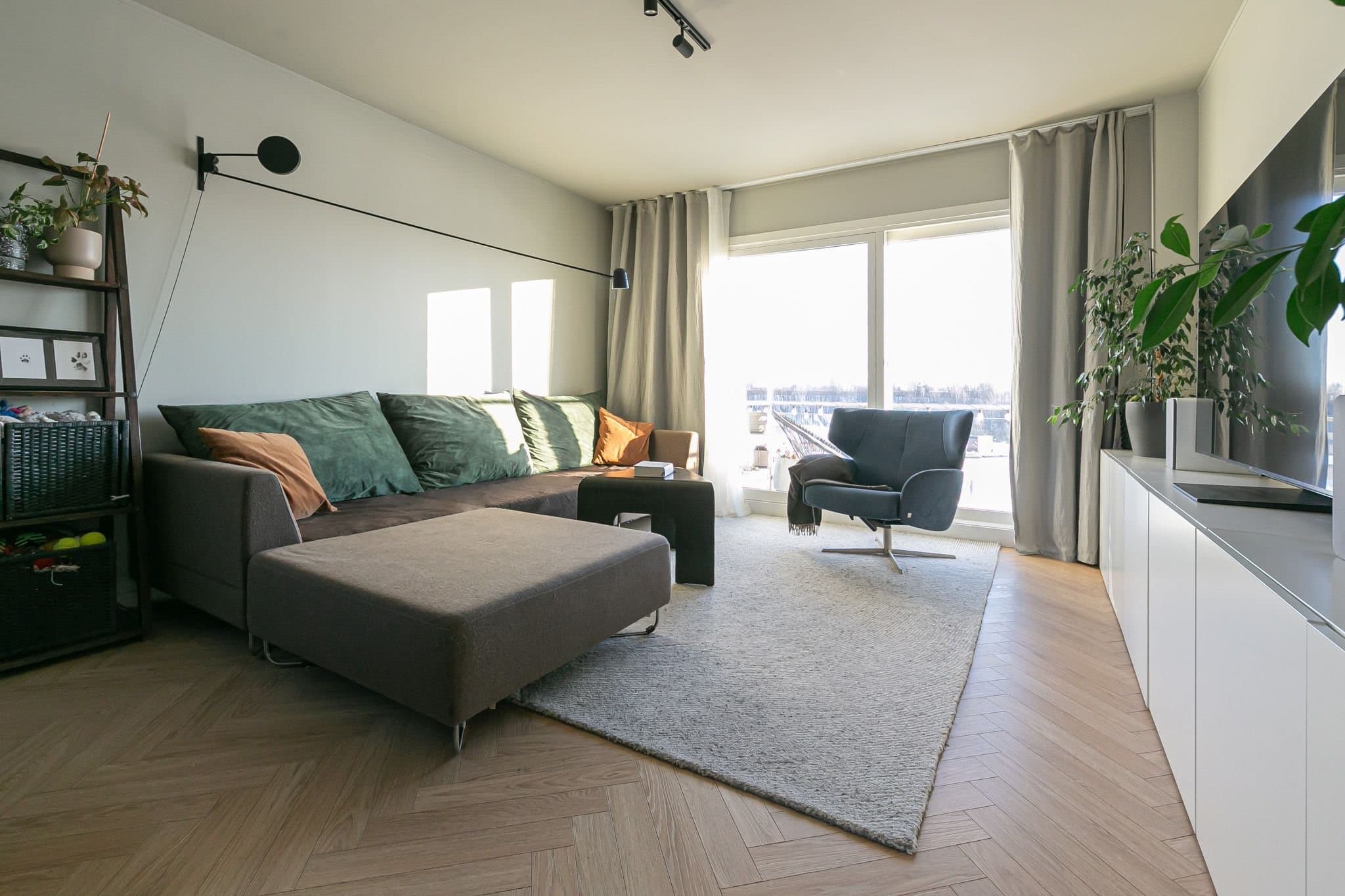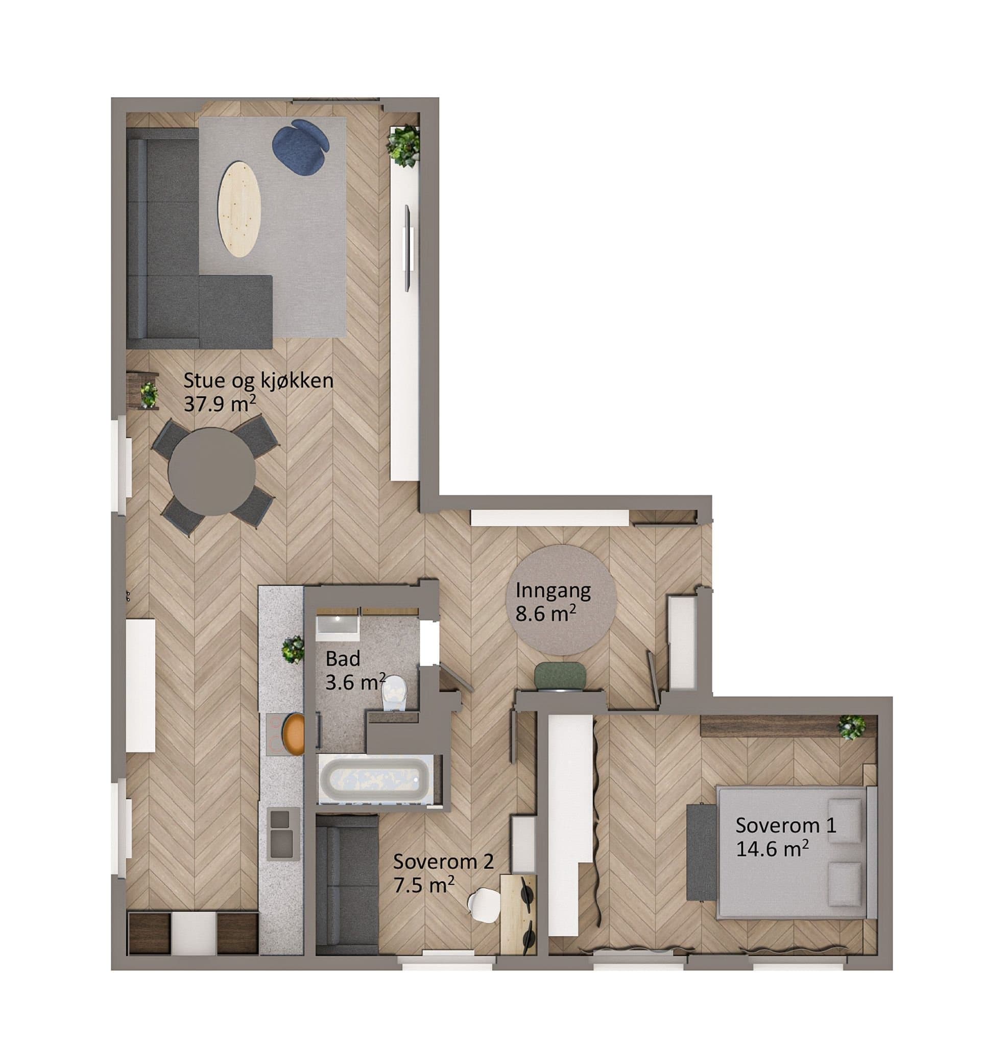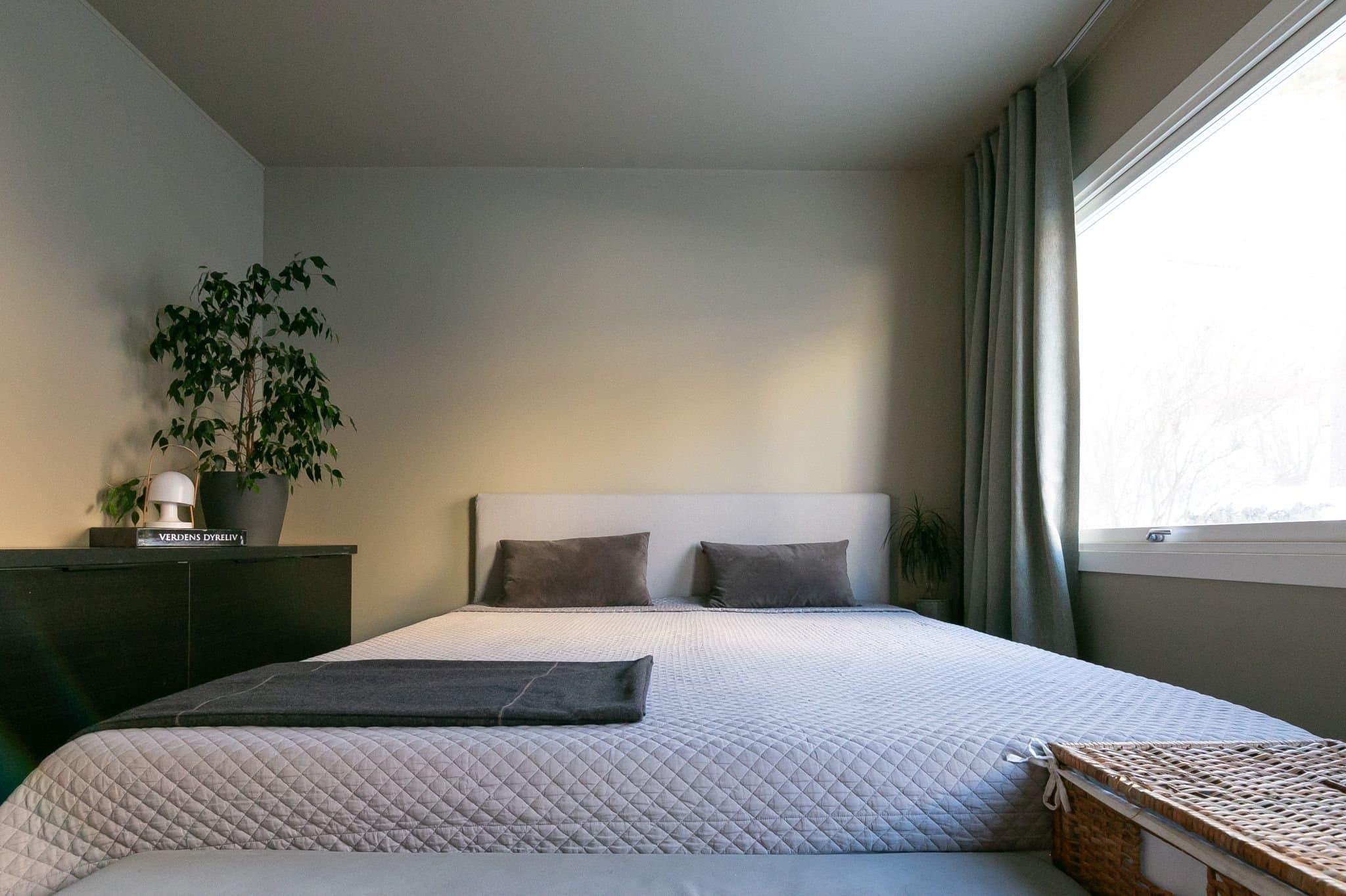 Gjennomgående 3-roms arkitekttegnet selveierleilighet i høy 1. etasje. Leiligheten ble totalrenovert i 2022, og har gjennomgående svært høy standard, og består av: entré, bad, stue og to soverom. Gjennomgående fiskebeins-laminat, gipsede vegger og ellers malte, slette vegger i alle rom. Alle vinduer og balkong-dør skiftet til tre-lags isolerglass, samt skiftet ytterdør. El-anlegg totalrenovert i 2022, samt bad og kjøkken med alle tilhørende rør totalrenovert i 2022. Vegger og gulv mot naboer og fellesareal ble lydisolert. God takhøyde og store vinduer. Sørvendt balkong med svært gode solforhold. Hyggelig nabolag og kort vei til kollektivtransport, matbutikker, kafeer og annet. Leiligheten har egen parkeringsplass i garasje, med lader for elbil samt to boder på totalt 5kvm.