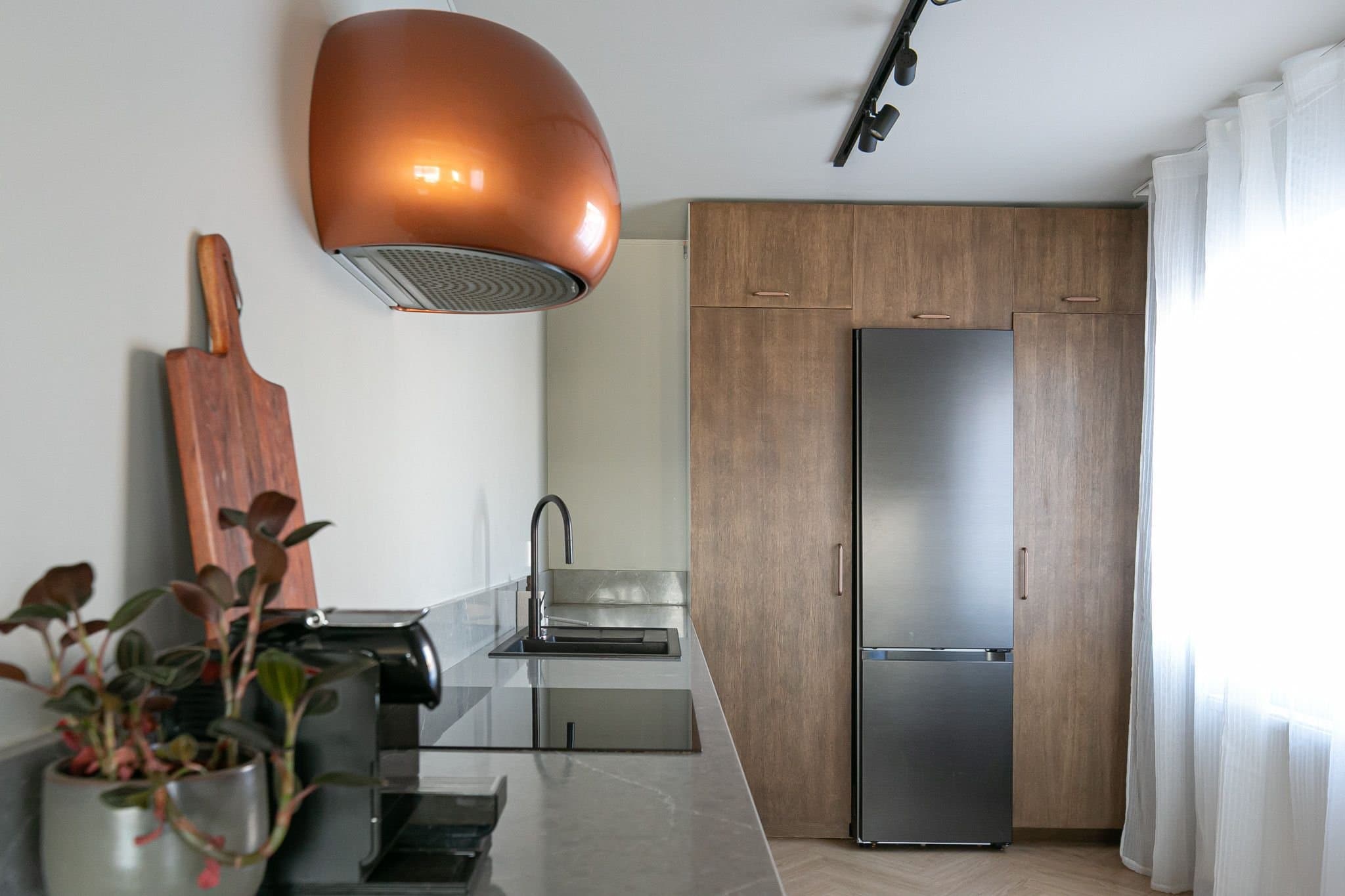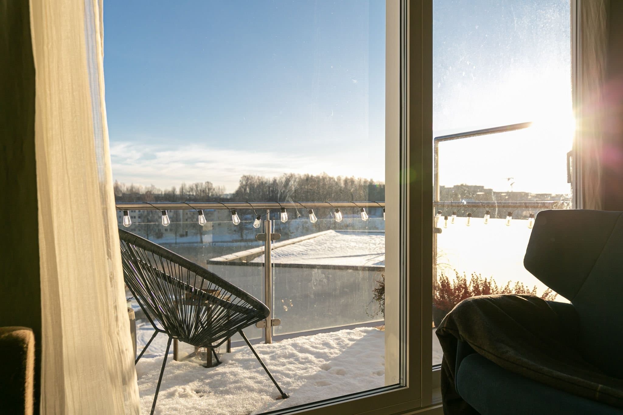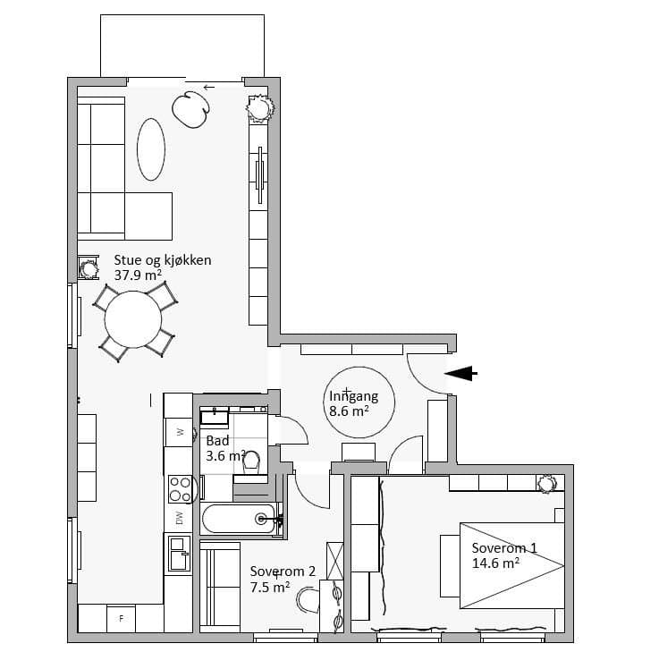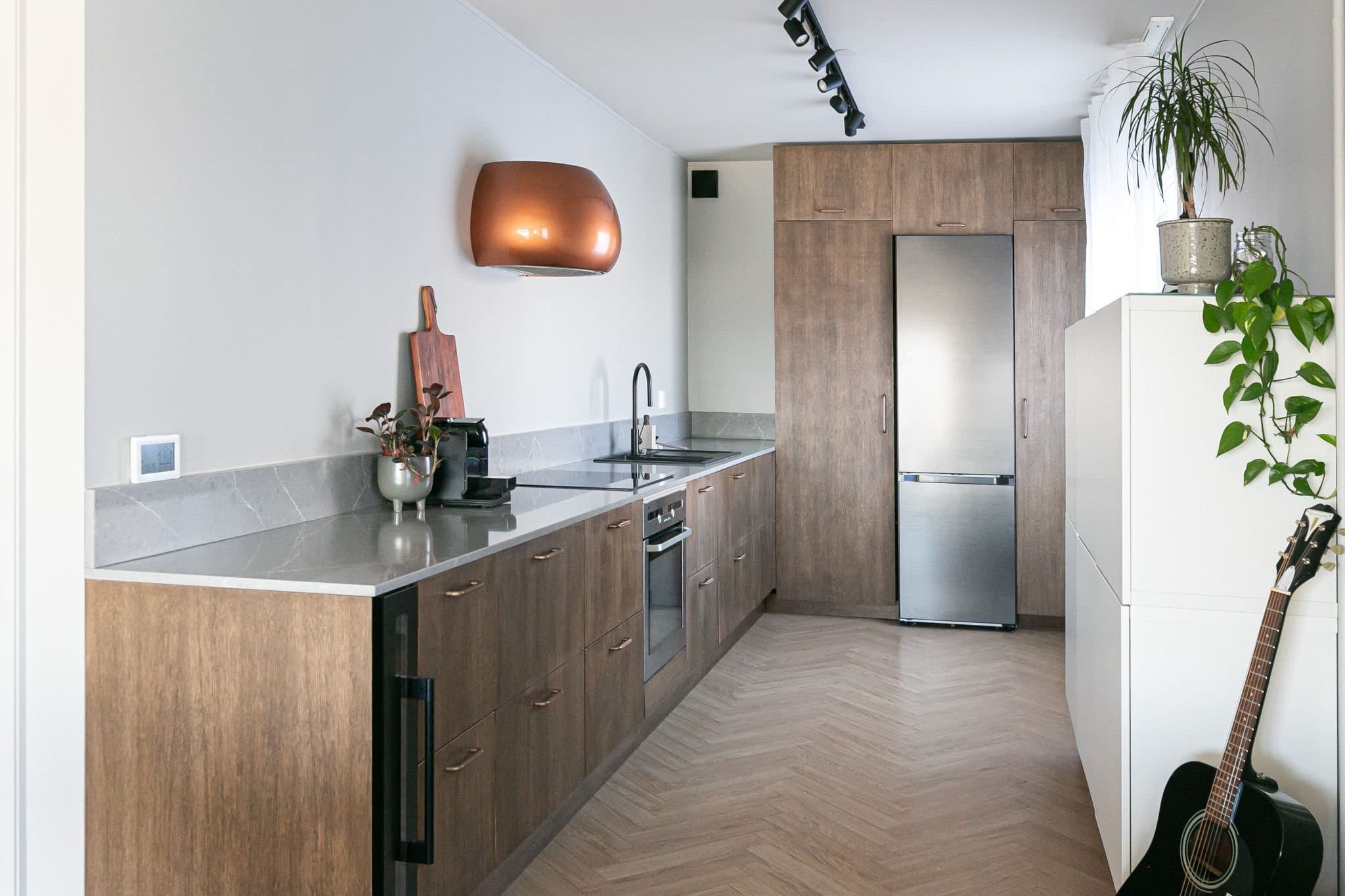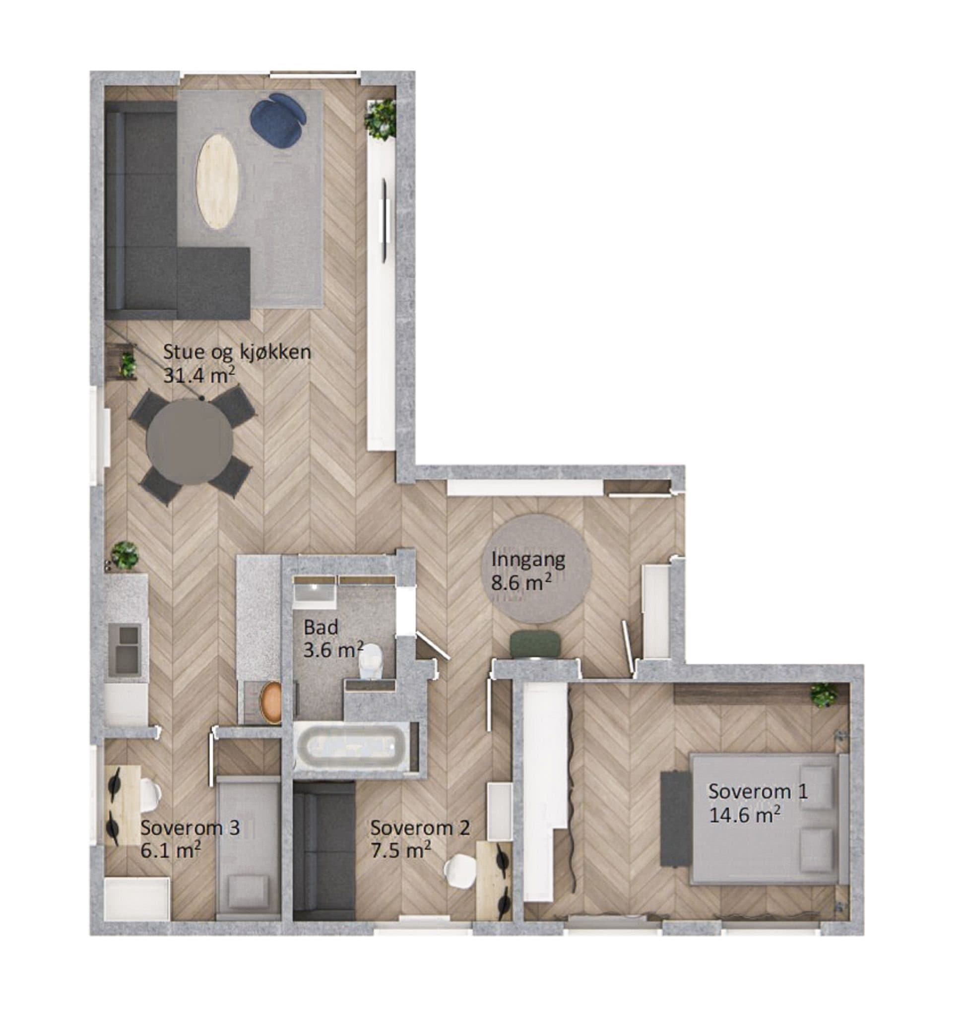 Gjennomgående 3-roms arkitekttegnet selveierleilighet i høy 1. etasje. Leiligheten ble totalrenovert i 2022, og har gjennomgående svært høy standard, og består av: entré, bad, stue og to soverom. Gjennomgående fiskebeins-laminat, gipsede vegger og ellers malte, slette vegger i alle rom. Alle vinduer og balkong-dør skiftet til tre-lags isolerglass, samt skiftet ytterdør. El-anlegg totalrenovert i 2022, samt bad og kjøkken med alle tilhørende rør totalrenovert i 2022. Vegger og gulv mot naboer og fellesareal ble lydisolert. God takhøyde og store vinduer. Sørvendt balkong med svært gode solforhold. Hyggelig nabolag og kort vei til kollektivtransport, matbutikker, kafeer og annet. Leiligheten har egen parkeringsplass i garasje, med lader for elbil samt to boder på totalt 5kvm.