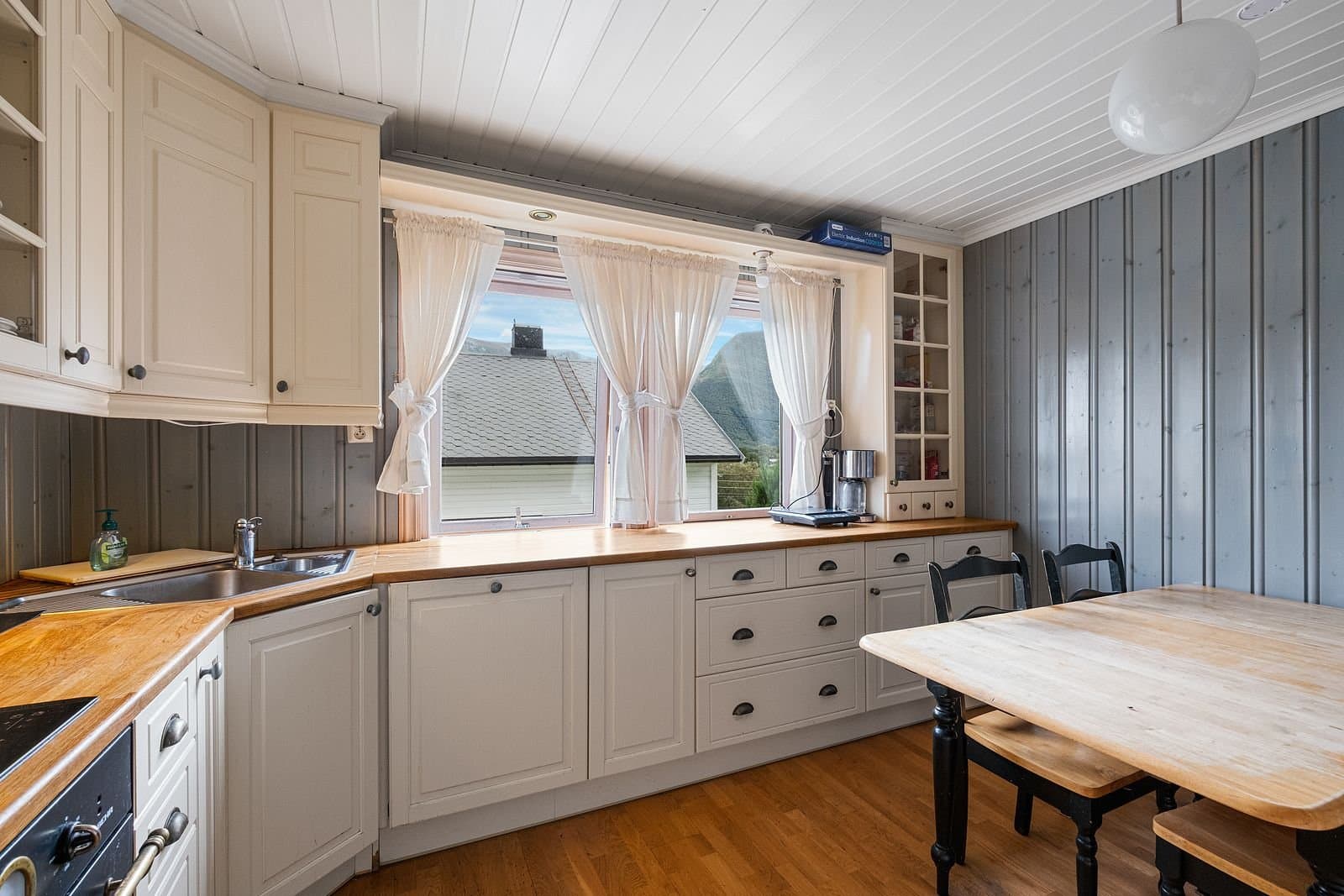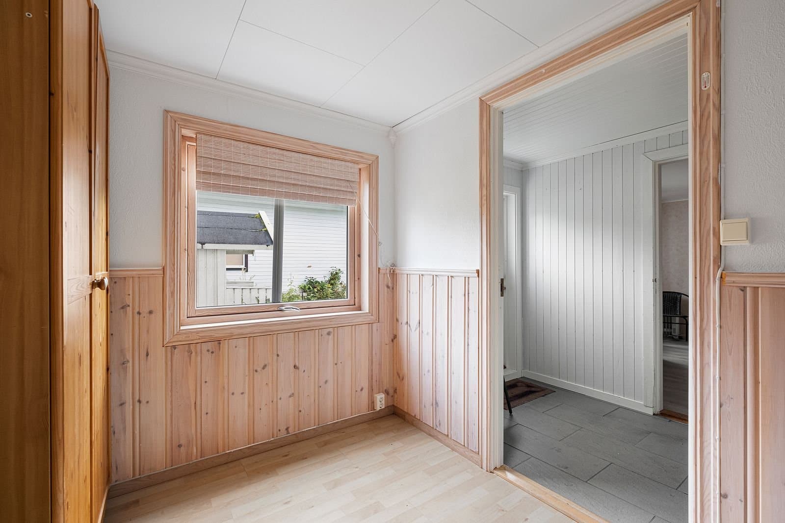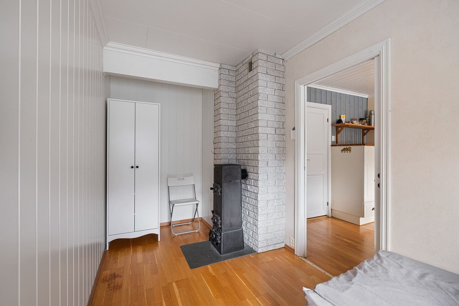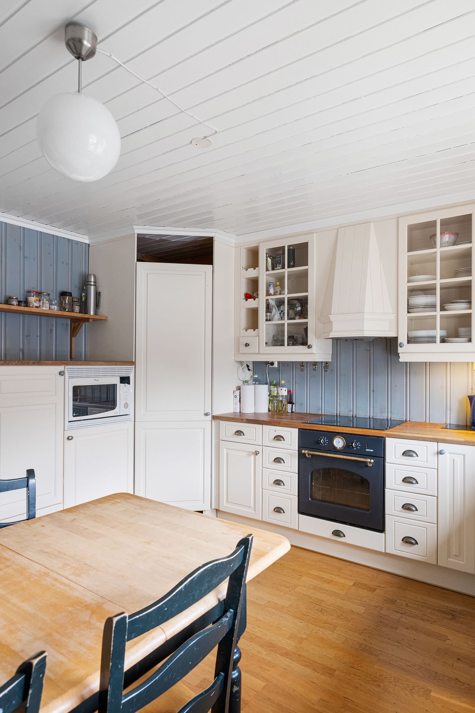 INNVENDIG Innvendig er det gulv av parkett, laminat og fliser. Veggene har tapet og trepanel. Innvendige tak har trepanel og himlingsplater. Etasjeskiller er av trebjelkelag. Betong pate mot grunn. Det er ikke foretatt radonmålinger og bygget er heller ikke utført med radonsperre. Boligen har mursteinspipe. Gulvet har laminat og er av betong. Veggene har betong/mur. Hulltaking er ikke foretatt. Rommet har en konstruksjon som gjør hulltaking unødvendig. Boligen har malt tretrapp. Innvendig har boligen malte fyllingsdører og glatte hvitmalte dører. Skyvedørsgarderobe i gang. KJØKKEN Kjøkkenet har innredning med profilerte fronter. Benkeplaten er av heltre. Det er kjølehjørne, oppvaskmaskin, platetopp, mikro, stekeovn og vannstoppsystem. Det er kjøkkenventilator med avtrekk ut.