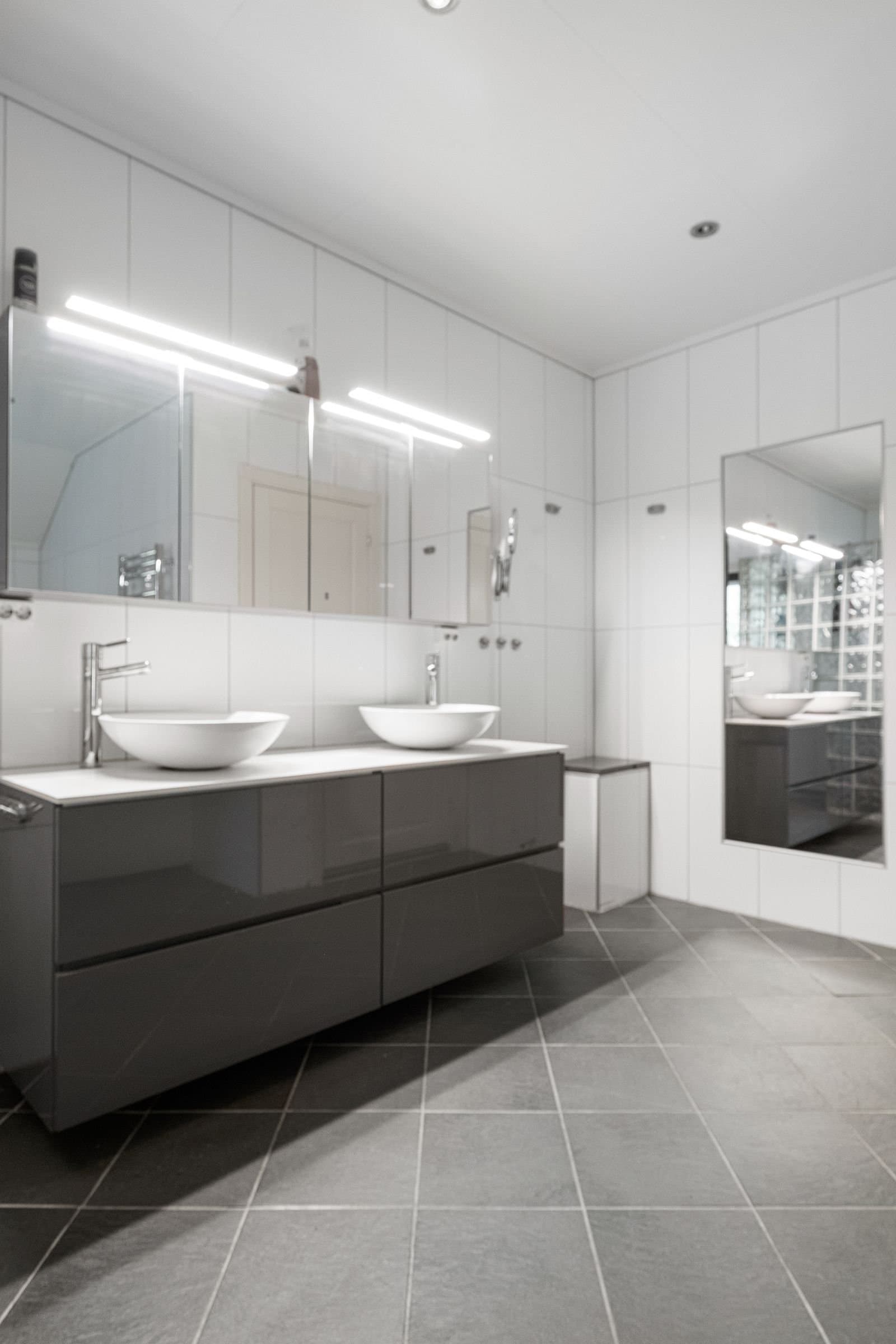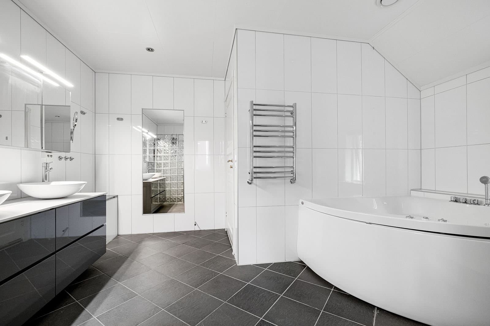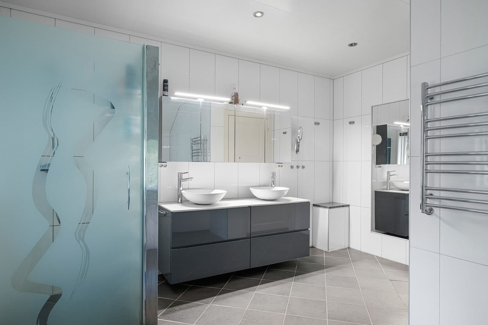 Bad i første etasje har innredning med 2 nedfelte servanter, veggmontert toalett, badekar og dusjvegger/ hjørne. Det er mekanisk avtrekk. Aktuell byggeforskrift er teknisk forskrift 2010. Dokumentasjon: ingen dokumentasjon. Veggene har fliser. Taket har himlingsplater. Gulvet er flislagt. Rommet har vannbåren gulvvarme. Fall mot sluk er målt til 4. Det er plastsluk og smøremembran med ukjent utførelse. Hulltaking er foretatt uten å påvise unormale forhold. Hulltaking er foretatt ved/i entré. Fuktkvotemåling (vekt%) i konstruksjonen ble målt til 8,5. Bad i underetasje har innredning med nedfelt servant, veggmontert toalett og dusjvegger/hjørne. Det er elektrisk styrt vifte. Aktuell byggeforskrift er teknisk forskrift 2010. Dokumentasjon: ingen dokumentasjon. Veggene har baderomsplater. Taket har himlingsplater. Gulvet er flislagt. Rommet har vannbåren gulvvarme. Fall mot sluk er målt til 3. Det er plastsluk og smøremembran med ukjent utførelse. Hulltaking er foretatt uten å påvise unormale forhold. Hulltaking er foretatt ved/i teknisk rom. Fuktkvotemåling (vekt%) i konstruksjonen ble målt til 7. Vaskerom i underetasje. Dokumentasjon: ingen dokumentasjon. Rommet er fra bygge år, det var ikke noe regelverk for slike rom på den tiden. Taket har panel. Vegger i malt betong. Gulvet har malt/behandlet betong. Rommet har ingen varmekilde. Fall mot sluk er målt til 50mm. Det er eldre soilsluk , malt gulv. Rommet har opplegg for vaskemaskin. Vask Det er naturlig ventilering. Hulltaking er ikke foretatt da det ikke er fysisk mulig pga tilliggende konstruksjoner.