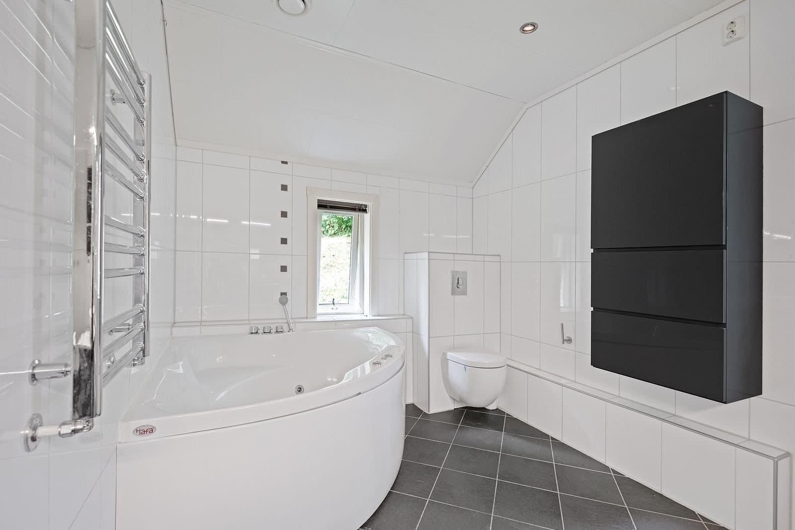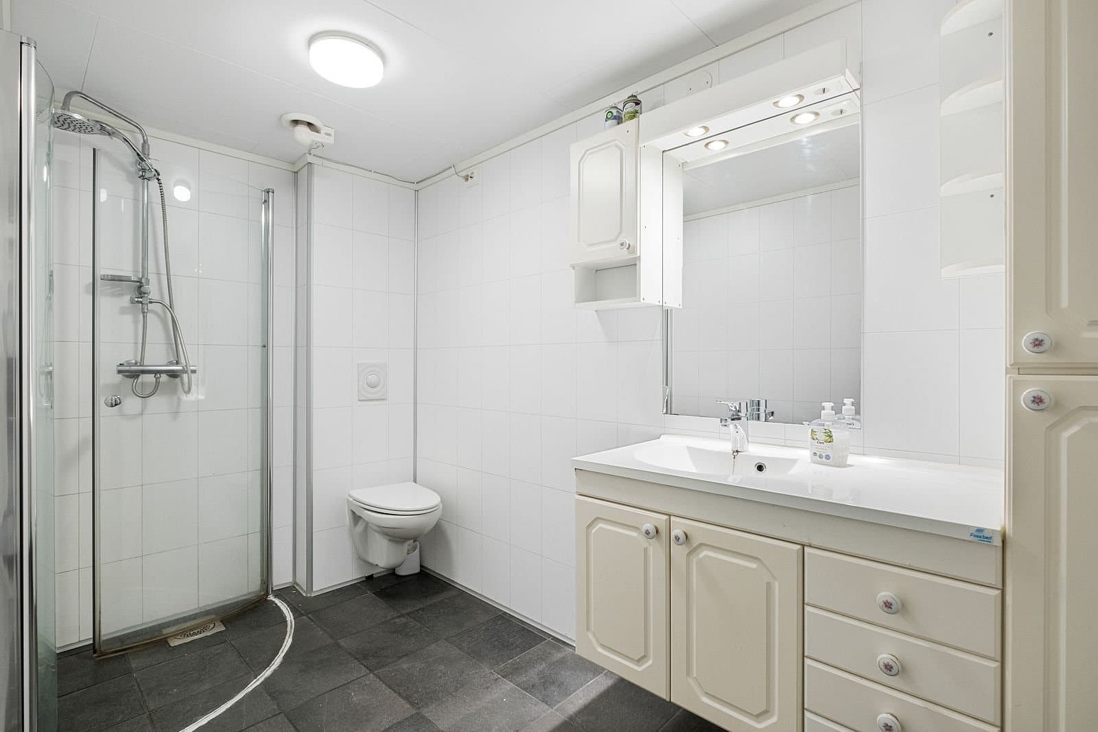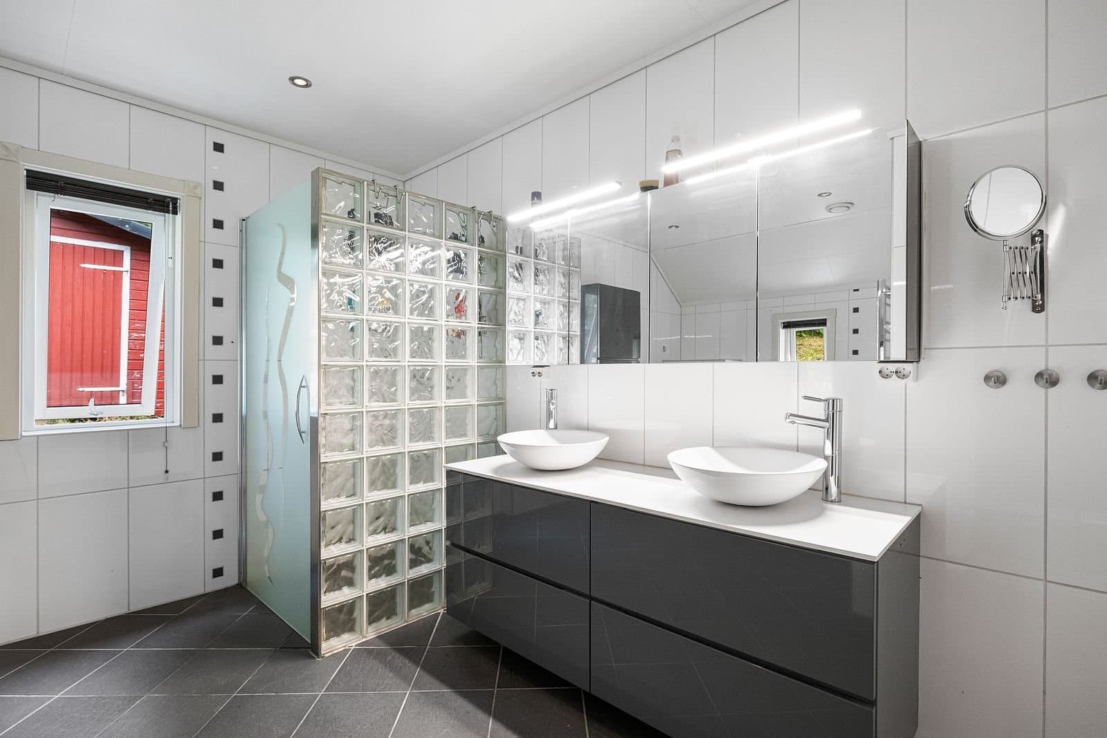 Bad i første etasje har innredning med 2 nedfelte servanter, veggmontert toalett, badekar og dusjvegger/ hjørne. Det er mekanisk avtrekk. Aktuell byggeforskrift er teknisk forskrift 2010. Dokumentasjon: ingen dokumentasjon. Veggene har fliser. Taket har himlingsplater. Gulvet er flislagt. Rommet har vannbåren gulvvarme. Fall mot sluk er målt til 4. Det er plastsluk og smøremembran med ukjent utførelse. Hulltaking er foretatt uten å påvise unormale forhold. Hulltaking er foretatt ved/i entré. Fuktkvotemåling (vekt%) i konstruksjonen ble målt til 8,5. Bad i underetasje har innredning med nedfelt servant, veggmontert toalett og dusjvegger/hjørne. Det er elektrisk styrt vifte. Aktuell byggeforskrift er teknisk forskrift 2010. Dokumentasjon: ingen dokumentasjon. Veggene har baderomsplater. Taket har himlingsplater. Gulvet er flislagt. Rommet har vannbåren gulvvarme. Fall mot sluk er målt til 3. Det er plastsluk og smøremembran med ukjent utførelse. Hulltaking er foretatt uten å påvise unormale forhold. Hulltaking er foretatt ved/i teknisk rom. Fuktkvotemåling (vekt%) i konstruksjonen ble målt til 7. Vaskerom i underetasje. Dokumentasjon: ingen dokumentasjon. Rommet er fra bygge år, det var ikke noe regelverk for slike rom på den tiden. Taket har panel. Vegger i malt betong. Gulvet har malt/behandlet betong. Rommet har ingen varmekilde. Fall mot sluk er målt til 50mm. Det er eldre soilsluk , malt gulv. Rommet har opplegg for vaskemaskin. Vask Det er naturlig ventilering. Hulltaking er ikke foretatt da det ikke er fysisk mulig pga tilliggende konstruksjoner.