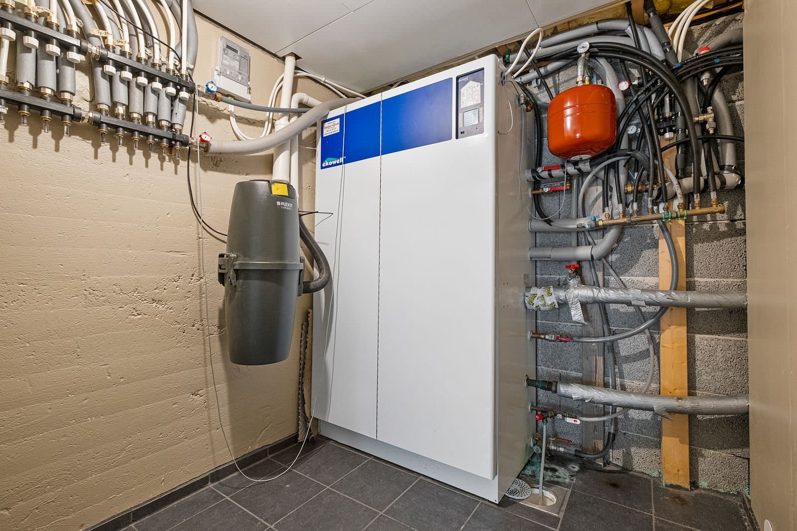 Det er installert varmepumpe med energibrønn. Sentralt varmtvannsbereder, integrert i varmepumpen. • Vannbåren varme i de fleste oppholdsrom, unntatt kjøkken, vaskerom, 2 soverom i underetasjen og andre etasje. • Badene har vannbåren gulvvarme. • Vaskerom har ingen varmekilde. Varmekilder, slik som ovner, kaminer, peiser, varmepumper og panelovner, følger med uansett festemåte. Frittstående biopeiser/varmeovner og terrassevarmere medfølger ikke. Det følger ikke med varmekilder i rom som ikke har vegg- eller fastmonterte varmekilder på visning.