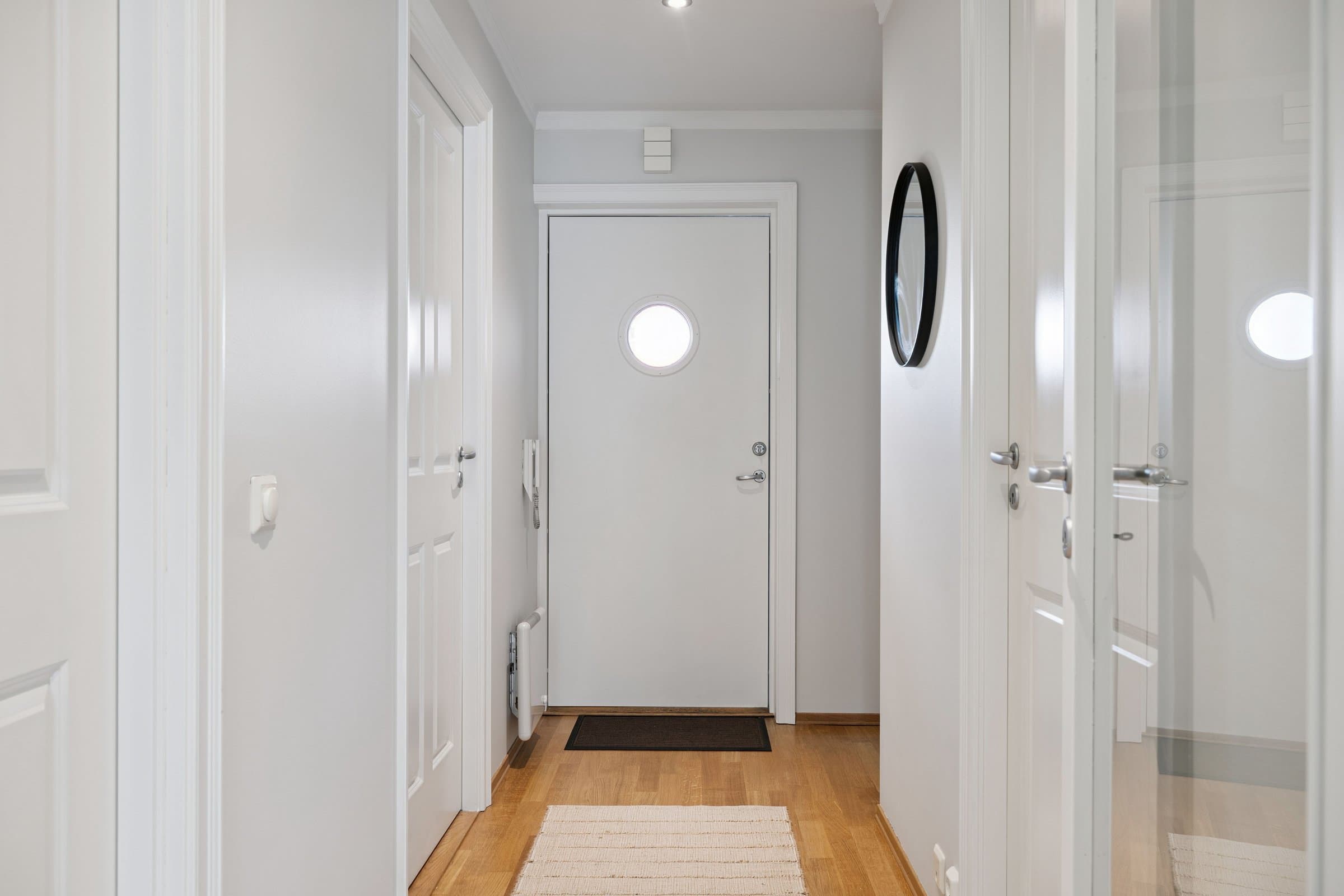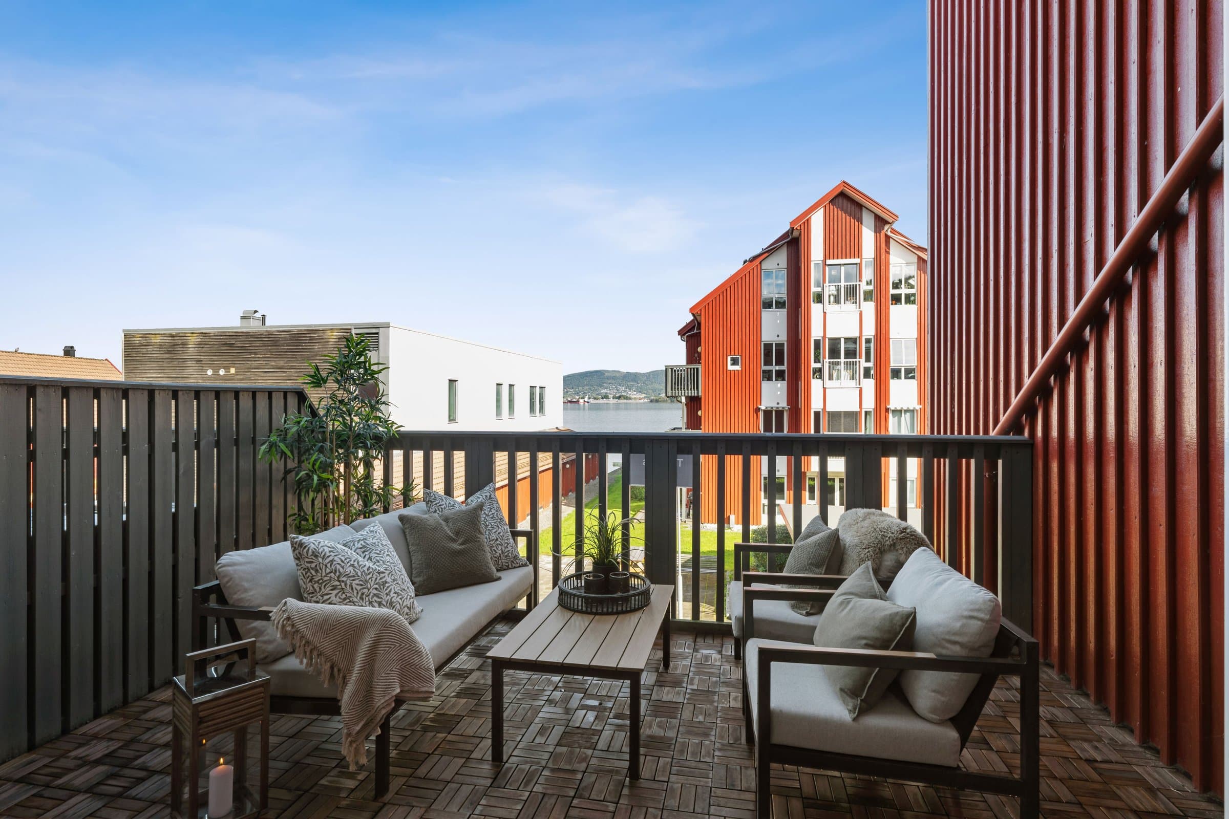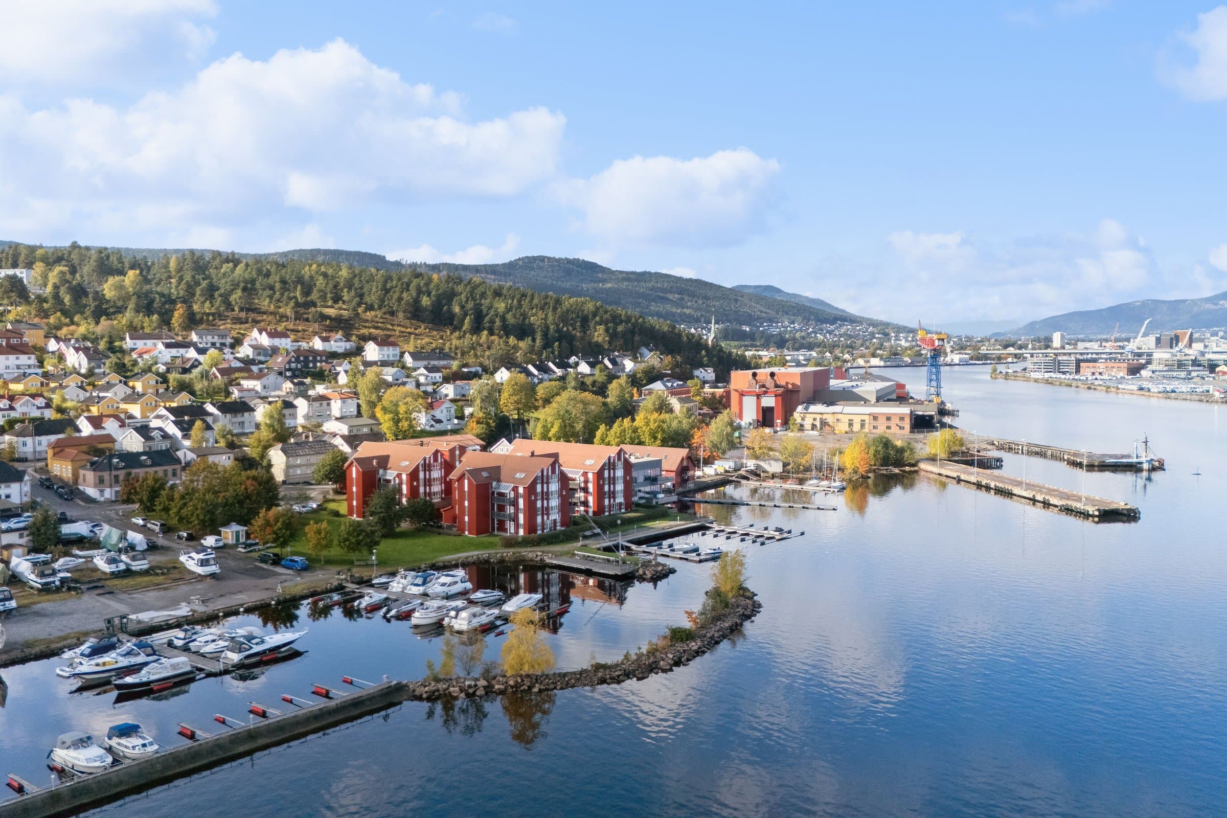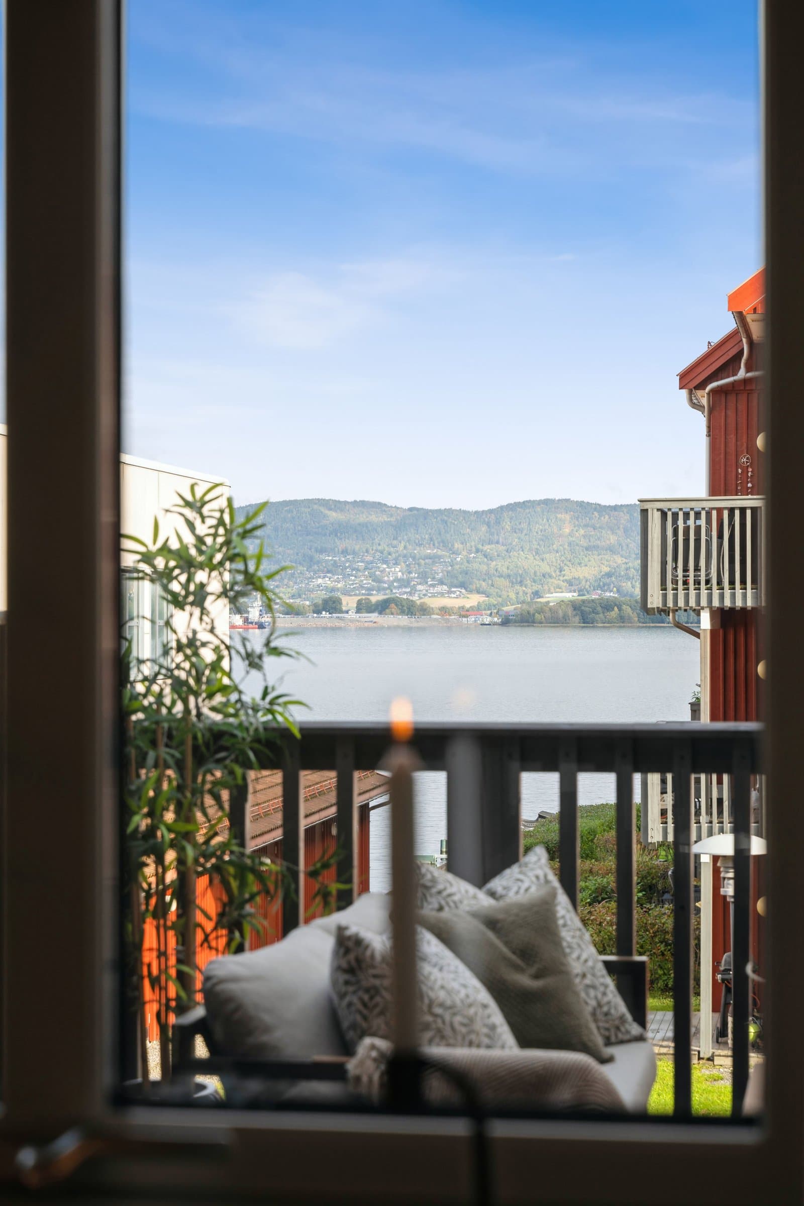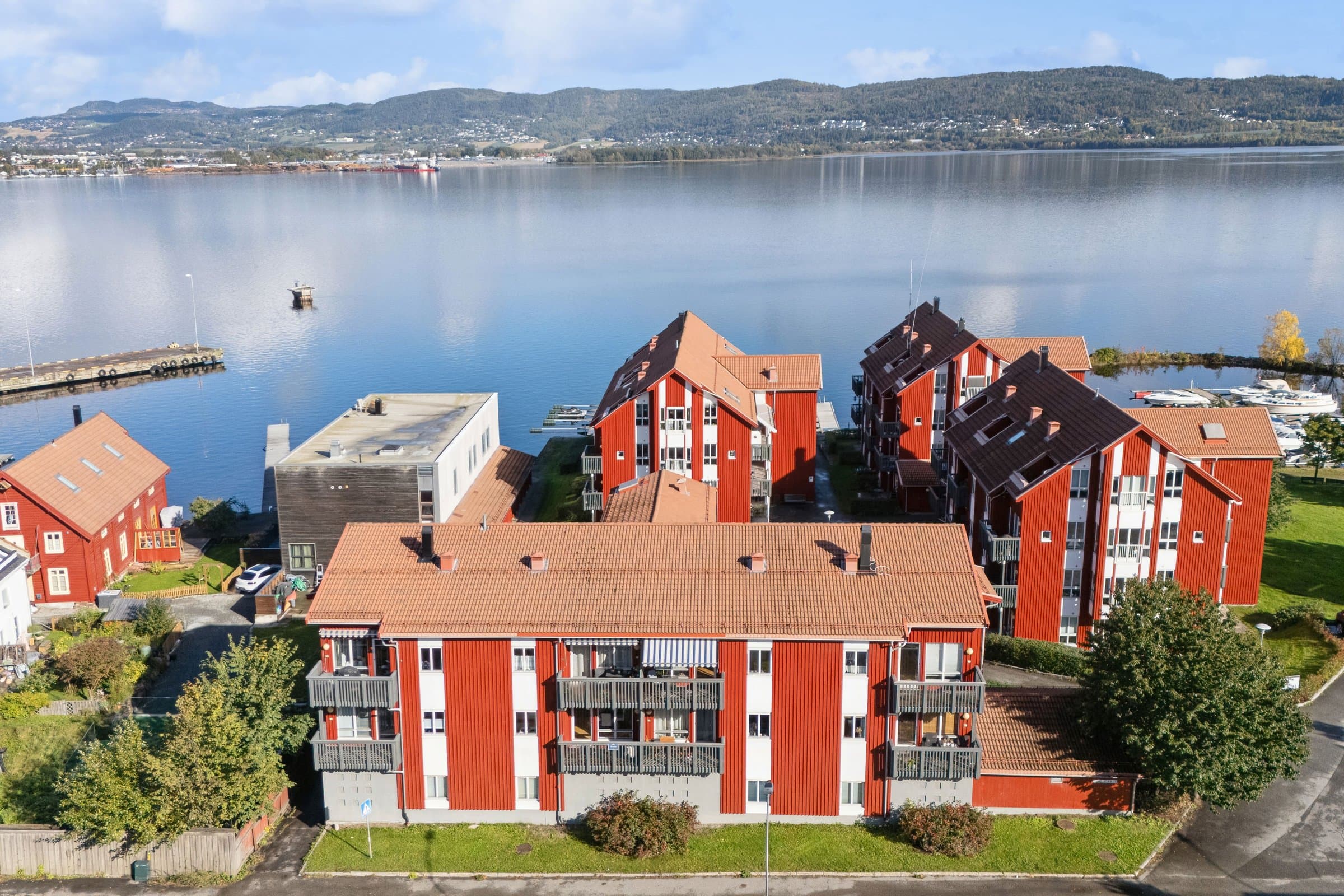Gjennomgående selveierleilighet i 2. etasje i blokk fra 2003 (fasadene malt i 2022). Hele leiligheten er nymalt og det elektriske anlegget kontrollert og oppdatert i 2025. Nytt dekke lagt på romslig uteplass med fjordutsikt og balkong. Egen parkeringsplass i kjelleren i samme blokk (heis fra kjeller til leilighet), hvor det også er sykkelparkering. Søppelrom og postkasse i samme blokk. Du kan altså gå tørrskodd innendørs til bilen, søpla, for å hente aviser/post. Leiligheten har gjennomgående god standard og består av: entré, bad (fliser, varmekabler og dusjkabinett fra Porsgrund av beste slag), bod (ca 4 m2), stue/kjøkken og to soverom. Parkettgulv i pen stand. Malte gipsvegger i alle rom utenom badet. Normal takhøyde og store stuevinduer. Romslig uteplass og balkong. Romslig utvendig bod (5,3 m2 og høyt under taket). Stor kommunal p-plass (uten avgift eller begrensninger) gir gode parkeringsmuligheter for ekstra bil og gjester. Felles brygge med badestige og tilhørende gressplen. I tillegg en stor gressplen med trær som gir god plass til soling og lek. Det er utepeis og sittebenker på området. Mulighet for båtplass både ved brygga i sameiet og hos båtforeningen som er nærmeste nabo.