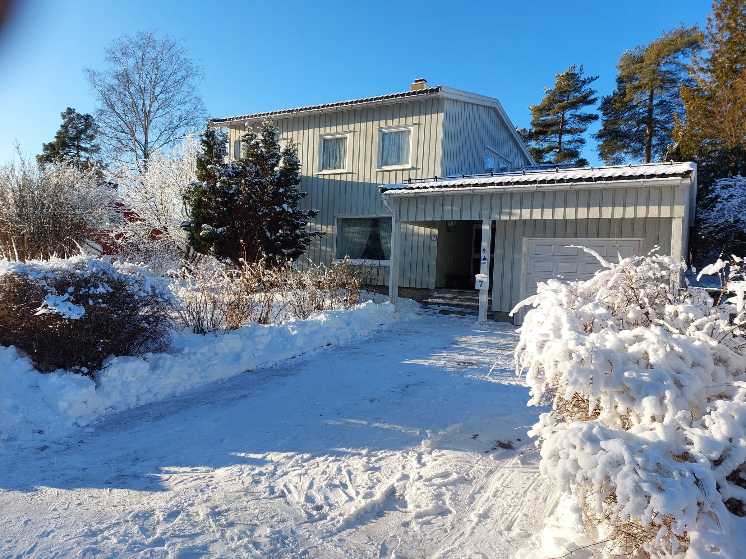 Solid bygget velholdt enebolig fra 1955. Bygget etter krav for isolasjon og standarder som hovedsaklig gjaldt frem til 1997. Hovedstue fremstår som lys med panorama vindu øst mot Brunkollen, dobbelt glass verandadør med utsikt mot sør, vindu med utsikt mot overbygget arkitekt tegnet terrasse. Helved eik stavparkett i stuen med energieffektiv kakkelovn. Arealeffektivt kjøkken. Meget romslige soverom i 2 etasje med hvor 2 soverom har plass til 1.8 bredde dobbeltsenger + soveromsmøblement. Innebygde garderobeskap medfølger på alle soverom. Nede er ekstra stue med kakkelovn, helved eik stavparkett og utsikt mot veien. Meget romslig garasje og overbygd inngangsparti. Kort bred oppkjørsel, har plass til fire biler. Oppkjørsel er enkel og rask å måke om vinteren. Totalt er det 32 m2 terrasse mot sør, hvorav 12 m2 er overbygget. Mot øst 16 m2. Boligen har utmerkete dreneringsforhold ved at terrenget skråner vekk fra boligen.
