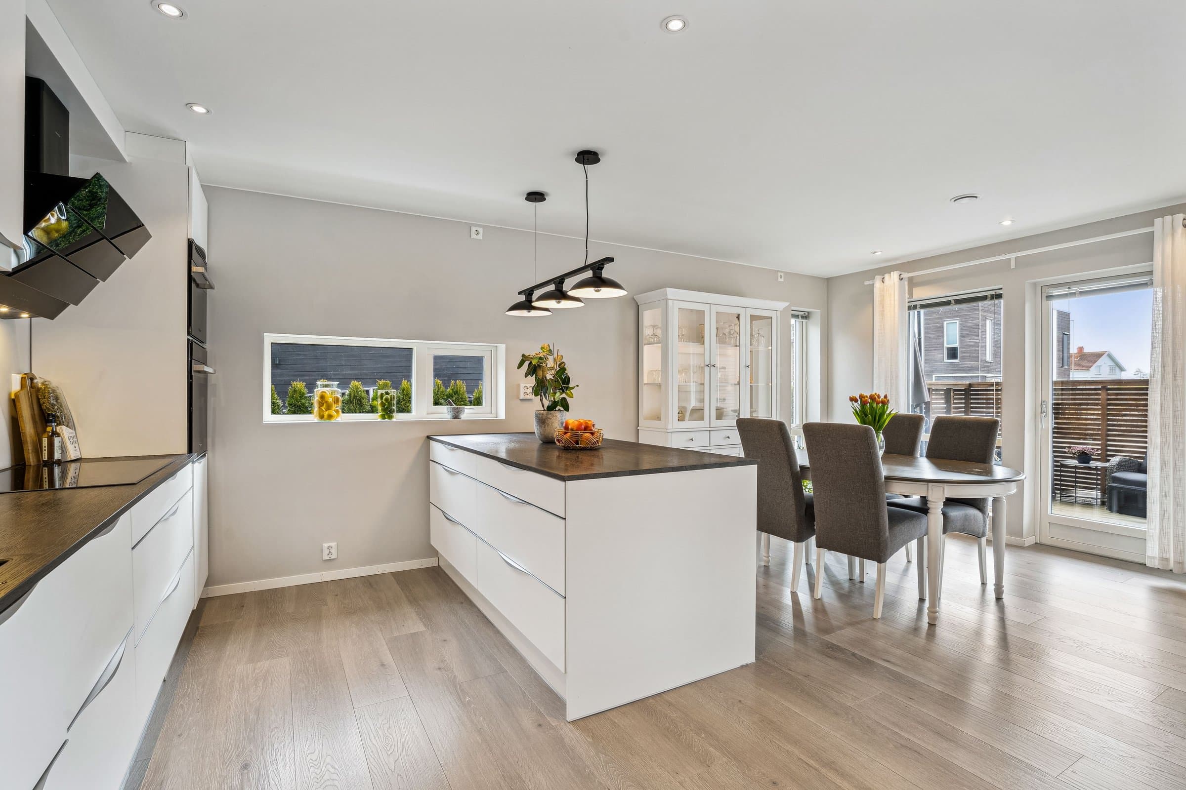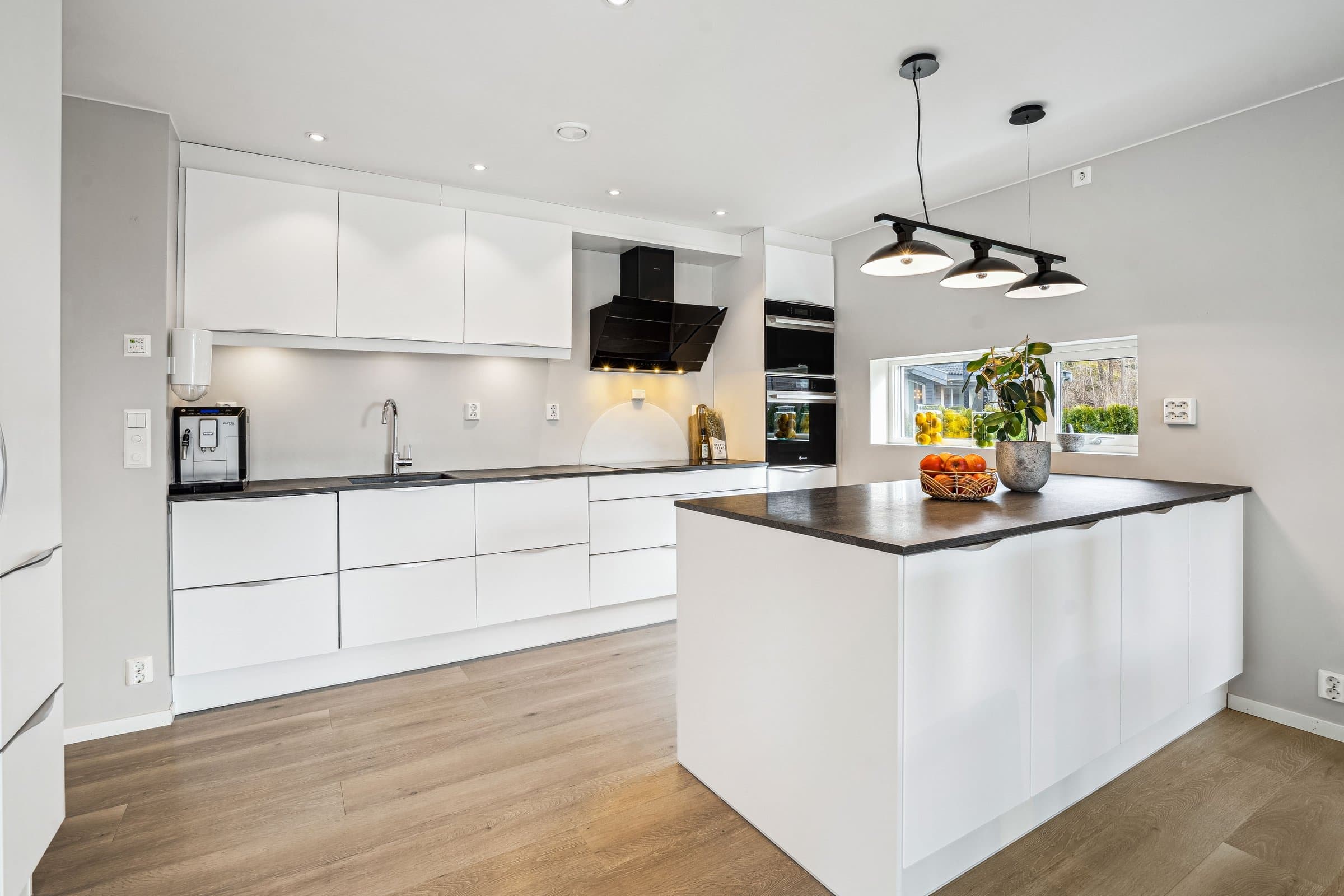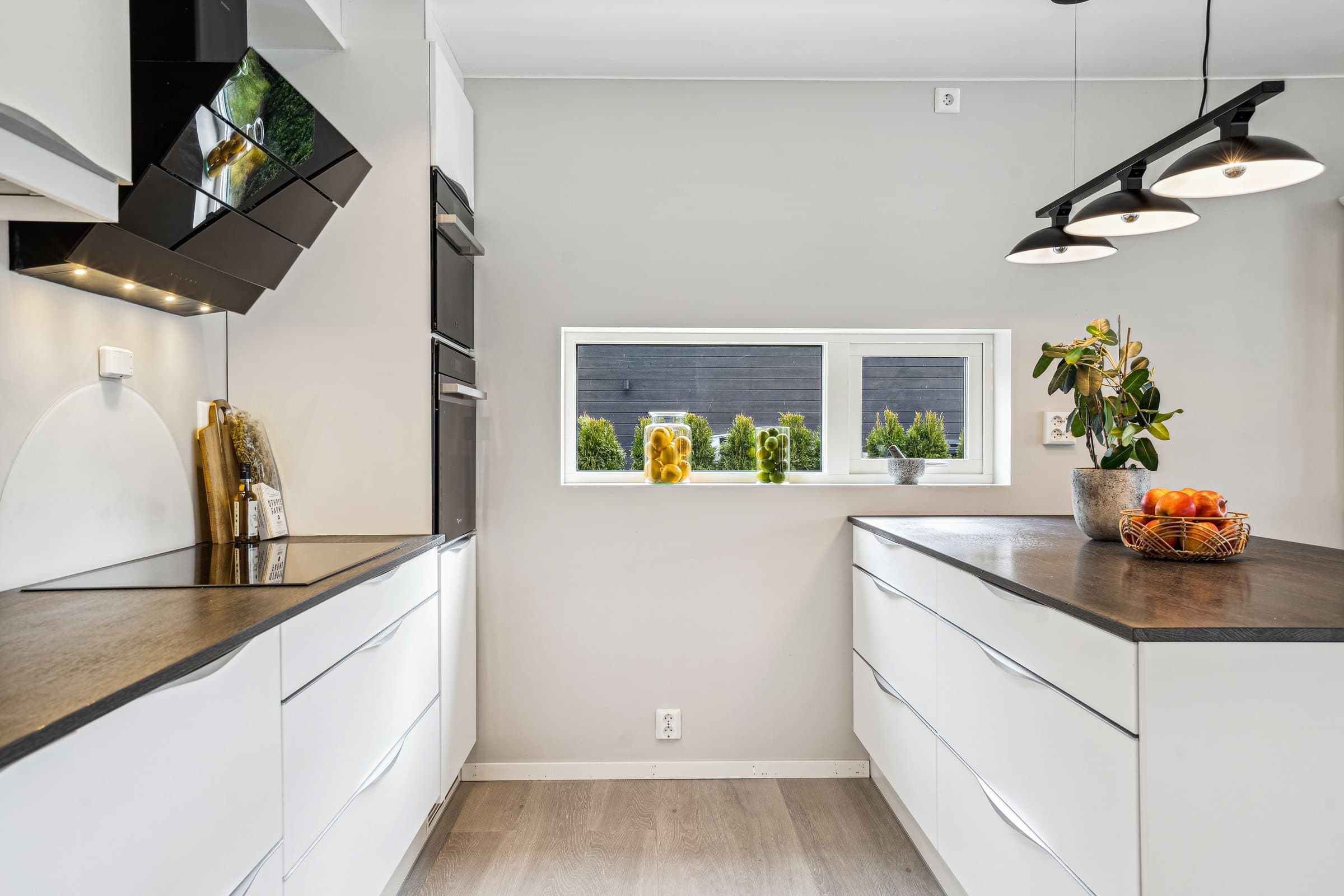 Boligen er oppført i 2018 og har en meget god standard. Boligen framstår moderne i både materialvalg, teknisk standard og planløsning. Boligen har balansert ventilasjon med varmegjenvinning, varme i gulv i hele underetasje samt bad i 2. etg. stor takhøyde, store vindusflater og lyse fine rom. Videre har boligen 2 romslige svært pene bad og et stort vaskerom med vaskeroms innredning og benkeplass. Badet i 1. etg. har fliser på gulv, stor dusjnisje, baderomsinnredning og vegghengt wc. Badet i 2. etg. er det fliser på gulv, dusjhjørne med glassvegger, vegghengt wc og baderomsinnredning. I 1. etg finner vi stue og åpen kjøkkenløsning. Fra stuen er det utgang til terrasse. Meget flott JKE- kjøkken med øy, mye skap- og benkeplass. Et riktig så praktisk kjøkken. Det er videre integrerte hvitevarer som kjøl og frys, mikro, komfyr og koketopp samt oppvaskmaskin. Det gis ikke garanti på hvitevarer. I stuen finner vi naturlig plass til spisestue og dagligstue. Det er lyse fine arealer og naturlig godt med dagslys. I 2 etg er det 3 soverom hvorav et med walk-in-closet og utgang til veranda. Det er en stue med svært god takhøyde og store vindusflater. Stuen i 2. etg. bidrar til fleksibilitet i boligen ift en families behov. Boligen etterlater seg et svært godt inntrykk, fremstår tidsmessig og moderne og ikke minst er beliggenheten meget god og familievennlig. Utvendig er det en romslig bod i tilknytning til huset. Det er det oppstillingsplass for inntil 4 biler. Det er installert ladestasjon for el.bil. Det er er singellagt gangvei rundt huset med kantsteiner av granitt.