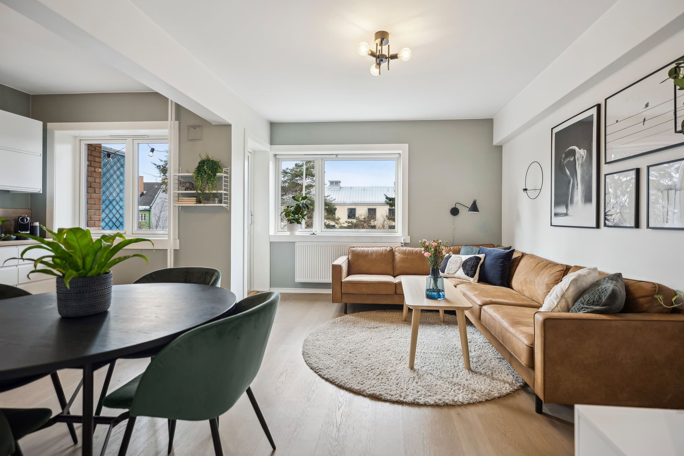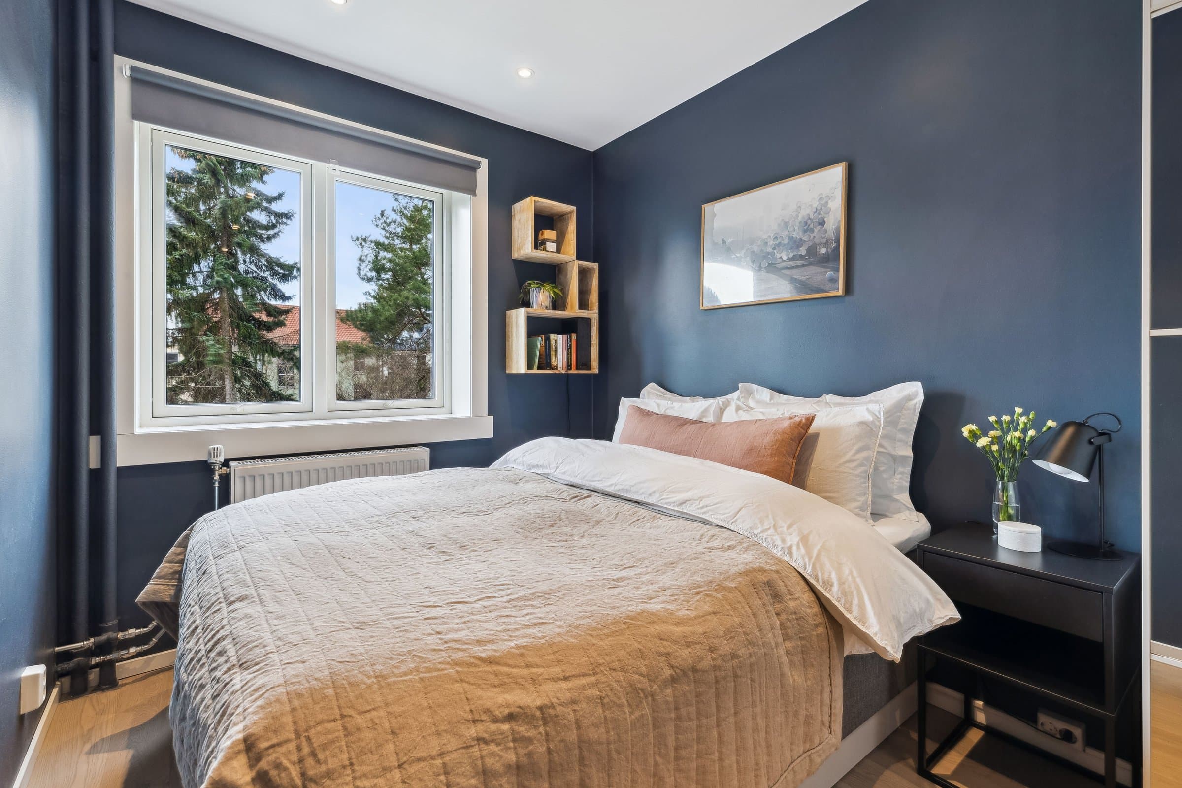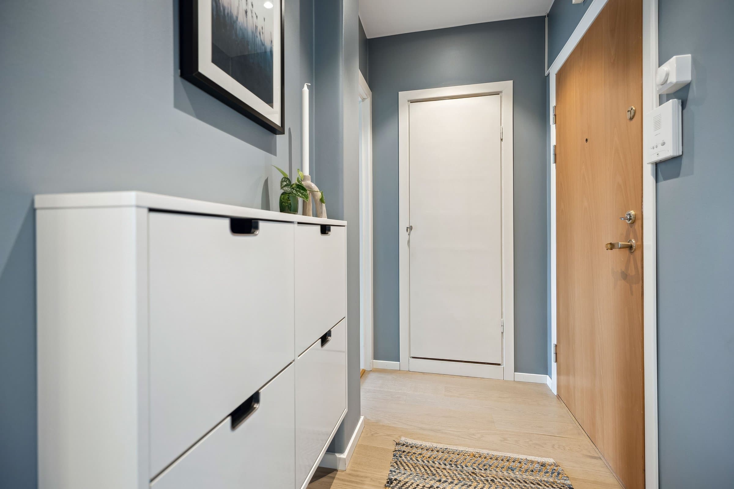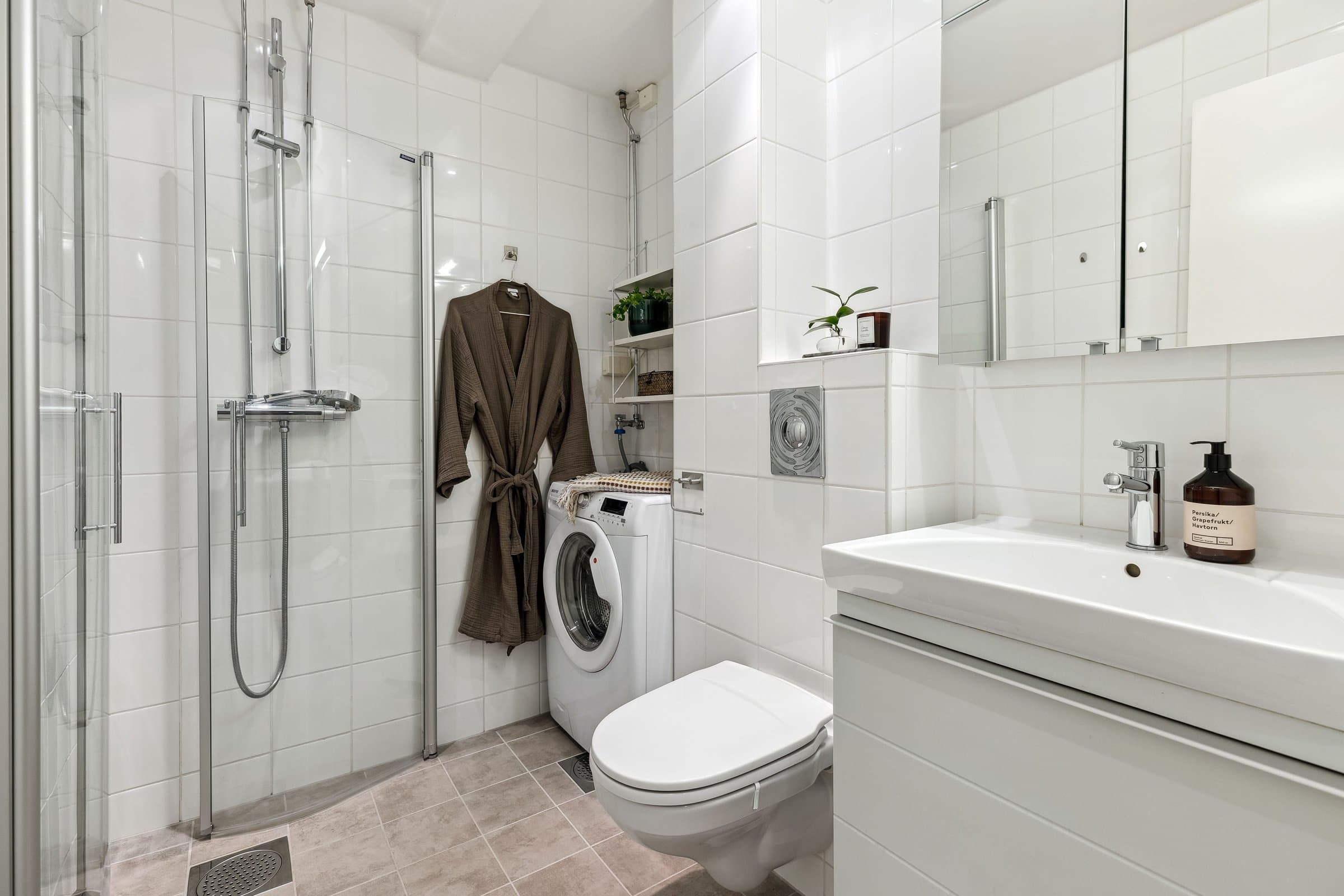 Gang: Innbydende gang med helsparklede og malte vegger, downlights i taket og parkettgulv. Et praktisk kott sørger for god oppbevaring av yttertøy og sko. Stue: Lys og luftig stue med god takhøyde og store vindusflater som slipper inn rikelig med naturlig lys. Stuen har parkettgulv og helsparklede, malte vegger. I 2016 ble veggen mellom kjøkken og stue fjernet for å skape en mer åpen planløsning. Fra stuen er det utgang til en lun, vestvendt balkong på ca. 3,5 kvm. Vinduer, balkongdør og radiatorer ble skiftet i 2016. Kjøkken: Stilrent og moderne kjøkken fra 2016 med glatte fronter og en slitesterk laminert benkeplate med nedsenket oppvaskkum. Integrerte hvitevarer, inkludert kjøl-/fryseskap, oppvaskmaskin, platetopp, mikrobølgeovn og stekeovn. Kjøkkenet er praktisk utformet og har rikelig med benkeplass og gode oppbevaringsmuligheter. I tillegg har du tilgang til en romslig bod med plass til utstyr som for eksempel tørrvarer, store kjeler, vaskeutstyr, støvsuger, fryser. Bad: Lyst og moderne bad, pusset opp i regi av aksjelaget i 2009. I 2024 ble det lagt nye varmekabler og nytt gulv. Badet er innredet med vegghengt toalett, stilren baderomsinnredning med servant, veggskap og et romslig dusjhjørne med elegante glassdører. Det er også opplegg for vaskemaskin. Soverom: Romslig soverom med en lun og behagelig stemning. Her er det helsparklede og malte vegger, downlights i taket og parkettgulv. Gode oppbevaringsmuligheter med et praktisk skyvedørsgarderobe som følger med.