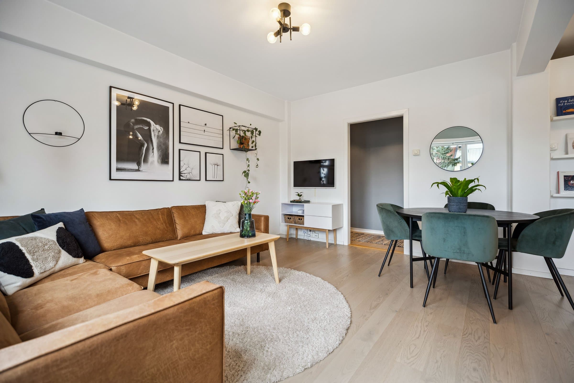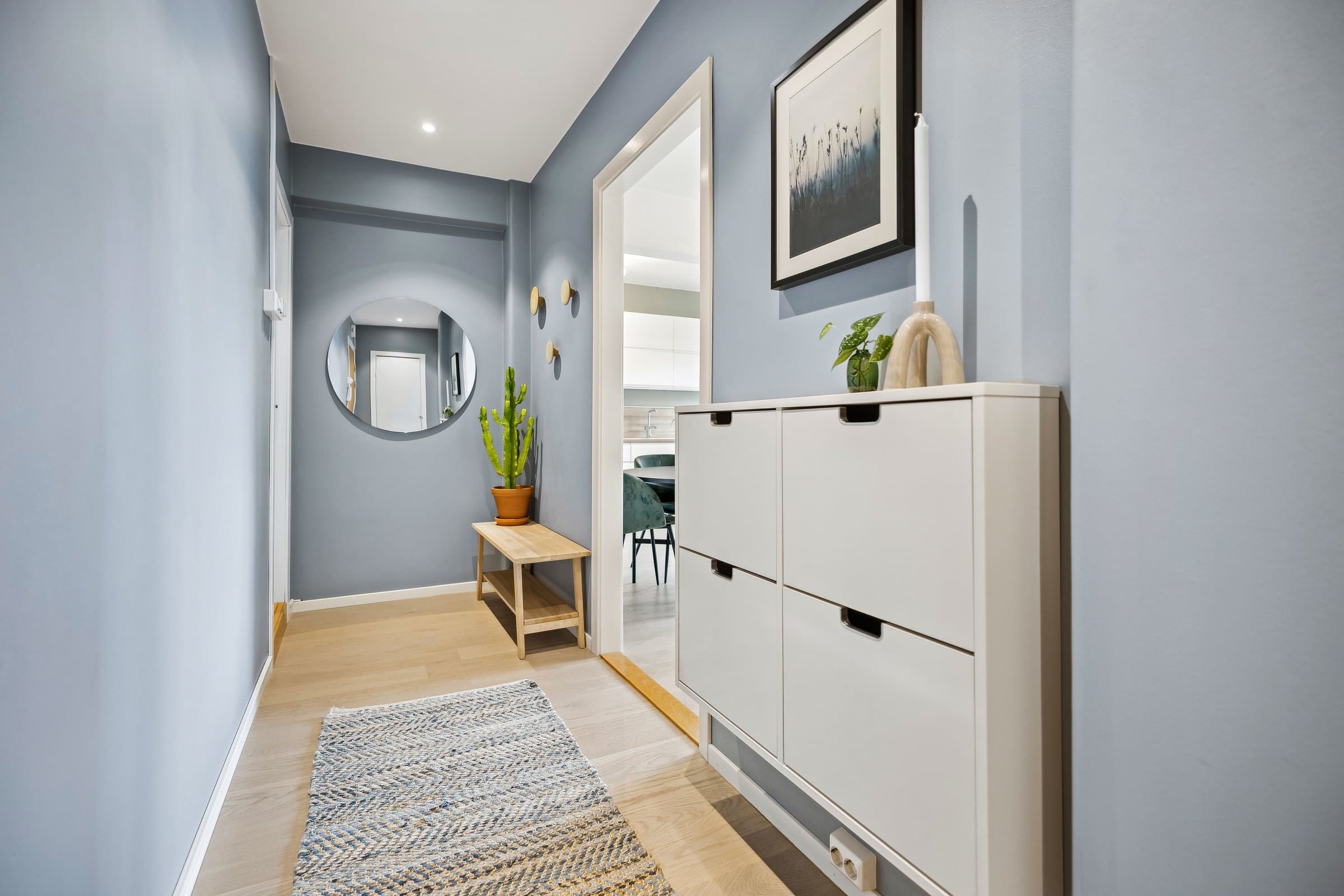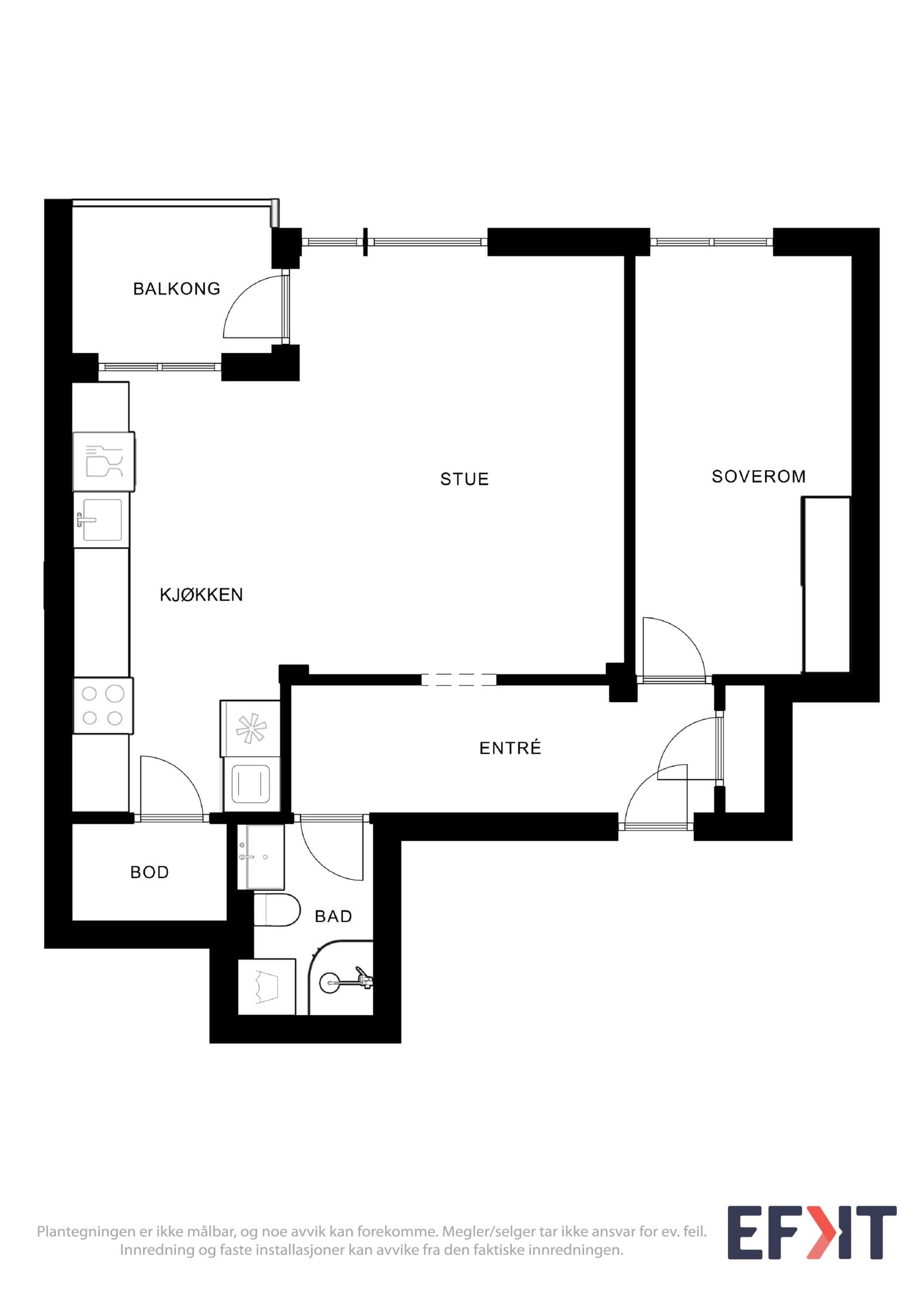 Gang: Innbydende gang med helsparklede og malte vegger, downlights i taket og parkettgulv. Et praktisk kott sørger for god oppbevaring av yttertøy og sko. Stue: Lys og luftig stue med god takhøyde og store vindusflater som slipper inn rikelig med naturlig lys. Stuen har parkettgulv og helsparklede, malte vegger. I 2016 ble veggen mellom kjøkken og stue fjernet for å skape en mer åpen planløsning. Fra stuen er det utgang til en lun, vestvendt balkong på ca. 3,5 kvm. Vinduer, balkongdør og radiatorer ble skiftet i 2016. Kjøkken: Stilrent og moderne kjøkken fra 2016 med glatte fronter og en slitesterk laminert benkeplate med nedsenket oppvaskkum. Integrerte hvitevarer, inkludert kjøl-/fryseskap, oppvaskmaskin, platetopp, mikrobølgeovn og stekeovn. Kjøkkenet er praktisk utformet og har rikelig med benkeplass og gode oppbevaringsmuligheter. I tillegg har du tilgang til en romslig bod med plass til utstyr som for eksempel tørrvarer, store kjeler, vaskeutstyr, støvsuger, fryser. Bad: Lyst og moderne bad, pusset opp i regi av aksjelaget i 2009. I 2024 ble det lagt nye varmekabler og nytt gulv. Badet er innredet med vegghengt toalett, stilren baderomsinnredning med servant, veggskap og et romslig dusjhjørne med elegante glassdører. Det er også opplegg for vaskemaskin. Soverom: Romslig soverom med en lun og behagelig stemning. Her er det helsparklede og malte vegger, downlights i taket og parkettgulv. Gode oppbevaringsmuligheter med et praktisk skyvedørsgarderobe som følger med.