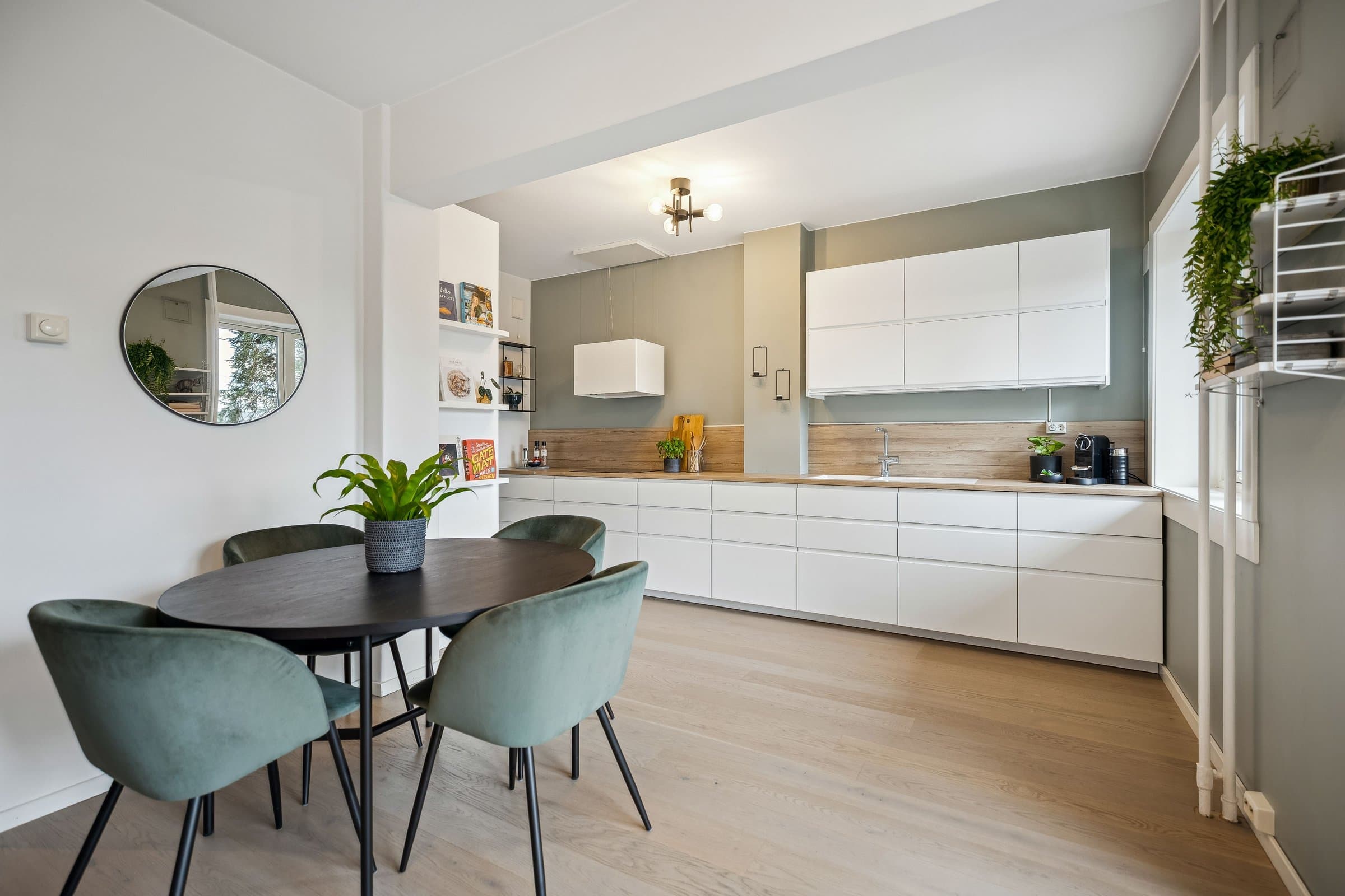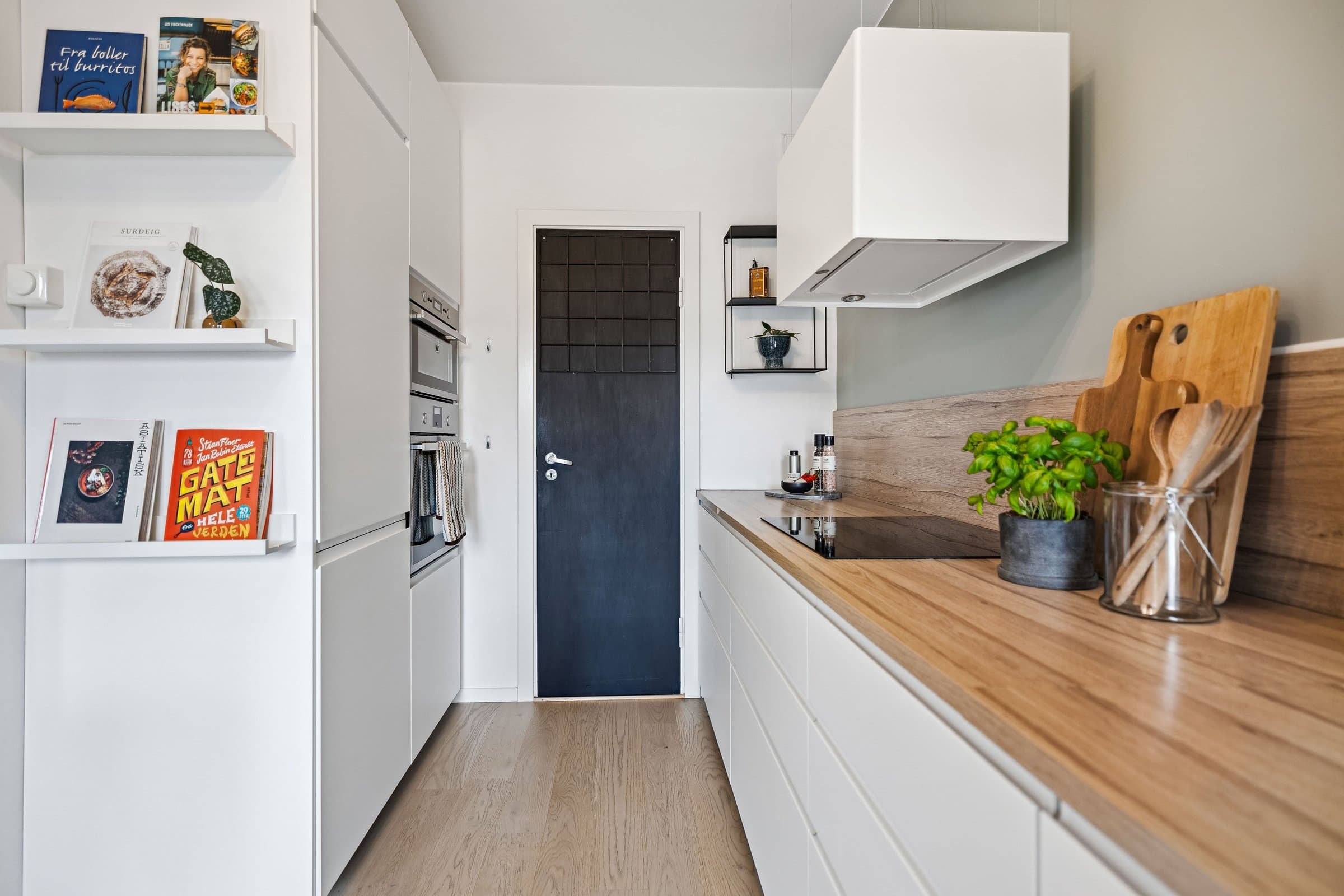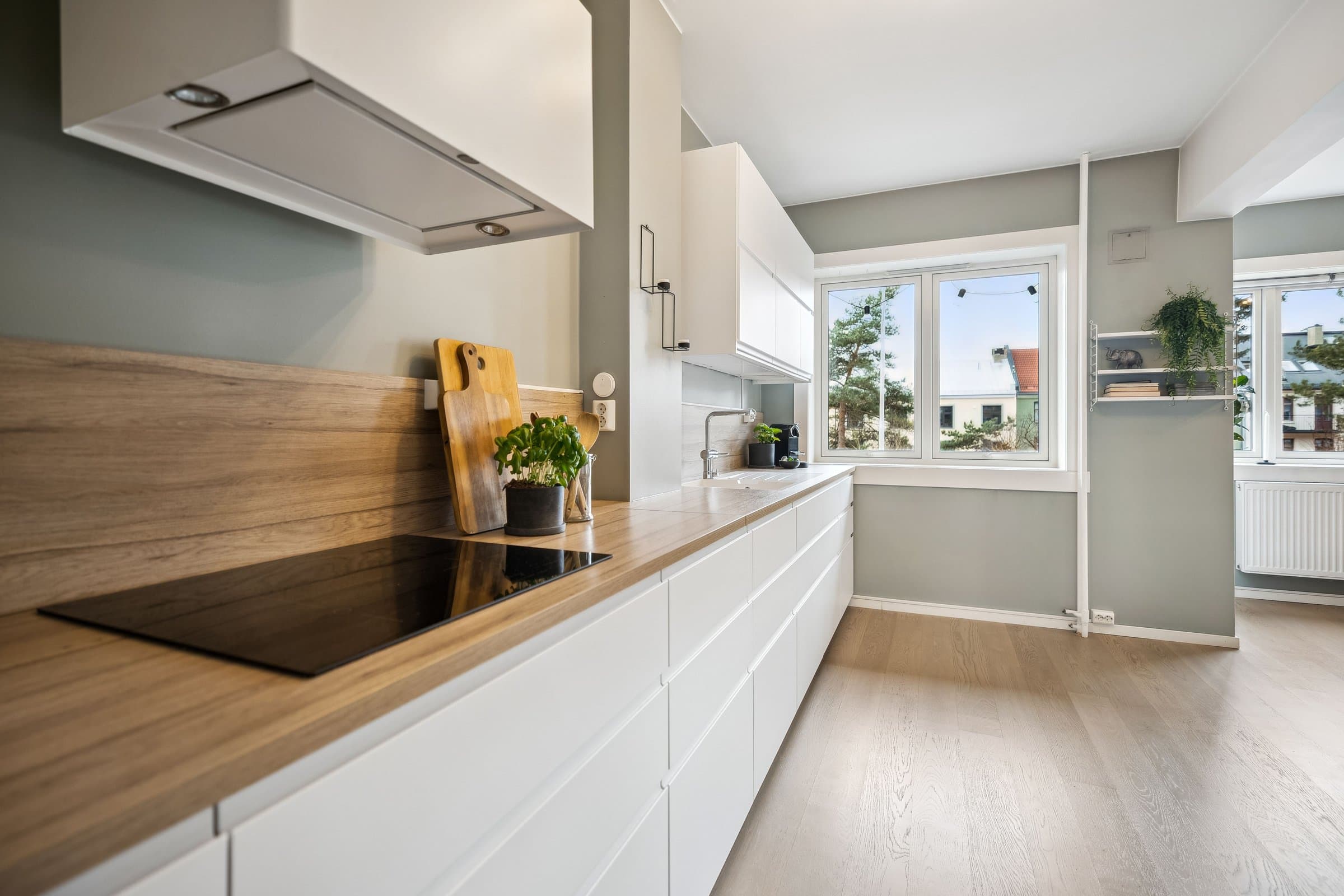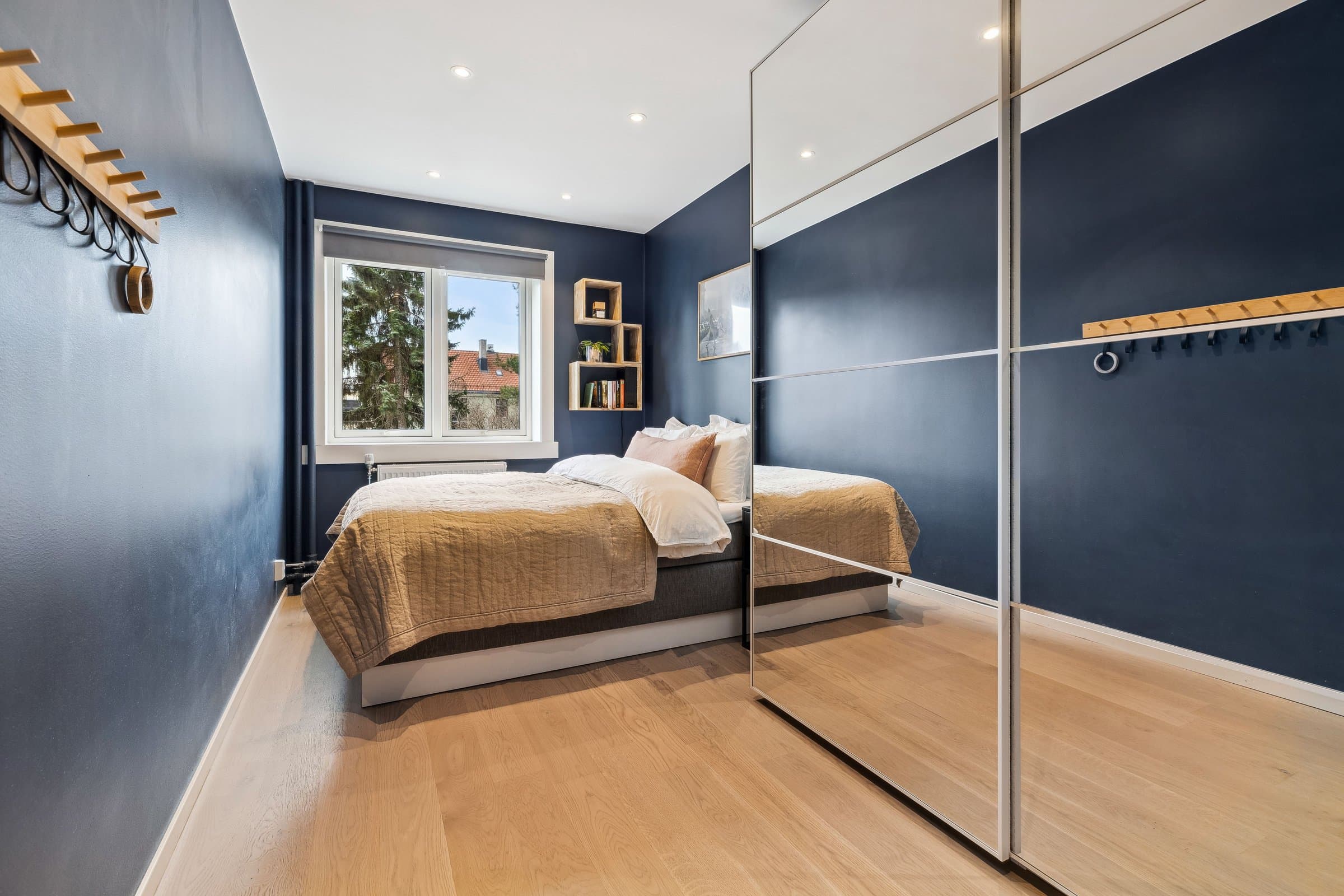 Gang: Innbydende gang med helsparklede og malte vegger, downlights i taket og parkettgulv. Et praktisk kott sørger for god oppbevaring av yttertøy og sko. Stue: Lys og luftig stue med god takhøyde og store vindusflater som slipper inn rikelig med naturlig lys. Stuen har parkettgulv og helsparklede, malte vegger. I 2016 ble veggen mellom kjøkken og stue fjernet for å skape en mer åpen planløsning. Fra stuen er det utgang til en lun, vestvendt balkong på ca. 3,5 kvm. Vinduer, balkongdør og radiatorer ble skiftet i 2016. Kjøkken: Stilrent og moderne kjøkken fra 2016 med glatte fronter og en slitesterk laminert benkeplate med nedsenket oppvaskkum. Integrerte hvitevarer, inkludert kjøl-/fryseskap, oppvaskmaskin, platetopp, mikrobølgeovn og stekeovn. Kjøkkenet er praktisk utformet og har rikelig med benkeplass og gode oppbevaringsmuligheter. I tillegg har du tilgang til en romslig bod med plass til utstyr som for eksempel tørrvarer, store kjeler, vaskeutstyr, støvsuger, fryser. Bad: Lyst og moderne bad, pusset opp i regi av aksjelaget i 2009. I 2024 ble det lagt nye varmekabler og nytt gulv. Badet er innredet med vegghengt toalett, stilren baderomsinnredning med servant, veggskap og et romslig dusjhjørne med elegante glassdører. Det er også opplegg for vaskemaskin. Soverom: Romslig soverom med en lun og behagelig stemning. Her er det helsparklede og malte vegger, downlights i taket og parkettgulv. Gode oppbevaringsmuligheter med et praktisk skyvedørsgarderobe som følger med.
