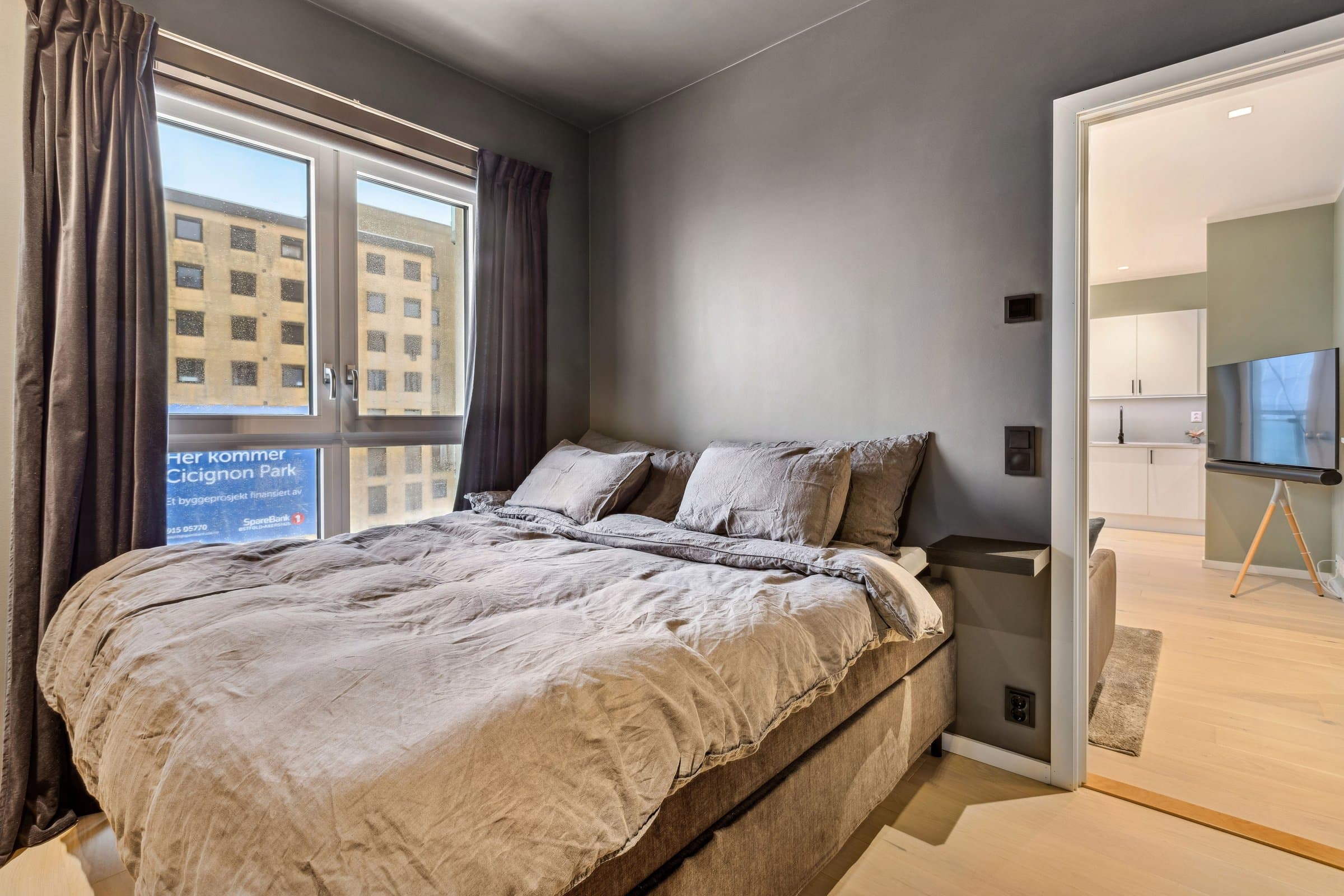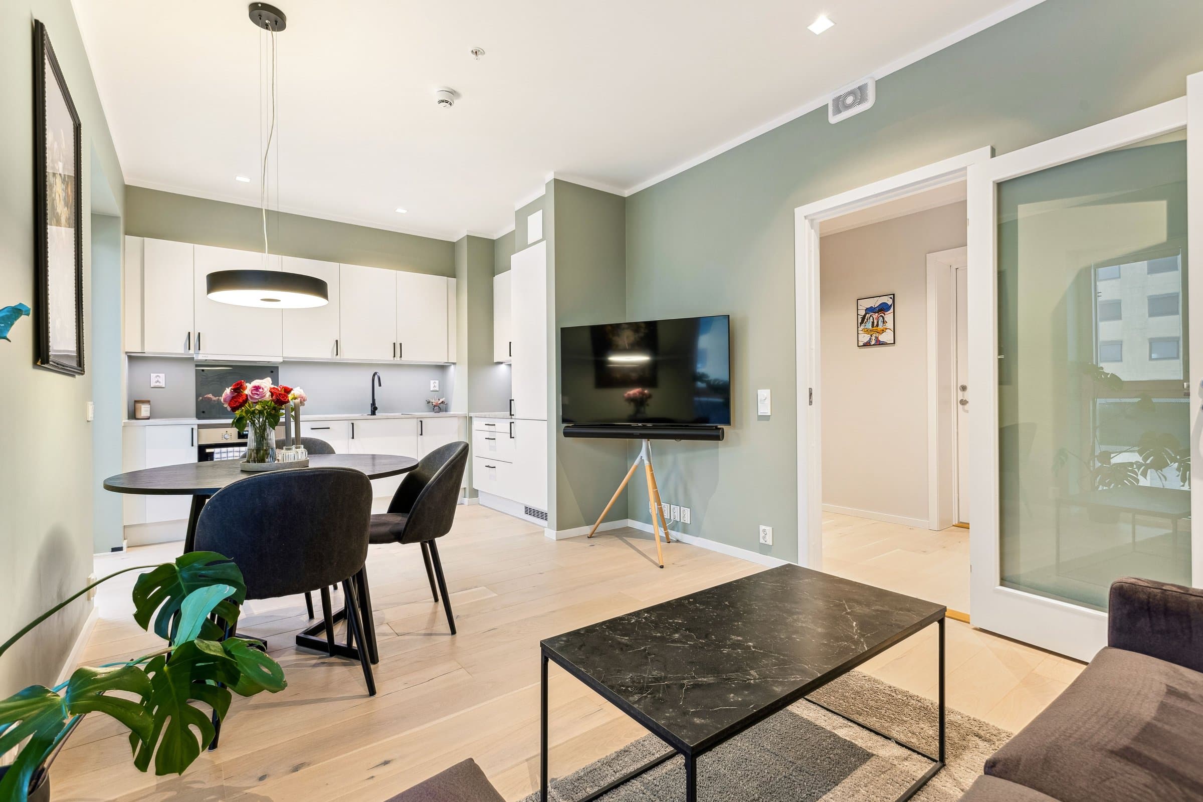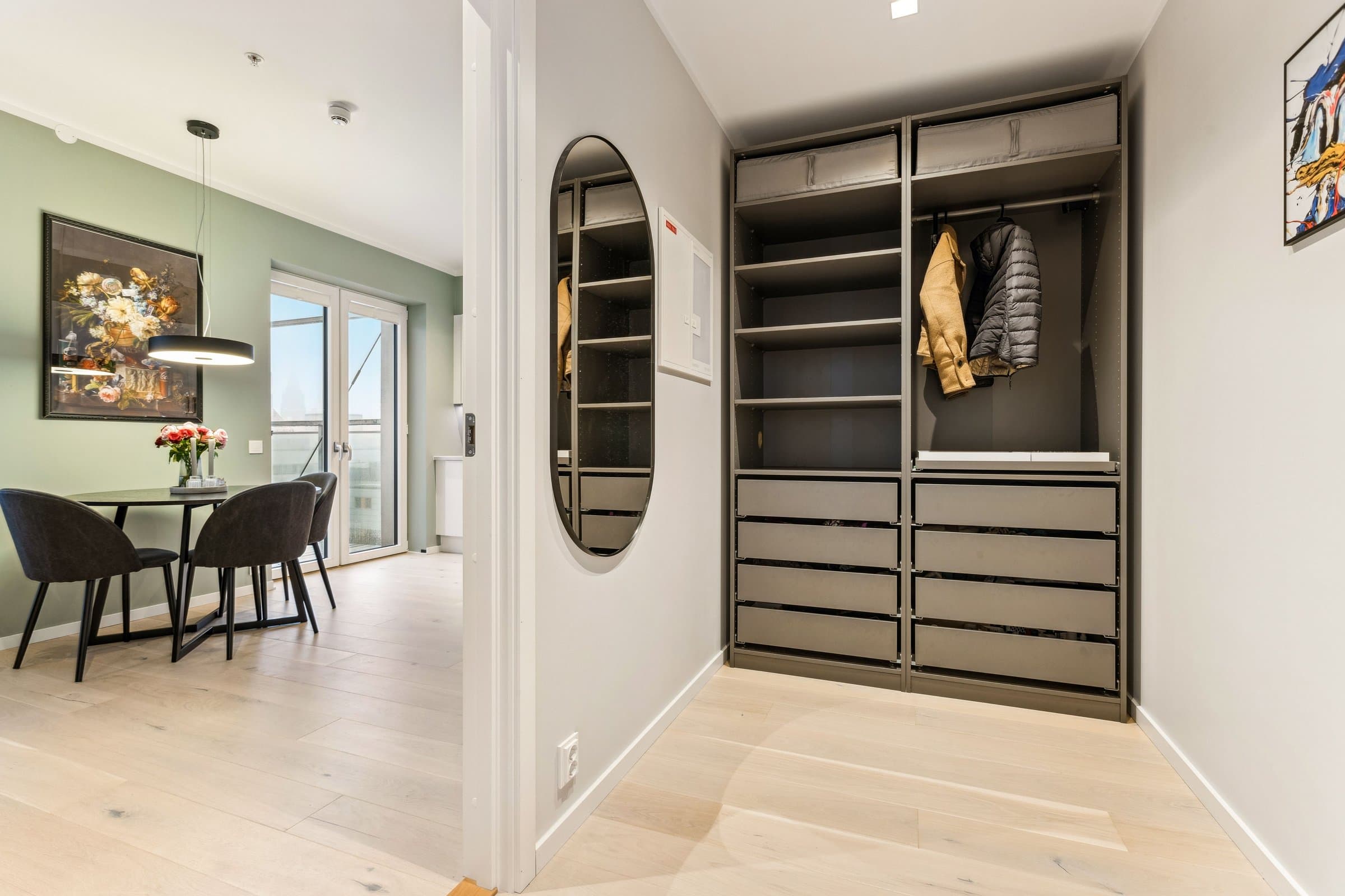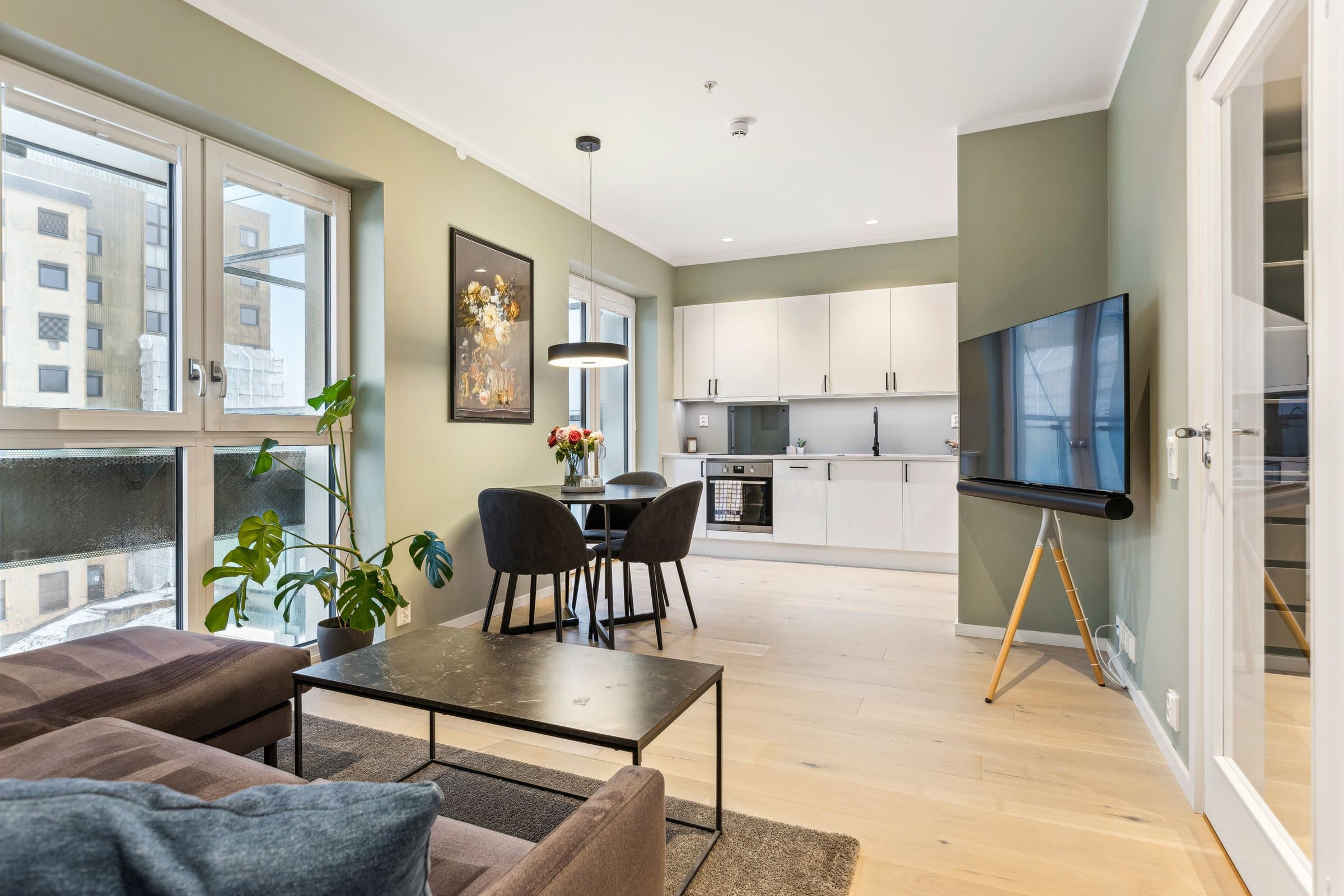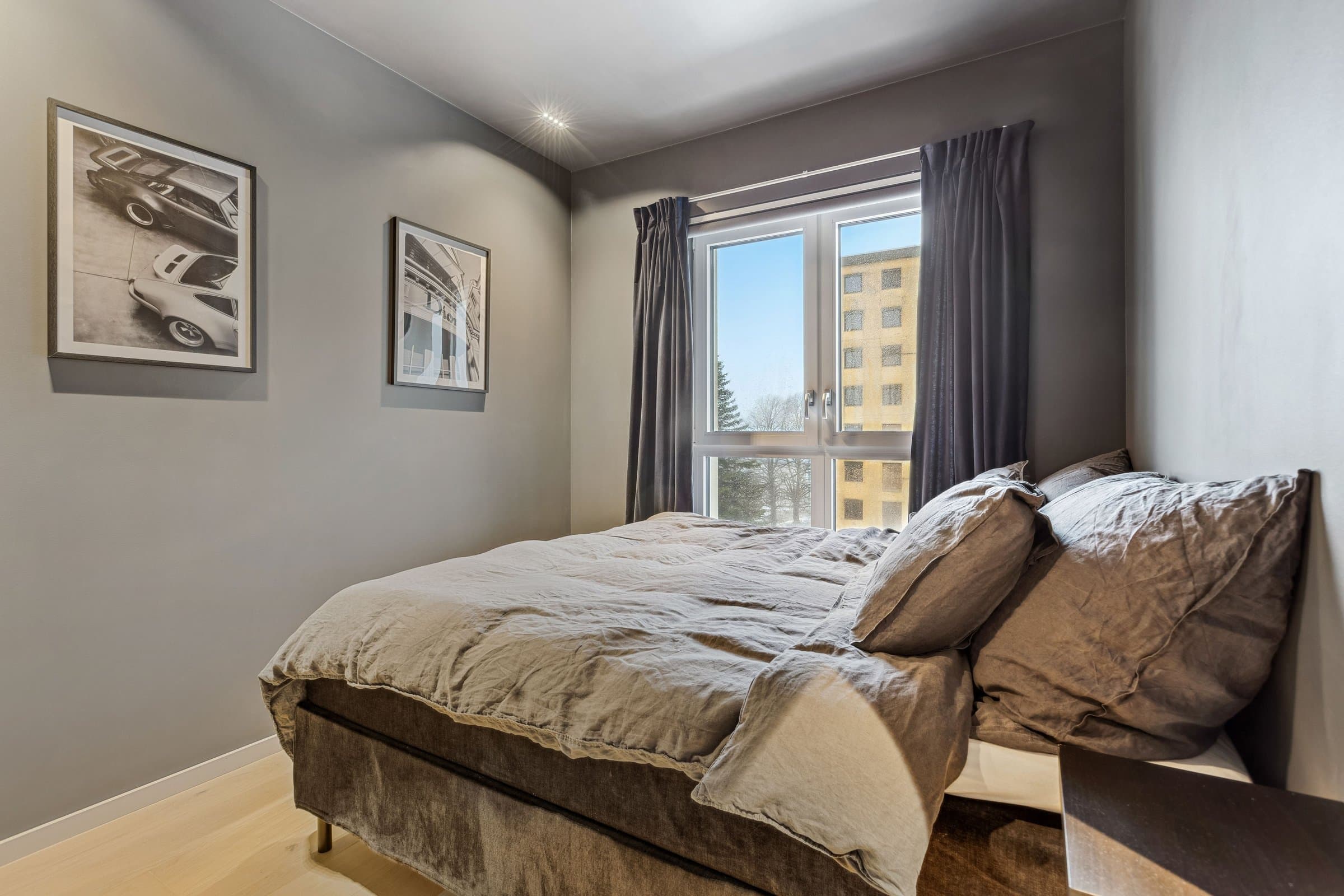 Lys og moderne selveierleilighet med gjennomgående høy standard og smarte løsninger. Boligen er ca. 42 m² og ligger i et nybygg fra 2023, med adkomst via heis til etasjeplan. Planløsningen er svært godt utnyttet, den har en stor gang med en god garderobe og en åpen stue-kjøkkenløsning som gir en sosial og luftig sone, et romslig soverom med garderobeplass, samt et delikat flislagt bad. Ekstra takhøyde på ca. 2,7 meter og store vindusflater sørger for en lys og luftig atmosfære i alle rom. Kjøkkenet er levert av kvalitetsleverandøren HTH og har et stilrent design med integrerte hvitevarer, god skapplass og praktisk utforming for matlaging. Stuen er lettmøblert og innbydende, med plass til både sofagruppe og spisebord. Hele leiligheten har vannbåren gulvvarme med termostater i hvert rom og badet har varmekabler, som gir jevn og behagelig varme året rundt. Baderommet holder høy standard med moderne grå fliser, vegghengt toalett, dusjhjørne med innfellbare glassdører og stilren baderomsinnredning. Her er det naturligvis også gulvvarme, som sørger for komfort på kalde morgener. Leiligheten er i tillegg oppgradert med flere gjennomtenkte tilvalg som øker bokomforten ytterligere. Det er montert ekstra downlights og belysningspunkter for optimal lyssetting, samt oppgradering av stikkontakter enn standard. Noen av vinduene har innvendige screens som gir effektiv solskjerming og bidrar til et behagelig inneklima på varme dager. Fra kjøkkenet har man utgang til en hyggelig balkong på ca. 5 m². Balkongen fungerer som en forlengelse av kjøkkenet og egner seg perfekt for å nyte morgenkaffen eller en avslappende stund utendørs. Til leiligheten følger også en egen sportsbod i kjelleren, ideell for lagring av sykler, ski og annet fritidsutstyr. For beboere med bil er det mulighet for leie av parkeringsplass i byggets garasjeanlegg, slik at man enkelt kan parkere trygt og tørt året rundt.