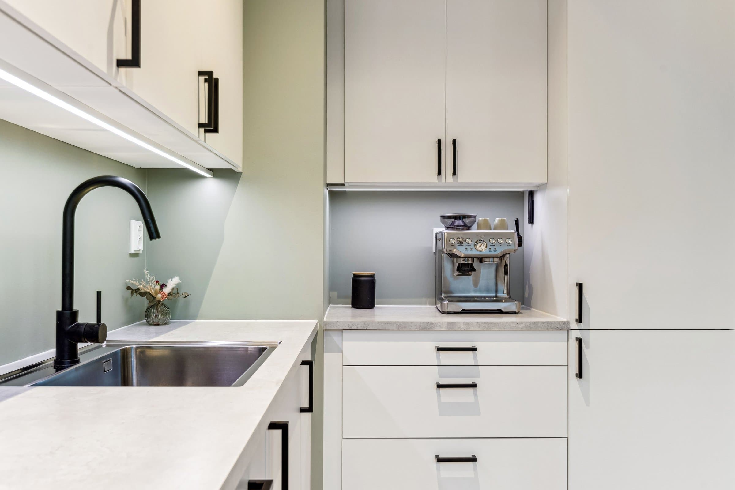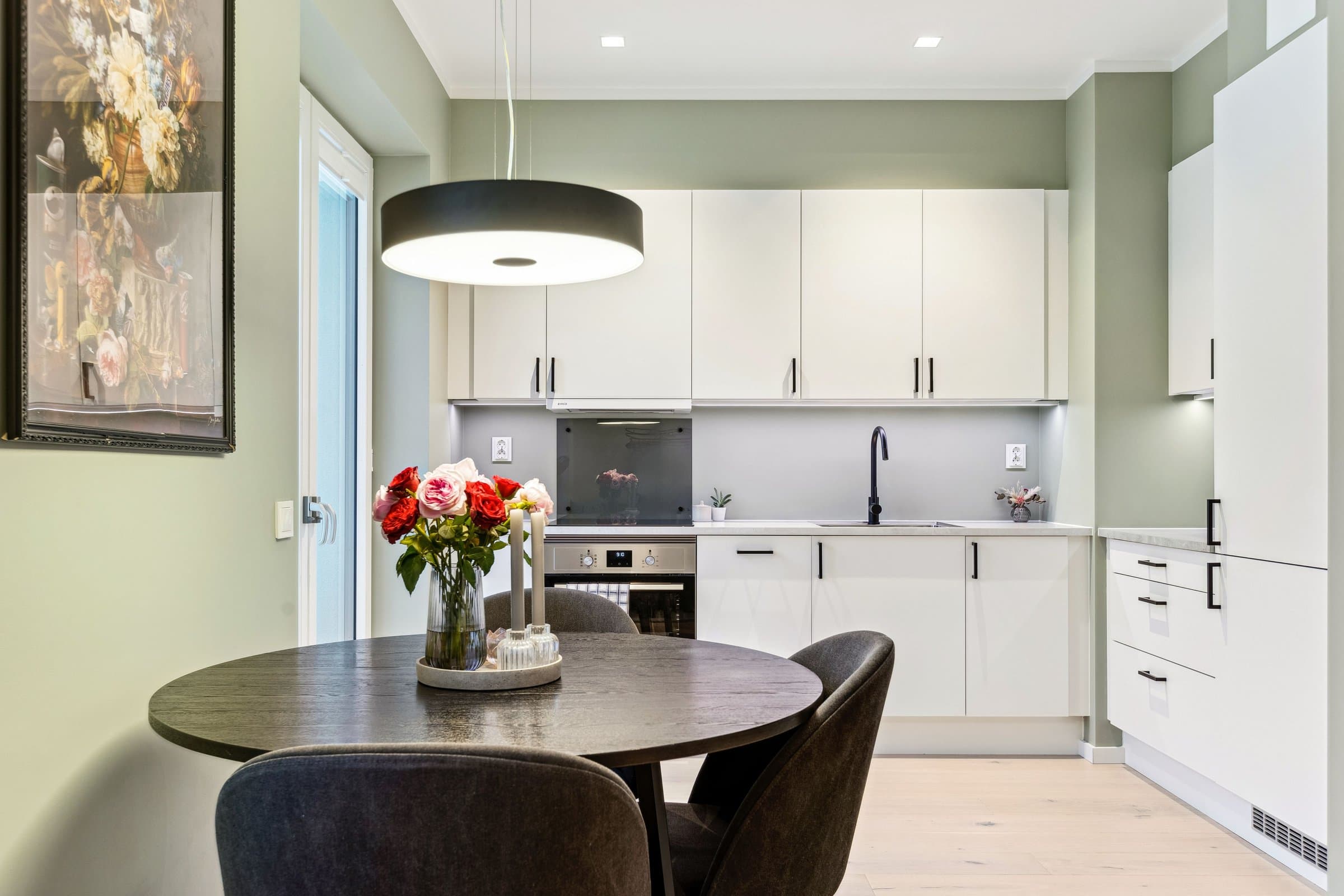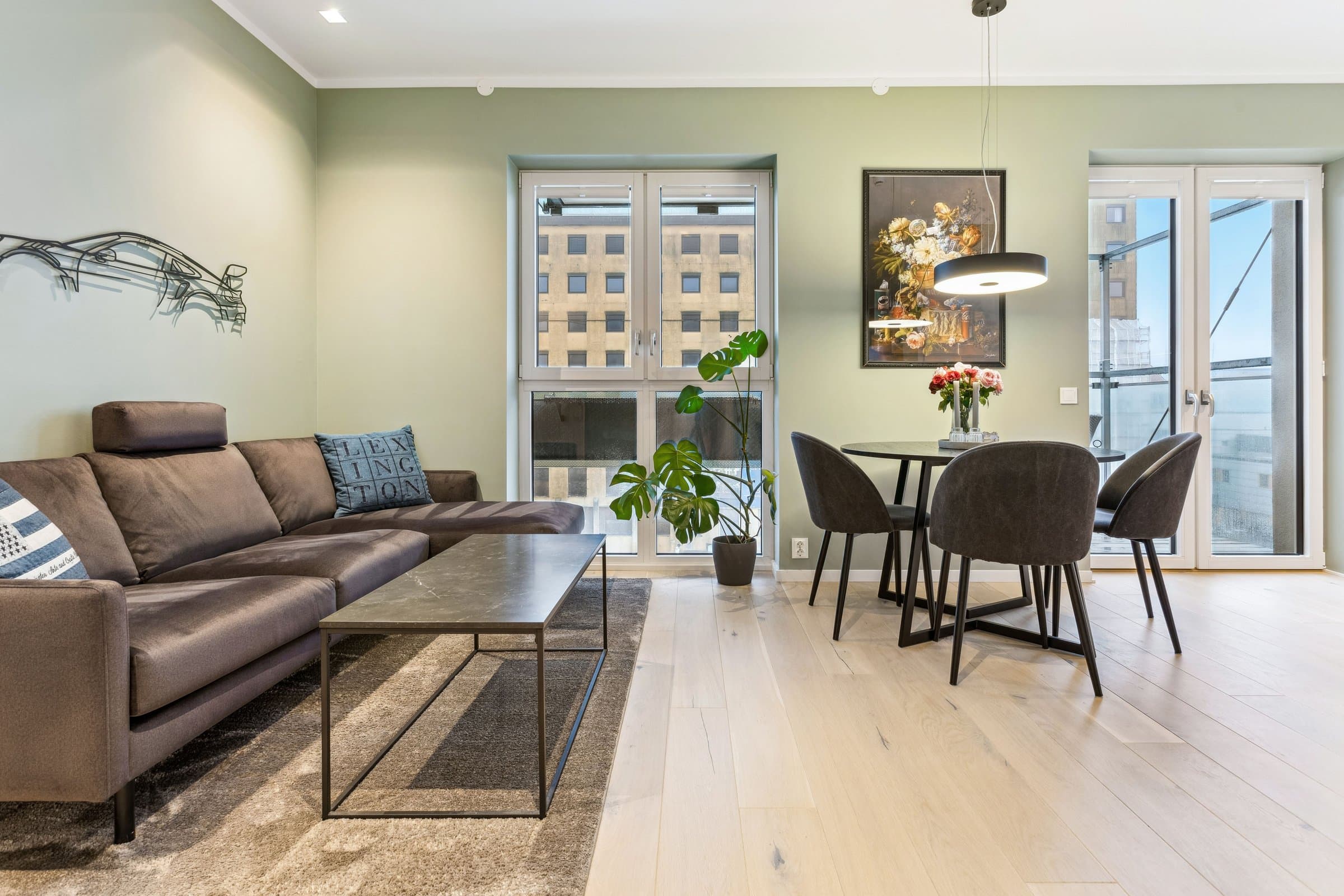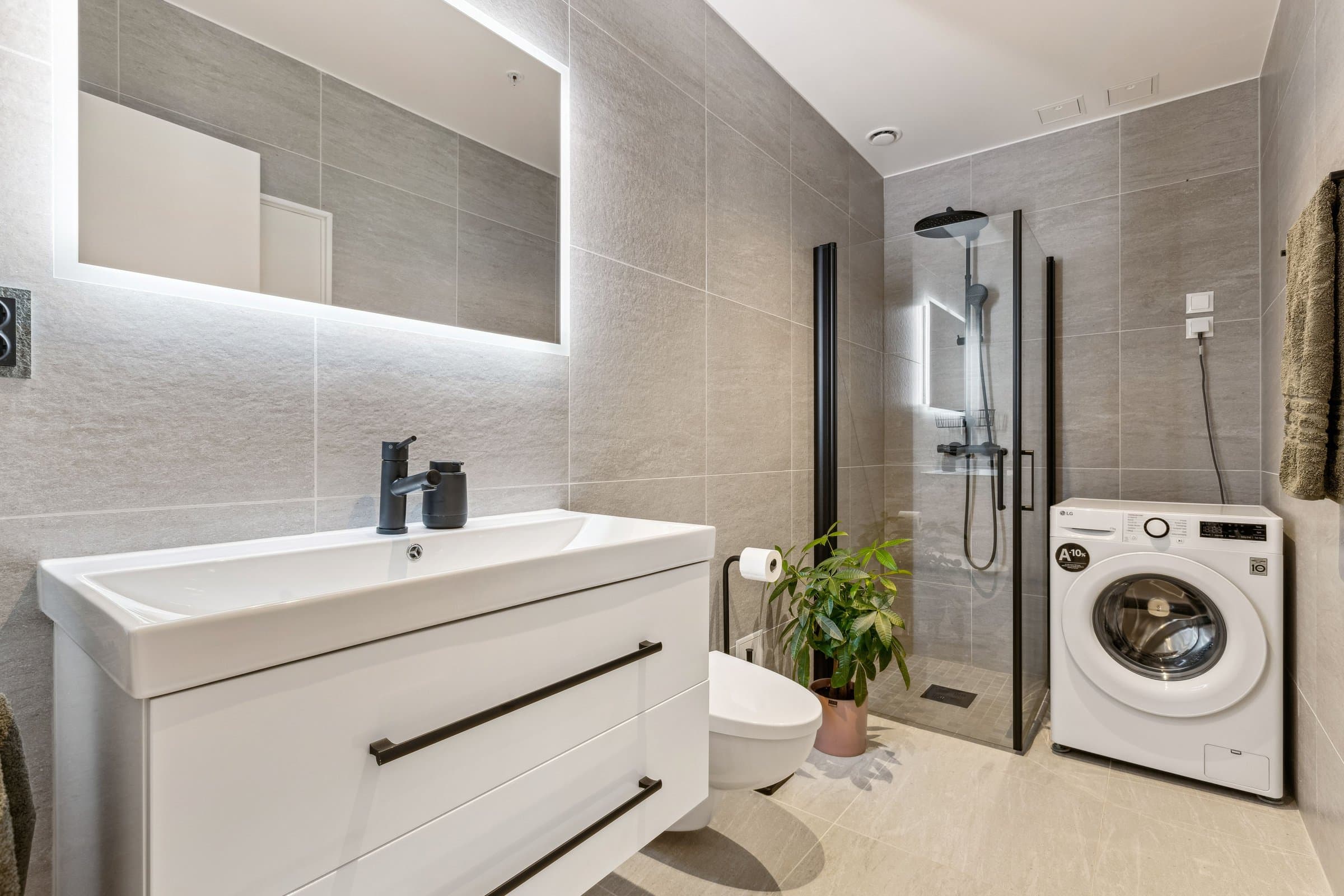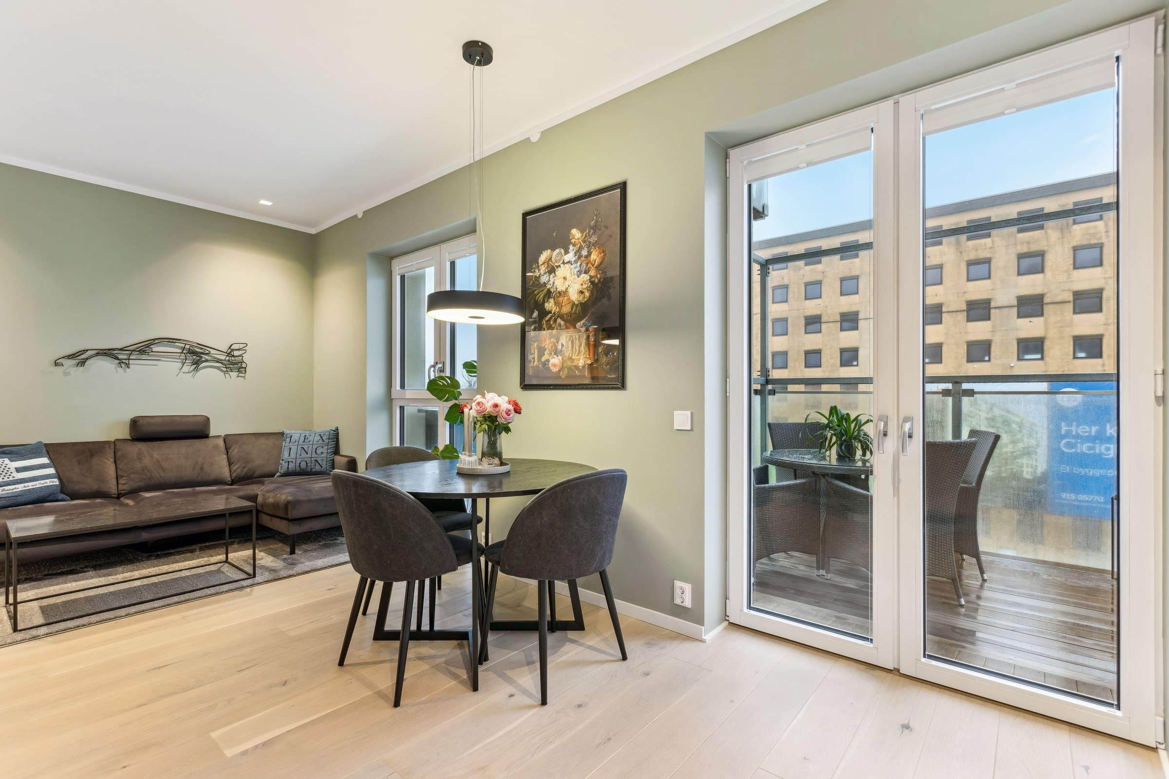 Lys og moderne selveierleilighet med gjennomgående høy standard og smarte løsninger. Boligen er ca. 42 m² og ligger i et nybygg fra 2023, med adkomst via heis til etasjeplan. Planløsningen er svært godt utnyttet, den har en stor gang med en god garderobe og en åpen stue-kjøkkenløsning som gir en sosial og luftig sone, et romslig soverom med garderobeplass, samt et delikat flislagt bad. Ekstra takhøyde på ca. 2,7 meter og store vindusflater sørger for en lys og luftig atmosfære i alle rom. Kjøkkenet er levert av kvalitetsleverandøren HTH og har et stilrent design med integrerte hvitevarer, god skapplass og praktisk utforming for matlaging. Stuen er lettmøblert og innbydende, med plass til både sofagruppe og spisebord. Hele leiligheten har vannbåren gulvvarme med termostater i hvert rom og badet har varmekabler, som gir jevn og behagelig varme året rundt. Baderommet holder høy standard med moderne grå fliser, vegghengt toalett, dusjhjørne med innfellbare glassdører og stilren baderomsinnredning. Her er det naturligvis også gulvvarme, som sørger for komfort på kalde morgener. Leiligheten er i tillegg oppgradert med flere gjennomtenkte tilvalg som øker bokomforten ytterligere. Det er montert ekstra downlights og belysningspunkter for optimal lyssetting, samt oppgradering av stikkontakter enn standard. Noen av vinduene har innvendige screens som gir effektiv solskjerming og bidrar til et behagelig inneklima på varme dager. Fra kjøkkenet har man utgang til en hyggelig balkong på ca. 5 m². Balkongen fungerer som en forlengelse av kjøkkenet og egner seg perfekt for å nyte morgenkaffen eller en avslappende stund utendørs. Til leiligheten følger også en egen sportsbod i kjelleren, ideell for lagring av sykler, ski og annet fritidsutstyr. For beboere med bil er det mulighet for leie av parkeringsplass i byggets garasjeanlegg, slik at man enkelt kan parkere trygt og tørt året rundt.