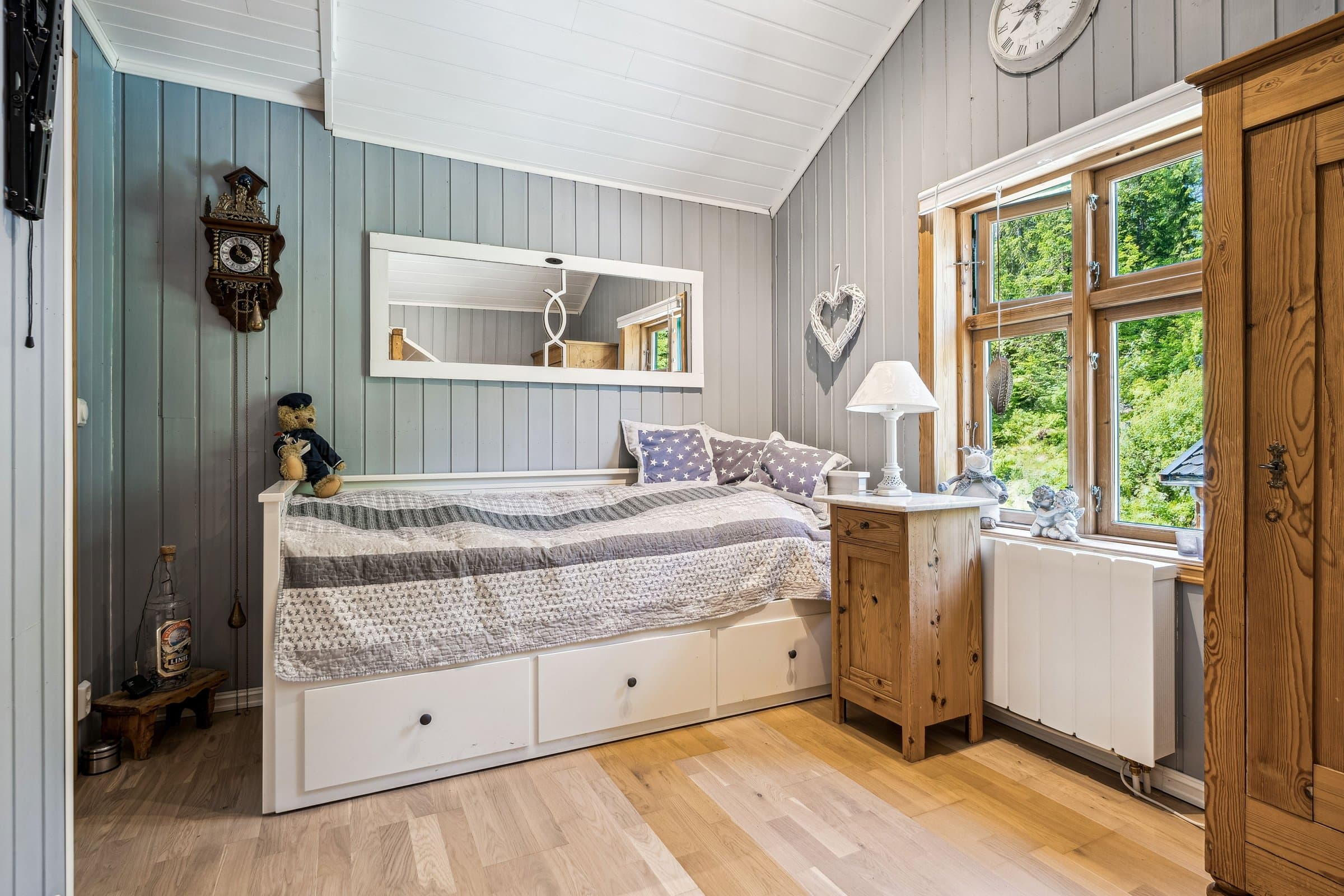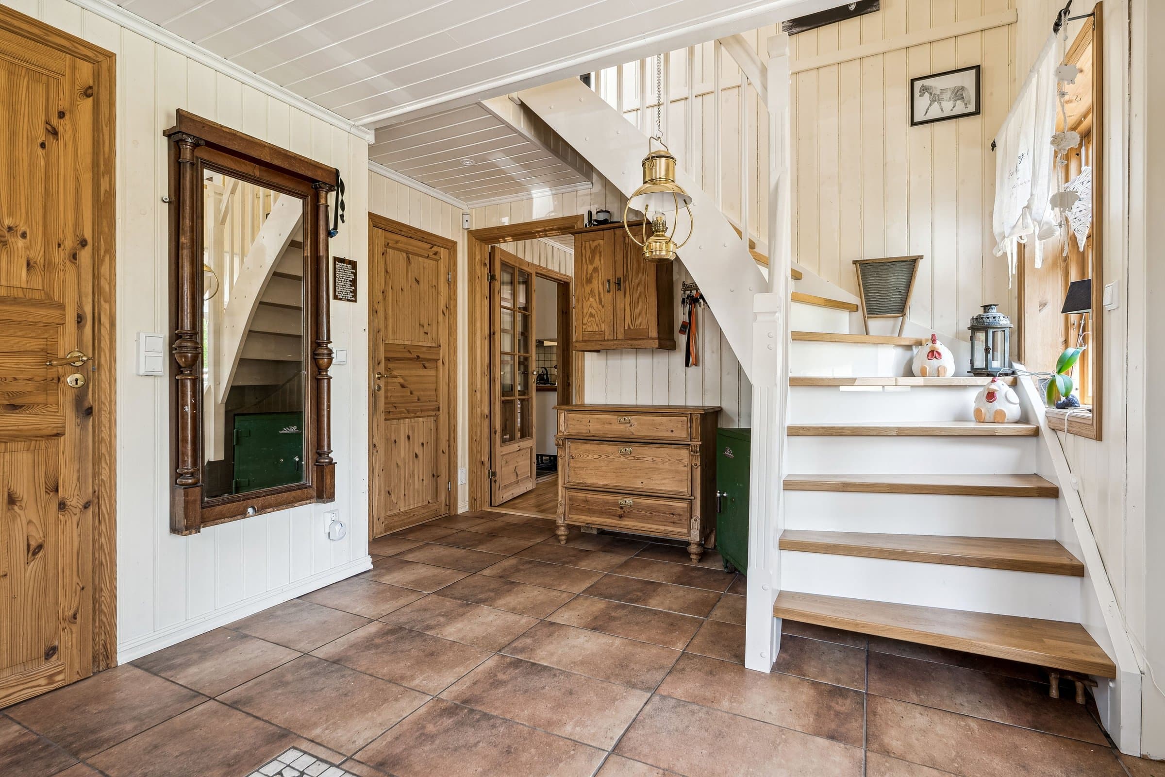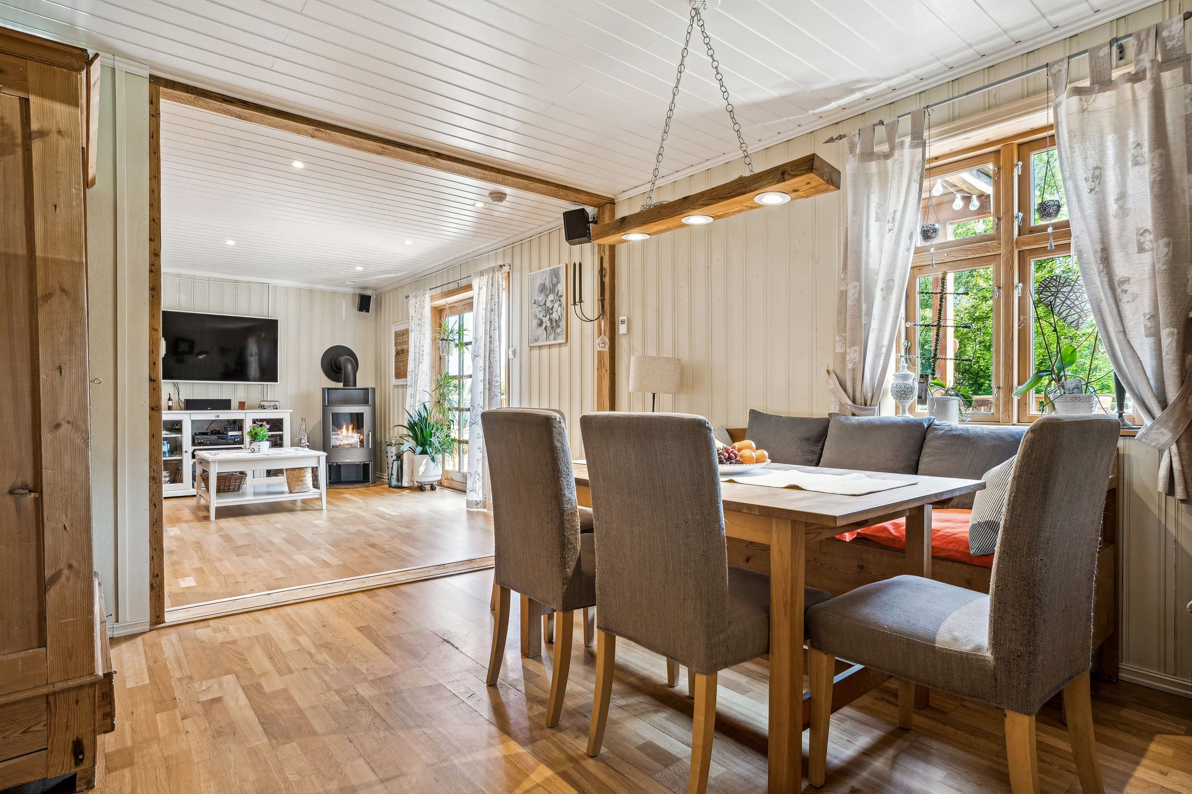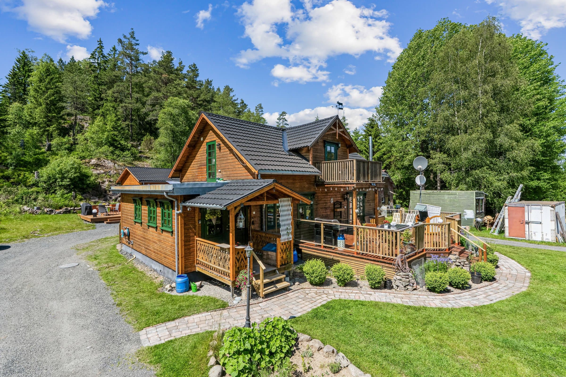 Med tungt hjerte selger vi drømmestedet våres som ligger i midten av naturen, 160 moh. Huset er fra 1913 og ble total rehabilitert fra 2006 til 2018. Boligen inneholder: 1.etasje: gang, bad, garderobe, spisestue, kjøkken, vaskerom, stue, soverom 2.etasje: gang, bad, garderobe, 2 soverom I 1.etasje er det vannbåren gulvvarme i alle rom, i 2.etasje er det viftekonvektorer. Oppvarming skjer med pelletskjele eller vedovn med vannkappe i stua. Fra våren til høsten kommer varmen fra 3 solfanger. Teknisk rom med pelletskjele ble oppført i 2017. I tillegg finnes et uthus fra 2013 på 41m2 med bad, 2 soverom og stue, en låve på ca. 64m2, en stor garasje på 44 m2 fra 2022 med 2 port (det ene porten er 3,50 høy) med løftebukk til bil, pluss en liten anneks og en brakke. Stor hage omringet av trær inkludert grønnsakshage med drivhus og en koselig bålplass.