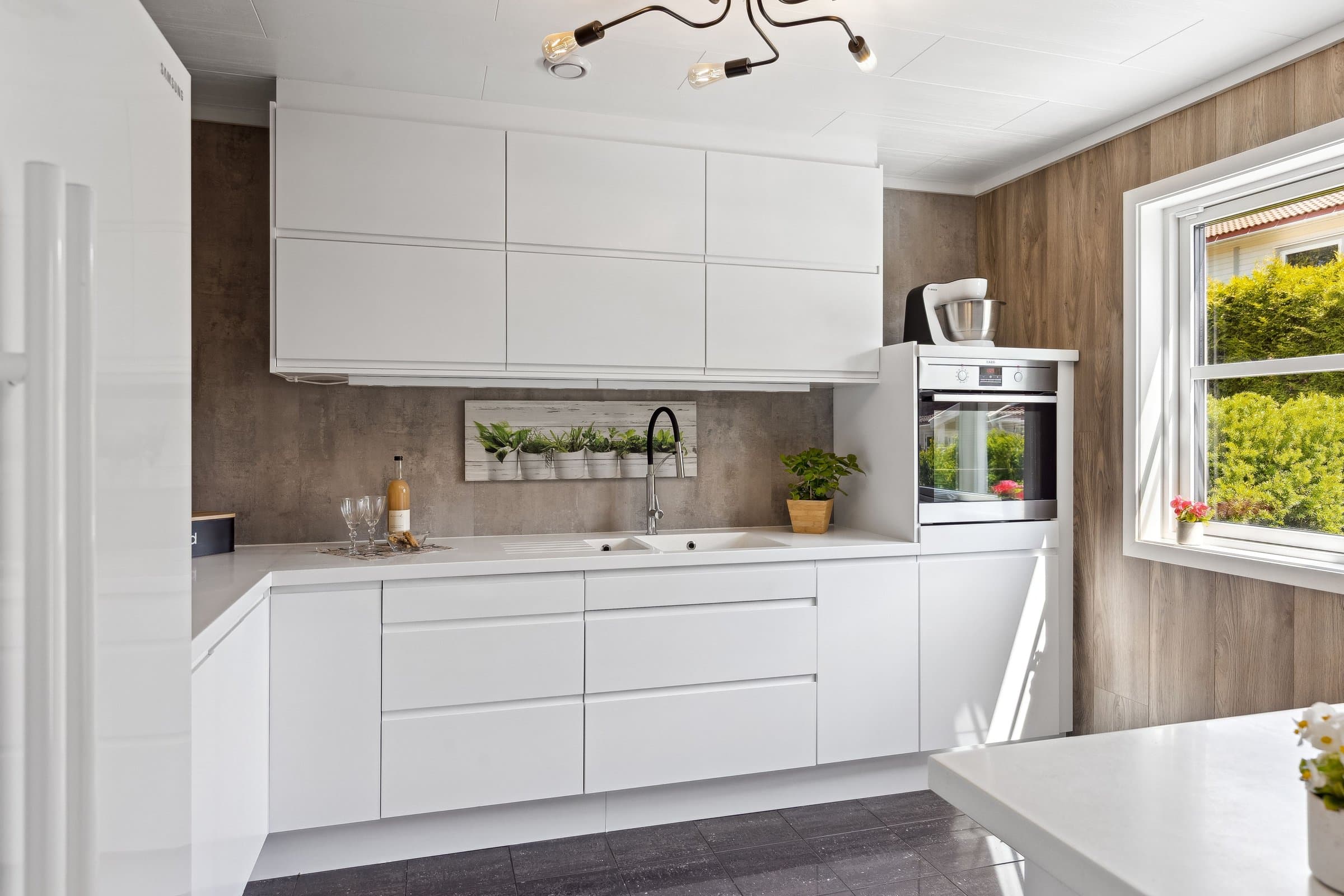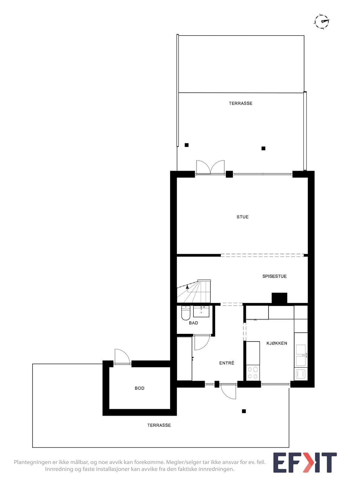 Vertikaldelt bolig over 2 plan på støpt plate på mark. Kledd med liggende dobbelfals kledning Saltak med betongtakstein Innhold. 1.etasje: Entré, kjøkken, stue med utgang til terrasse og hage, samt separat toalett. 2.etasje: Trappegang, tre soverom, kombinert bad/vaskerom, liten bod og tilgang til kaldloft. Standard. Oppgradert og modernisert vertikaldelt tomannsbolig med gjennomtenkt planløsning over to etasjer. Etter omfattende tiltak er boligen nå klassifisert i energiklasse B. Innvendige overflater. • Gulv: Fliser og parkett • Vegger: pynte parkett, fliser, Gips og malte plater • Himlinger: Takess og gips Stue. Romslig stue/spisestue med utgang til 24 kvm terrasse med delvis takoverbygg og gode solforhold. Kjøkken. Moderne Epoq kjøkken med integrerte hvitevarer. Kompositt benkeplate med innfelt kum. Side by side kjøleskap med vann og isbitmaskin. Vann stoppekran med fukt-sensor. Bad. Fliser med gulvvarme, dusjkabinett med badekar, dobbel servantskap og speil. Toalett. Separat WC med vask på hovedplan.