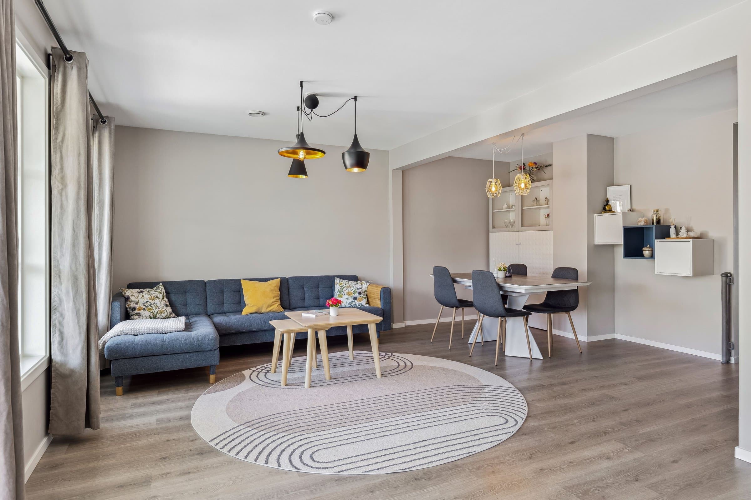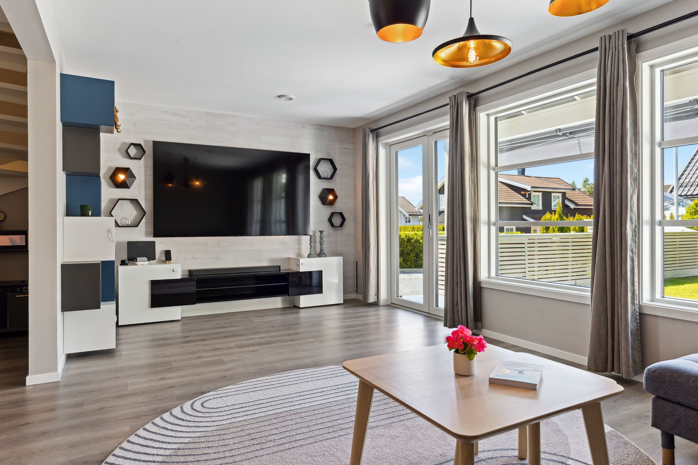 Oppvarming: Varmepumpe med app-styring. Flexit balansert ventilasjon med varmegjenvinning. Programmerbare Varmekabler i 1. etasje og bad i 2. etasje. Smart panelovner.