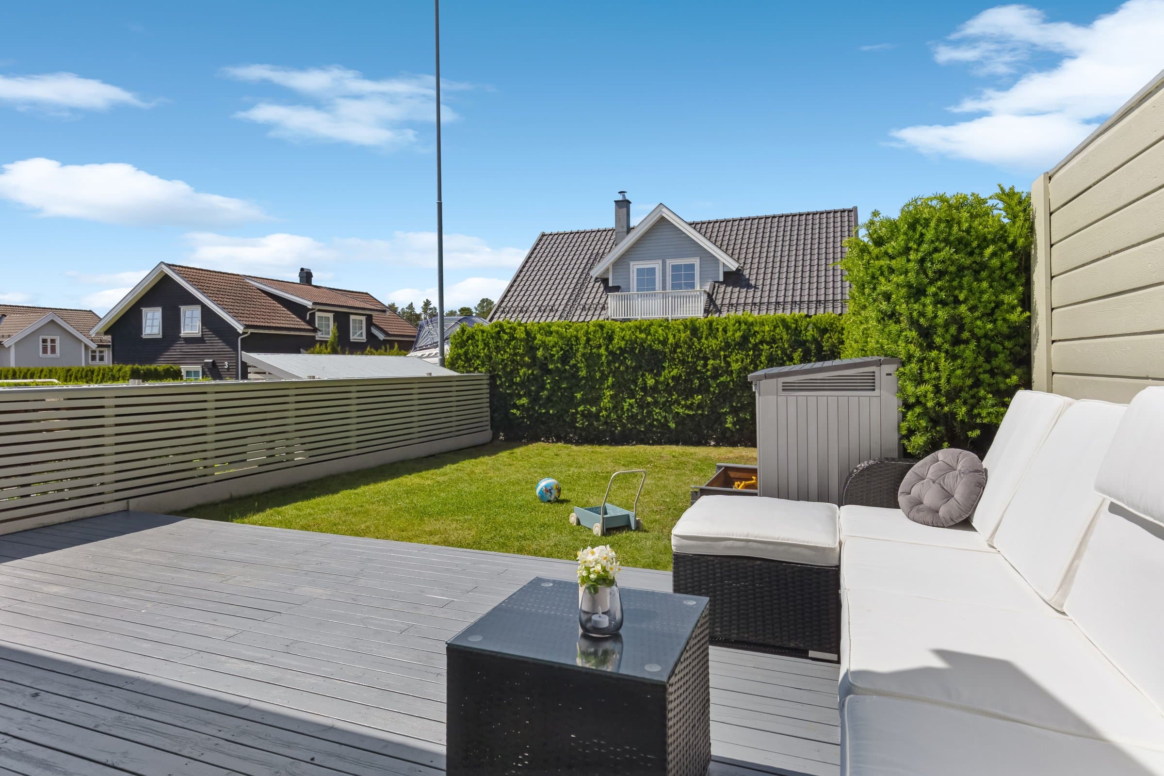 Tomt og parkering Tomt på 312,9 m². Lettstelt og velholdt hage med plen og gruset gårdsplass, ny kantstein og grus lagt i 2024. To terrasser (ca50kvm). Solskjerming med LED-lys montert i 2024. Parkering i carport og på egen gruset gårdsplass.