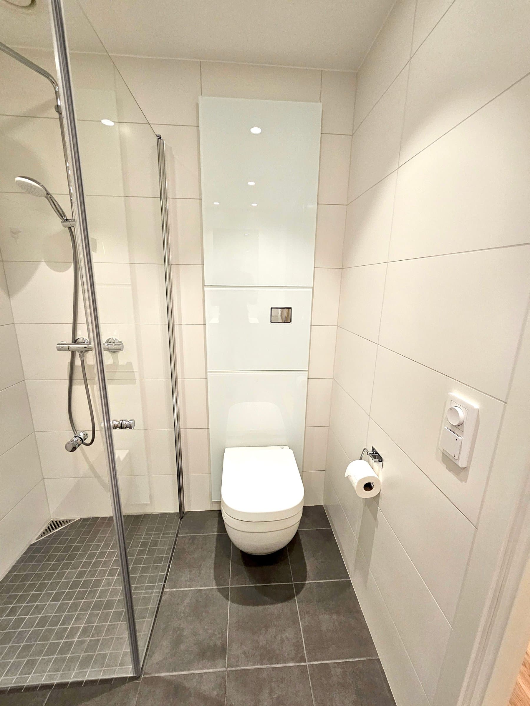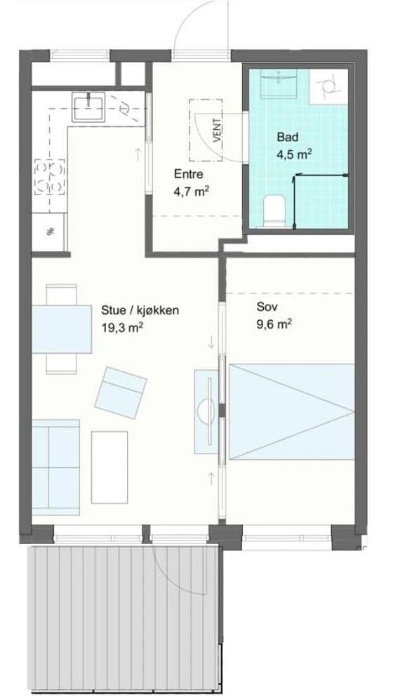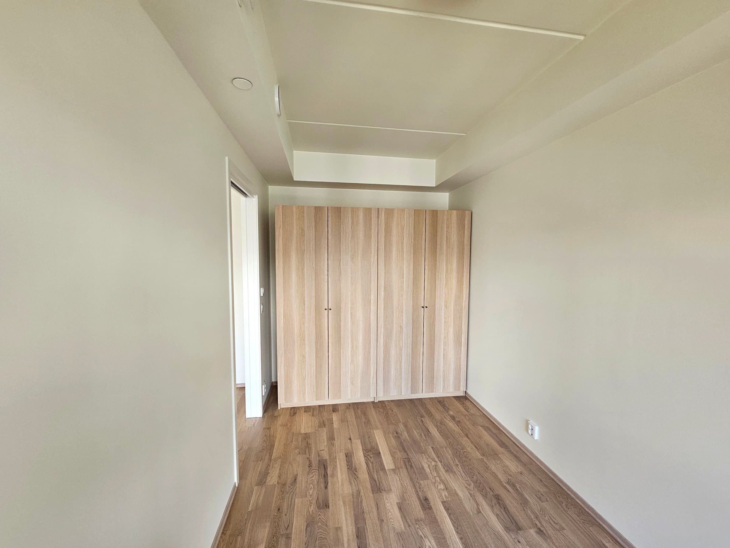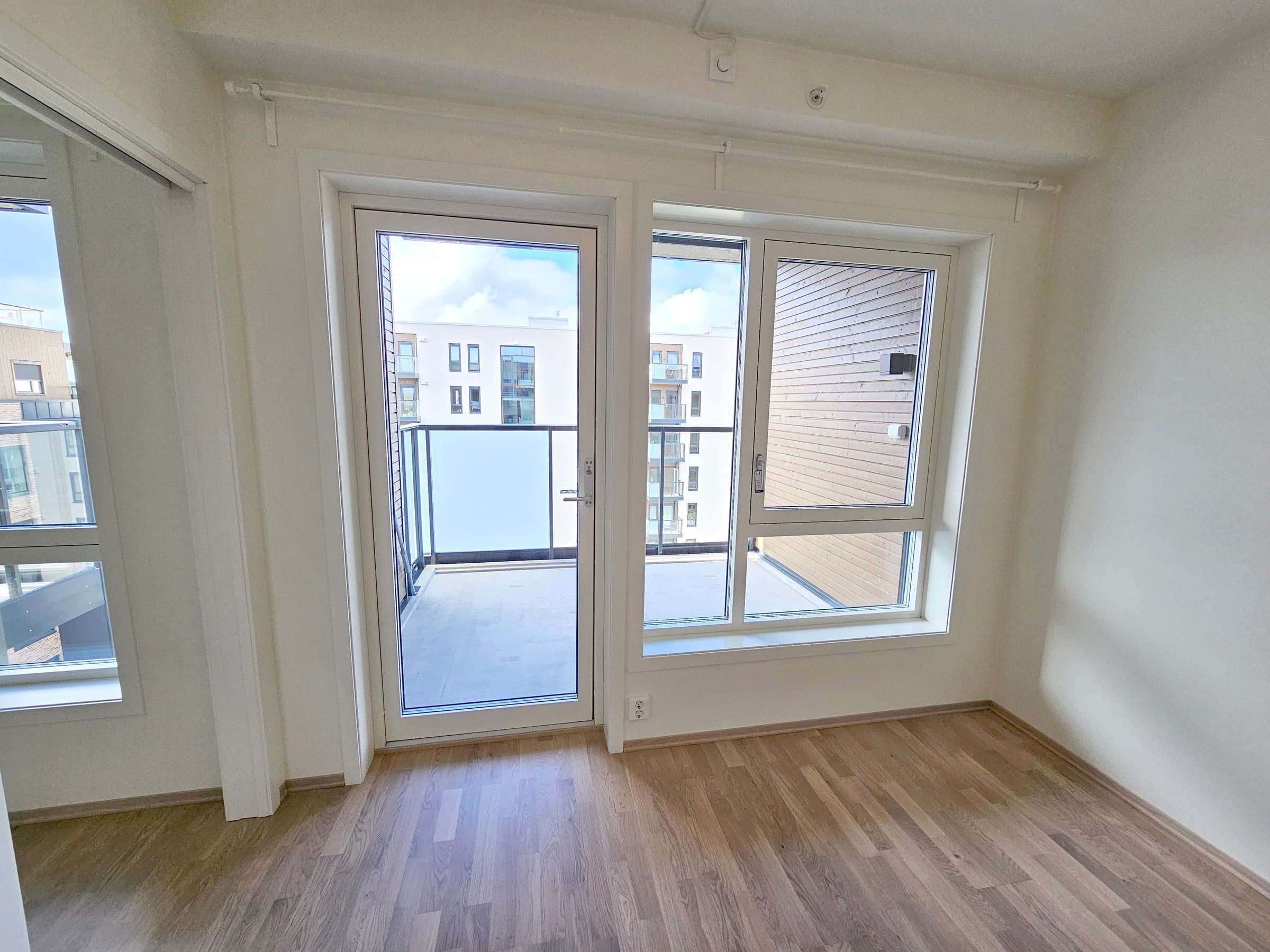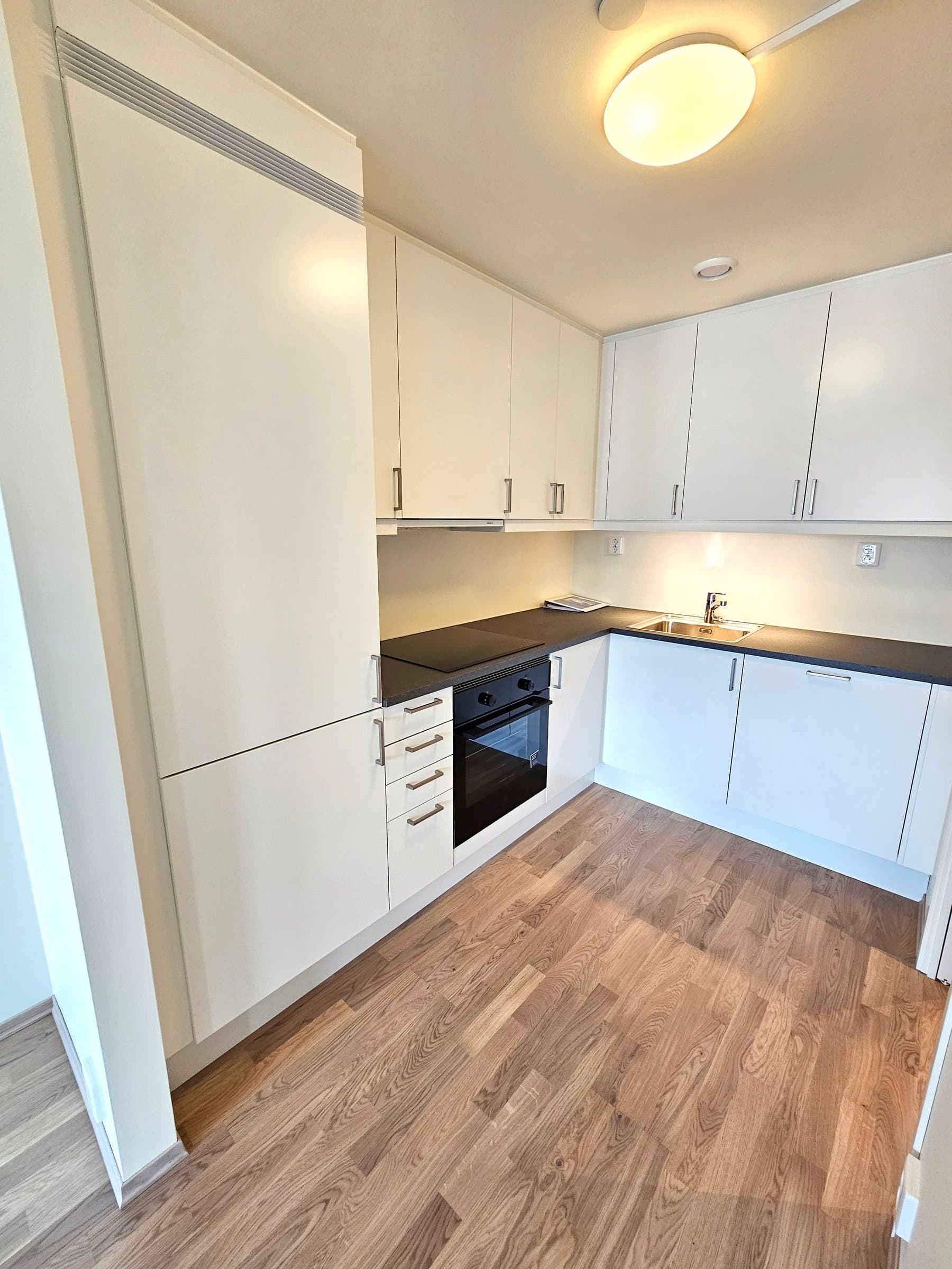 ENTRE (4,7 m2): Entre med tilgang til bad og kjøkken. Gangen har god plass til yttertøy mm. Benk med oppbevaringsplass, speil på vegg, samt praktisk oppheng for klær medfølger. Gulv: 14 mm 3-stavs parkett i eik med hvit mattlakk. BAD (4,5 m2): Flislagt med hvite veggfliser og grå gulvfliser. Servantskap med speil over servant. Servant er nedfelt i plate. Ett-greps servantbatteri. Vegghengt toalett i hvitt porselen med dempesete samt dusjbatteri med dusjgarnityr. Rette dusjvegger i glass. Dusjsone er nedsenket med ca. en flistykkelse. Det er avsatt plass, og opplegg for vaskemaskin og tørketrommel på badet. SOVEROM (9,6 m2): Soverom med inngang fra 2 sider (skyvedører). PAX Garderobeskap fra Ikea (2 m), hvor innredning enkelt kan komplementeres og tilpasses. Gulv: 14 mm 3-stavs parkett i eik med hvit mattlakk. KJØKKEN: Kjøkkeninnredning fra Sigdal (Type Uno Hvit) med laminat benkeplate med nedfelt rustfri oppvaskkum. Overskapene med høyde ca. 228 cm fra gulv. Det er lysarmatur under overskap. Avtrekkshette av typen volumhette rustfri front. Hvitevarer er inkludert. STUE: Lys stue med god planløsning og utgang til sydvendt balkong med fin utsikt og gode solforhold. Gulv: 14 mm 3-stavs parkett i eik med hvit mattlakk. DIVERSE TEKNISK: Boligen er bygget etter teknisk forskrift TEK 17 og elektrisk norm NEK400:2018. Calling-anlegg med kamera. Balansert ventilasjon med varmegjenvinning. Varmtvann og vannbåren varme fra lokalt varmeanlegg. Heis.