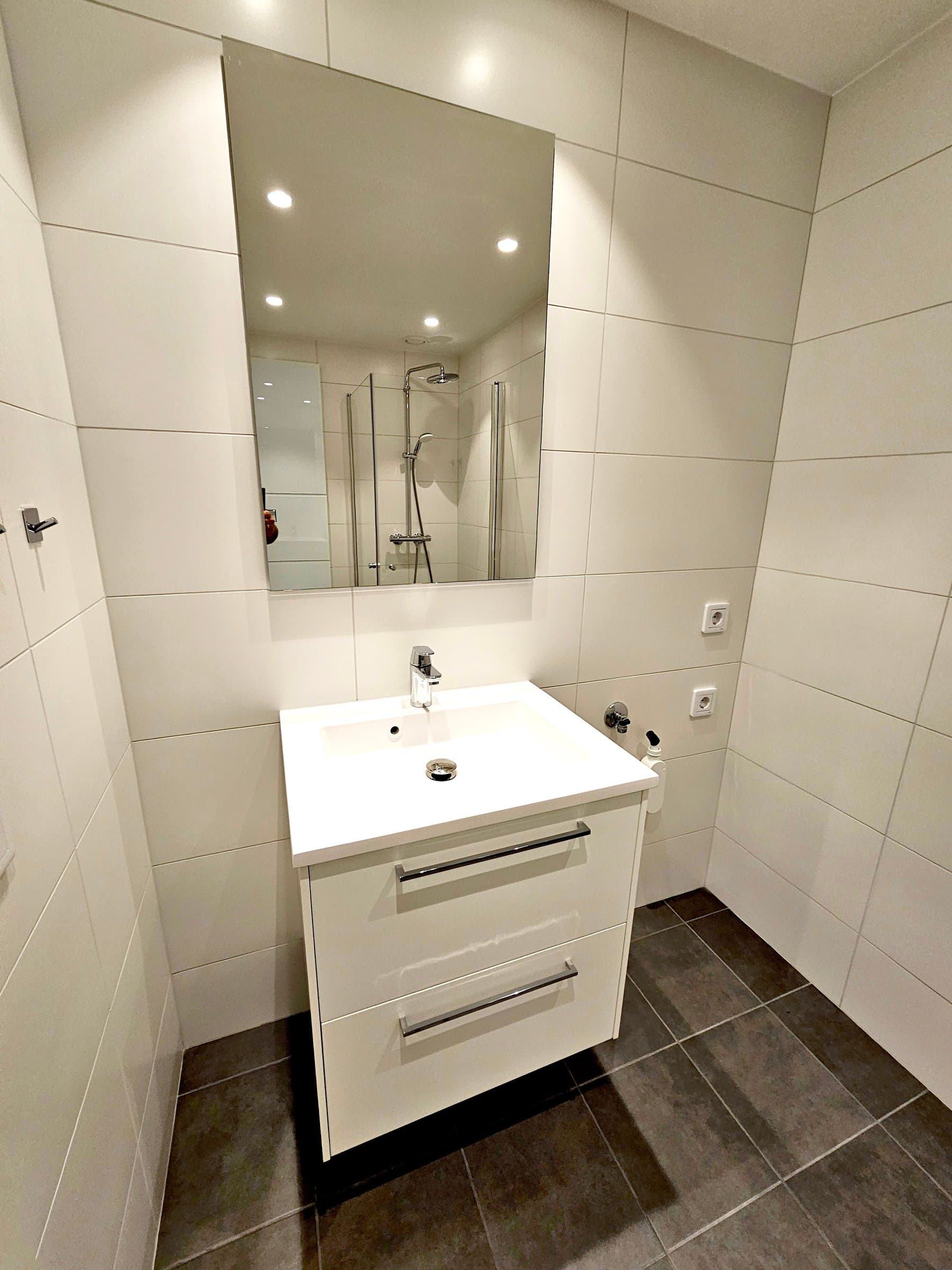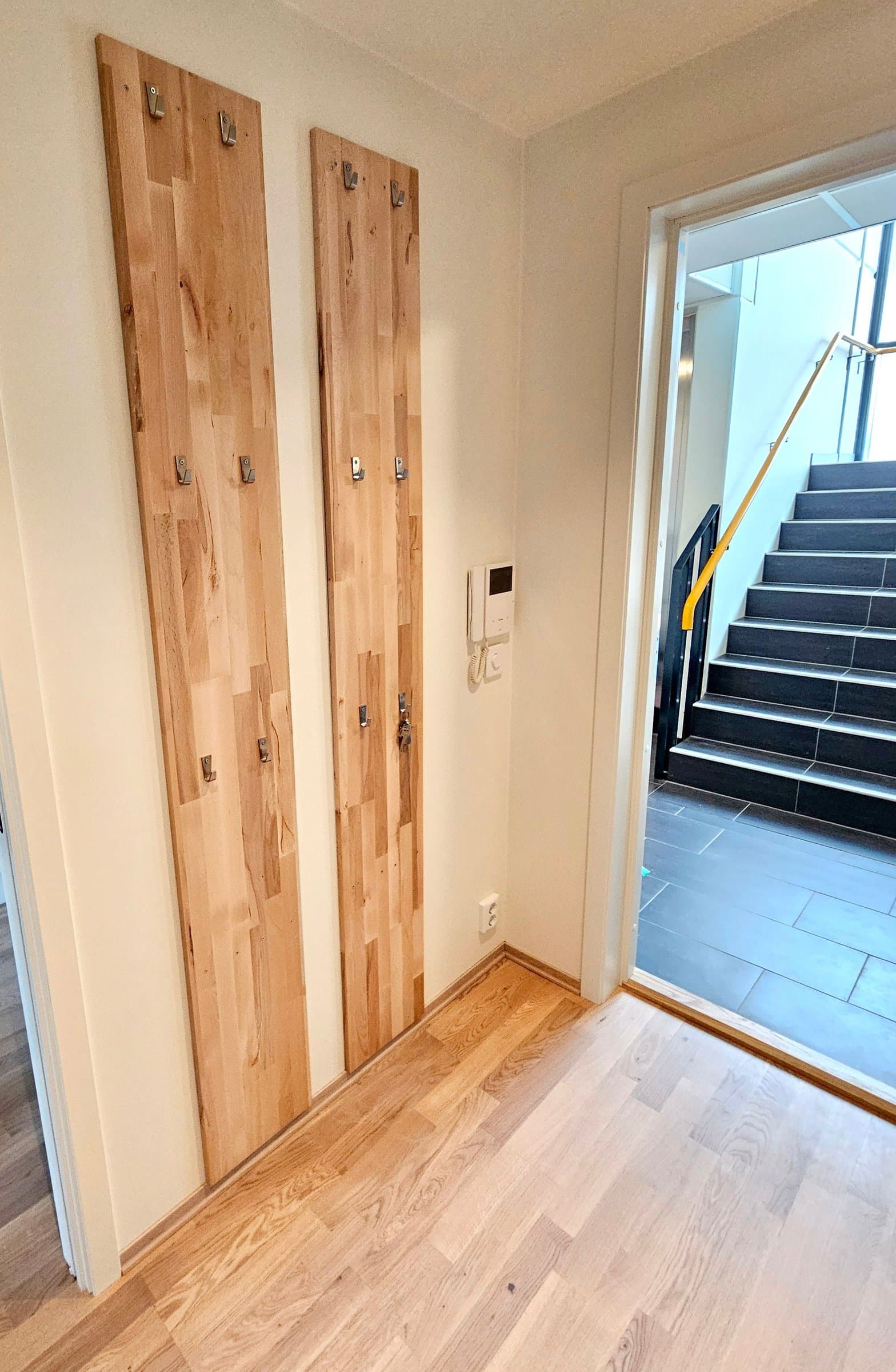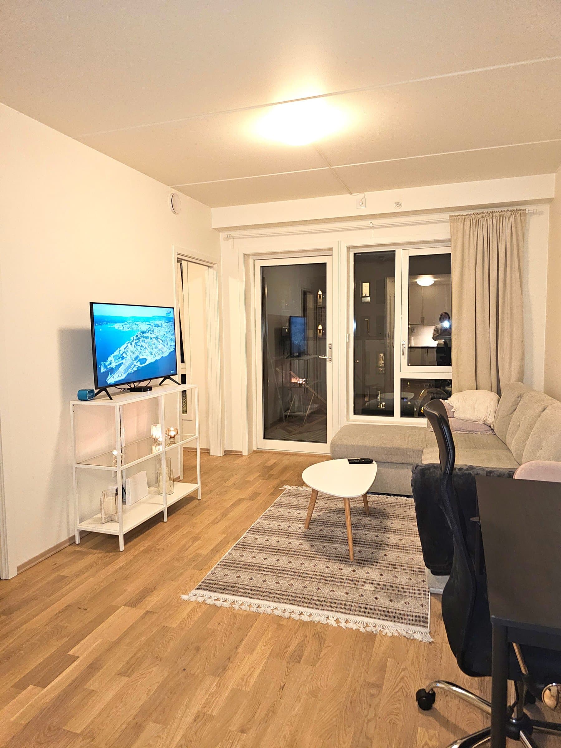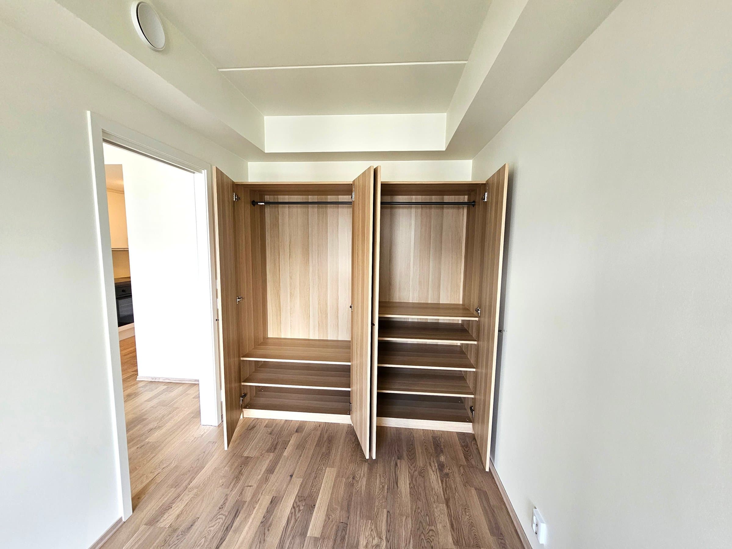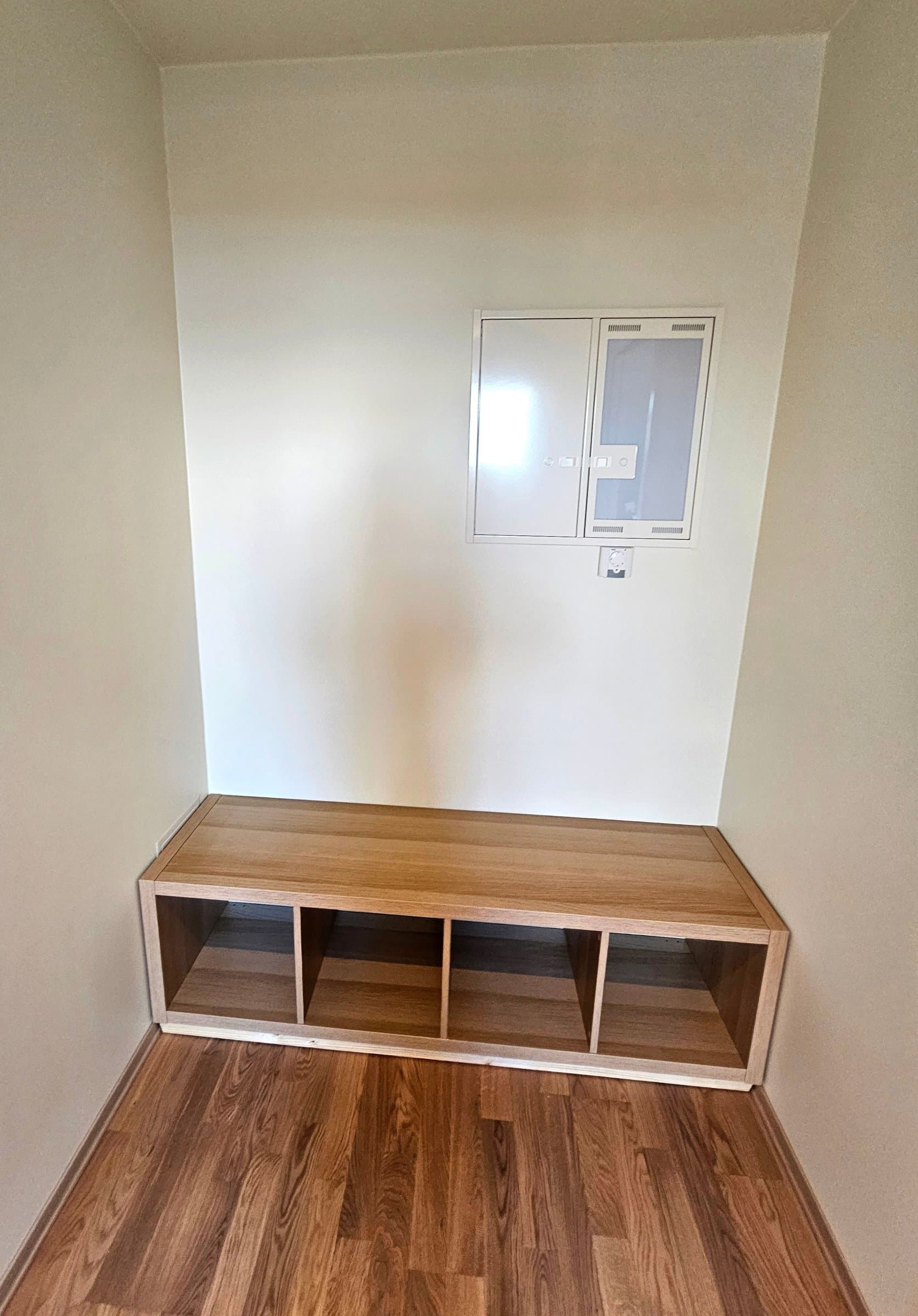ENTRE (4,7 m2): Entre med tilgang til bad og kjøkken. Gangen har god plass til yttertøy mm. Benk med oppbevaringsplass, speil på vegg, samt praktisk oppheng for klær medfølger. Gulv: 14 mm 3-stavs parkett i eik med hvit mattlakk. BAD (4,5 m2): Flislagt med hvite veggfliser og grå gulvfliser. Servantskap med speil over servant. Servant er nedfelt i plate. Ett-greps servantbatteri. Vegghengt toalett i hvitt porselen med dempesete samt dusjbatteri med dusjgarnityr. Rette dusjvegger i glass. Dusjsone er nedsenket med ca. en flistykkelse. Det er avsatt plass, og opplegg for vaskemaskin og tørketrommel på badet. SOVEROM (9,6 m2): Soverom med inngang fra 2 sider (skyvedører). PAX Garderobeskap fra Ikea (2 m), hvor innredning enkelt kan komplementeres og tilpasses. Gulv: 14 mm 3-stavs parkett i eik med hvit mattlakk. KJØKKEN: Kjøkkeninnredning fra Sigdal (Type Uno Hvit) med laminat benkeplate med nedfelt rustfri oppvaskkum. Overskapene med høyde ca. 228 cm fra gulv. Det er lysarmatur under overskap. Avtrekkshette av typen volumhette rustfri front. Hvitevarer er inkludert. STUE: Lys stue med god planløsning og utgang til sydvendt balkong med fin utsikt og gode solforhold. Gulv: 14 mm 3-stavs parkett i eik med hvit mattlakk. DIVERSE TEKNISK: Boligen er bygget etter teknisk forskrift TEK 17 og elektrisk norm NEK400:2018. Calling-anlegg med kamera. Balansert ventilasjon med varmegjenvinning. Varmtvann og vannbåren varme fra lokalt varmeanlegg. Heis.