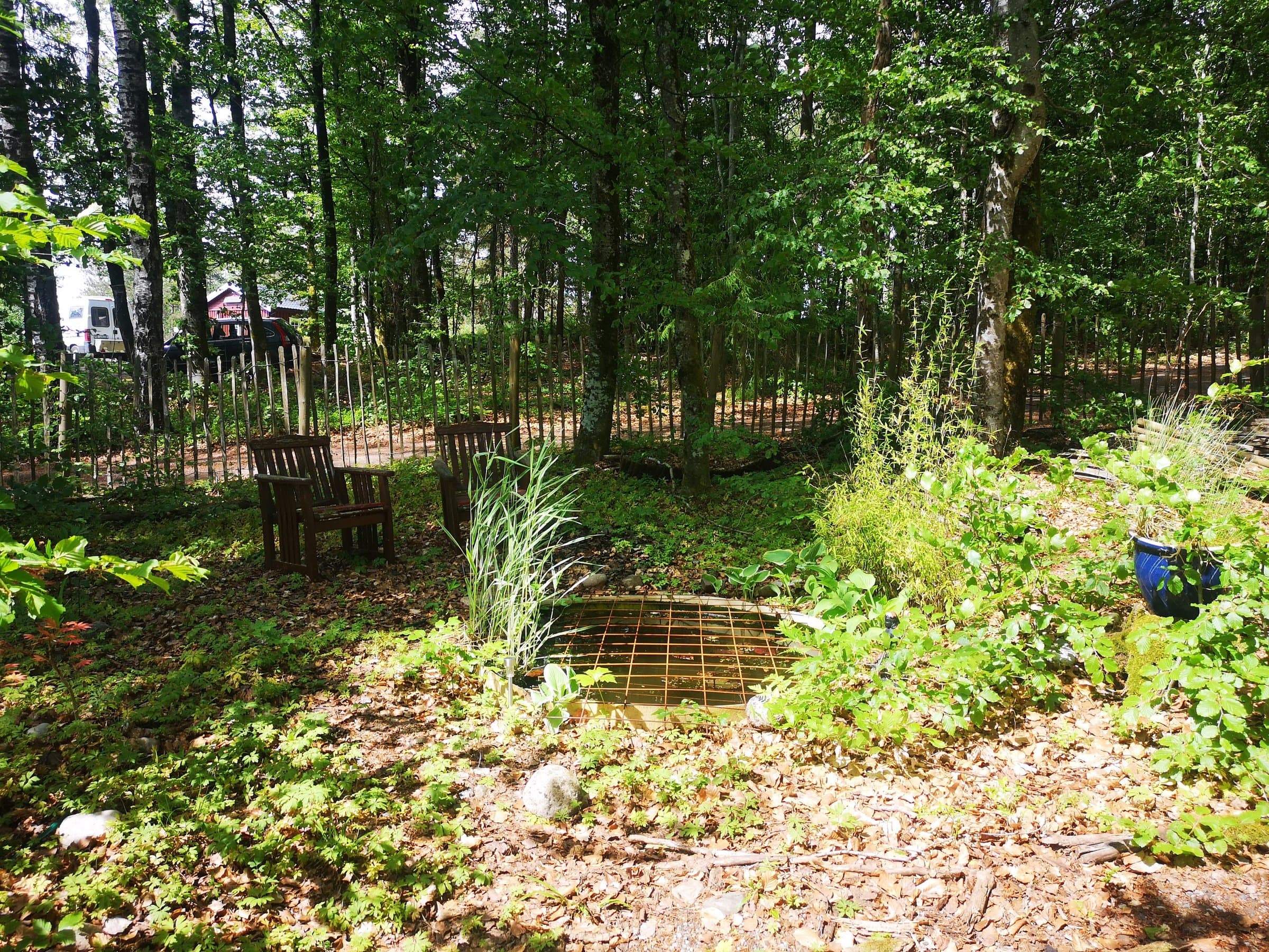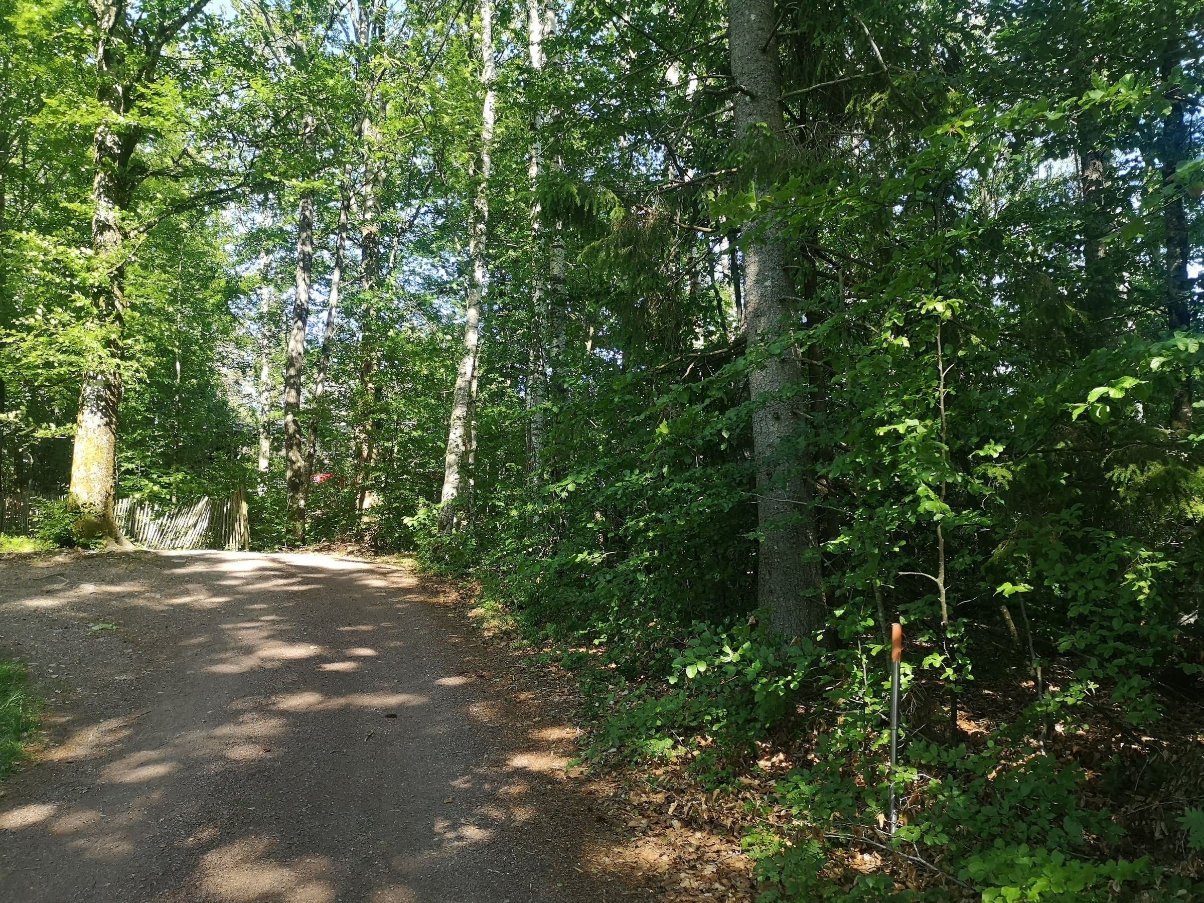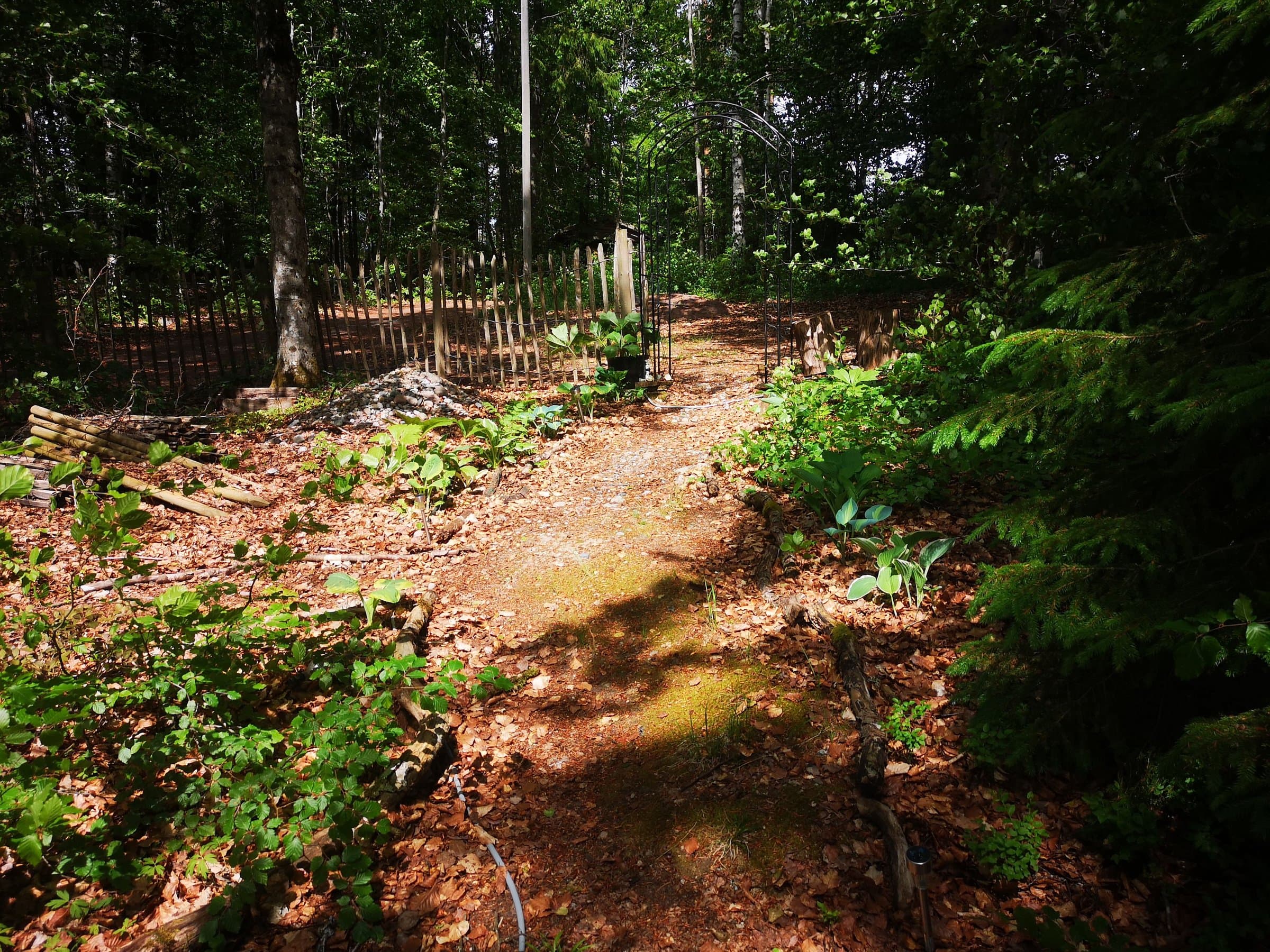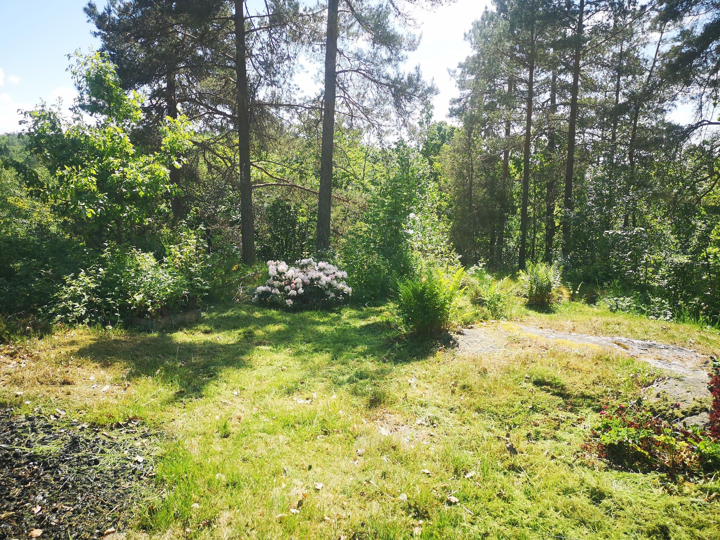 Består av 2900kvm, hvorav 900 er hytten med hage, og 2000 består av blandingsskog, med oppgruset plass for campingvogn ol. I tillegg til hytten, vil du finne drivhus, utedo, pumpehus, bod og luftegård til katt. Skogen er vedlikeholdt som en slags matskog, hvor man finner matsopper med mer, og i hagen finner man flere forskjellige bærbusker. En gruset plass ved de 2 høye stubbene nede i skogen, passer perfekt for hengekøye og avslapping i den svale skyggen. Ellers kan man sitte ved dammen og se på rompe troll. De 2 dammene, skaper en oase for dyrene i området. Her kan man observere flere ulike dyr, både sjeldne og mer vanlige. Det er et 15kvm bed like ved hytten, hvor det er plantet spiselige vekster, mellom de forskjellige blomstene. Og i utebadet på terrassen, kan man slappe av under druerankene. Et paradis for de som ønsker å nyte naturen, uten å forlate egen tomt.