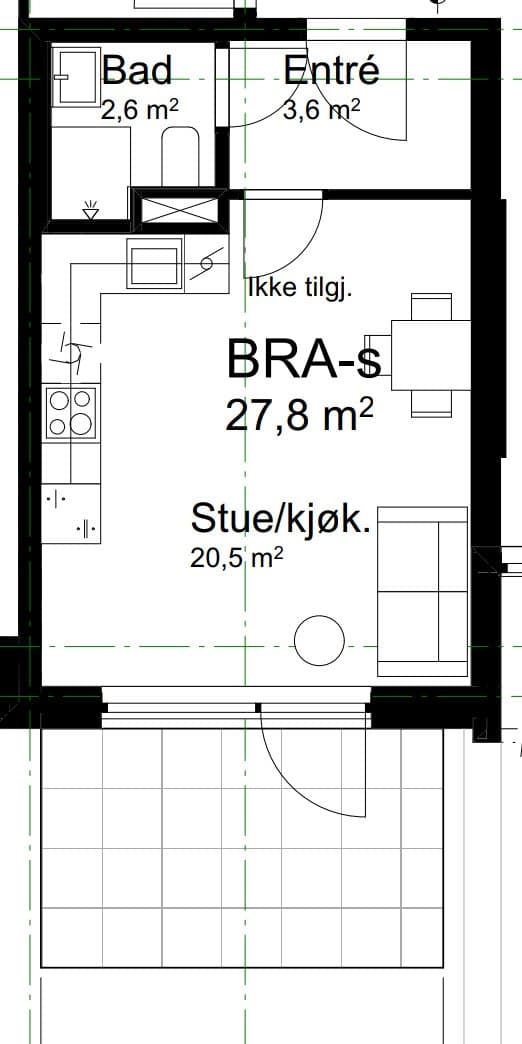 BRA-e: 31 kvm entré, stue/kjøkken/soverom, bad og bod (bod i fellesområdet i underetasje) BRA-i: 1.etasje: 28 kvm entré, stue/kjøkken/soverom og bad. TBA: 1.etasje: Ca 10 kvm terrasse