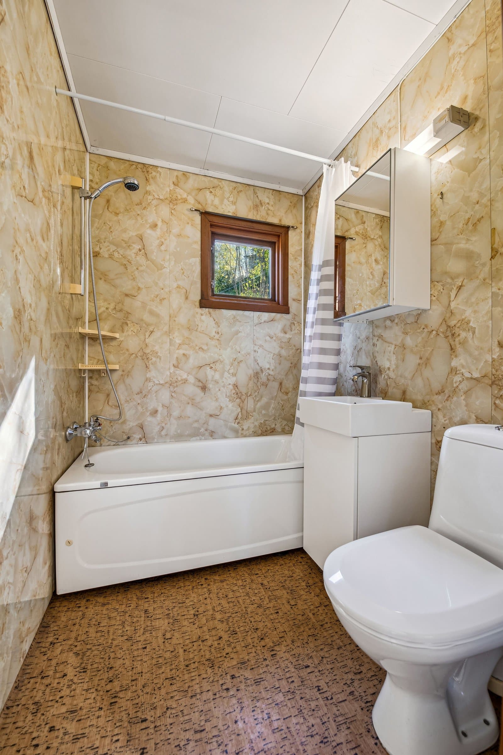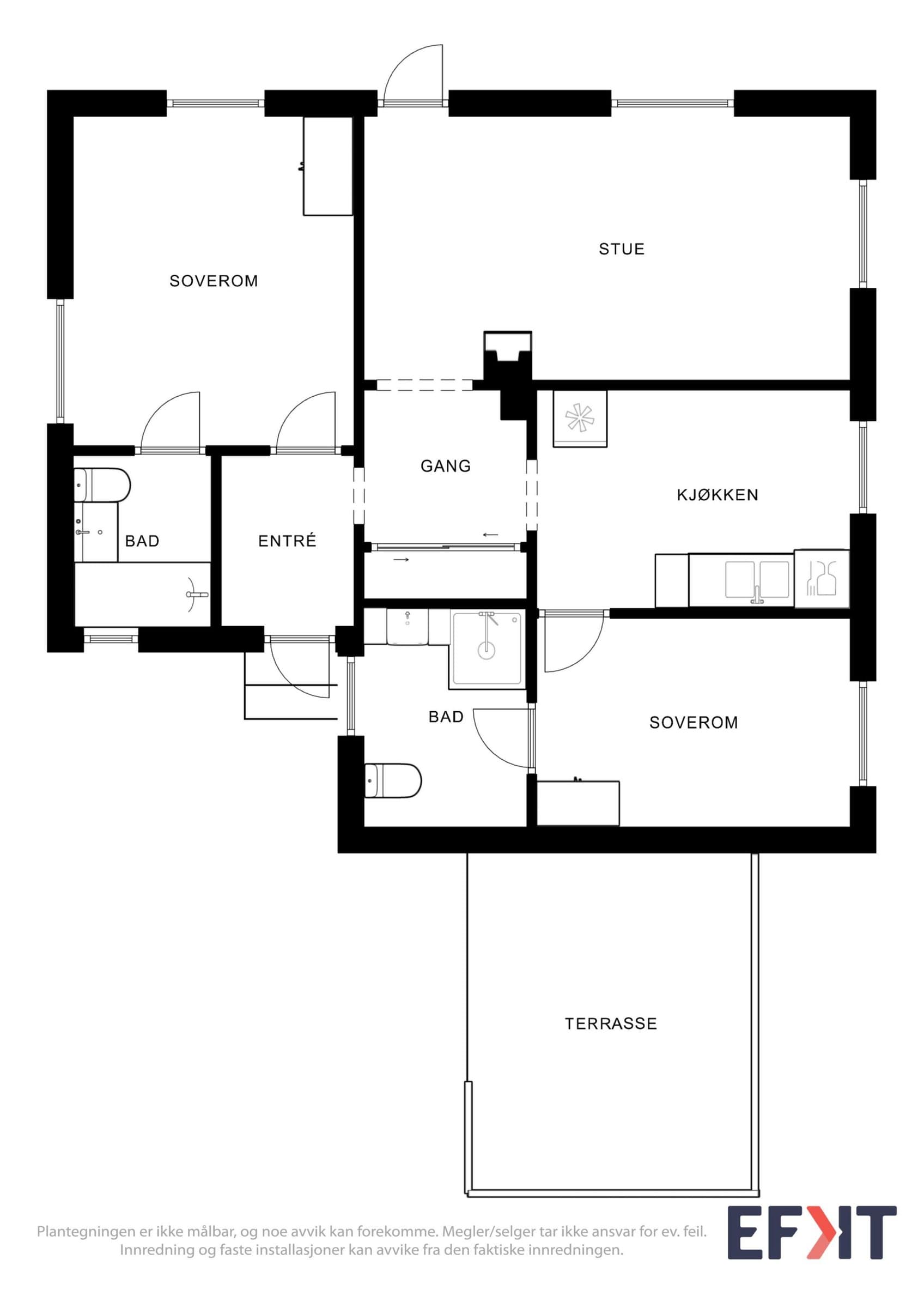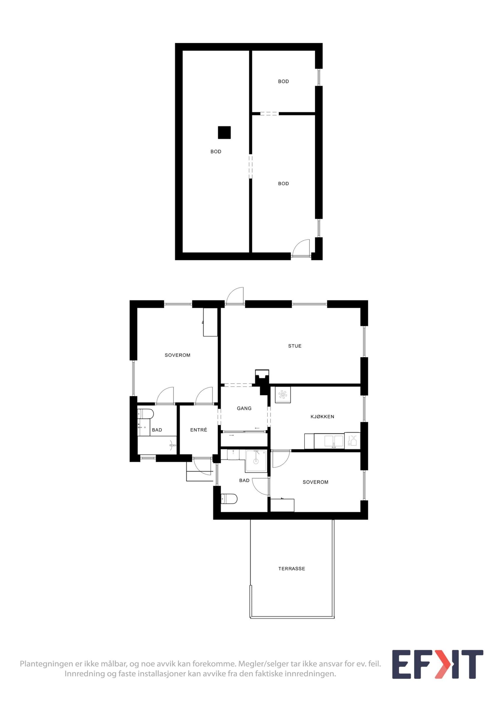 1. etasje inneholder vindfang, gang, stue, kjøkken, 2 soverom og 2 bad. Kjeller under deler av huset, inneholder 2 rom, dels med lav takhøyde.