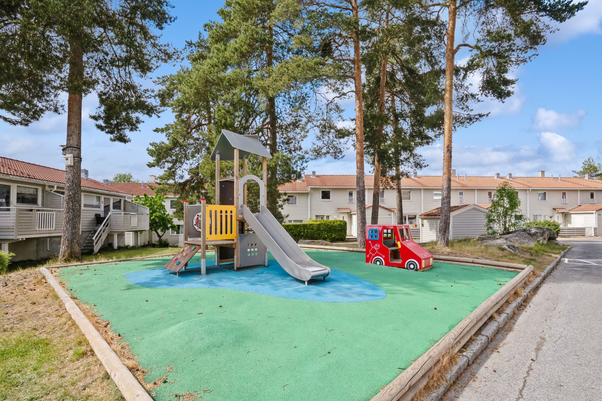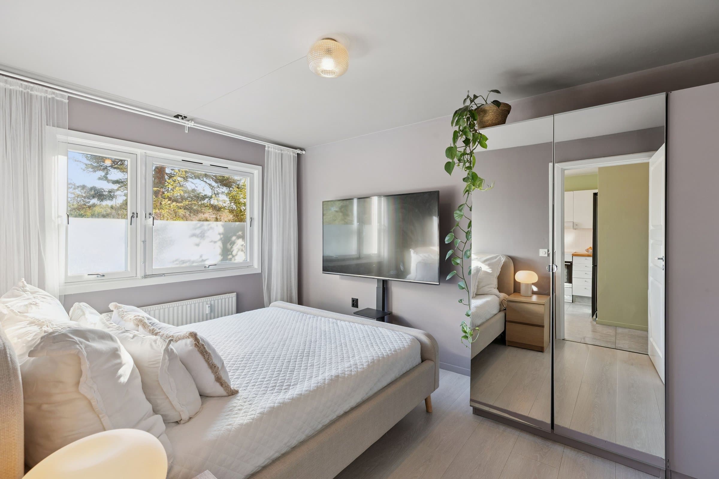 Leiligheten ligger i et naturskjønt område med skog, turstier, besøksgård og bademuligheter i gangavstand – helt uten bilvei. I tillegg er det kort vei til offentlig transport, butikker og andre daglige gjøremål.