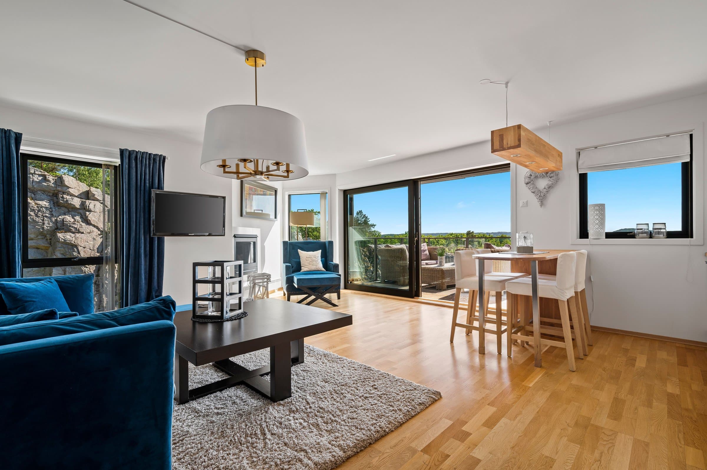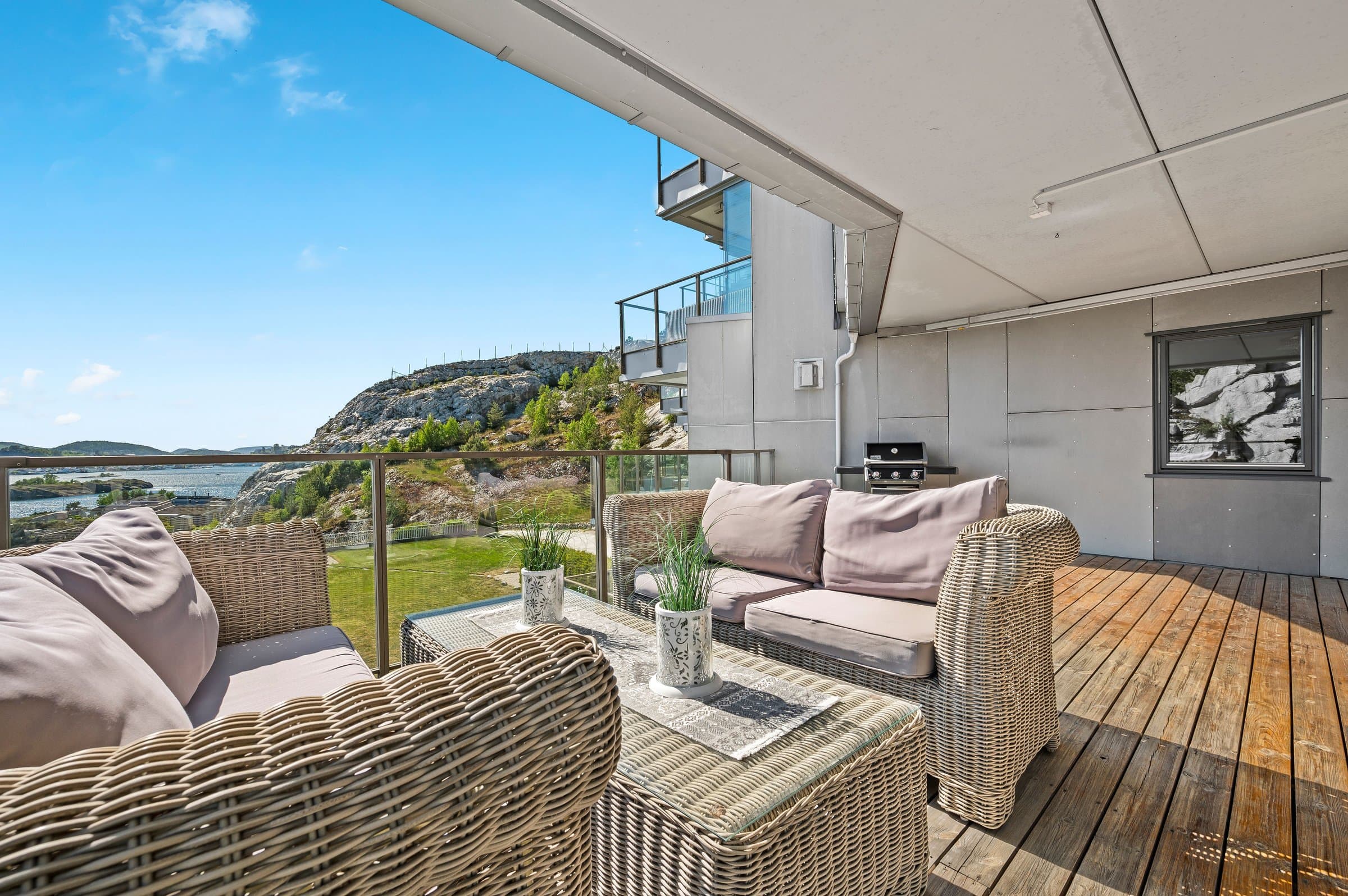 Endeleilighet i 3 etg med fantastisk sjøutsikt. Stor terrasse m/overbygg Heis, parkeringskjeller, båtplass.