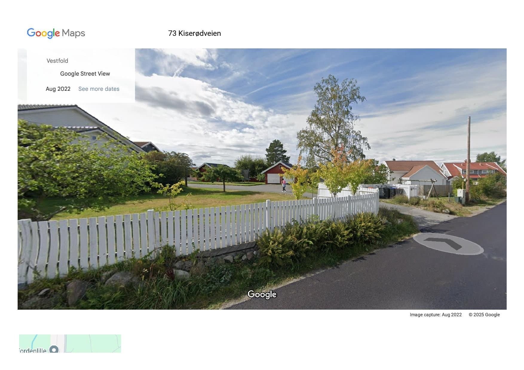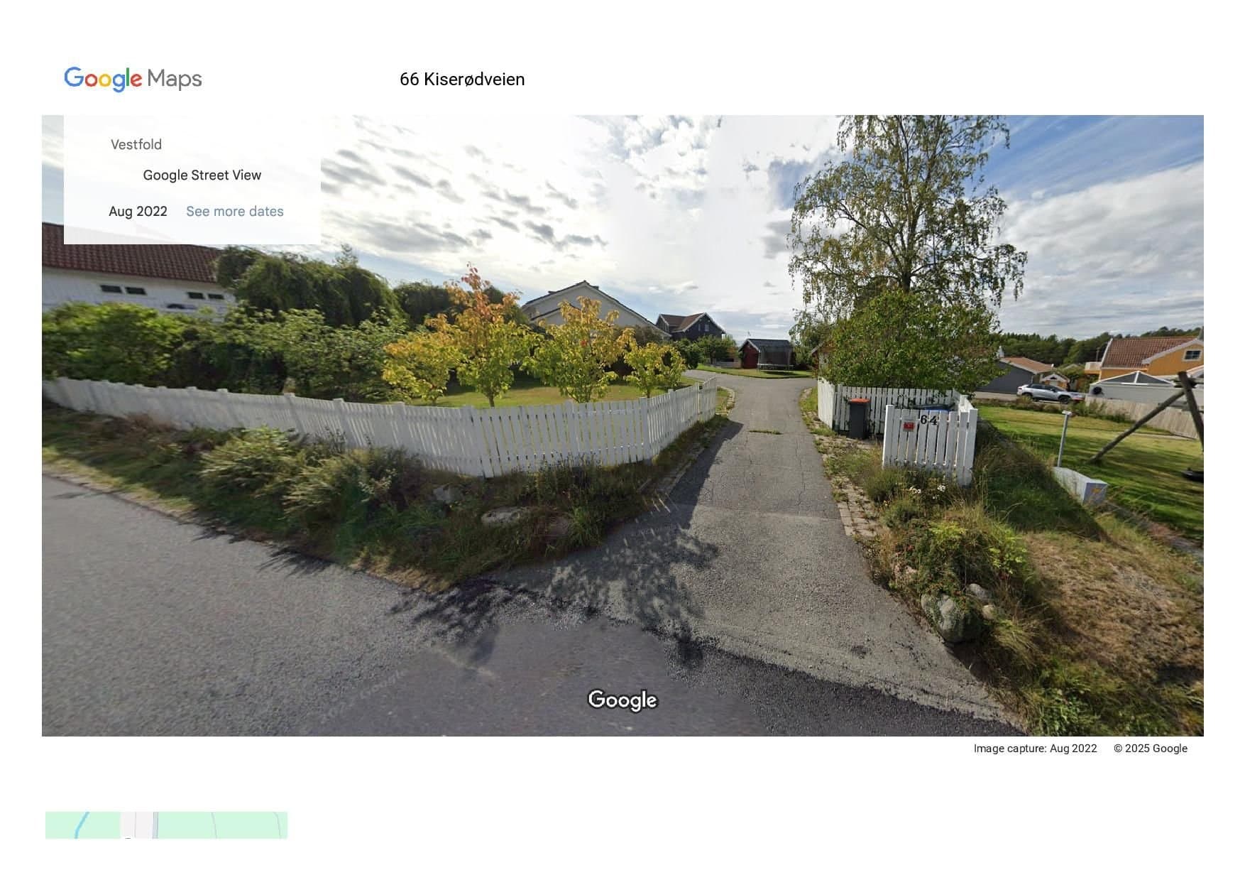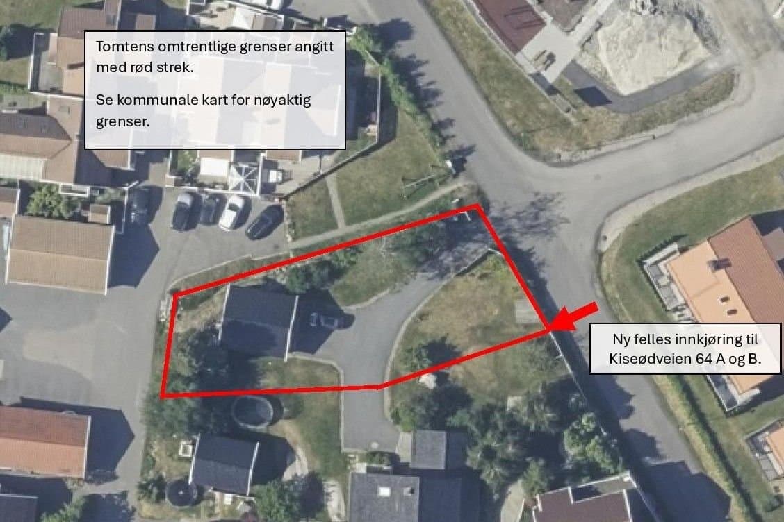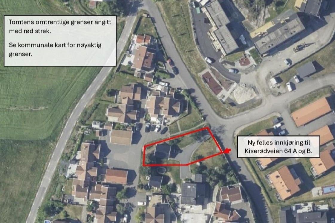Tomten ligger sentralt til på Store Bergan ca. 5 km sør for Sandefjord sentrum i et etablert boligområde midt mellom Store Bergan skole og Meny Åsane ved Granholmen. Fra tomten til skolen er det 700 meter å gå på egen, trygg gangvei. Ved skolen går veien inn til Marumskogen med fine turmuligheter. I motsatt retning, mot Meny Åsane, ligger Granholmen og Sandefjordsfjorden. Her kan man nyte sjø- og strandliv om sommeren, eller gå tur ellers i året. Båtplass får du enkelt på Thorøya Båthavn, 3 minutters kjøretur fra tomten. Det er flere barnehager i skolekretsen. Tomten er en fradelt boligtomt i et etablert nabolag. I forbindelse med fradeling og opprettelse av eiendommen ble det utarbeidet en områdestabilitetsrapport. Se vedlegg. Den viser at det er fjell i grunnen 0,5-2 meter dybde på tomten, noe som fører til lave kostander for å gjøre tomten byggeklar og trygg. Strøm, vann og fiber fra Sandefjord bredbånd finnes rett utenfor tomtegrensen. Avløp ligger allerede over eiendommen til Kiserødveien 64A. Dersom avløpsledningen, vann og strømkabel til Kiserødveien 64 A må flyttes pga. nytt bolighus, gjøres det for kjøpers regning. Selger setter opp hekk i grensen mellom A og B. Om man søker og får godkjent en mur i grensen mot Marihaugen i vest og friområdet i nord, vil man kunne få en helt flat tomt rammet inn med gjerde eller hekk på toppen av muren. Tomten får da en vestvendt luftig hage med enkelt vedlikehold. Kiserødveien 64 A har fått godkjent å sette opp en dobbelt garasje mellom Kiserødveien og bolighuset. Dagens avkjørsel fra Kiserødveien til tomten er vedtatt stengt. Ny felles avkjøring fra kjørevei til 64 A og B skal etableres i grensen mellom de to eiendommene. Begge eiendommene har tinglyst bruksrett og vedlikeholdsansvar. Selger bekoster opparbeidelse av felles avkjørsel med grus, mens kjøper bekoster parkering på egen tomt. Kostnad til asfaltering av avkjørsel deles.